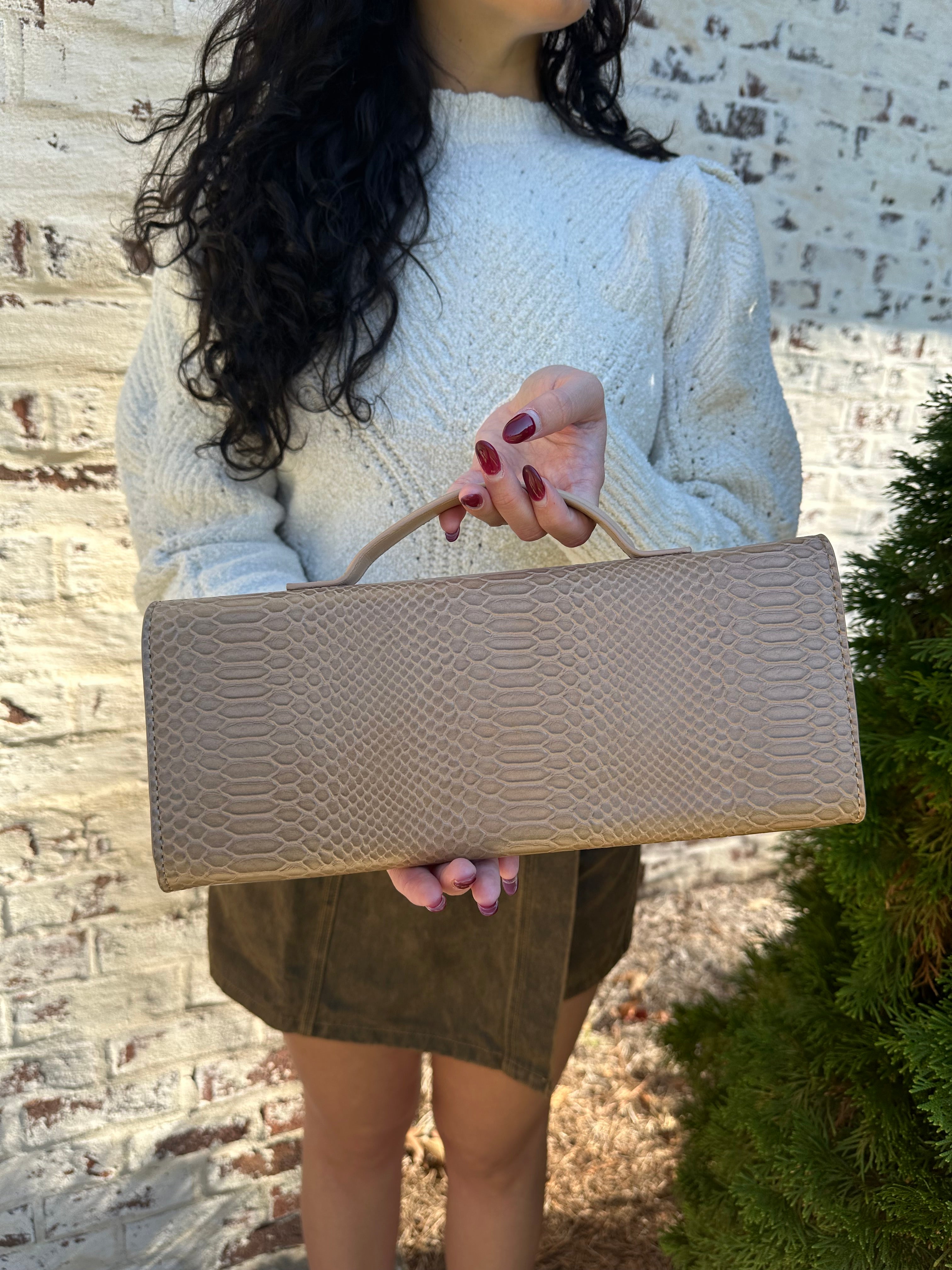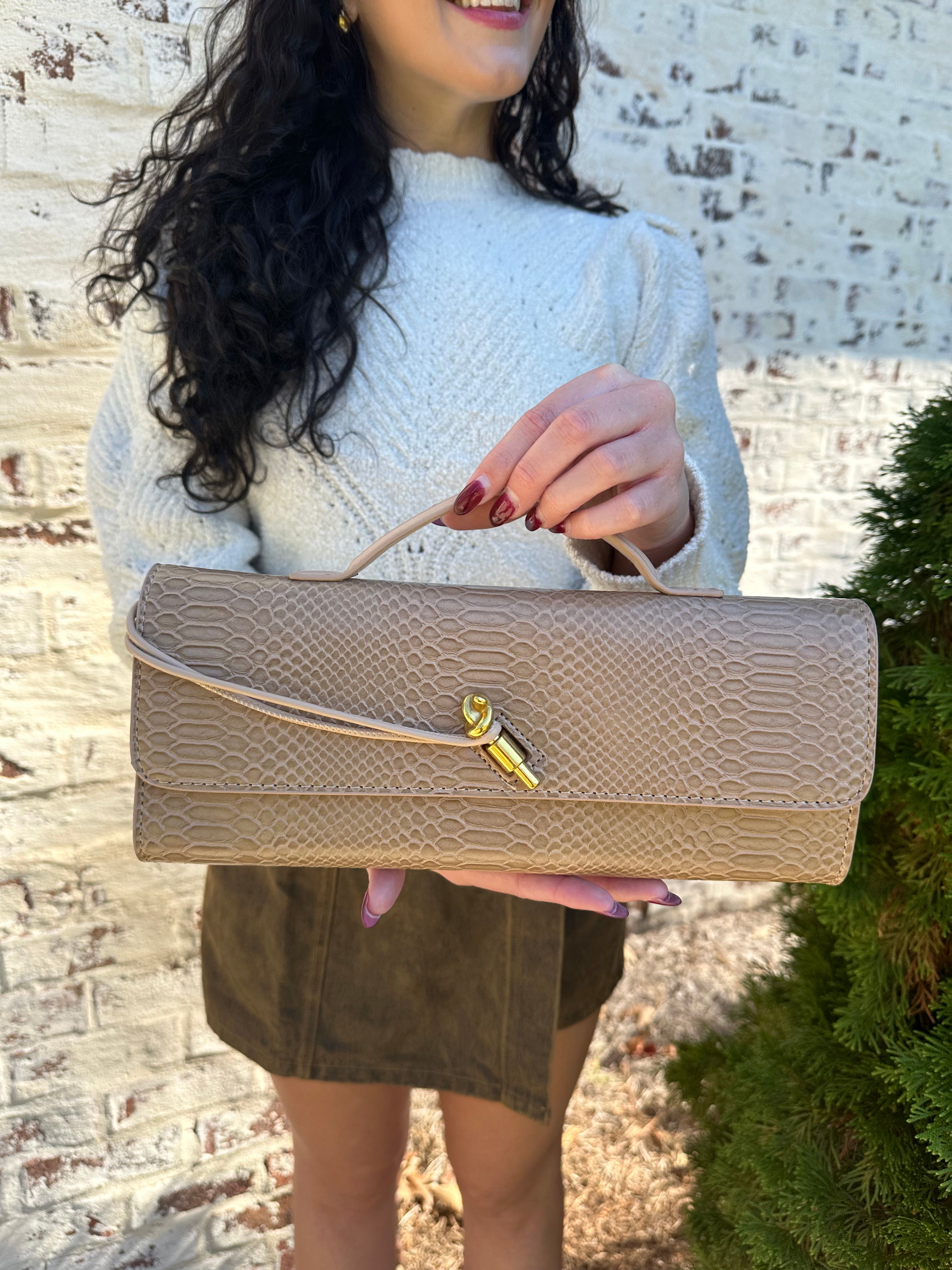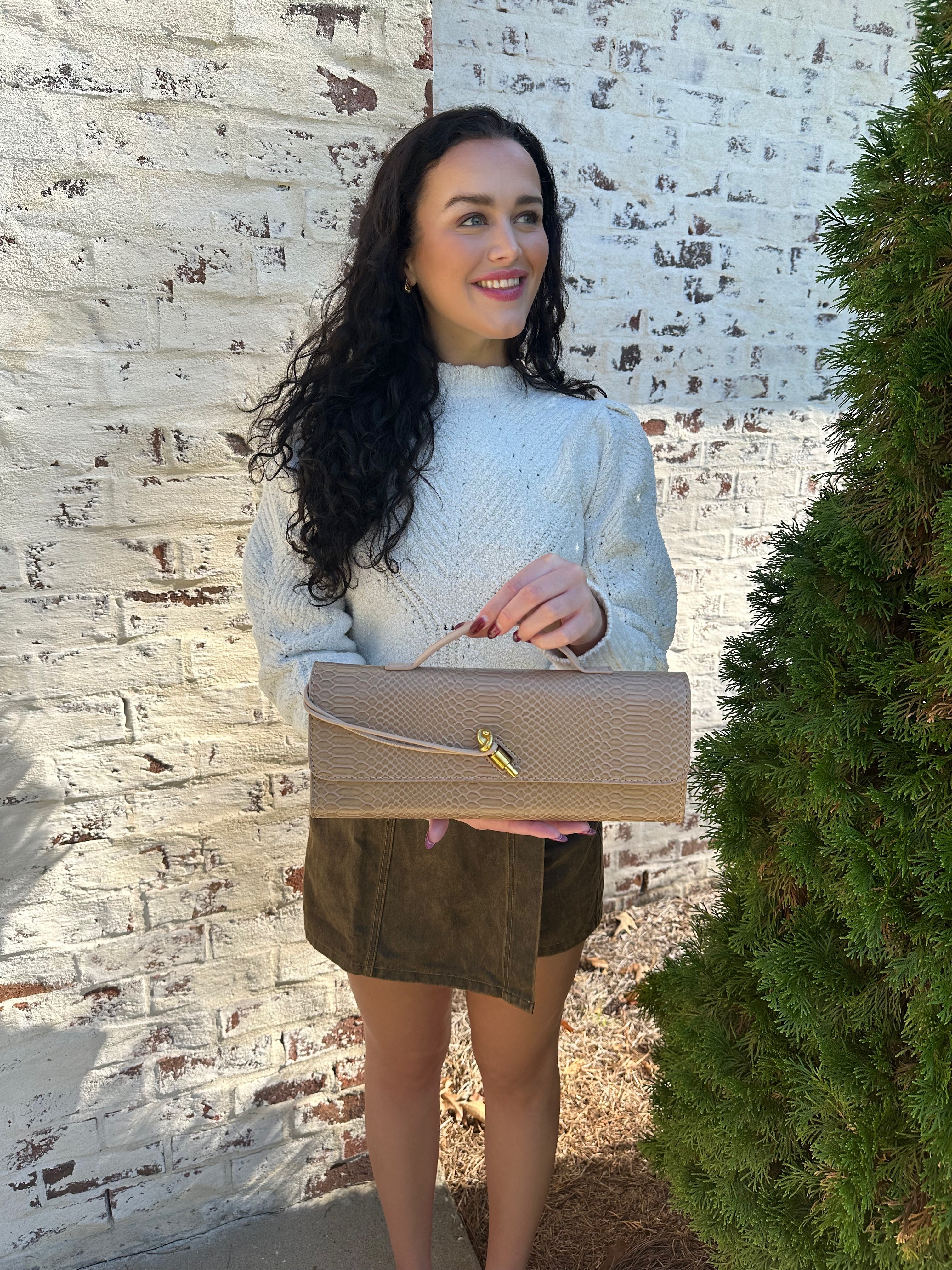 Make a statement with the Andi Crocodile Long Clutch in Beige. Featuring a rich crocodile texture and a sleek silhouette, this clutch offers both elegance and practicality. Designed with an optional strap, it can be carried as a graceful hand clutch or worn for hands-free convenience. Its roomy interior is perfect for keeping your essentials organized, making it an ideal accessory for any occasion where style meets function.