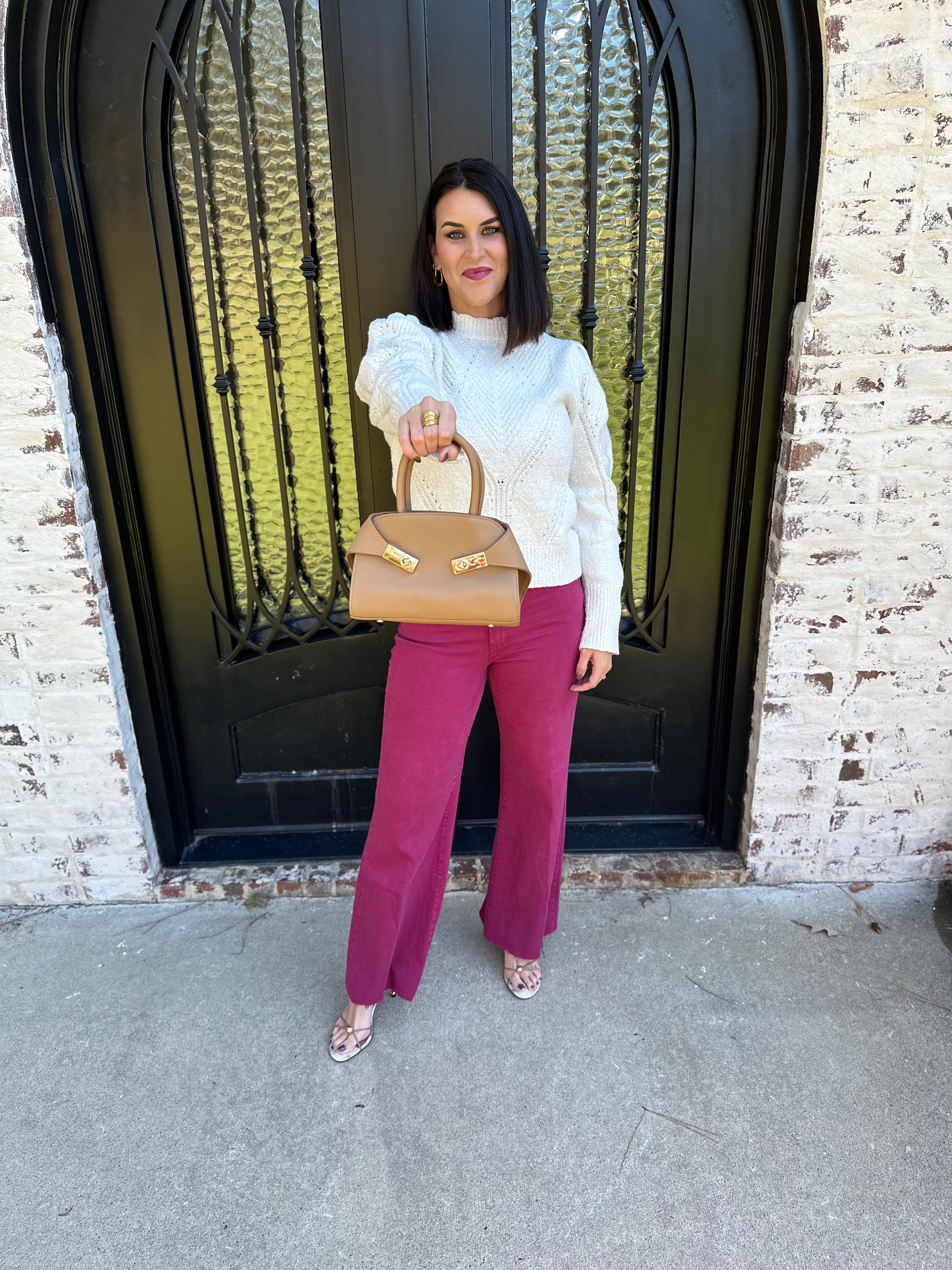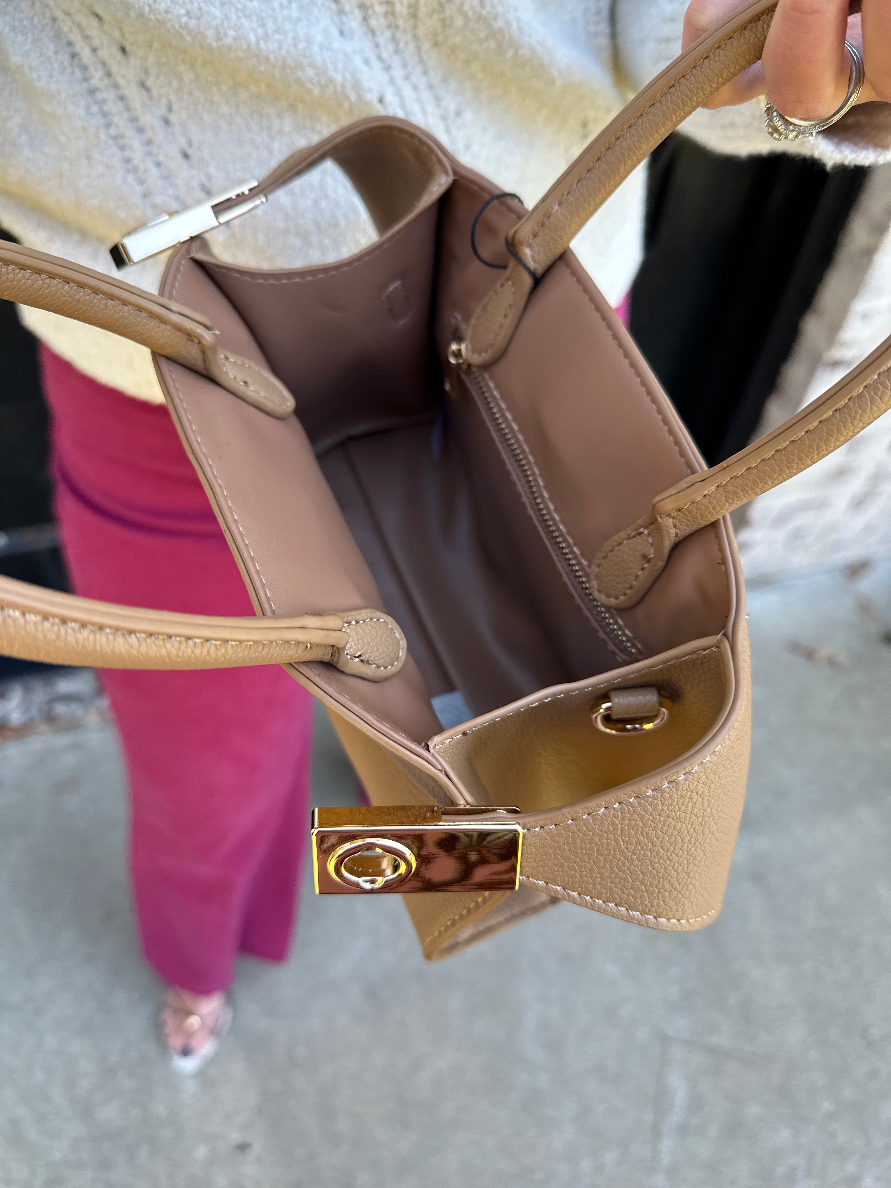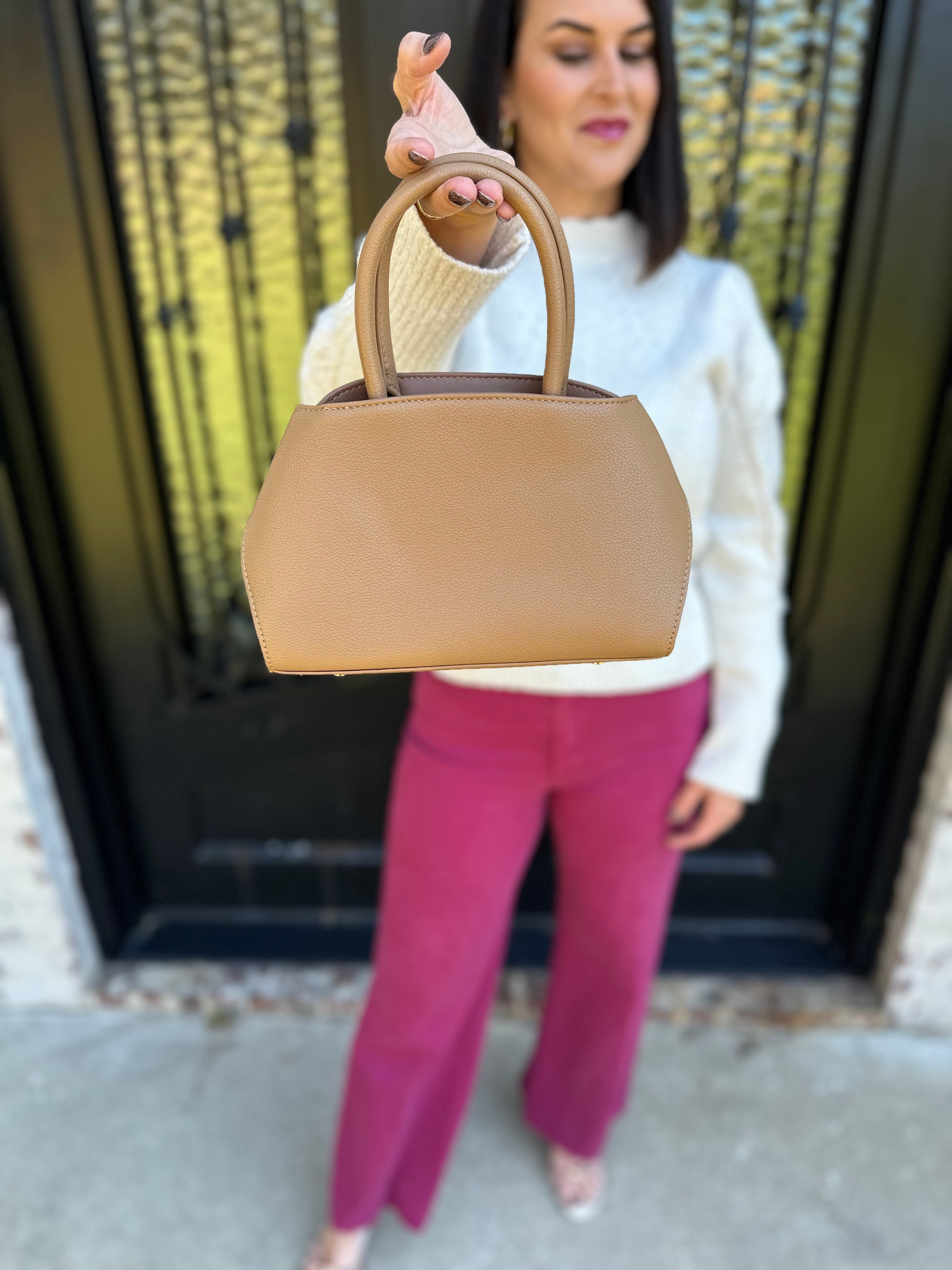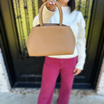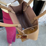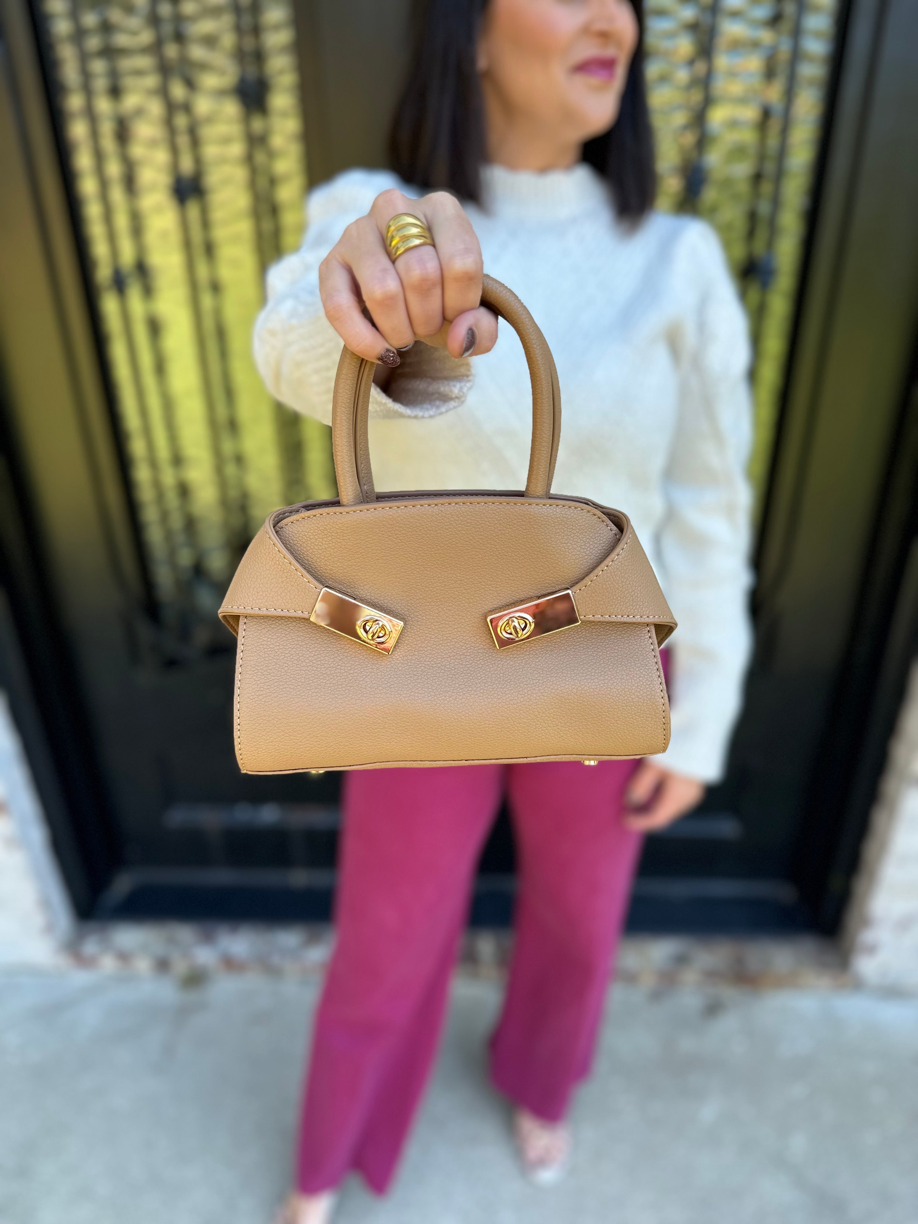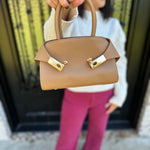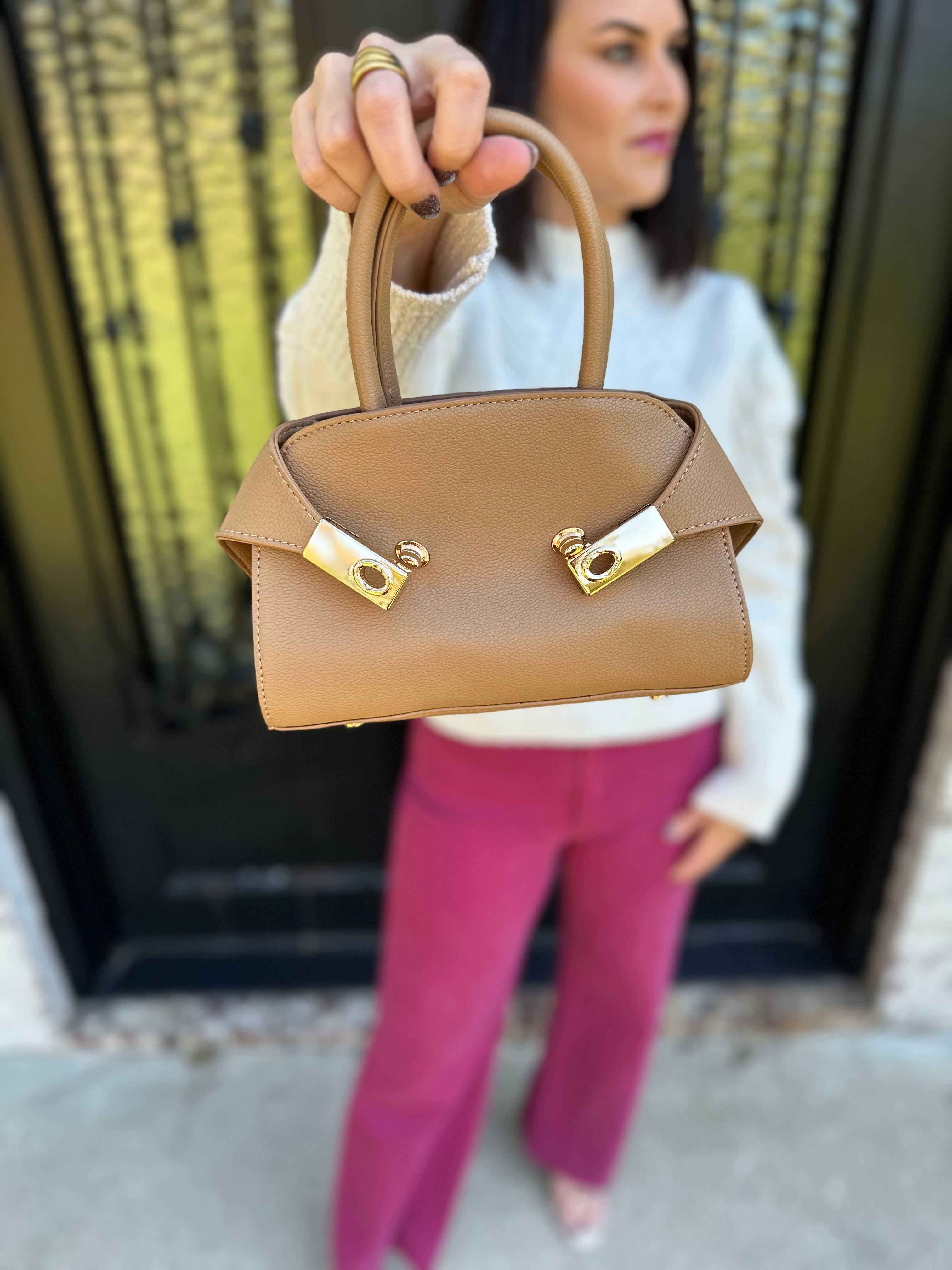 Top Handle Leather Purse with Gold Buckles in Camel