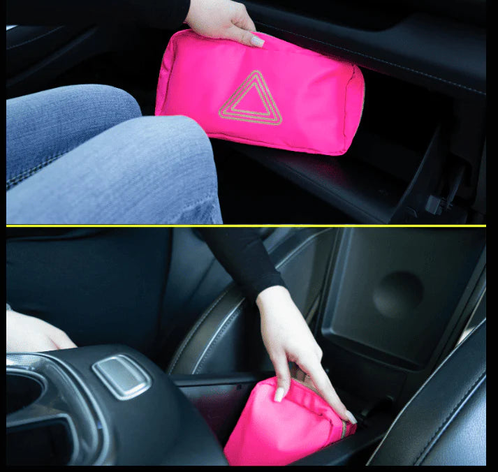 Roadside safety never looked so cute. Our hot pink, soft-shell case contains 44 emergency supplies every gal needs to stay safe on the road. This super-cute kit includes an emergency escape hammer, backup power bank (with batteries), gloves, emergency blanket, tire gauge, poncho, hand crank flashlight, bandages, alcohol pads, gauze pads, and tape roll.