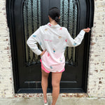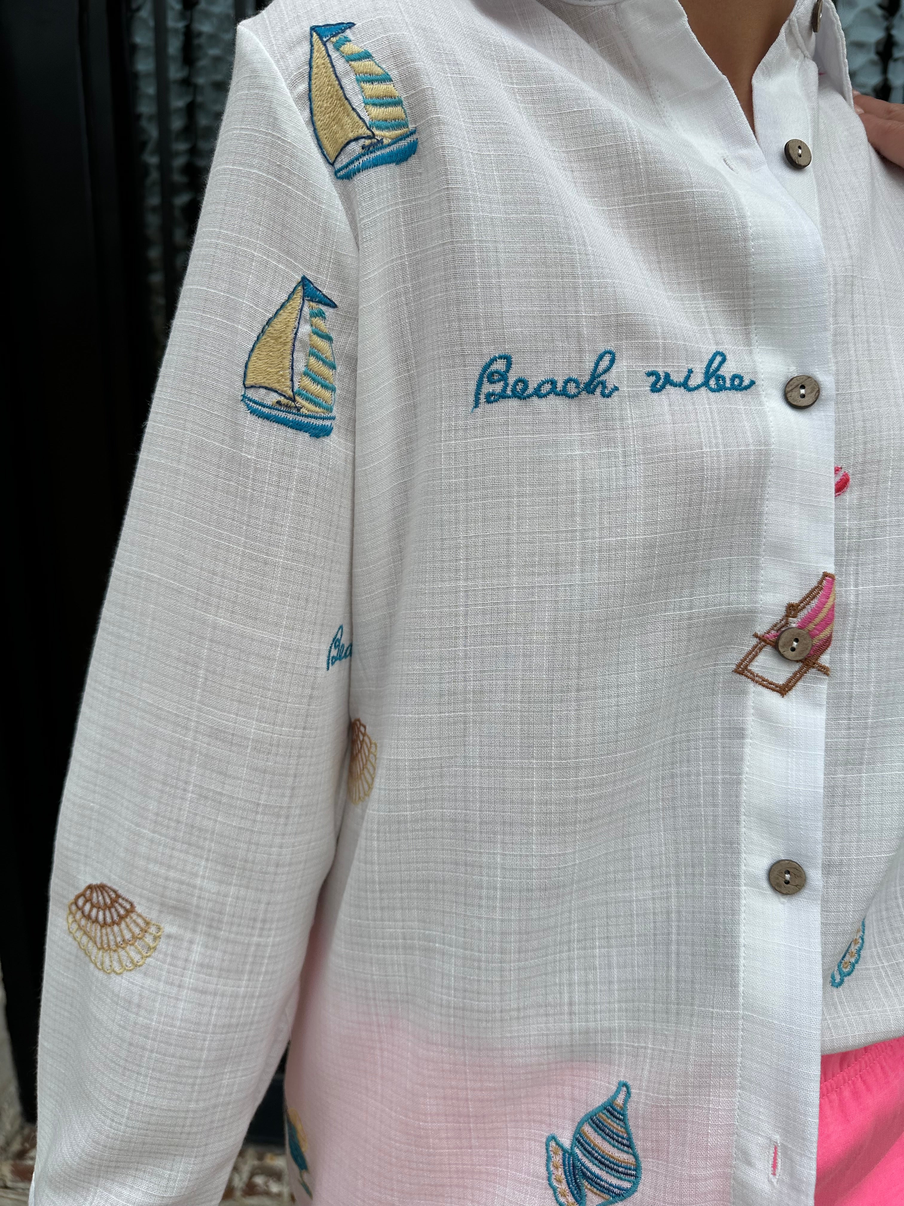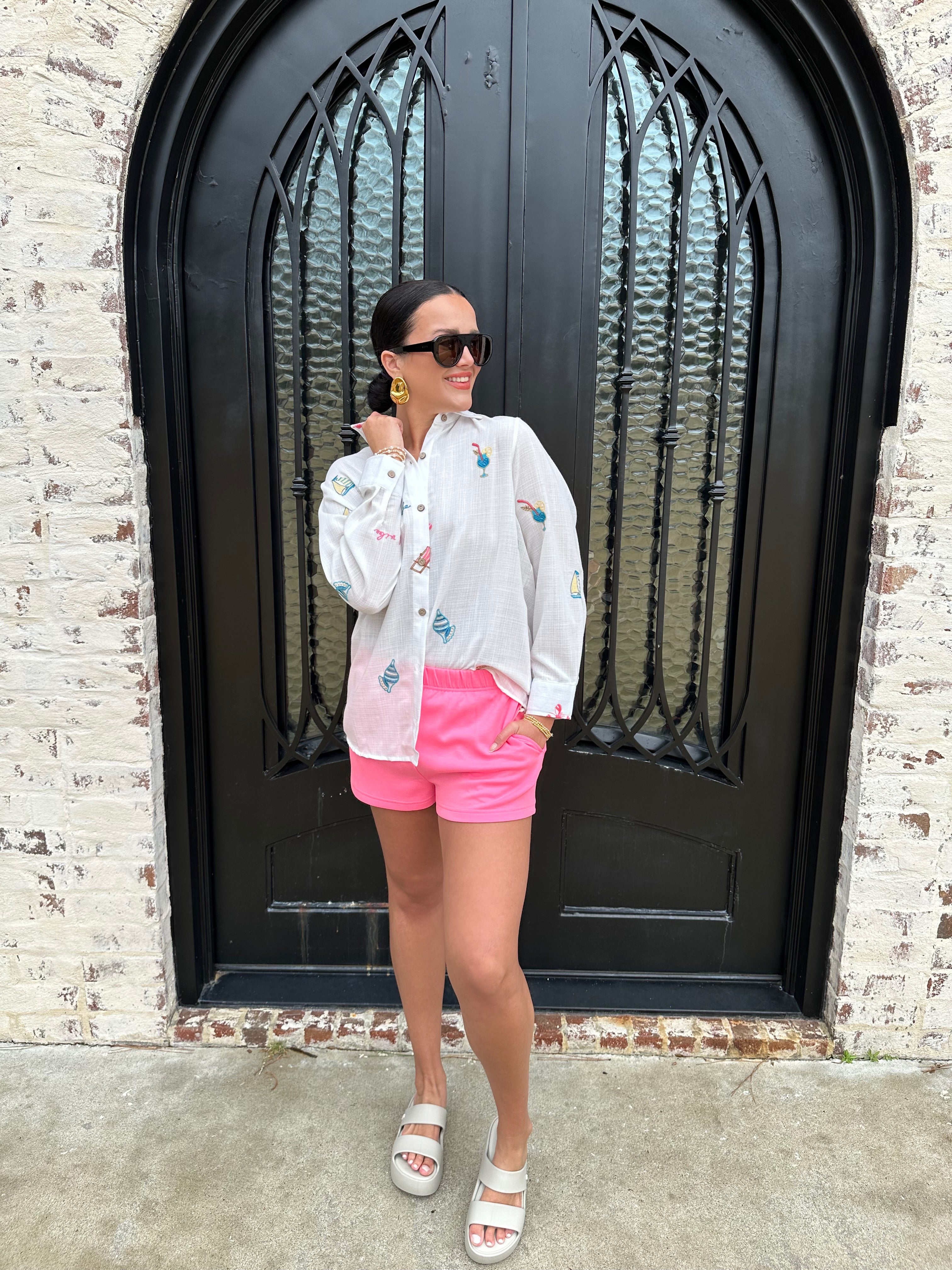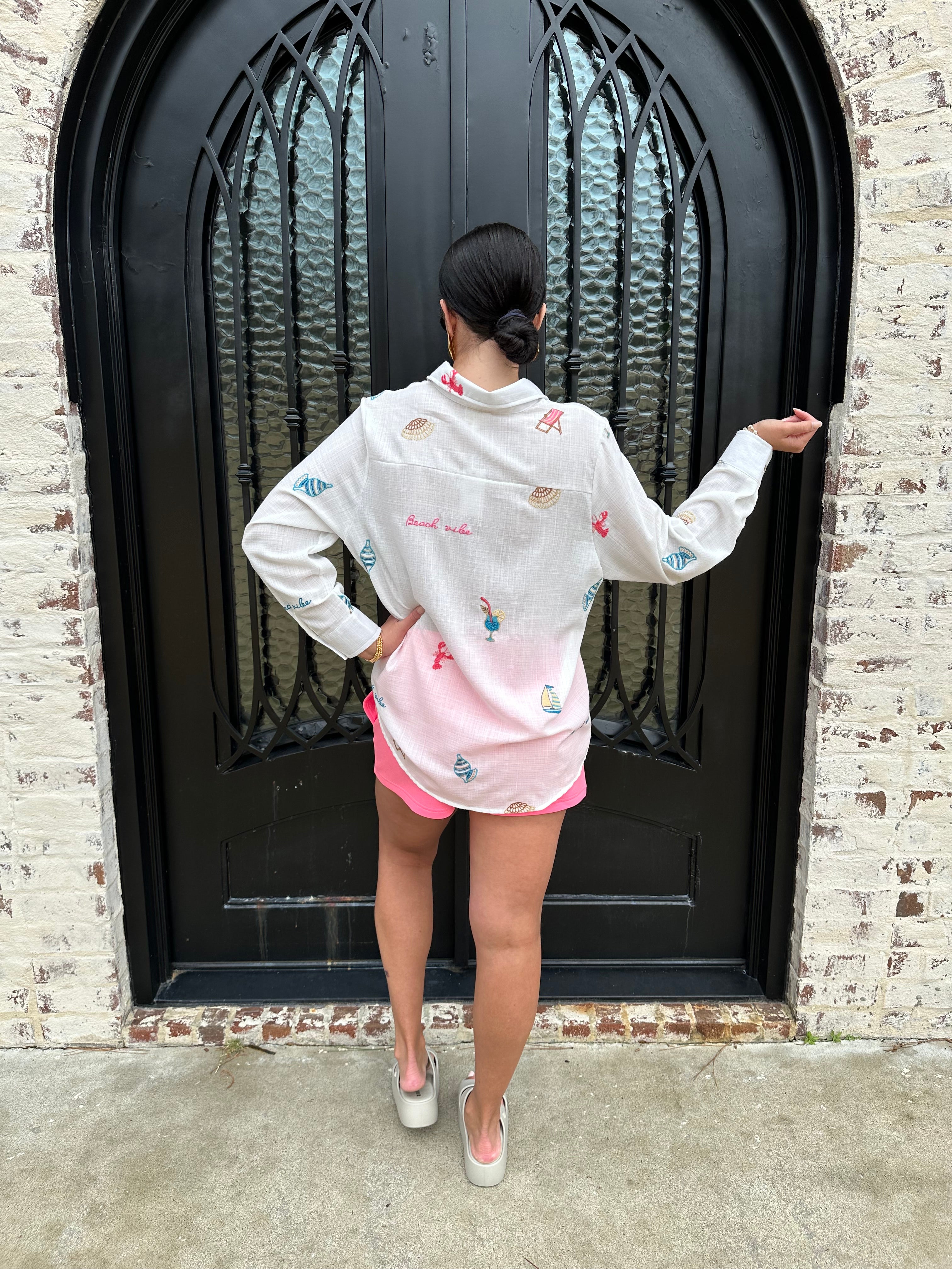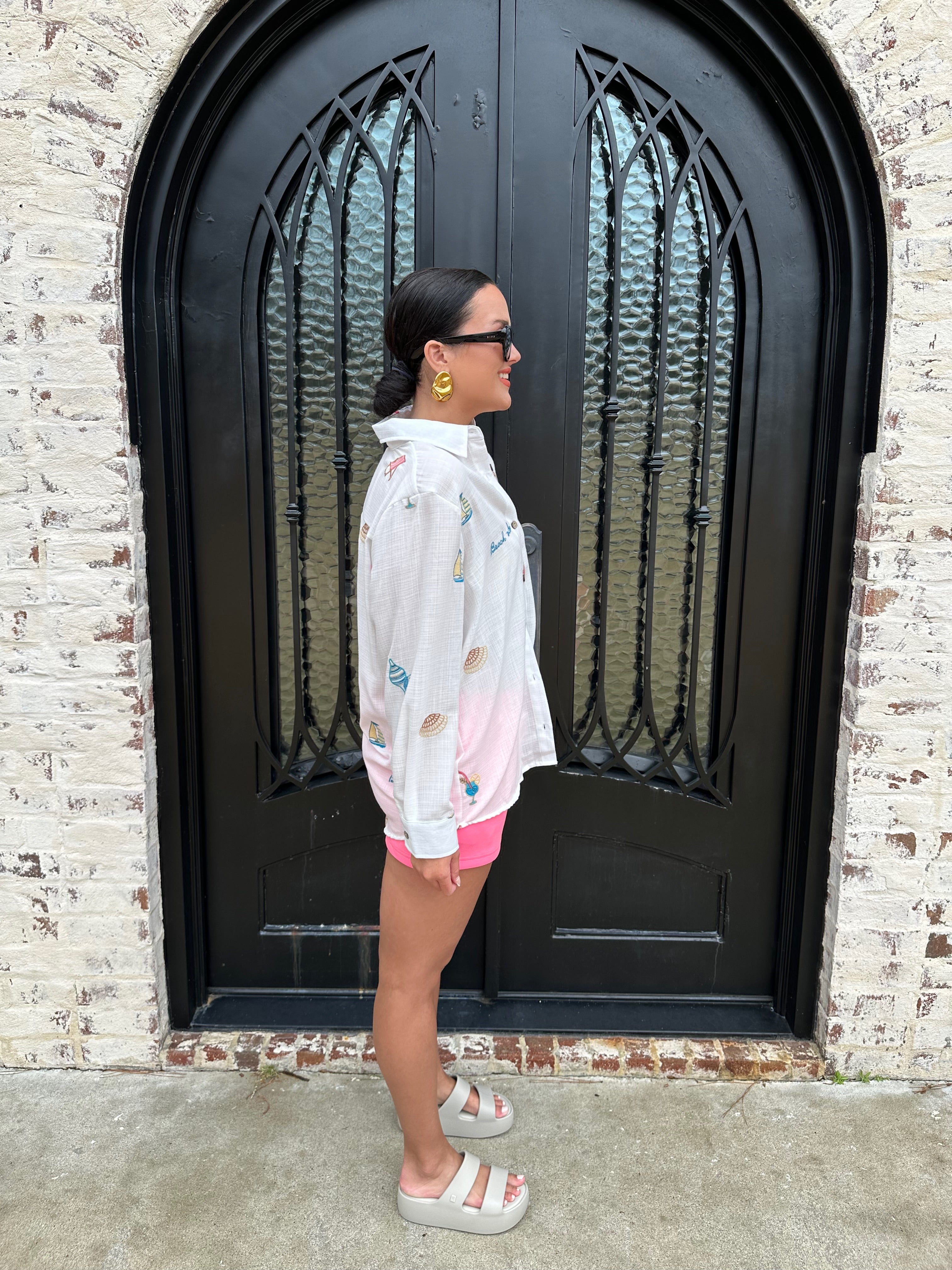 Elevate your beach style with our Embroidered Gauze Button Up Swim Coverup! This versatile piece can effortlessly transition from a chic coverup to a stylish dinner top when paired with denim shorts. The delicate embroidery adds a touch of elegance, making it perfect for poolside relaxation or beach outings! We have her paired back with our pink shorts for a casual pool side look!