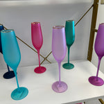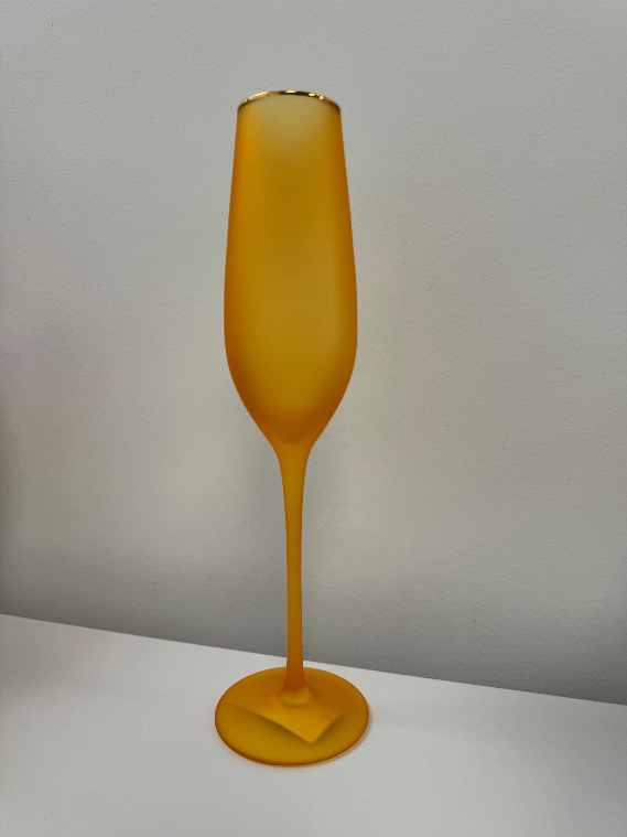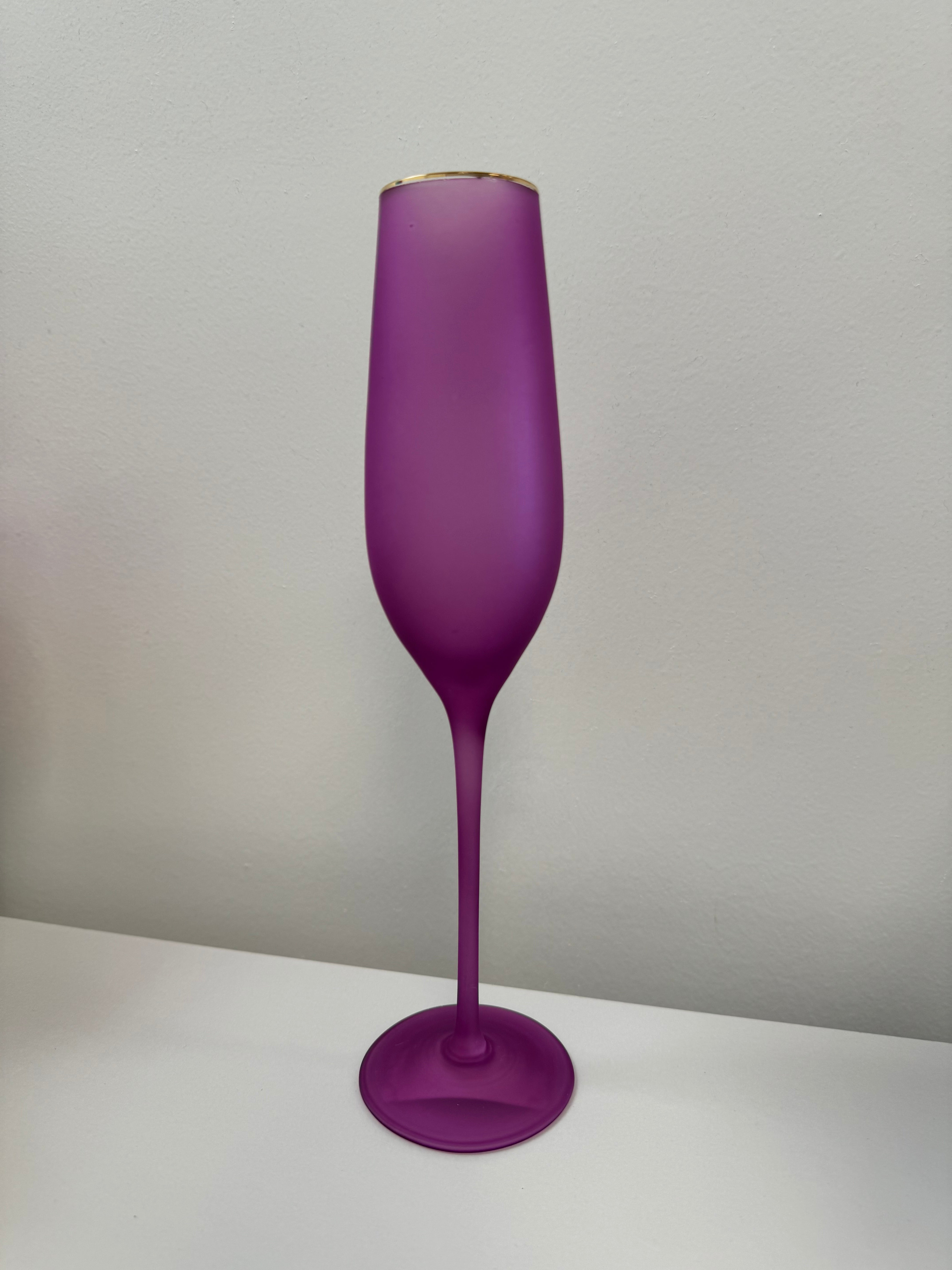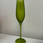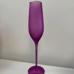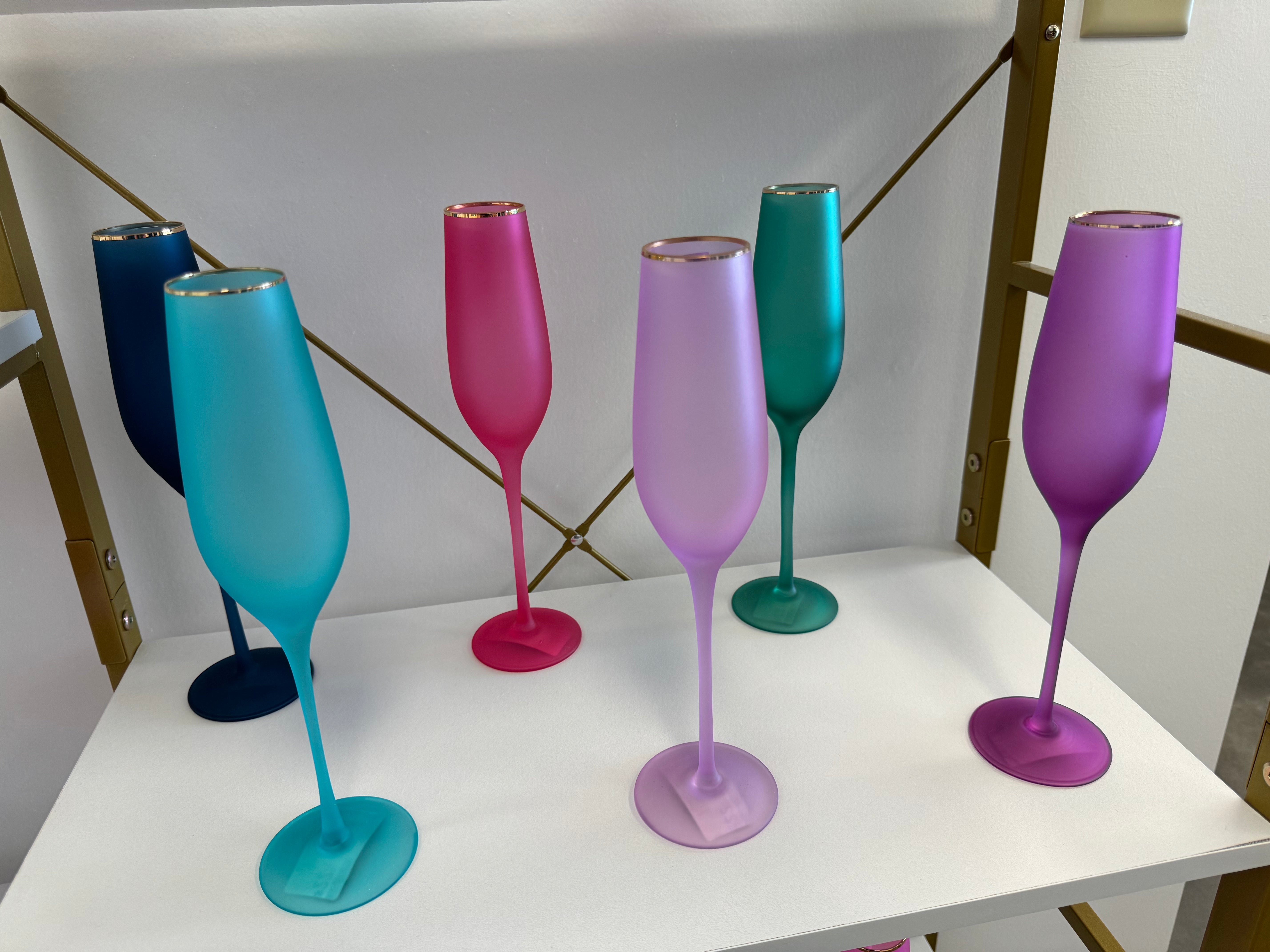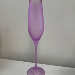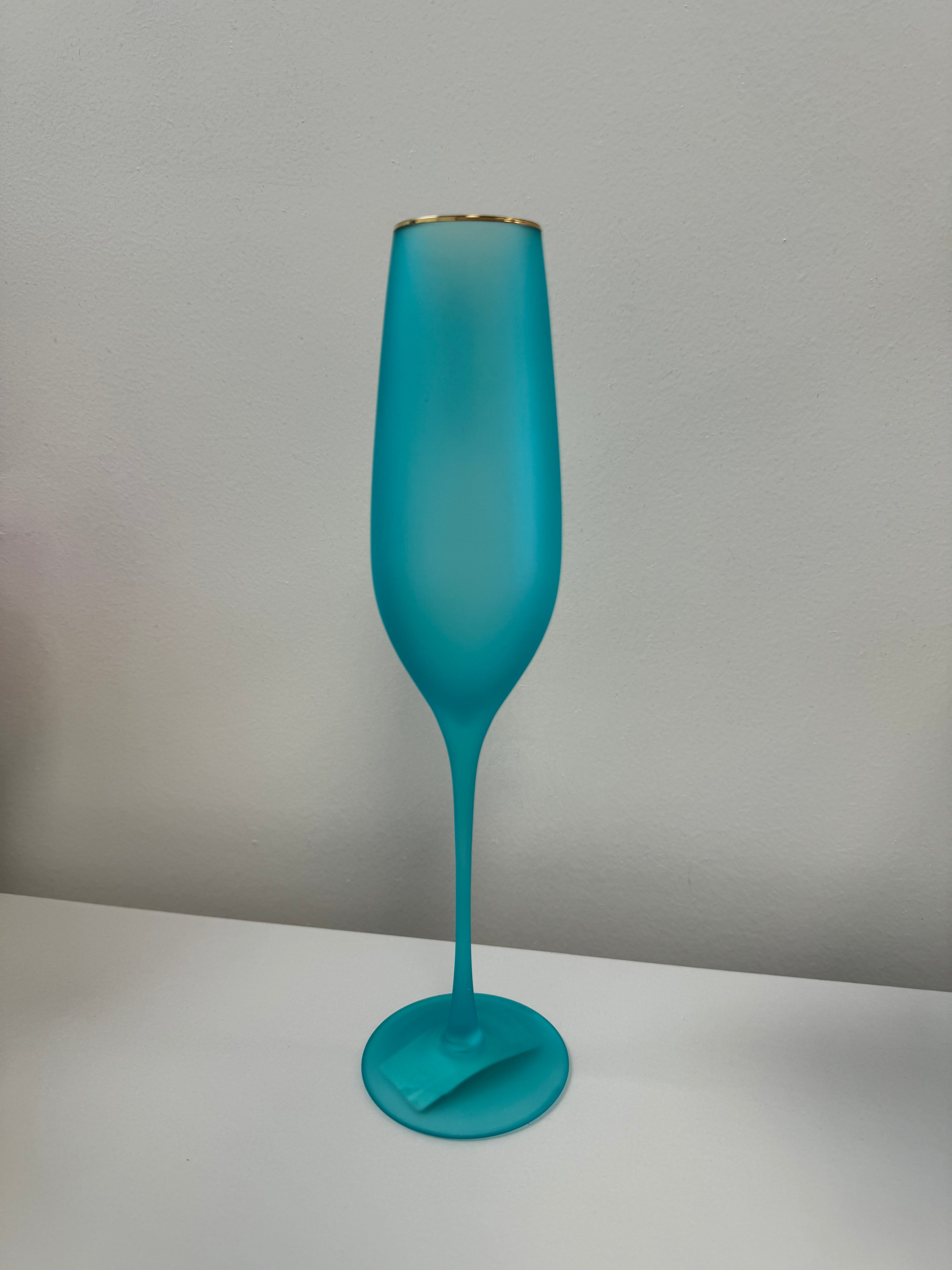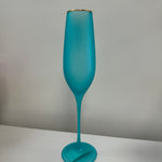 Elevate your glassware collection with our stunning Frosted Flute Glasses. Hand-blown with gold trim and available in vibrant frosted colors, these 10.25" glasses add elegance to any occasion. Hand wash only for lasting beauty. Not microwave safe.