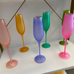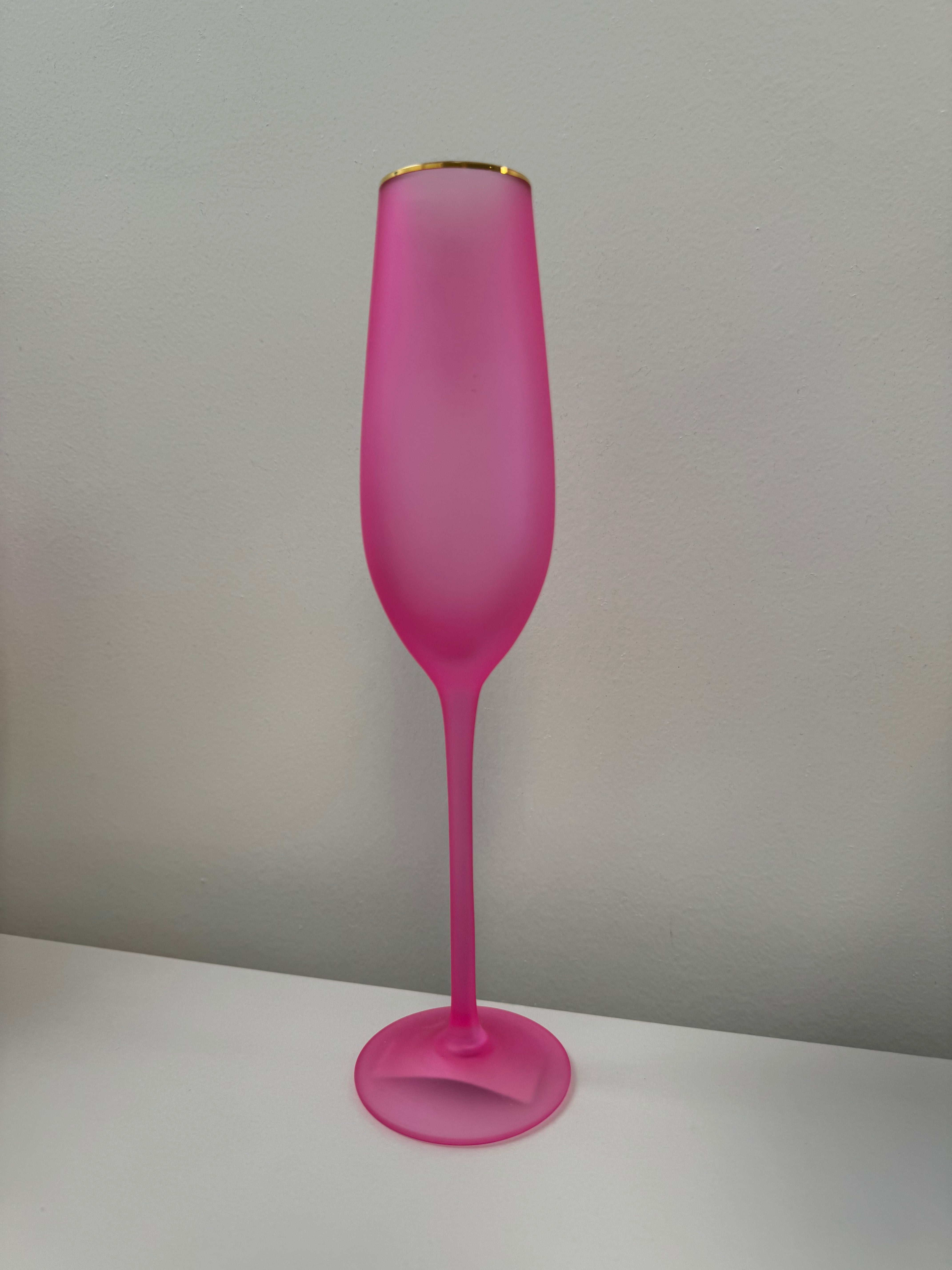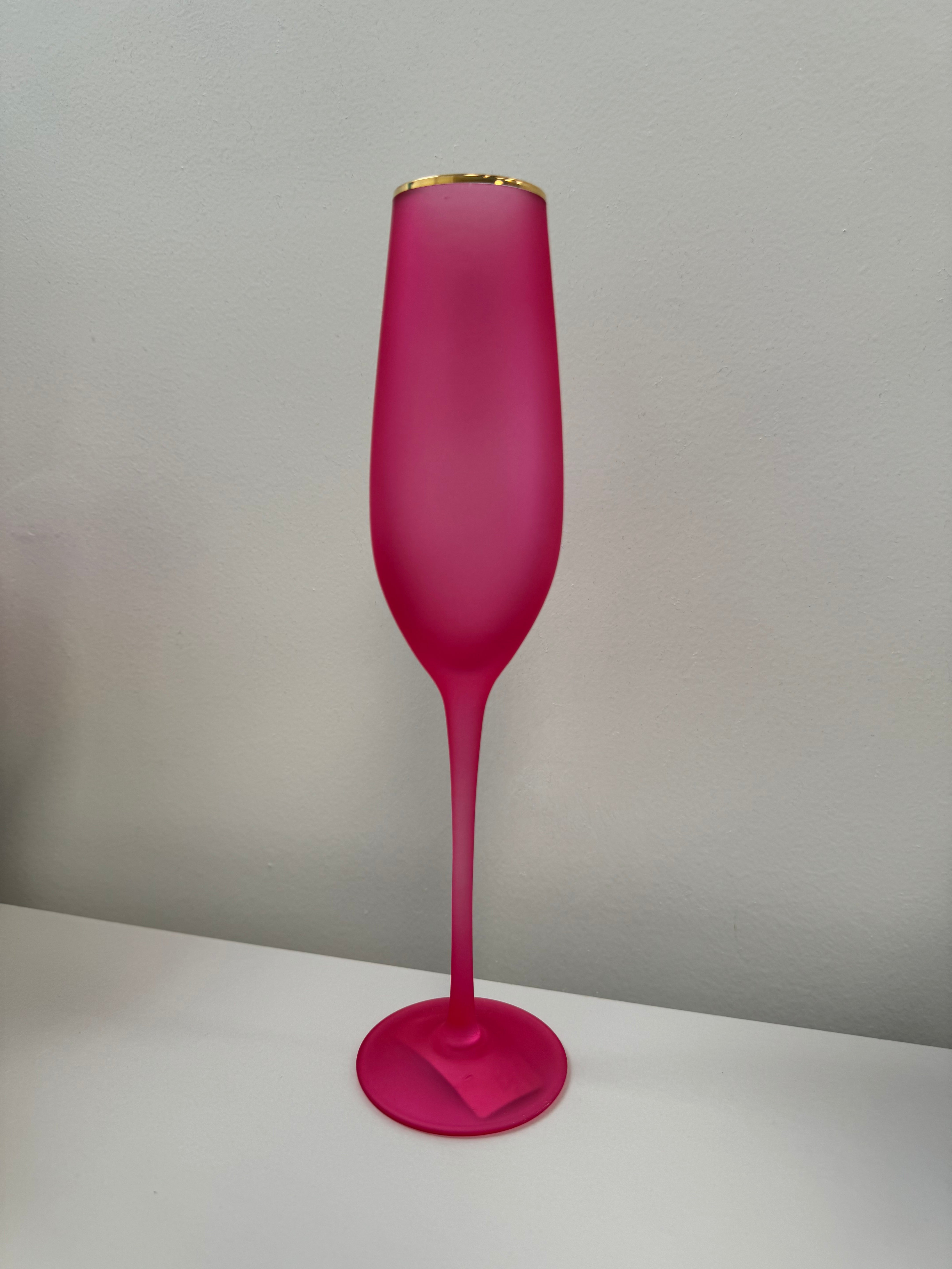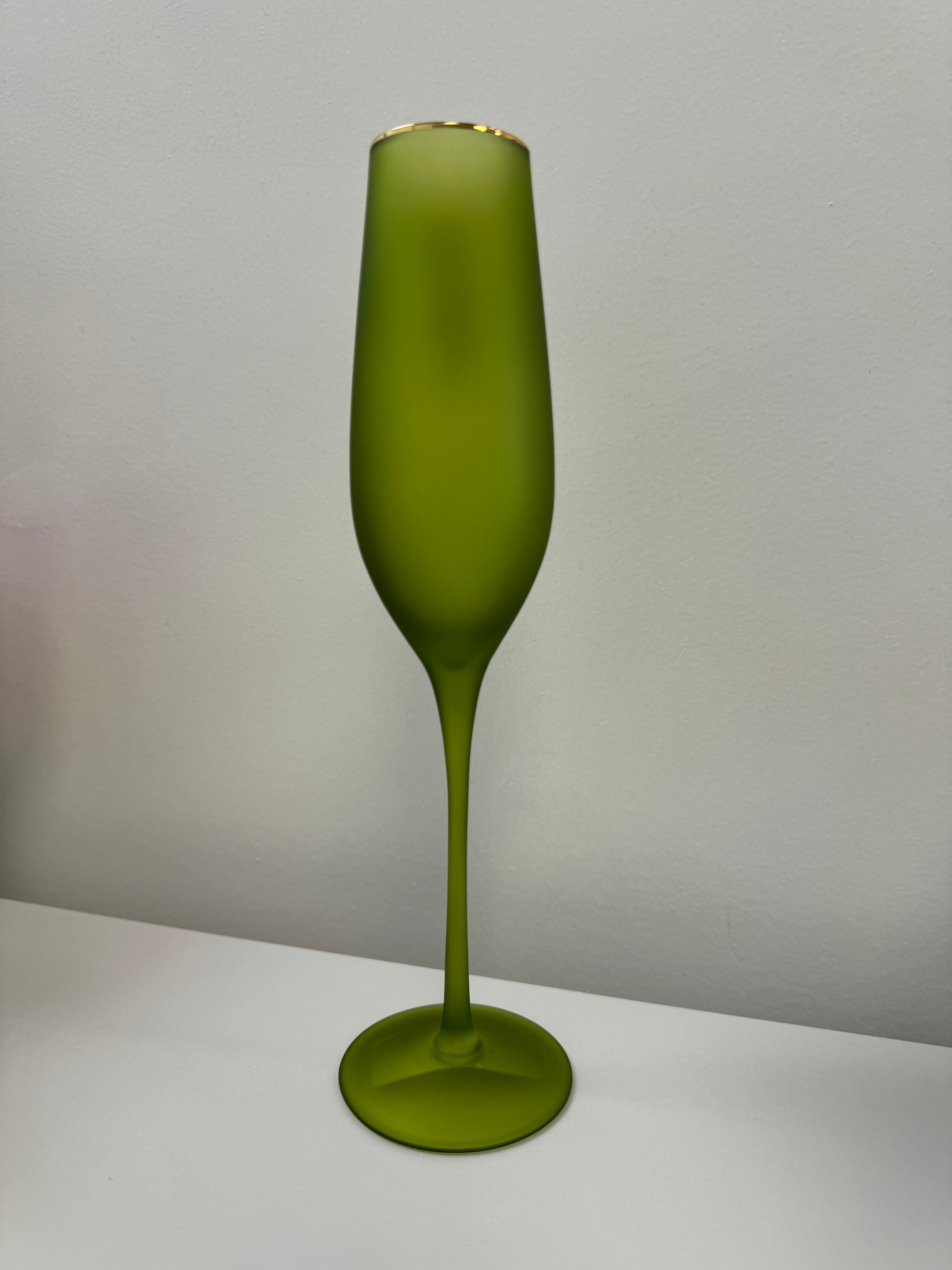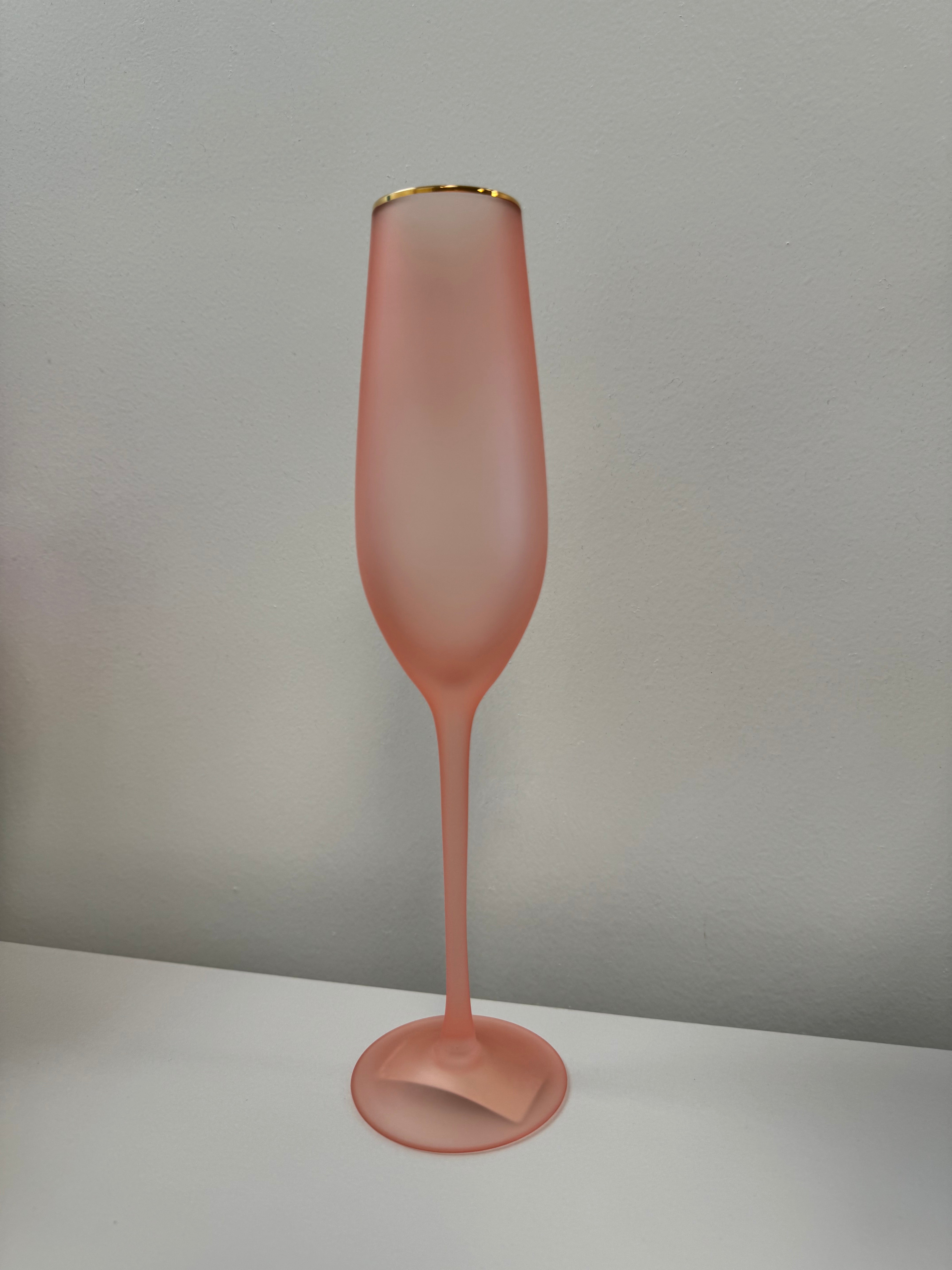 Elevate your glassware collection with our stunning Frosted Flute Glasses. Hand-blown with gold trim and available in vibrant frosted colors, these 10.25" glasses add elegance to any occasion. Hand wash only for lasting beauty. Not microwave safe.