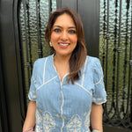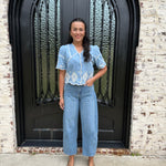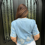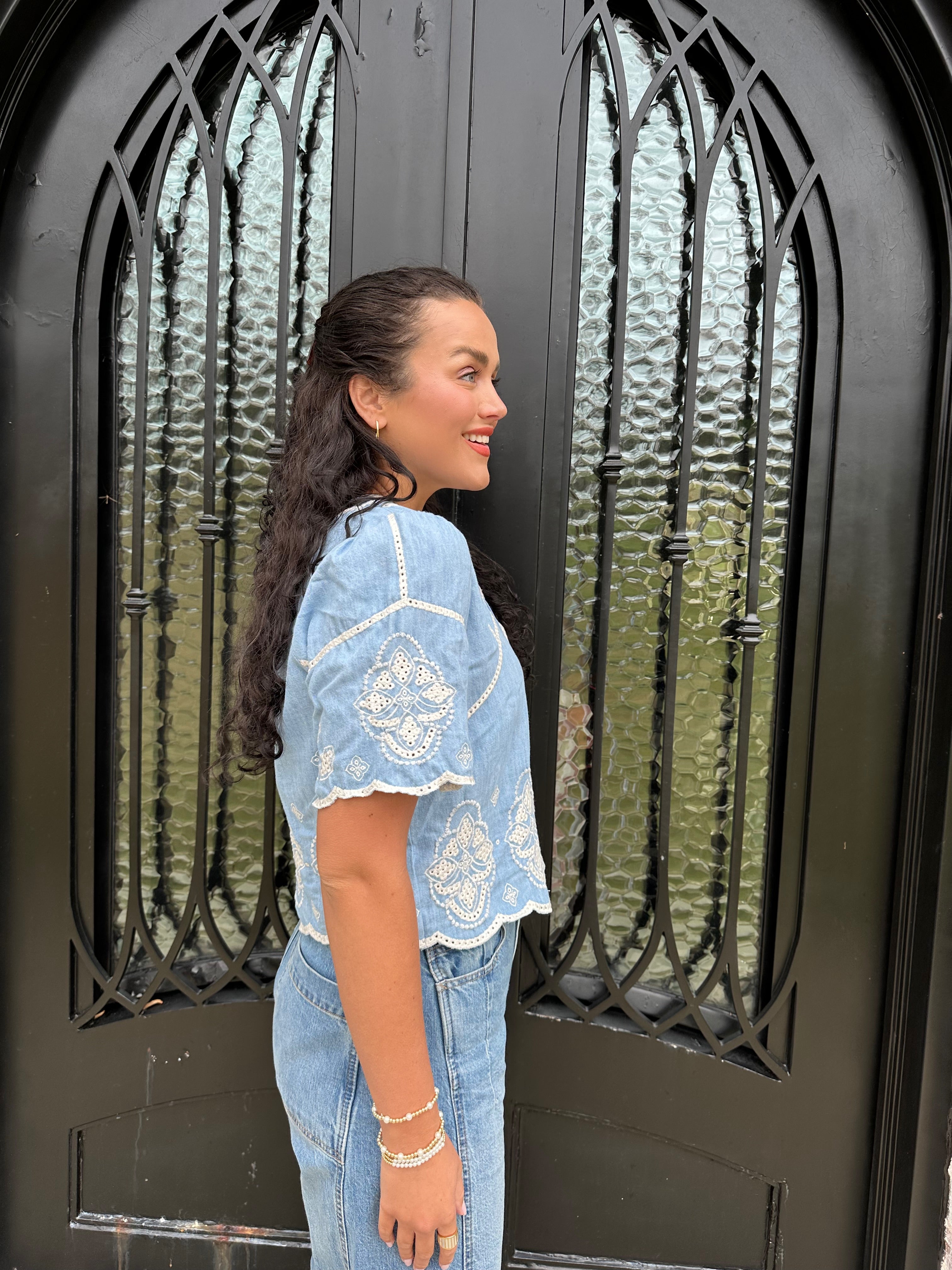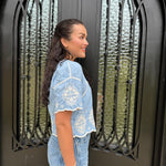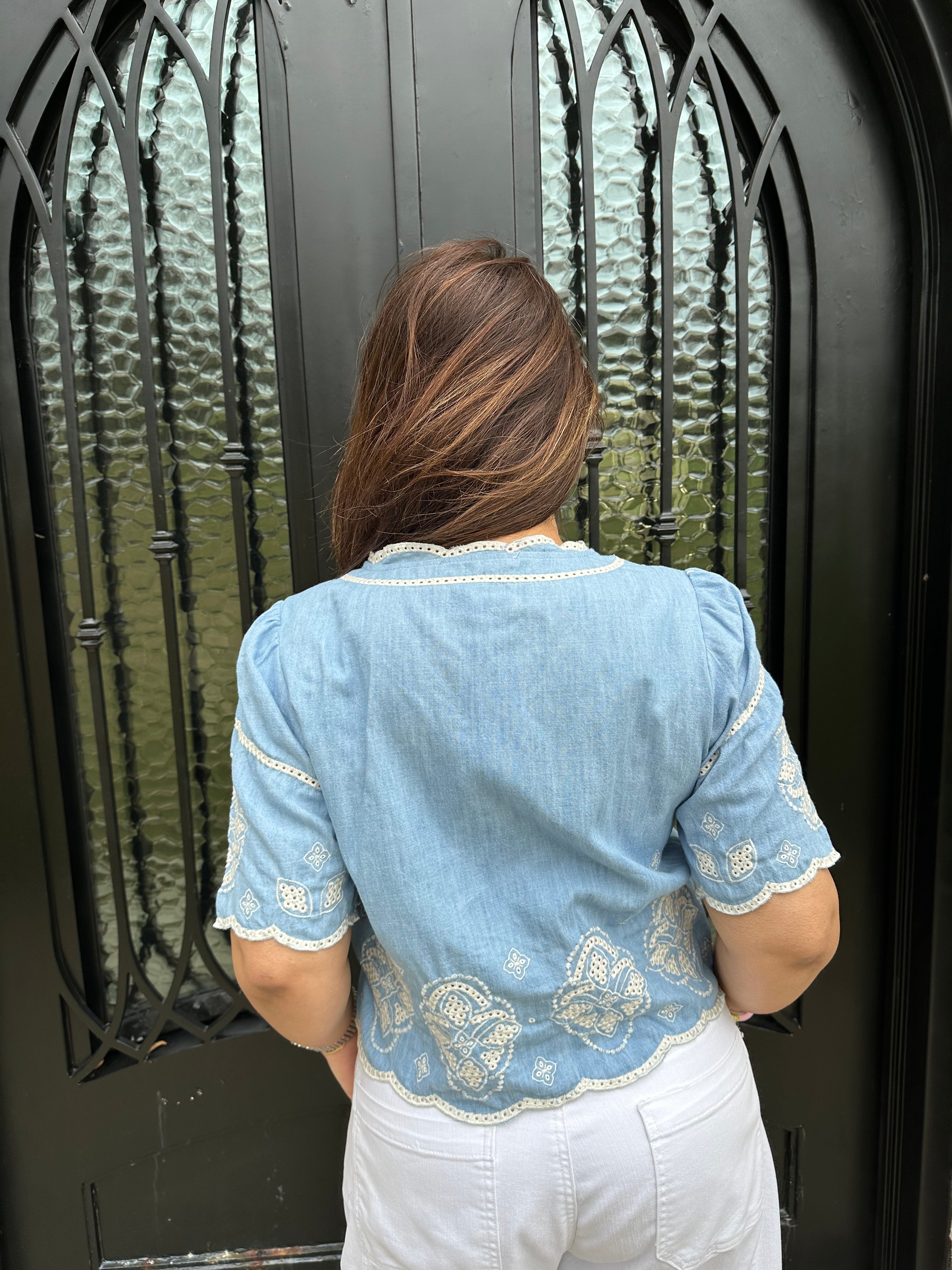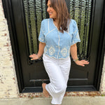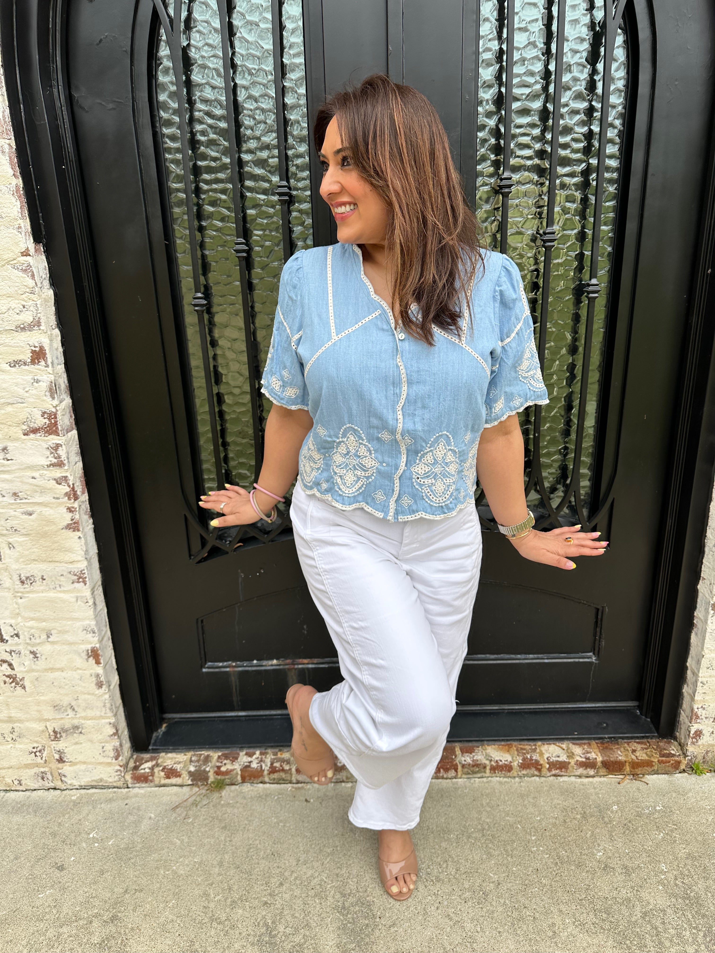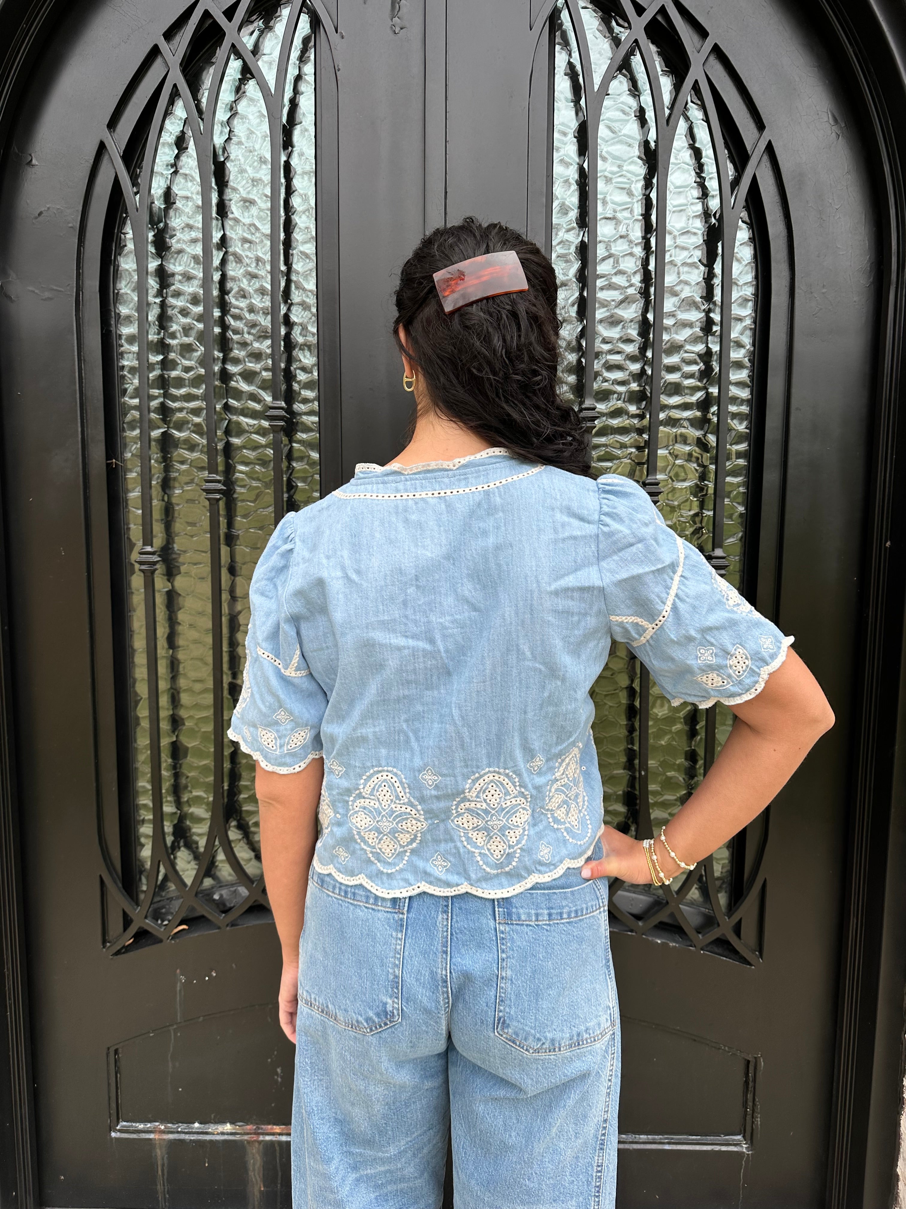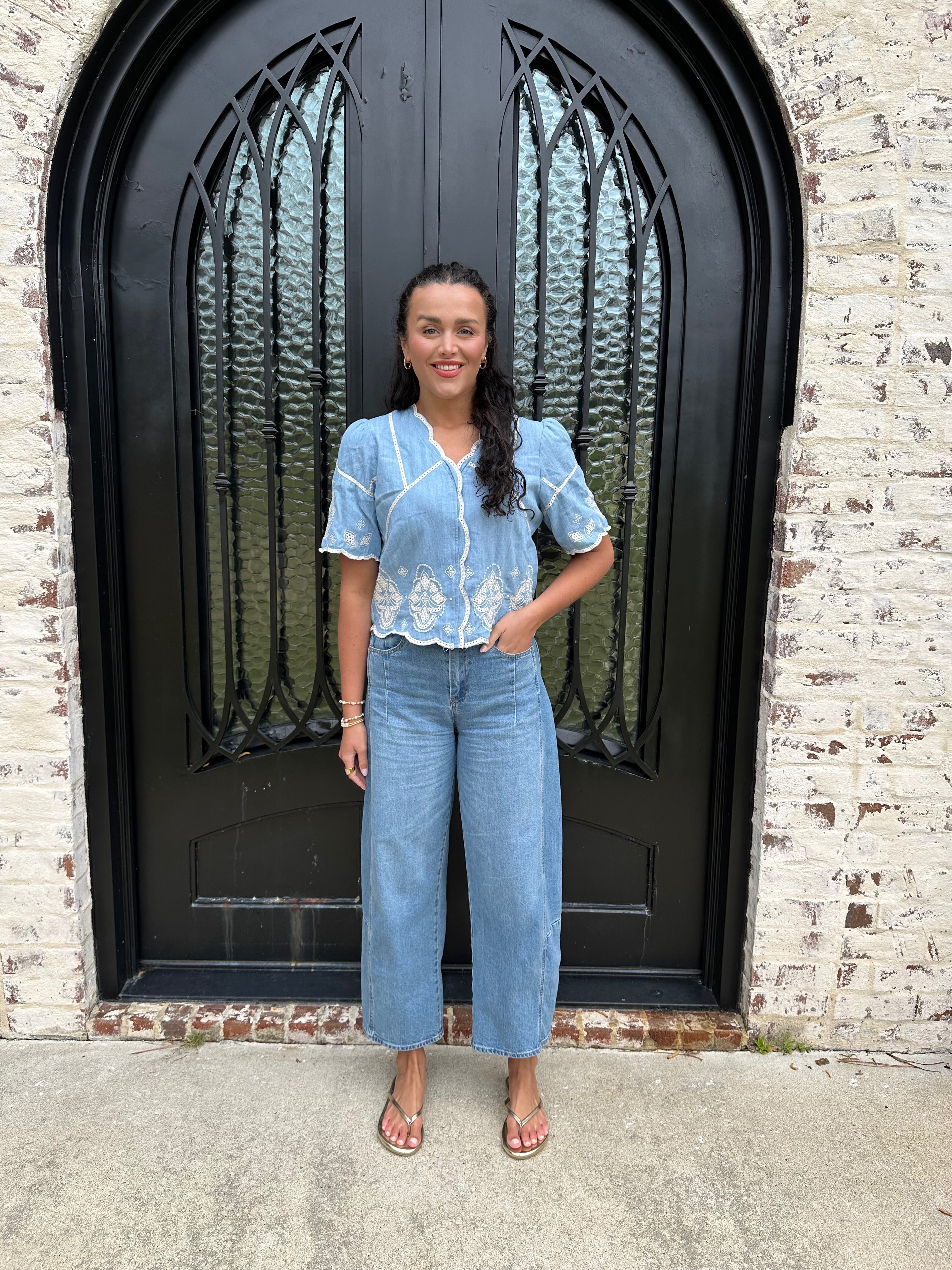 Elevate your wardrobe with the Marine Blouse! Perfect for brunches, beach outings, or casual office days, its stylish contrast embroidery and relaxed cropped fit ensure you look effortlessly chic. The hidden buttons and scalloped edge add a unique touch, making this blouse a must-have for every fashion enthusiast! We paired this blouse back with our best selling Barrel Jeans from Tractr in medium wash and white!
