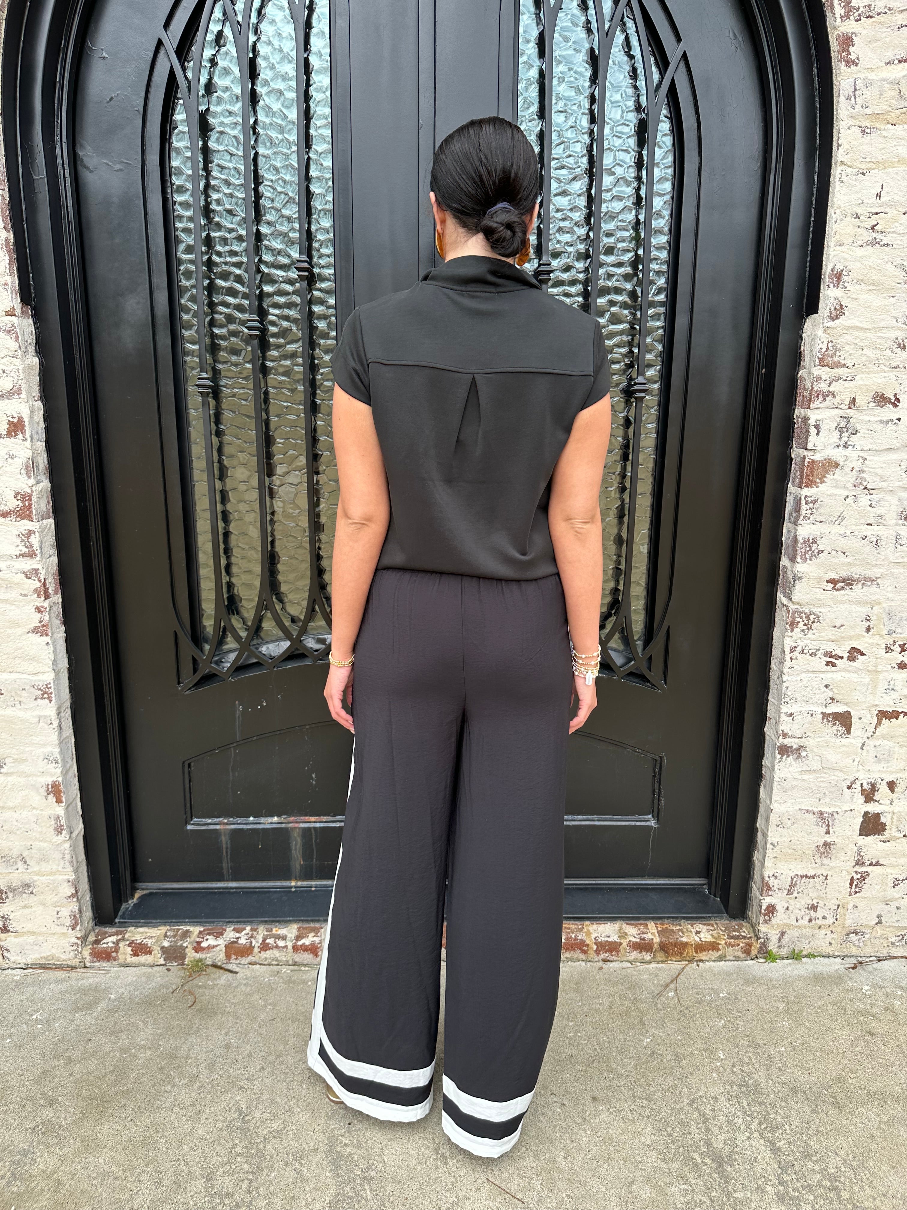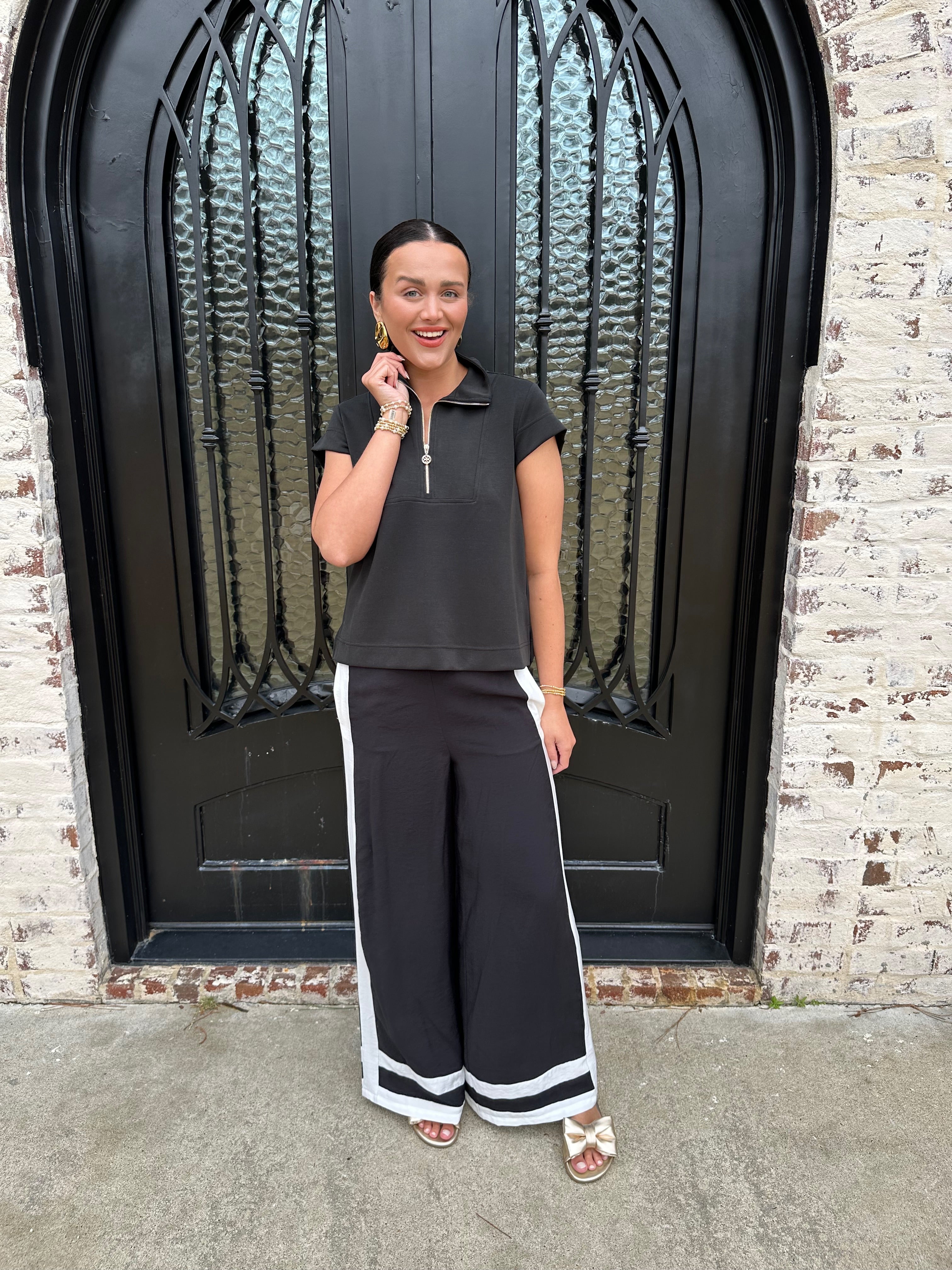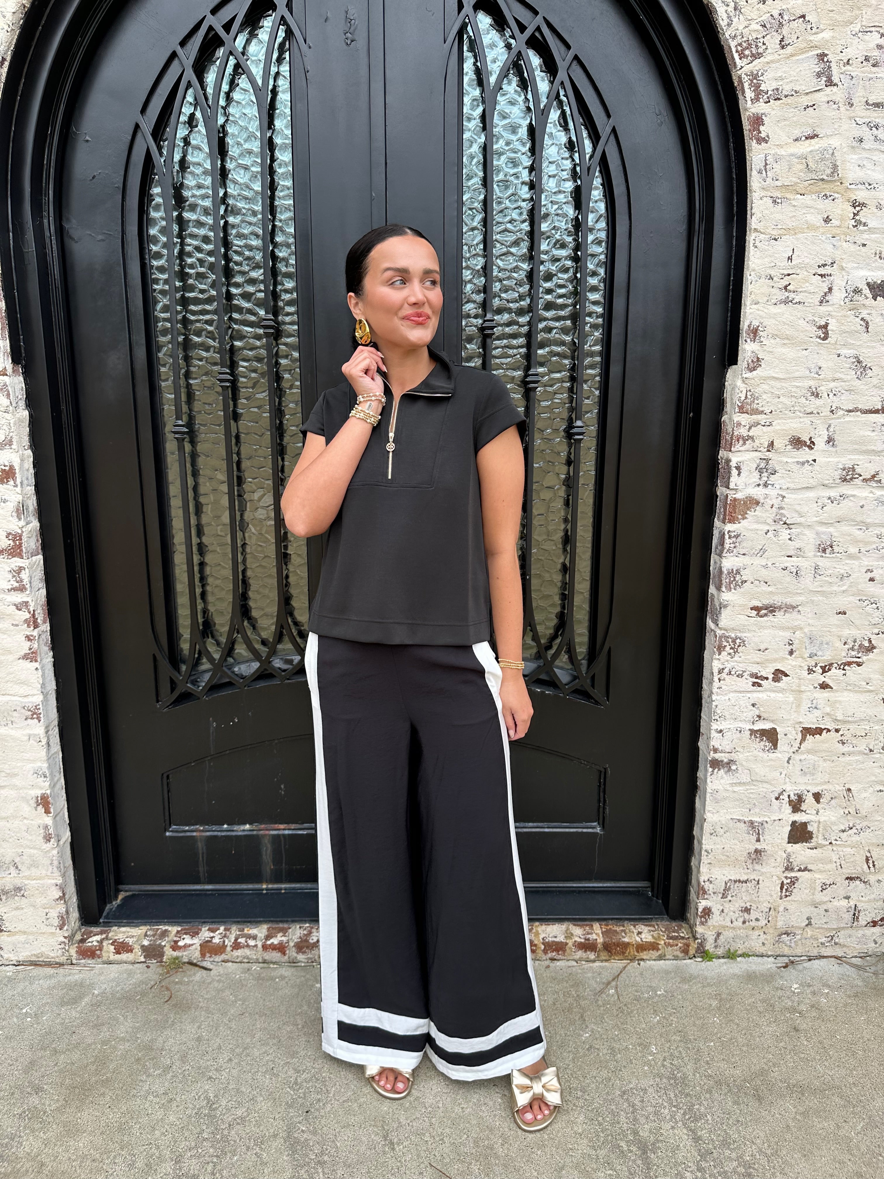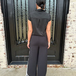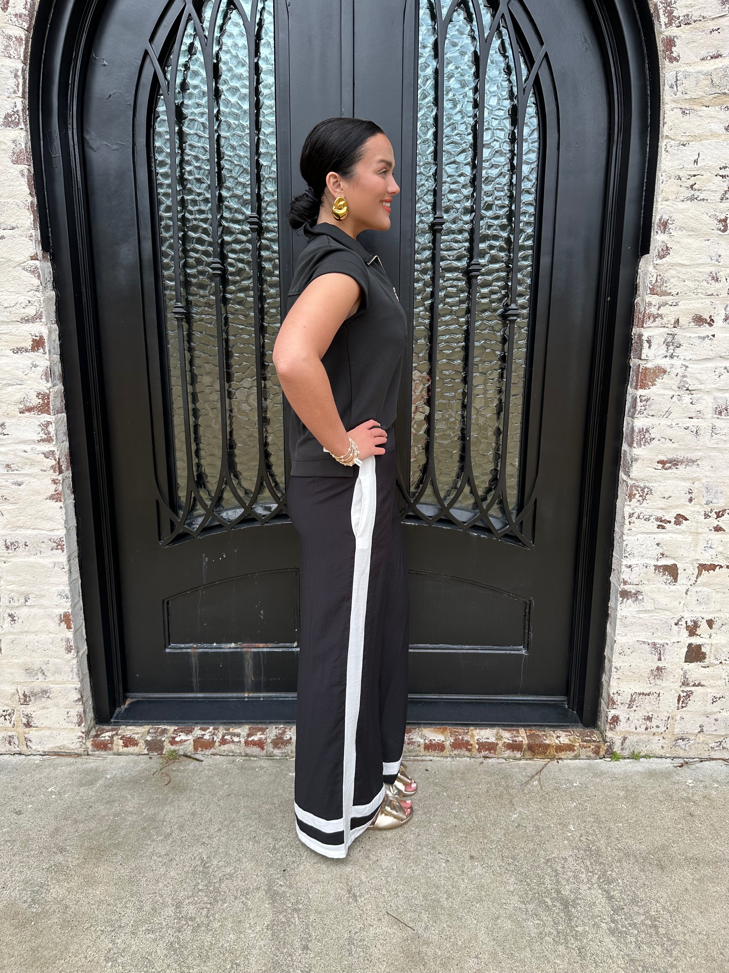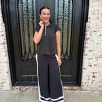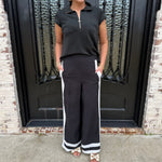 Elevate your casual style with the Whitley Pants! These white striped joggers are perfect for lounging or travel, offering comfort and versatility. Pair them effortlessly with our black Stephie top for a chic, coordinated look. Experience the freedom and ease that comes with every step!