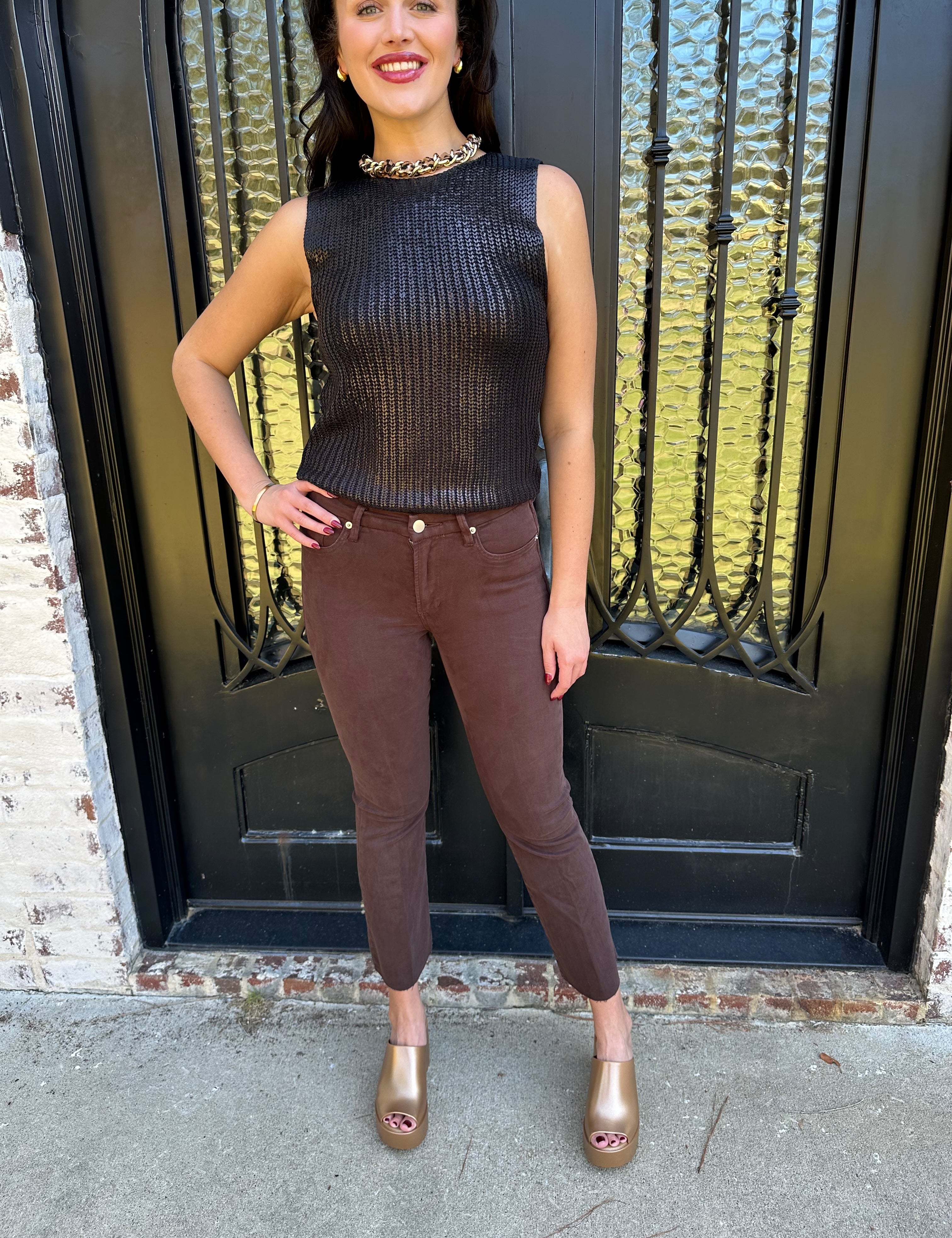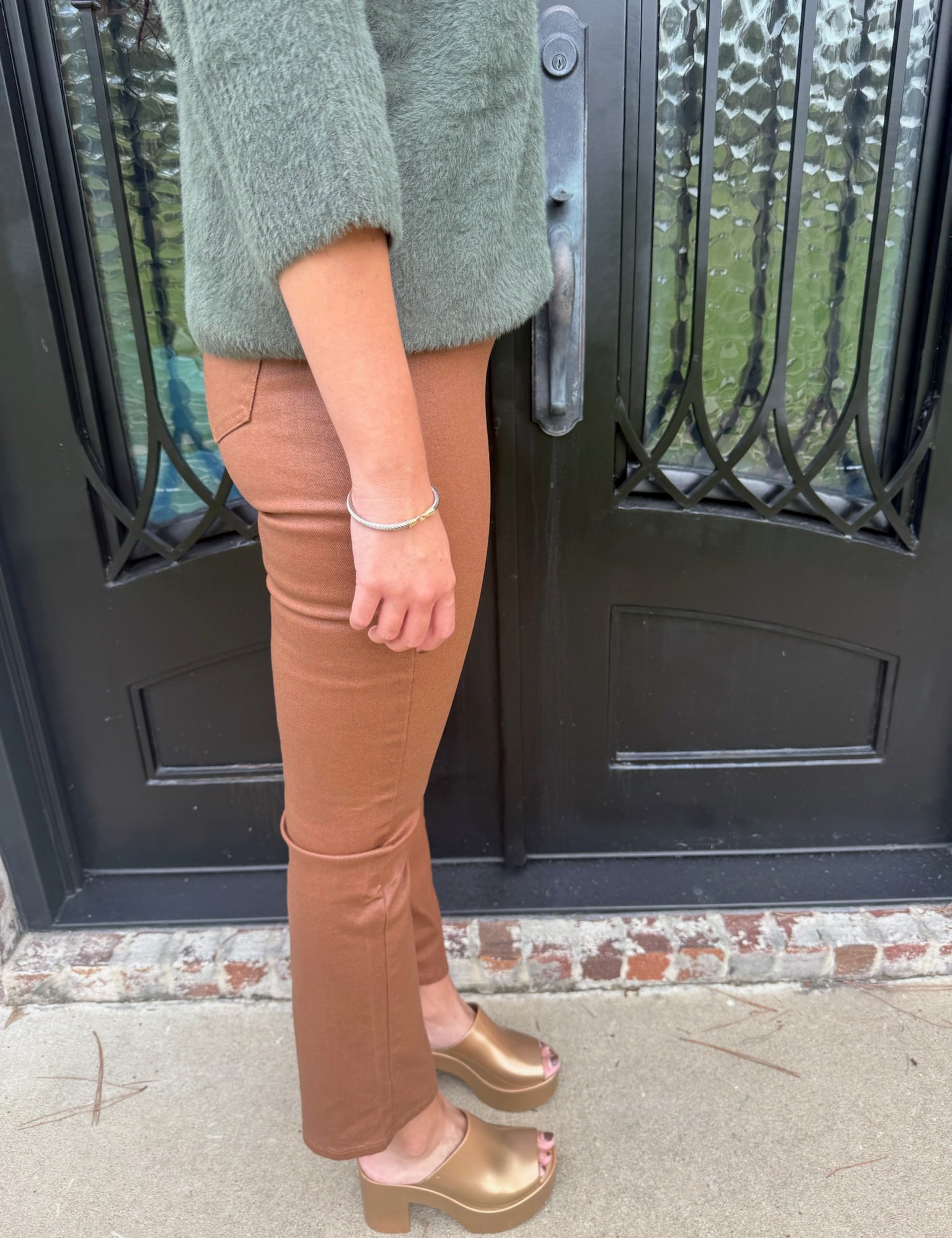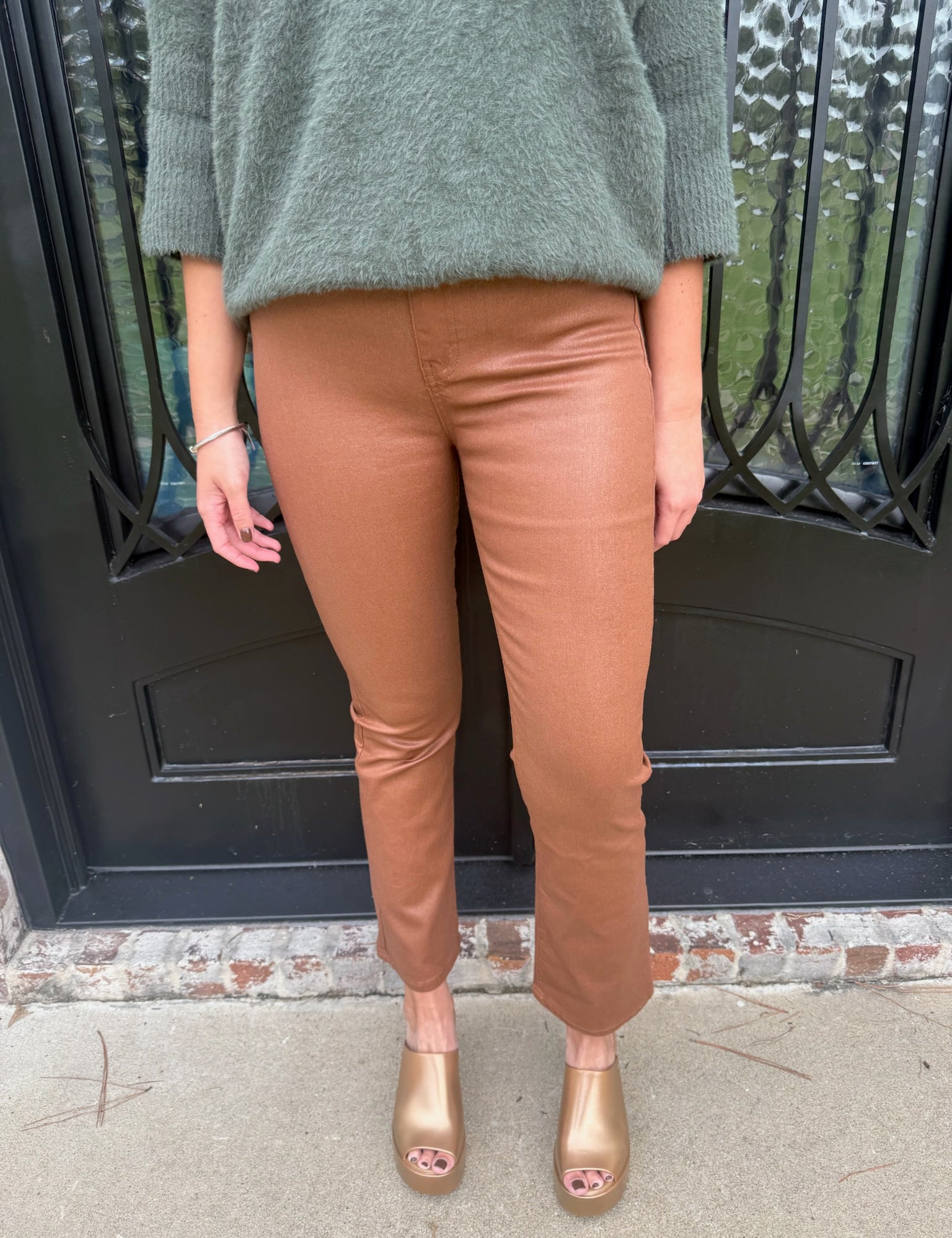 Tractr High Rise Coated Ankle Crop Flare in Cognac