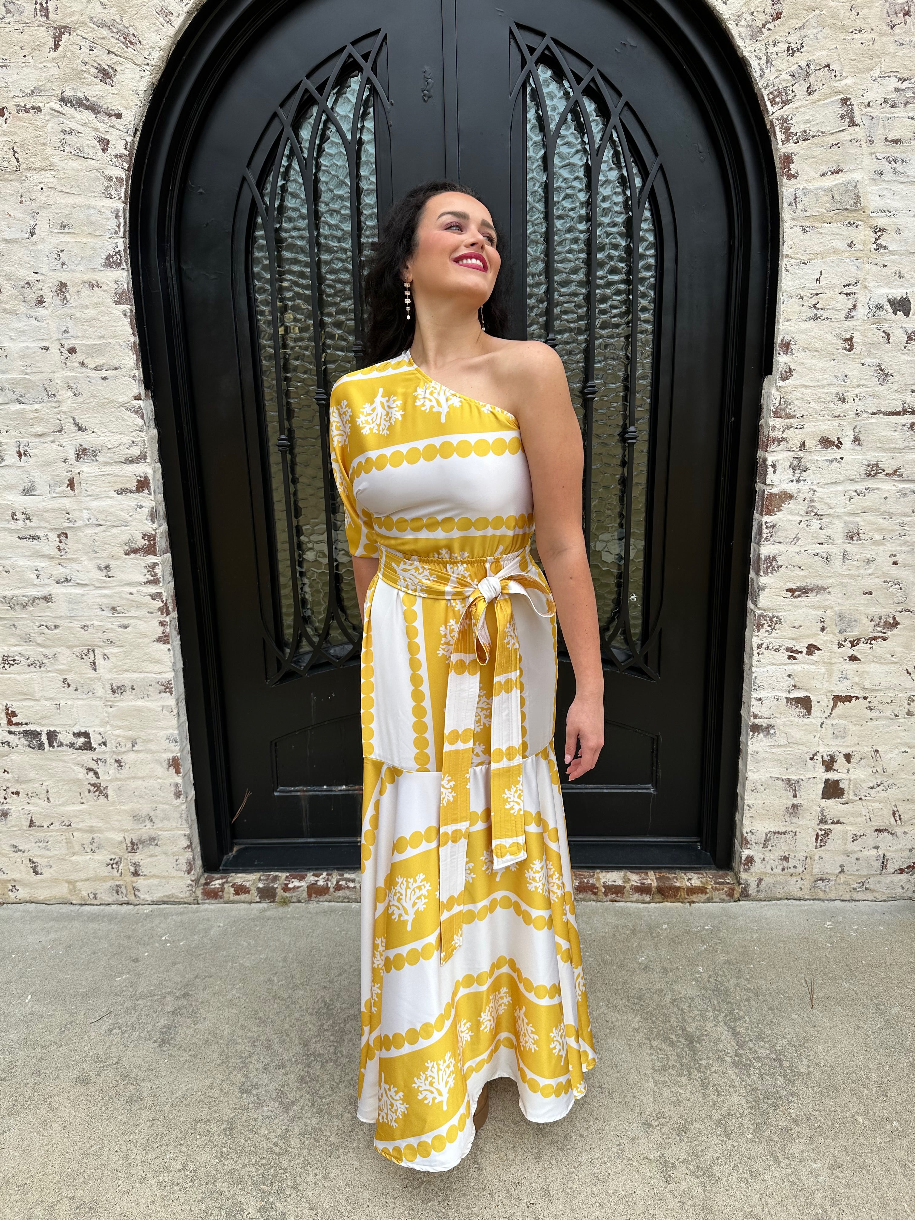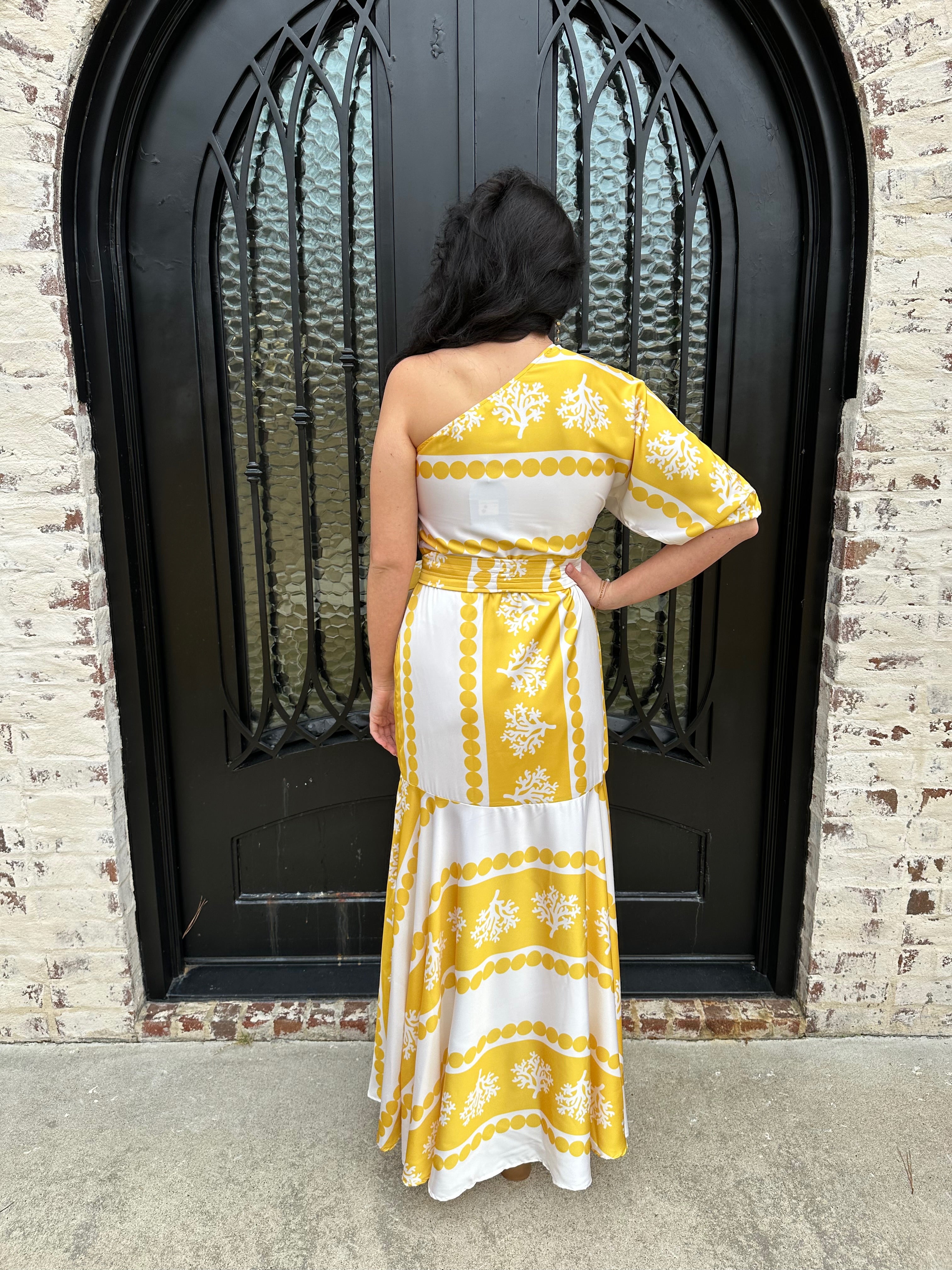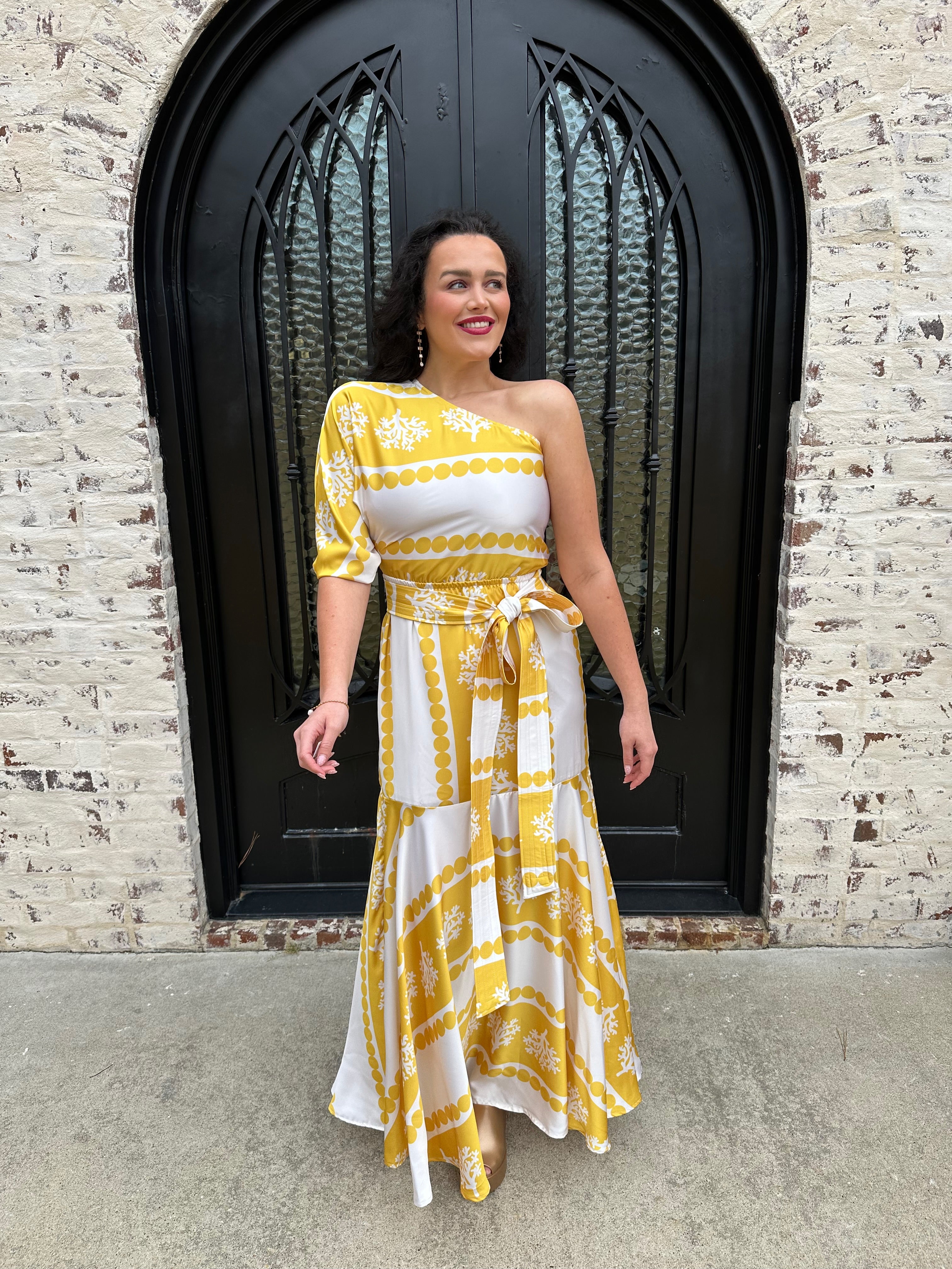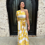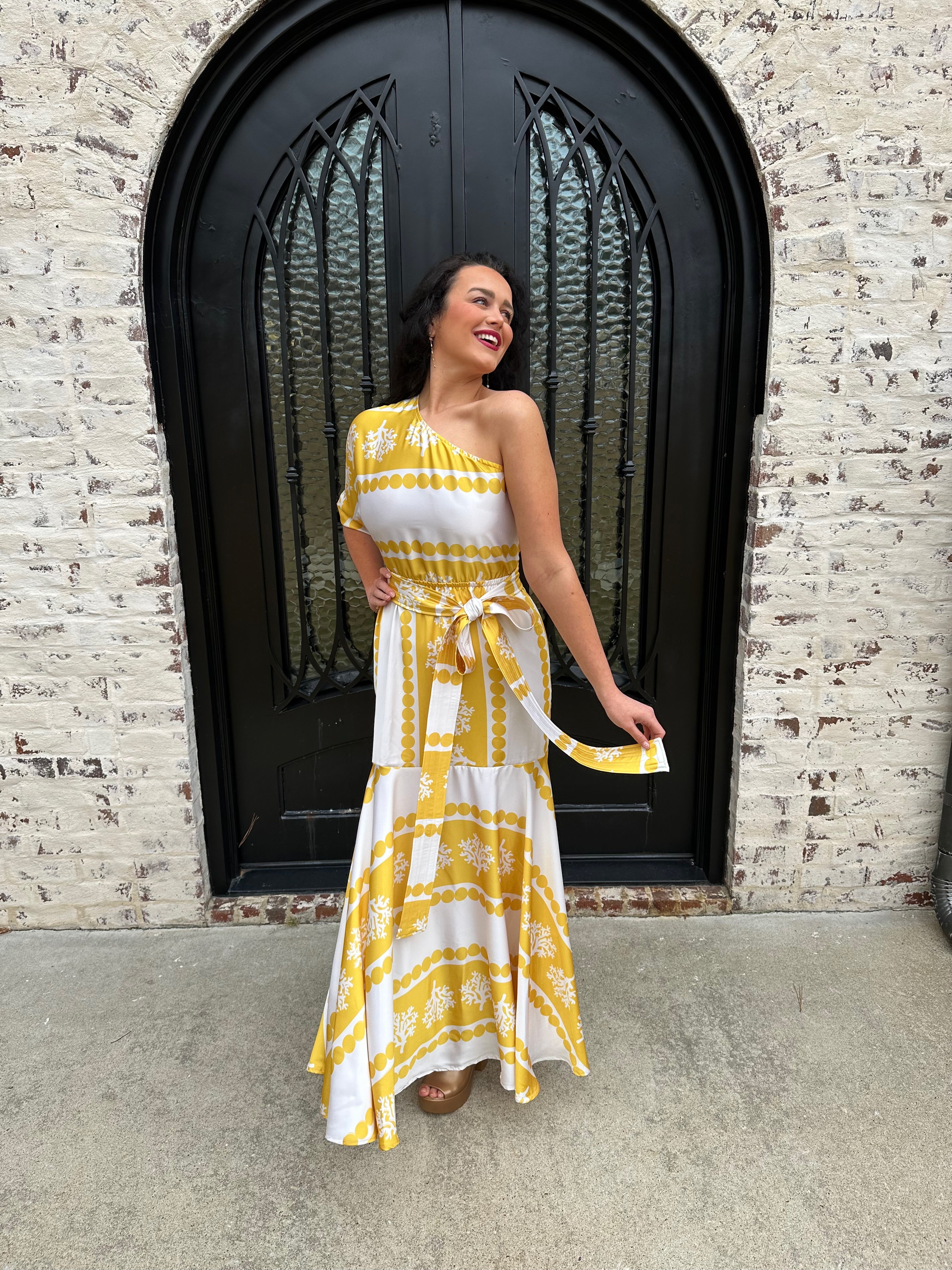Step into the spotlight with the Lavi Isabella One Shoulder Maxi Dress, where contemporary design meets timeless elegance. The vibrant yellow and white pattern creates an unforgettable first impression, while the one-shoulder cut delivers a modern, fashion-forward edge. Control your look with dual styling options—fasten the optional tie waist for a sculpted, defined silhouette, or embrace the elastic waist for unrestricted comfort and ease. Perfect for weddings, galas, date nights, or any occasion demanding sophistication, this maxi dress transitions seamlessly from season to season. Invest in a piece that celebrates your individuality and ensures you'll always feel poised, powerful, and utterly captivating.
