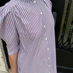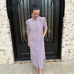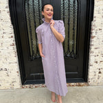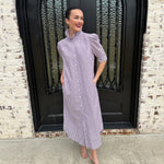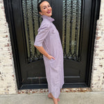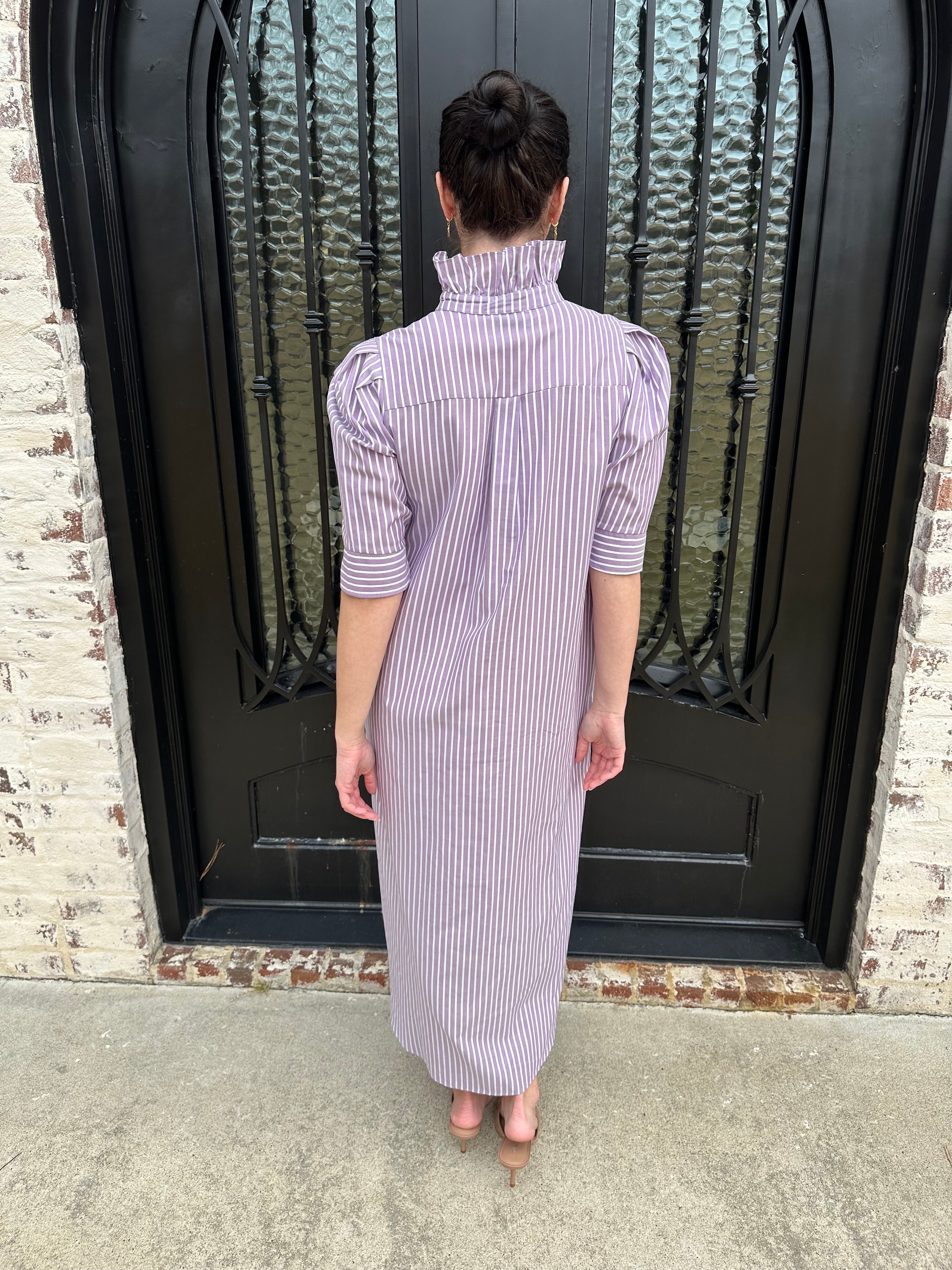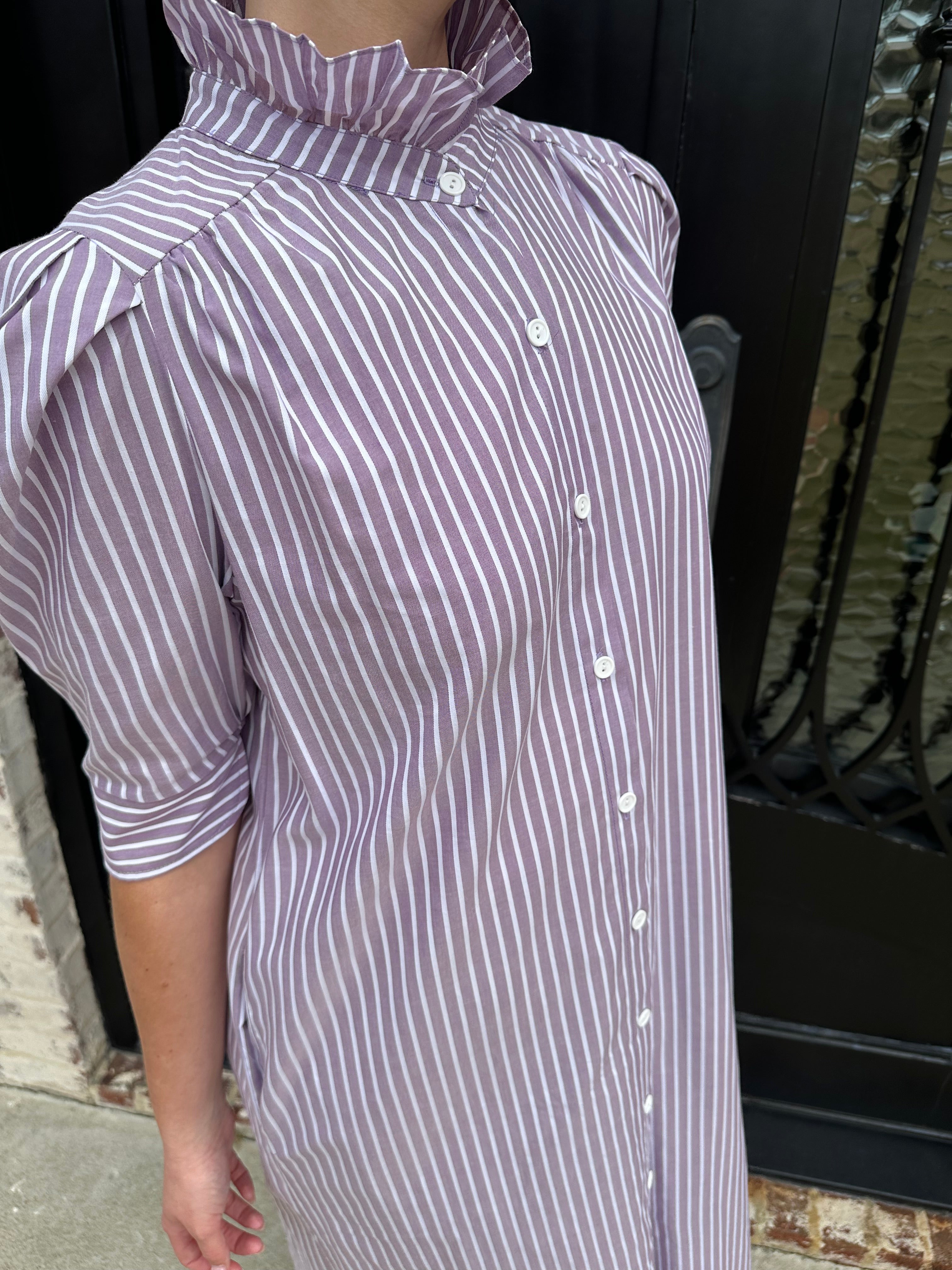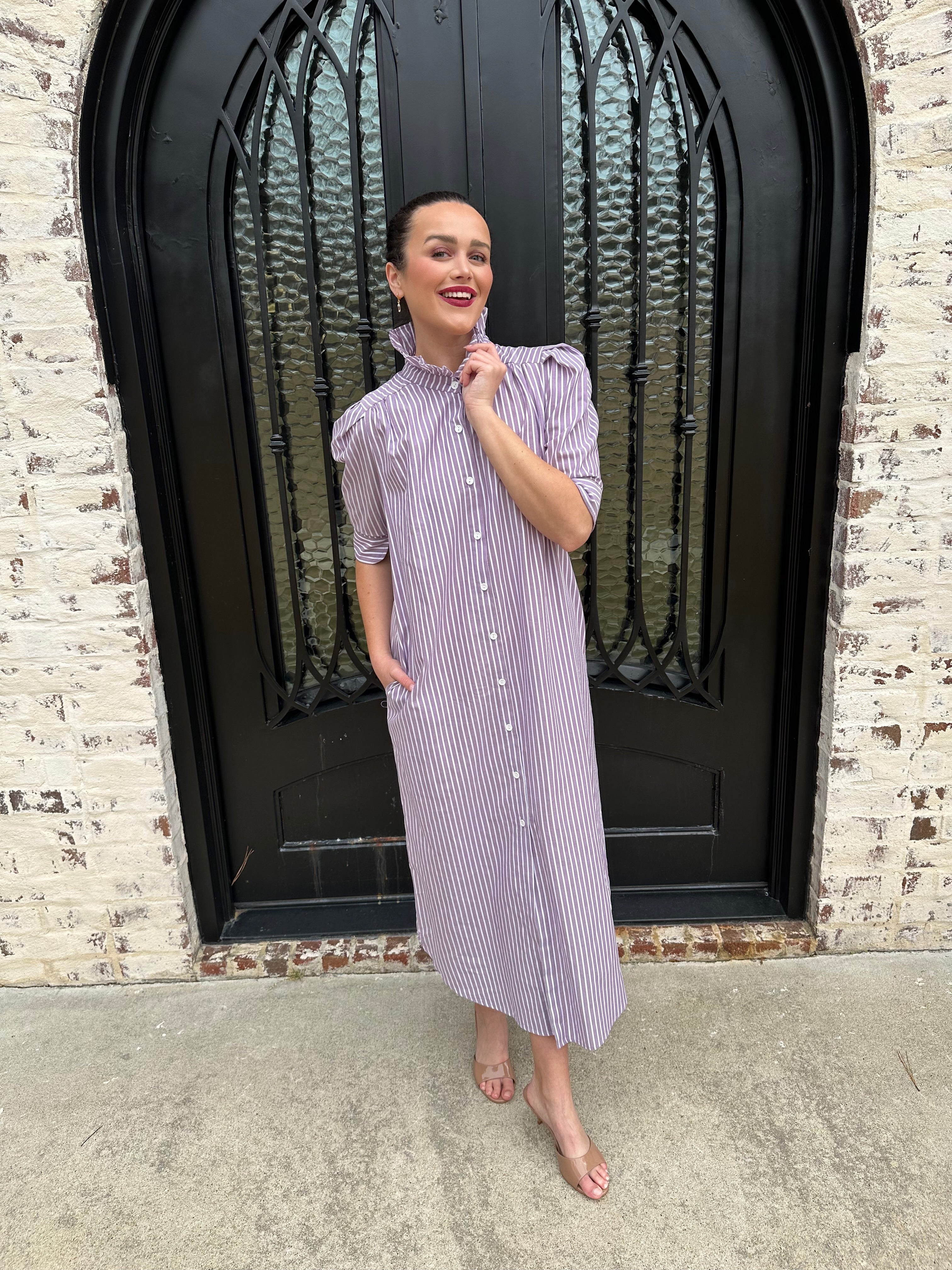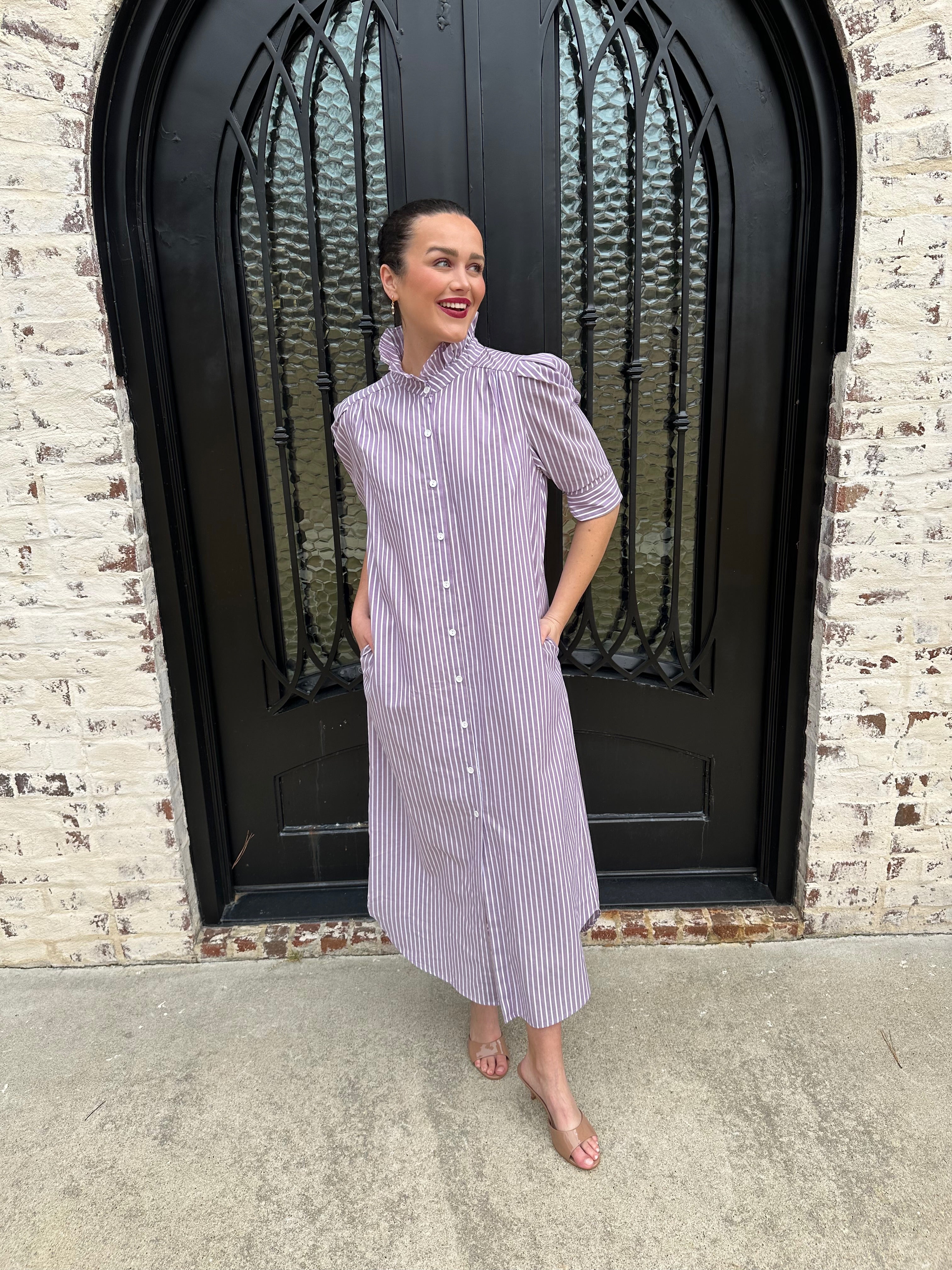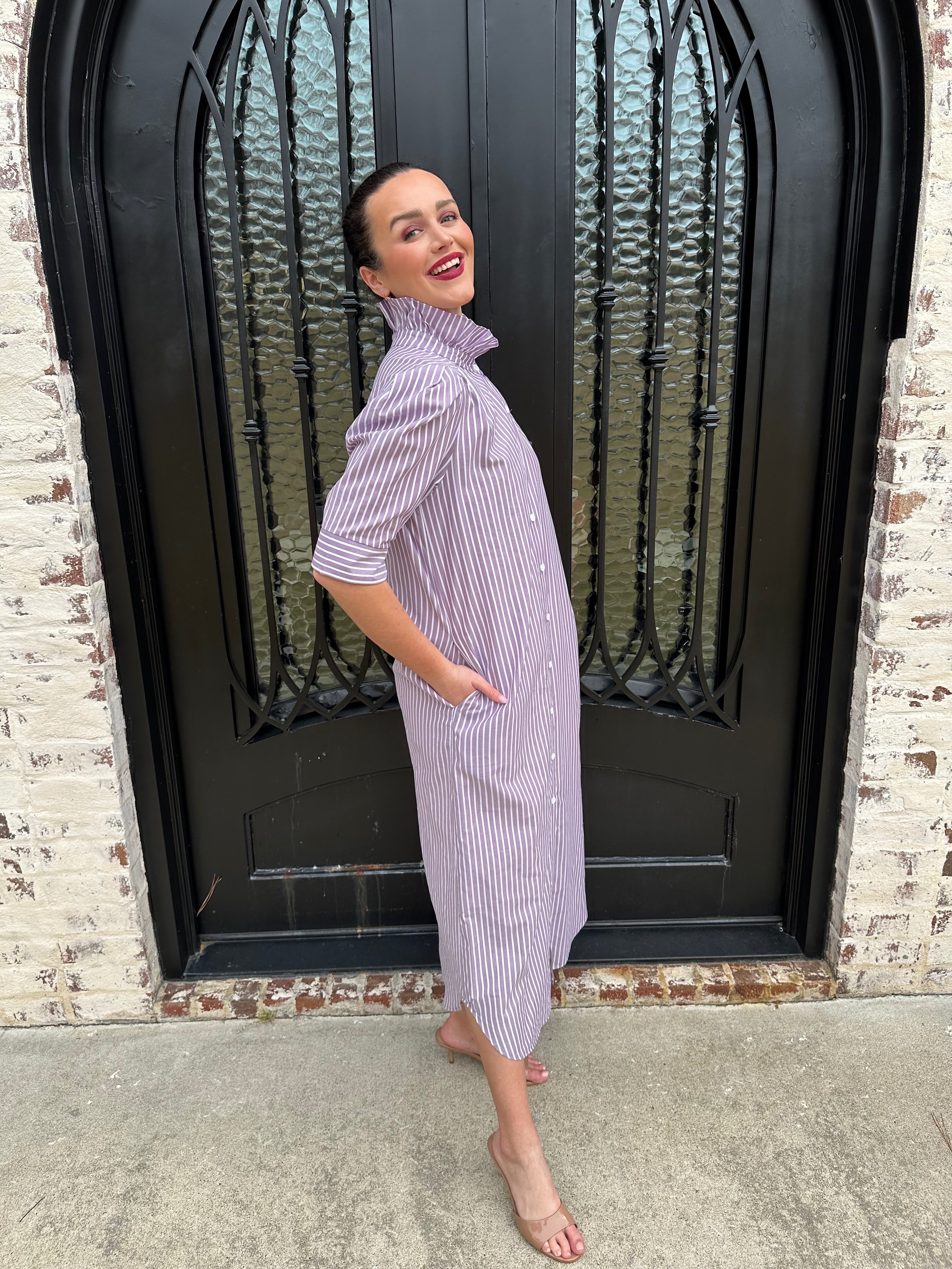 The Nina Shirt Dress in Purple Stripes is a stylish update to our best-selling blue stripes favorite. This midi-length dress features a charming ruffle neck, button-up front, and short sleeves, creating a perfect balance of feminine detail and casual ease. Designed for effortless wear, it’s a versatile choice that brings a fresh pop of color to your wardrobe while maintaining the flattering fit you love.