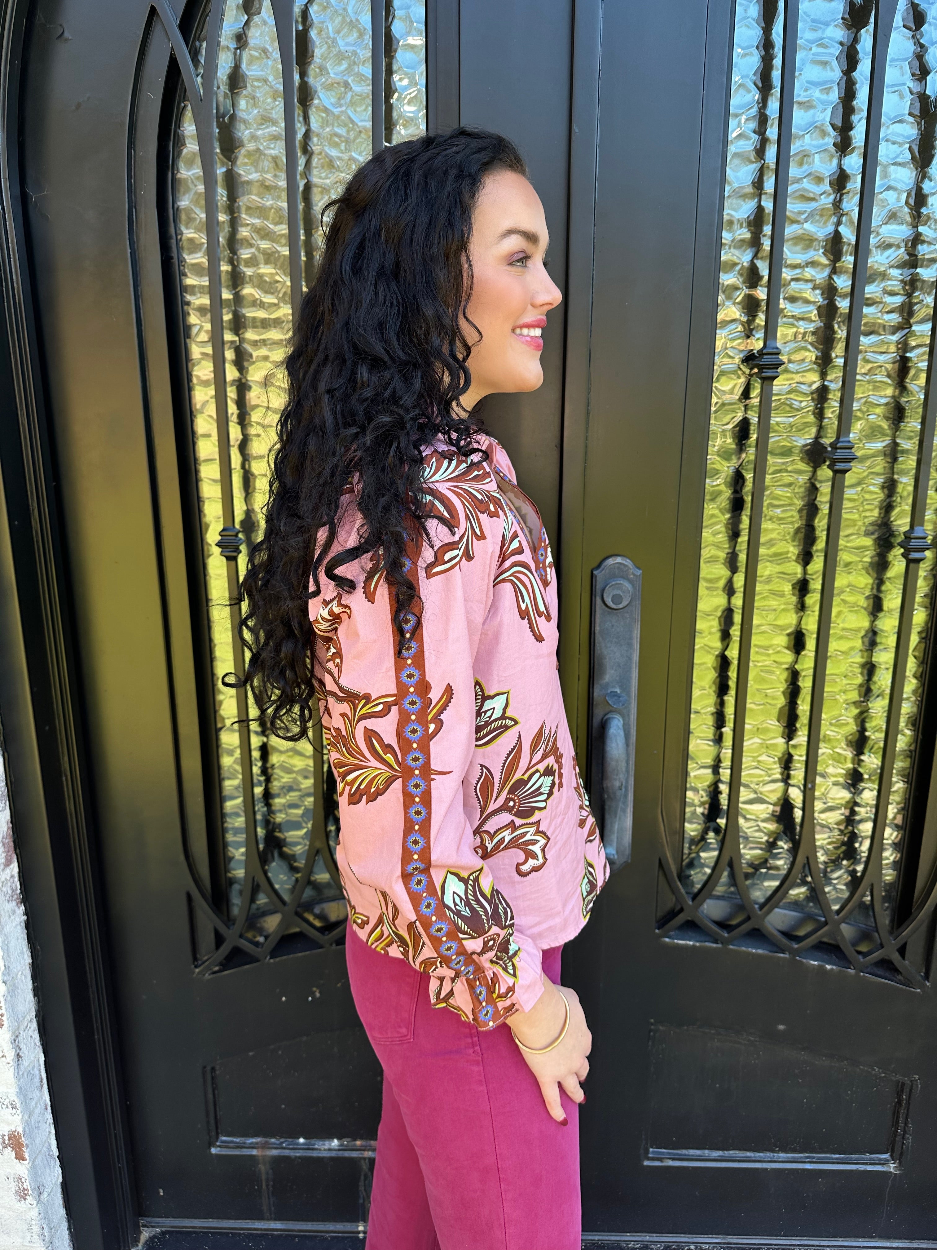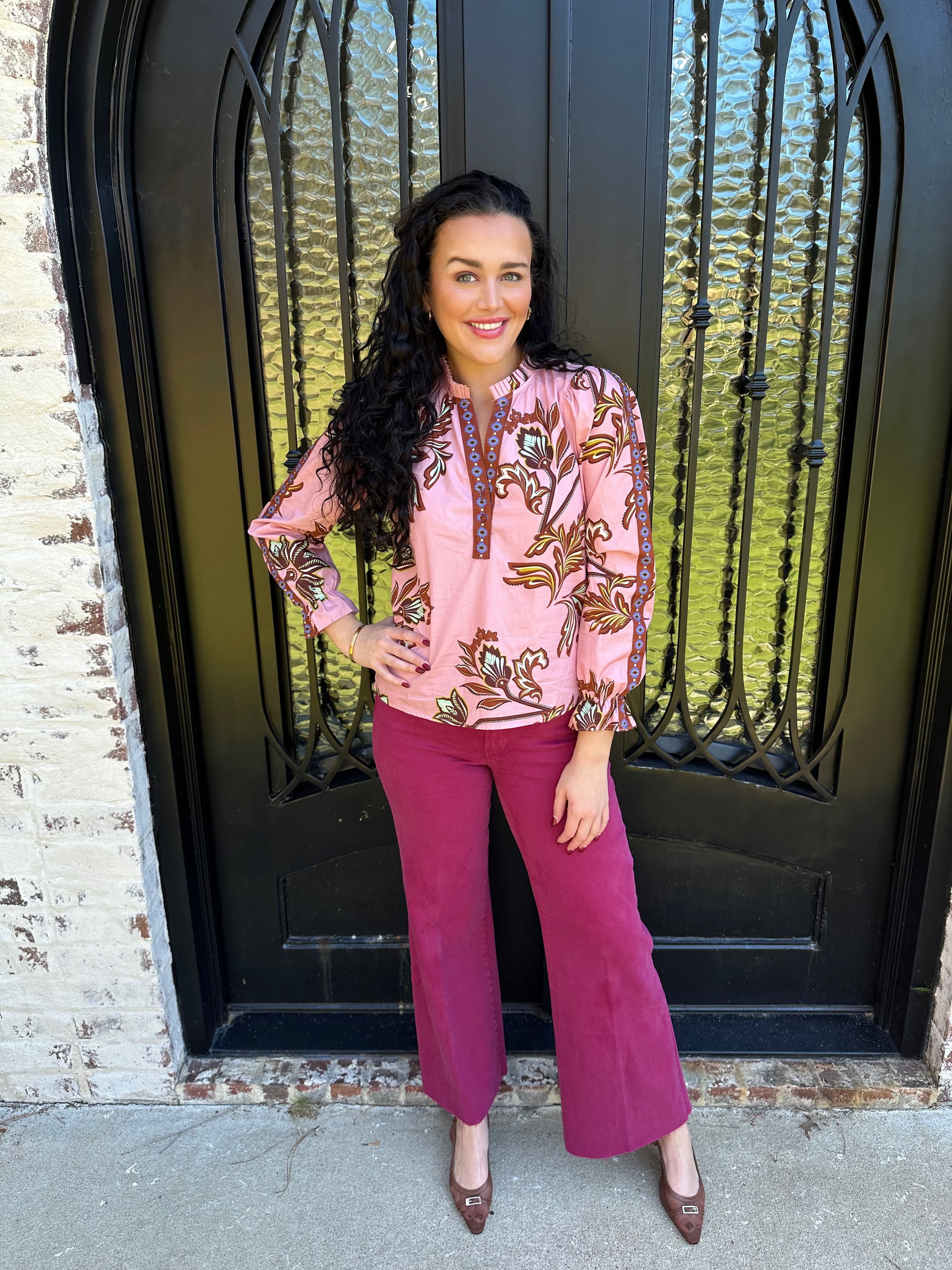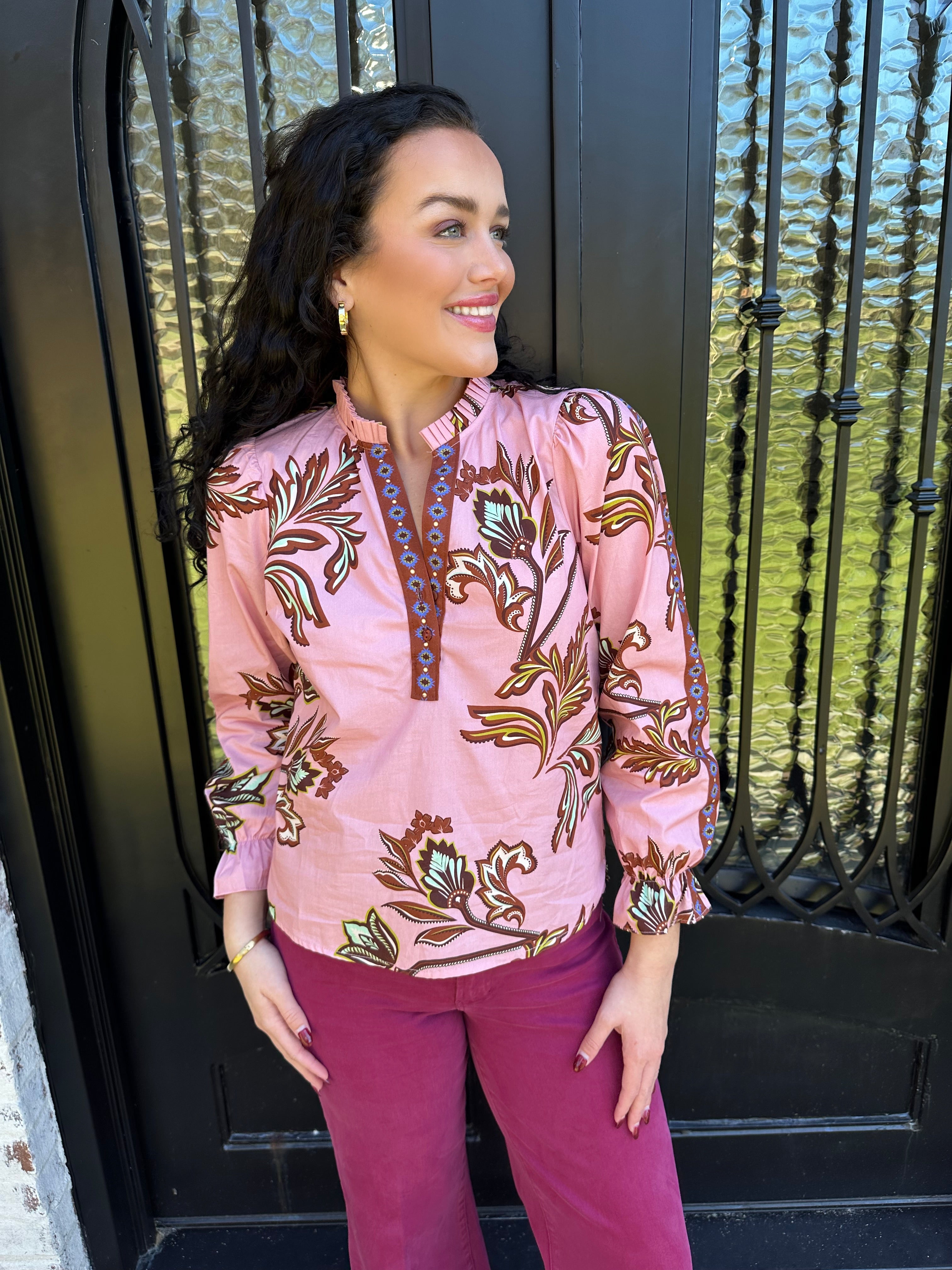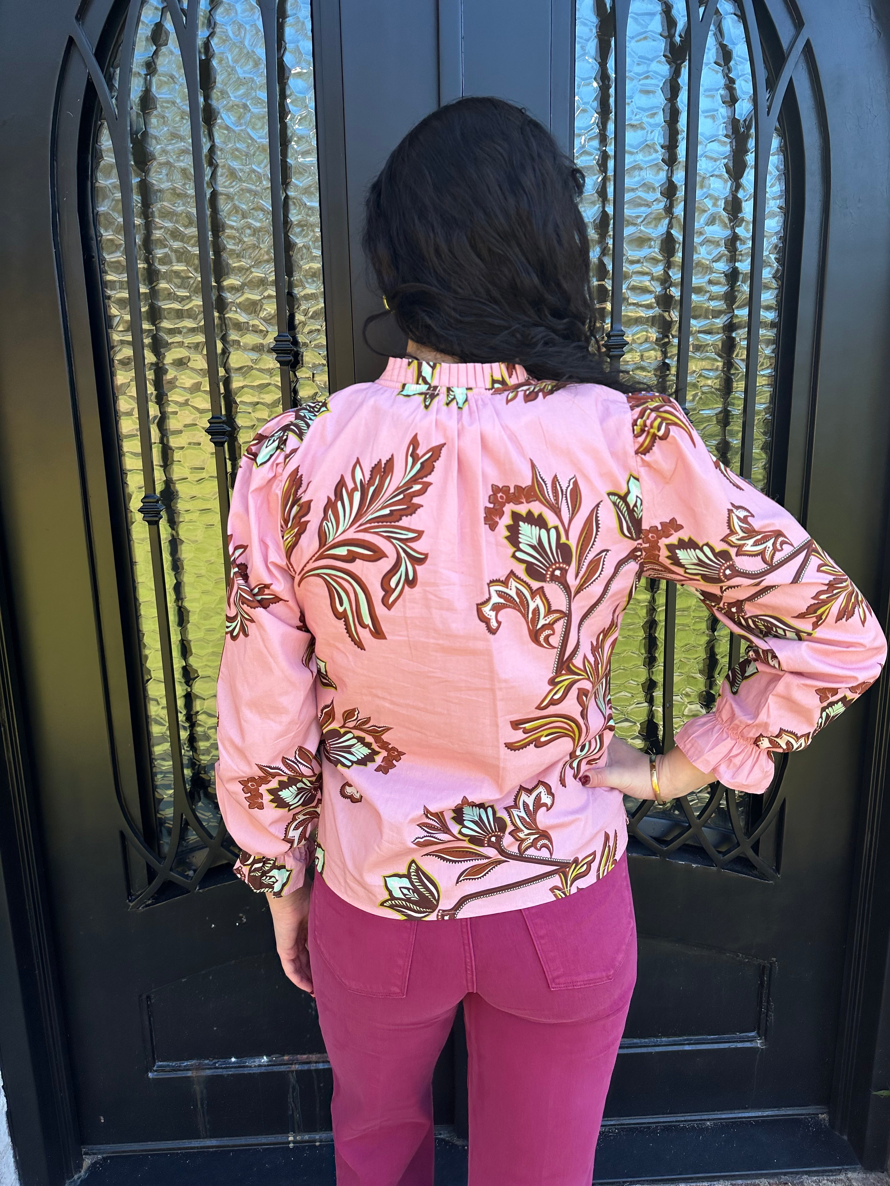 The beloved Ashley Top returns in a stunning pink floral design—your go-to piece for effortless style. This classic long-sleeve blouse transitions seamlessly from casual to dressy, pairing beautifully with your favorite jeans for weekend outings or a midi skirt for dinner dates and special occasions. Versatile, flattering, and undeniably chic, it's the wardrobe essential you've been waiting for.