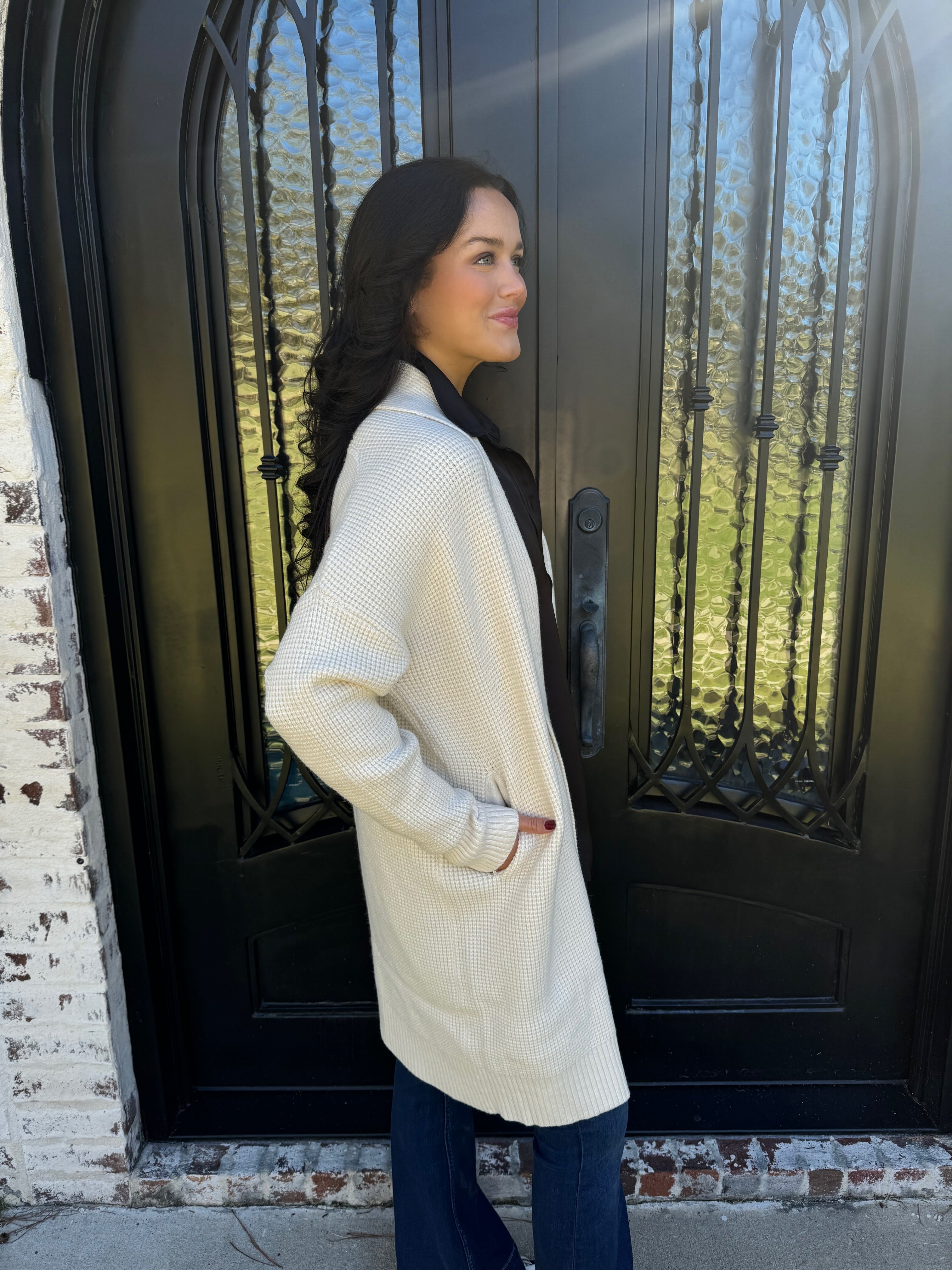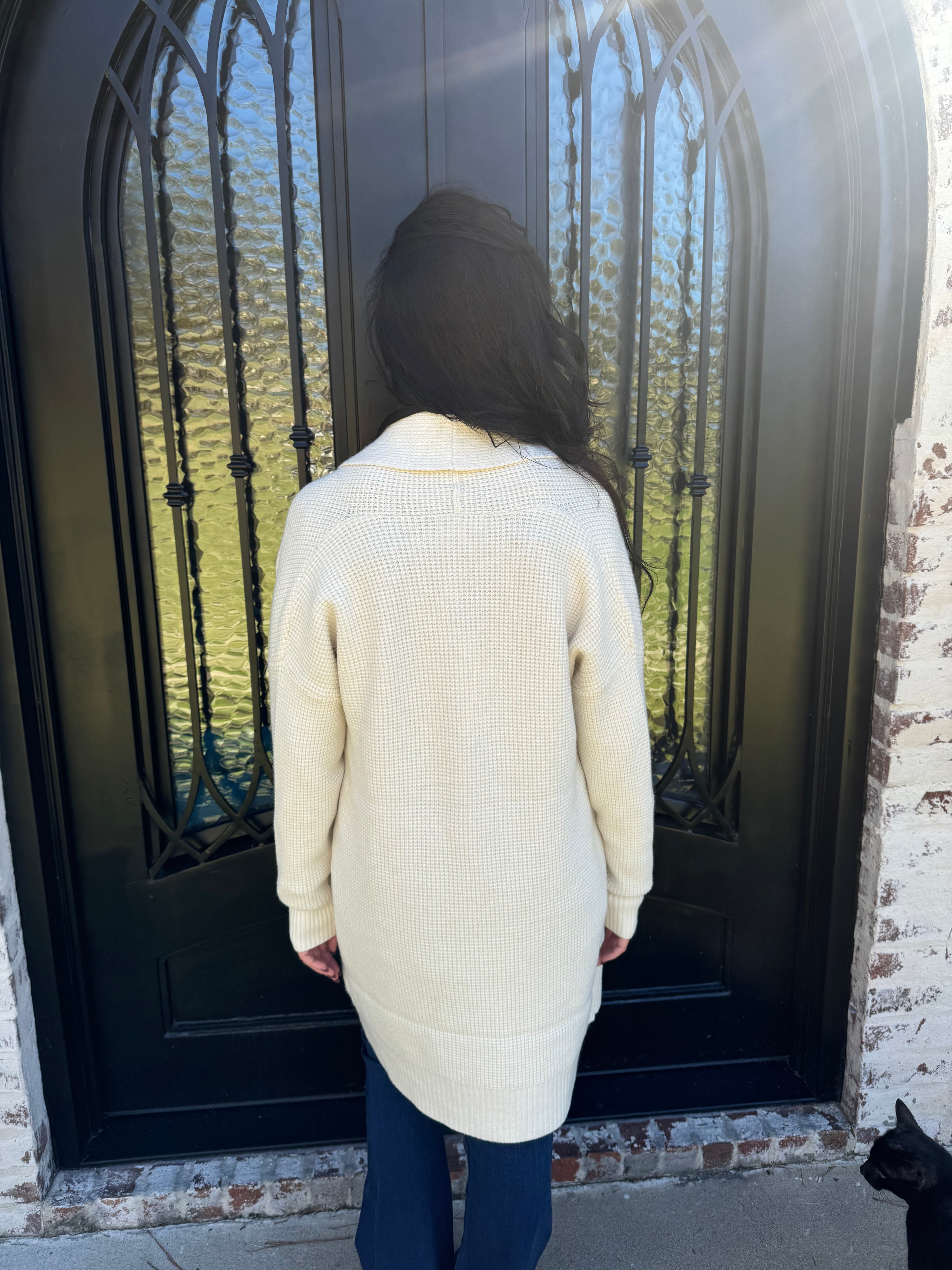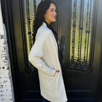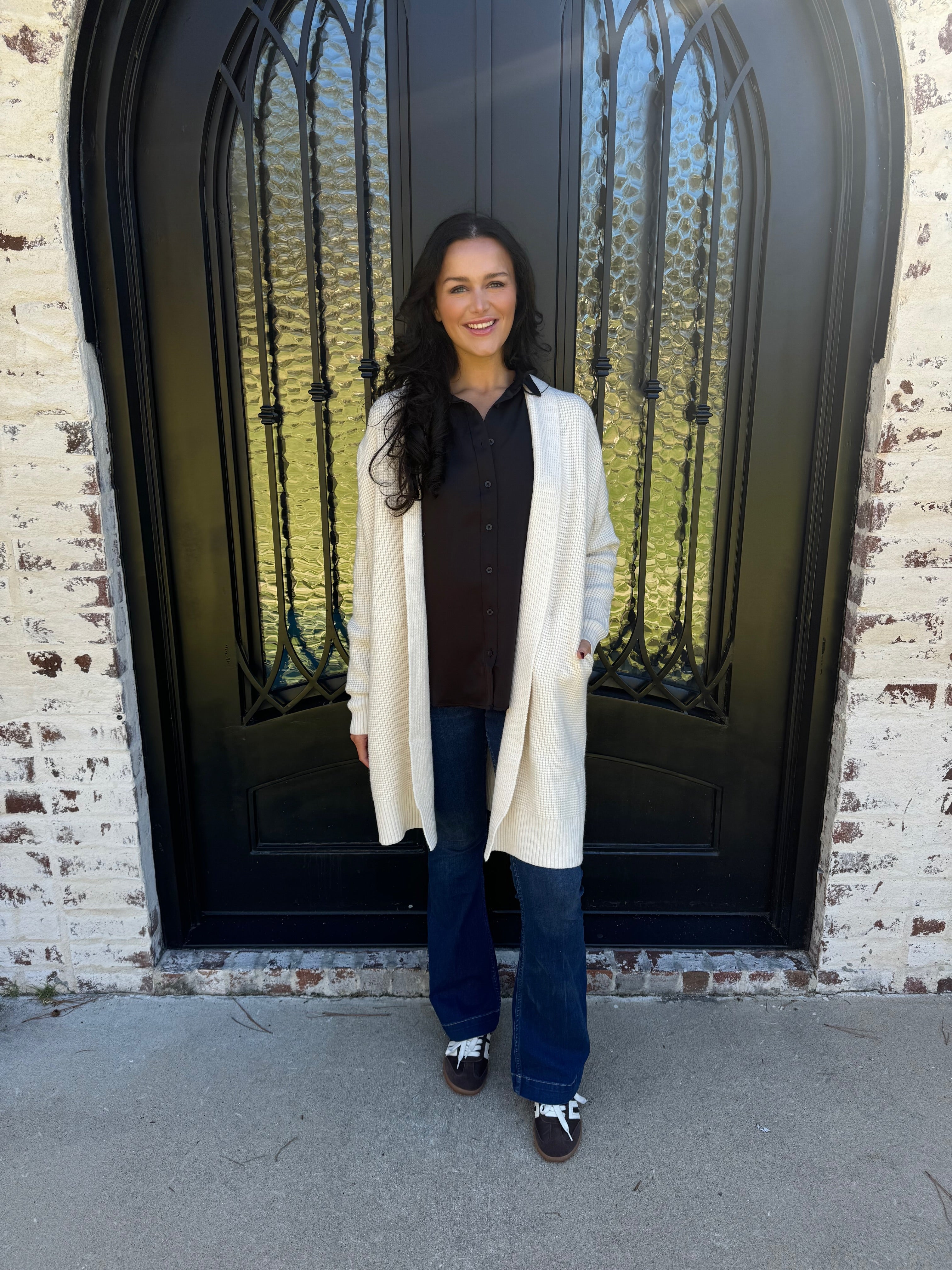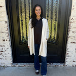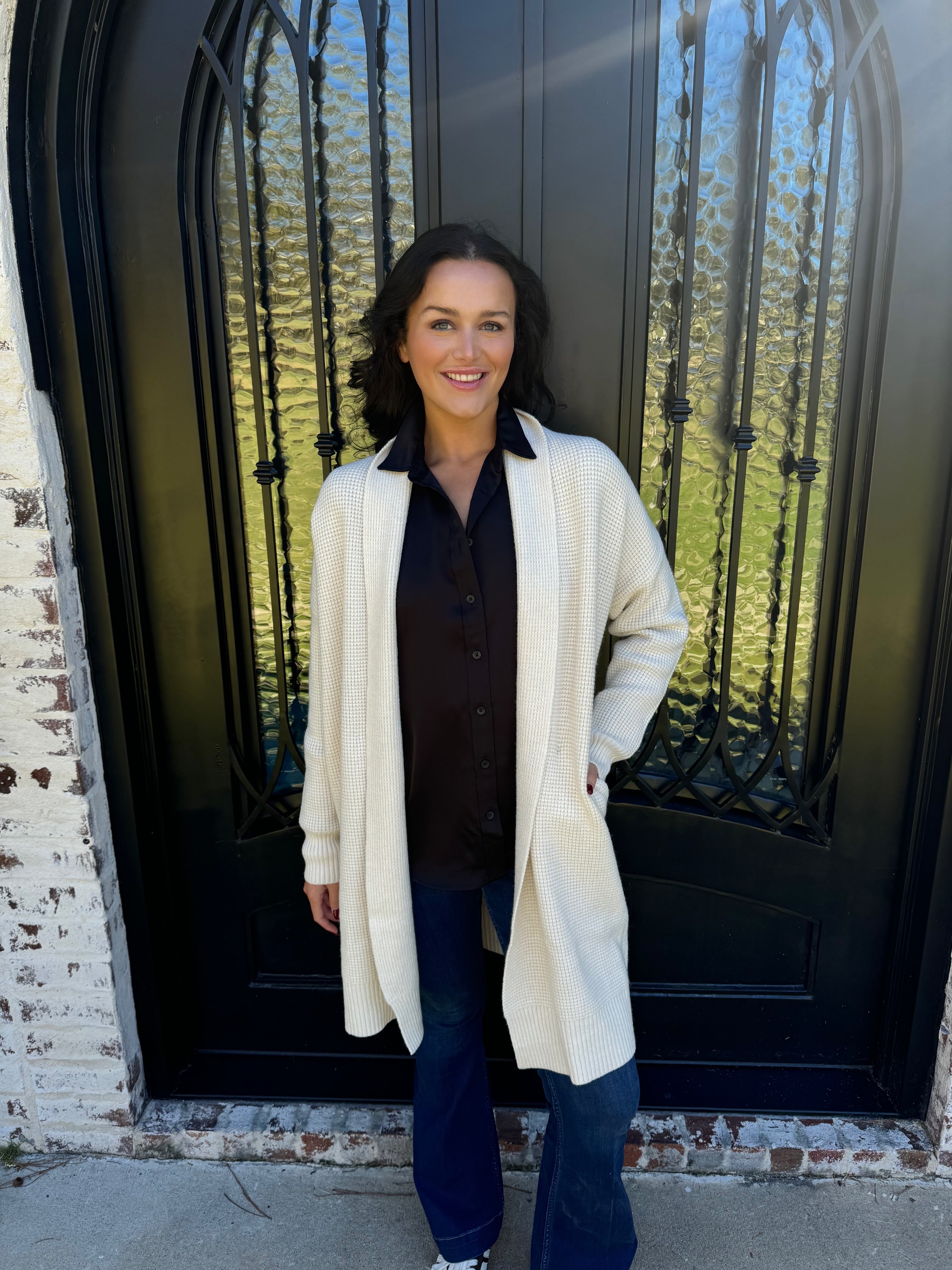 The Swoon Open Cardigan in Cream is your go-to piece for effortless style and comfort. Its mid-length design and handy pockets make it perfect for cozy days at home, yet elegant enough to dress up for dinners or date nights. Pair it with our Spanx flare jeans and Better Than Silk top for a polished, flattering look that transitions seamlessly from casual to chic. Stay warm, stylish, and confident with this versatile cardigan.