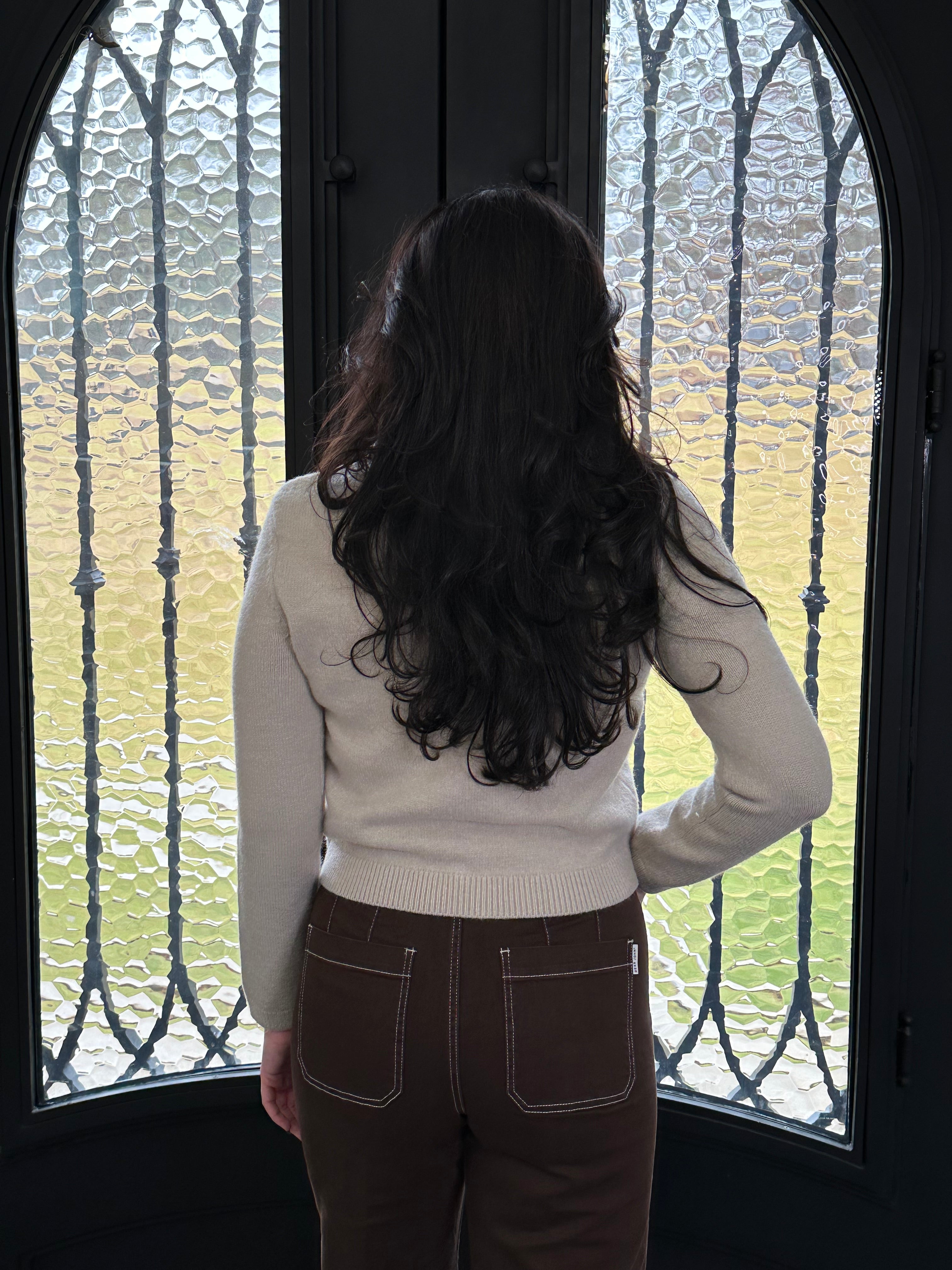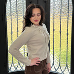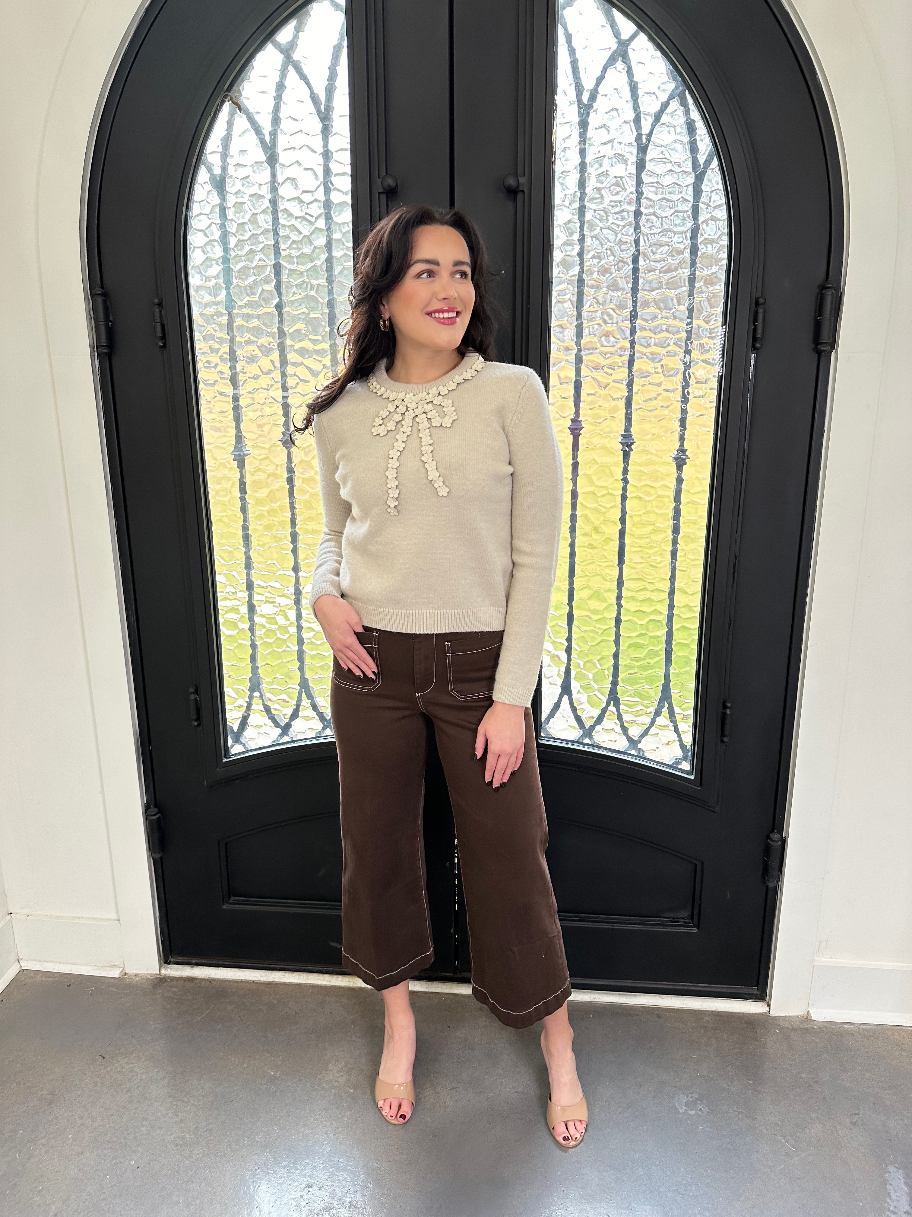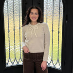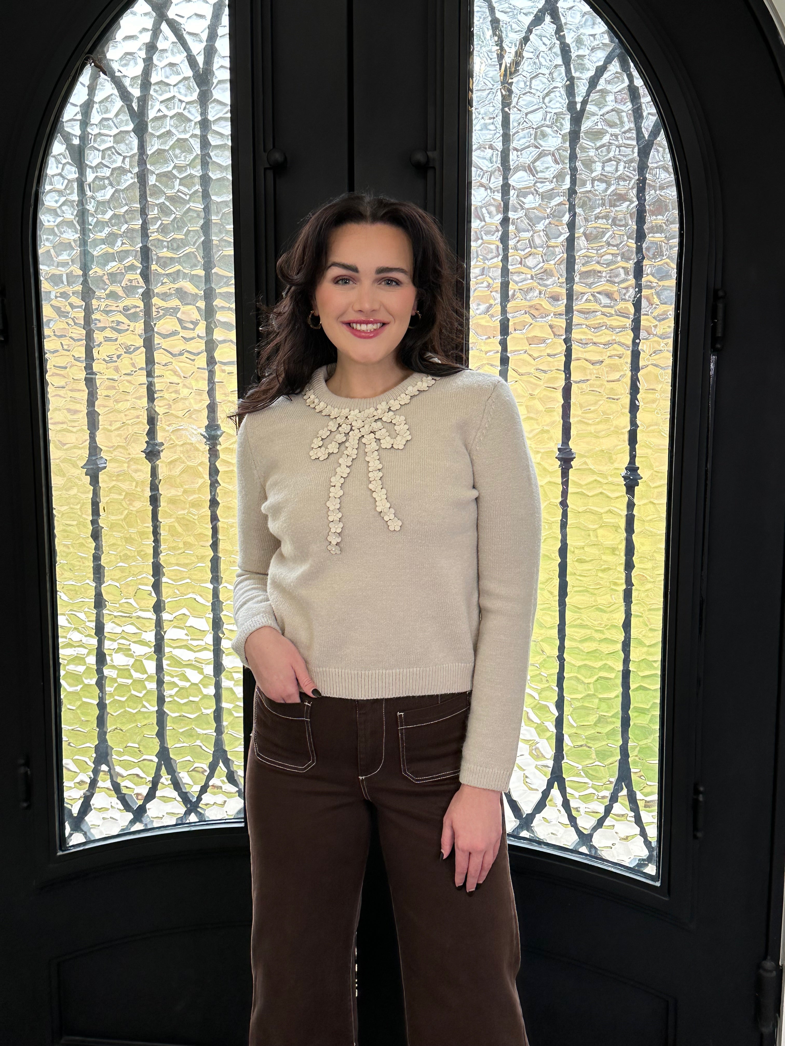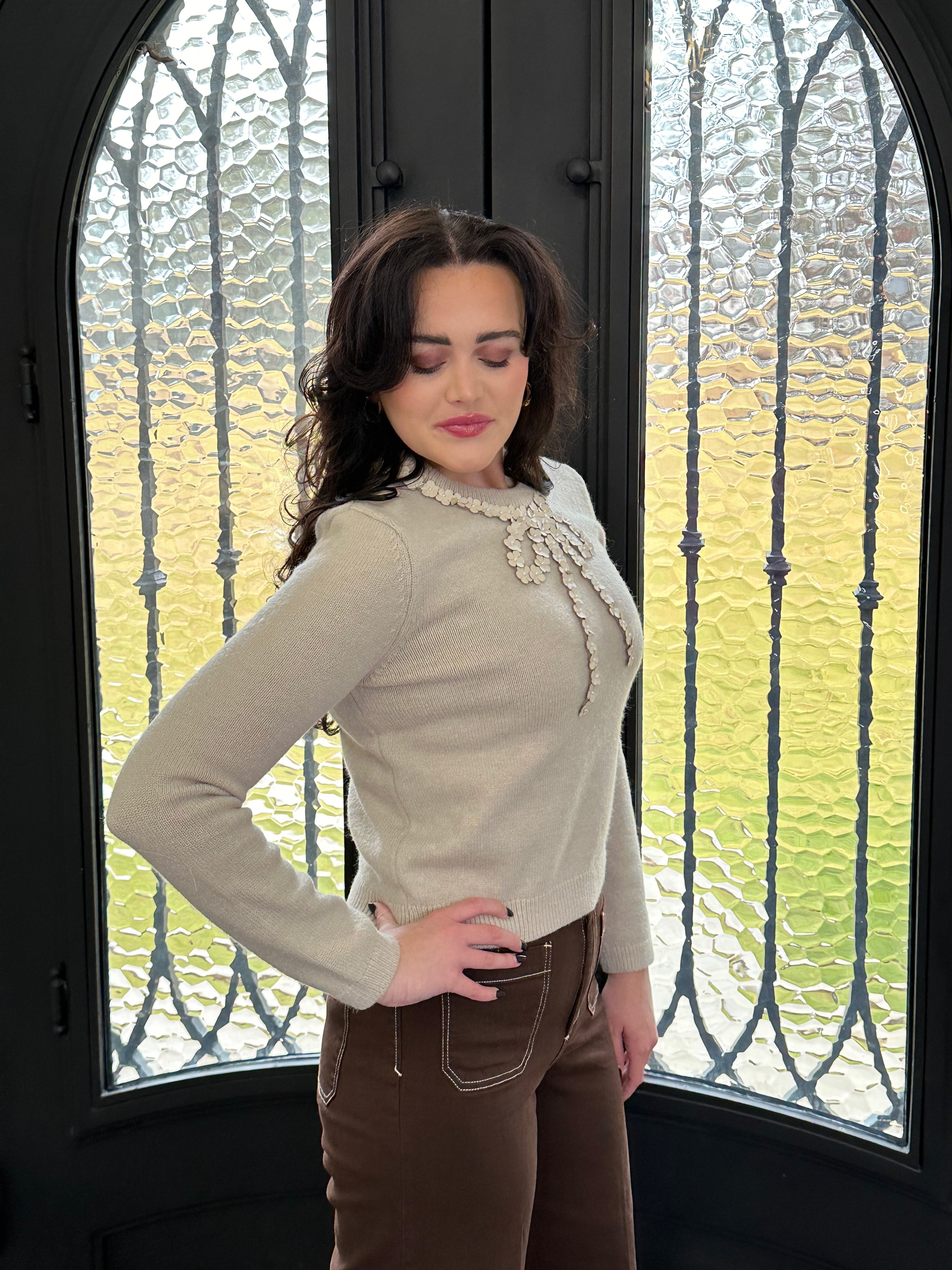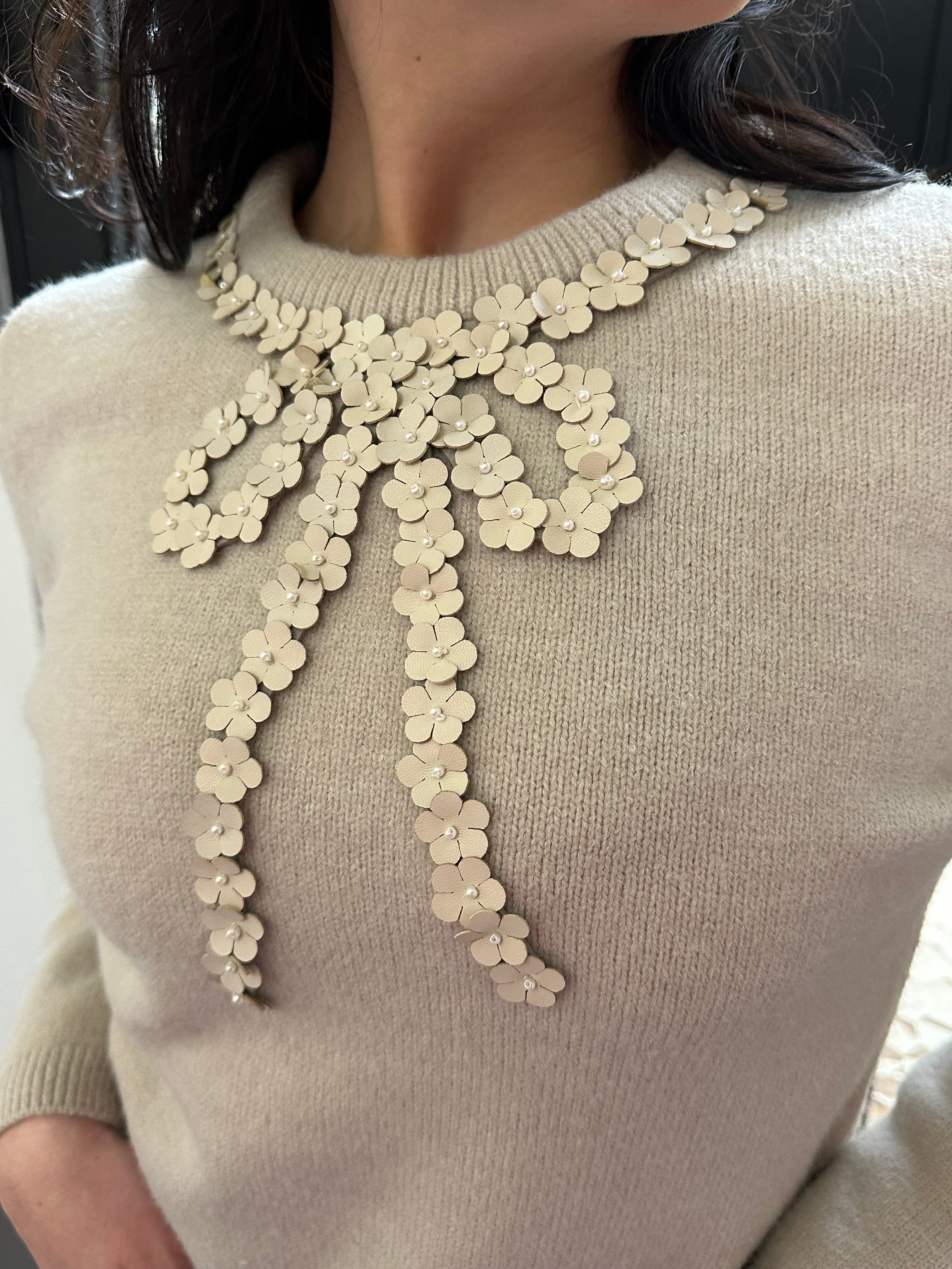 Leather and Pearls Floral Bow Sweater in Oatmeal