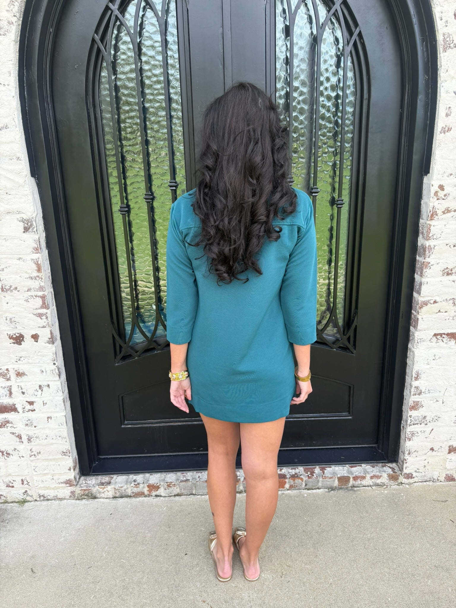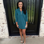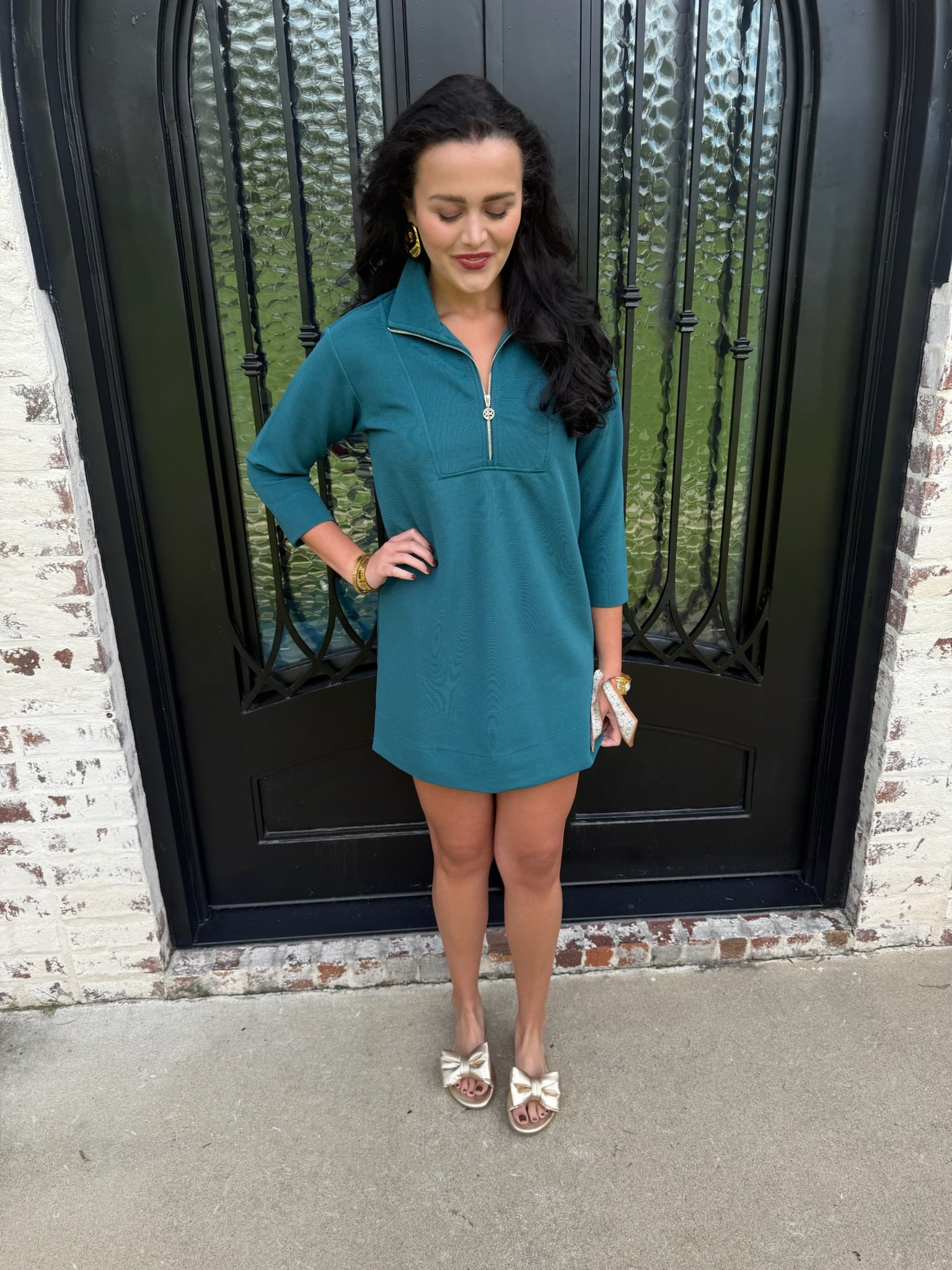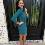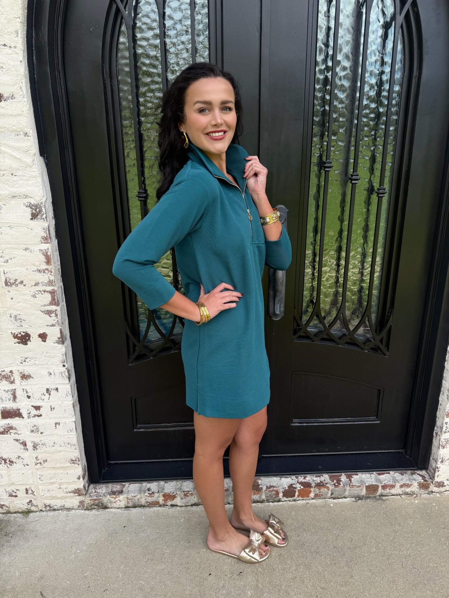 The Mary Square Raven Dress in Gulf Blue combines sleek design with comfort. Featuring a quarter zip and long sleeves, this dress offers a polished look with easy wearability. Its rich gulf blue color is sure to turn heads, making it a standout choice for any occasion where you want to feel confident and chic.
