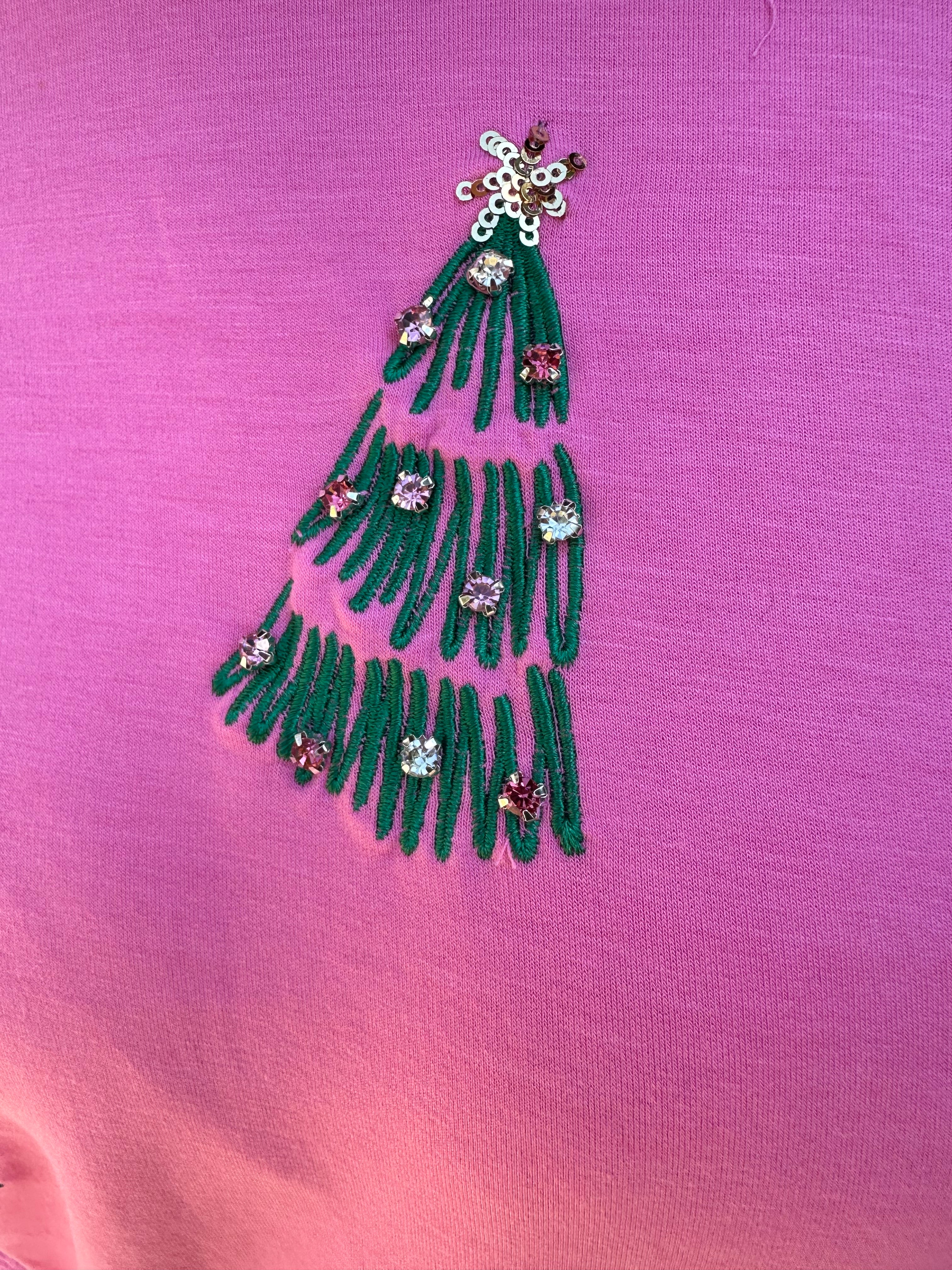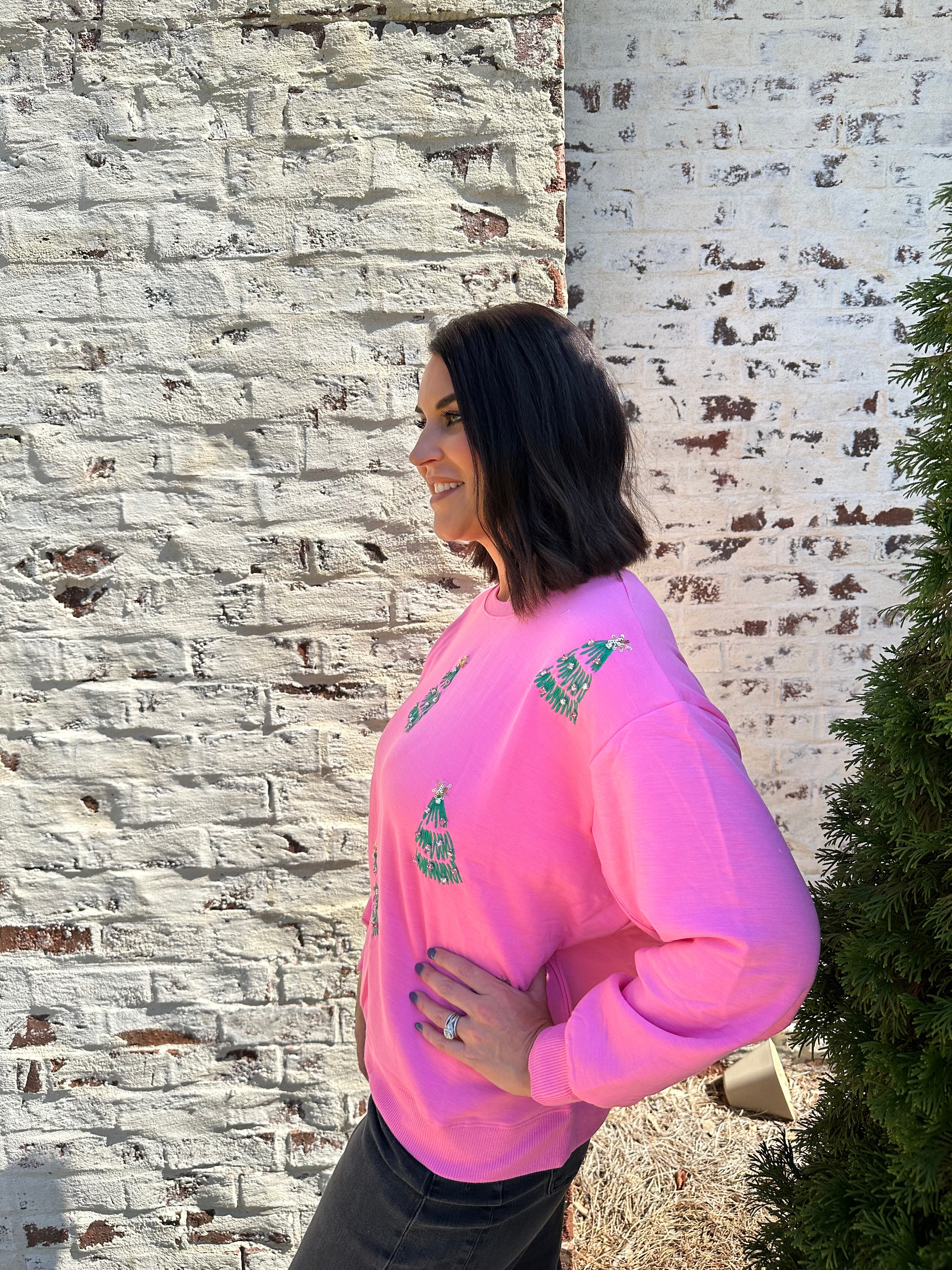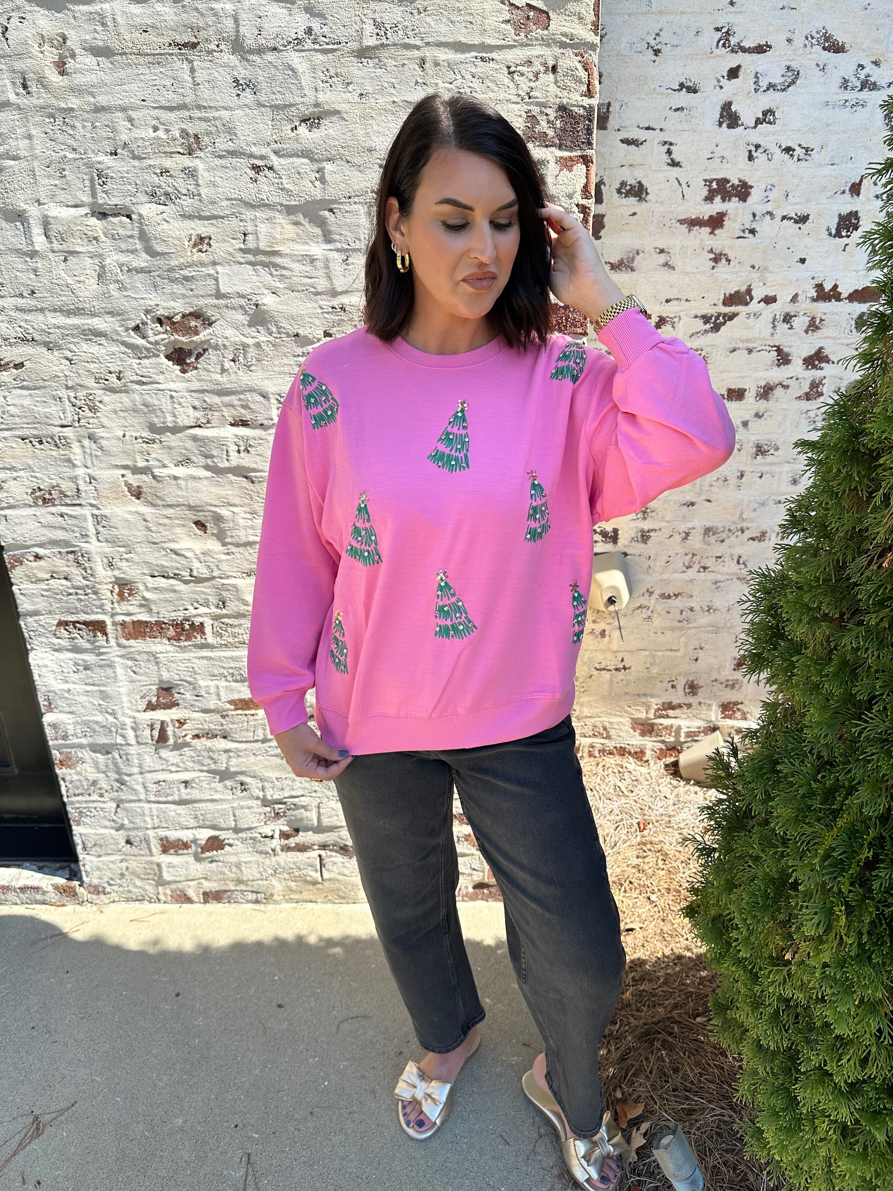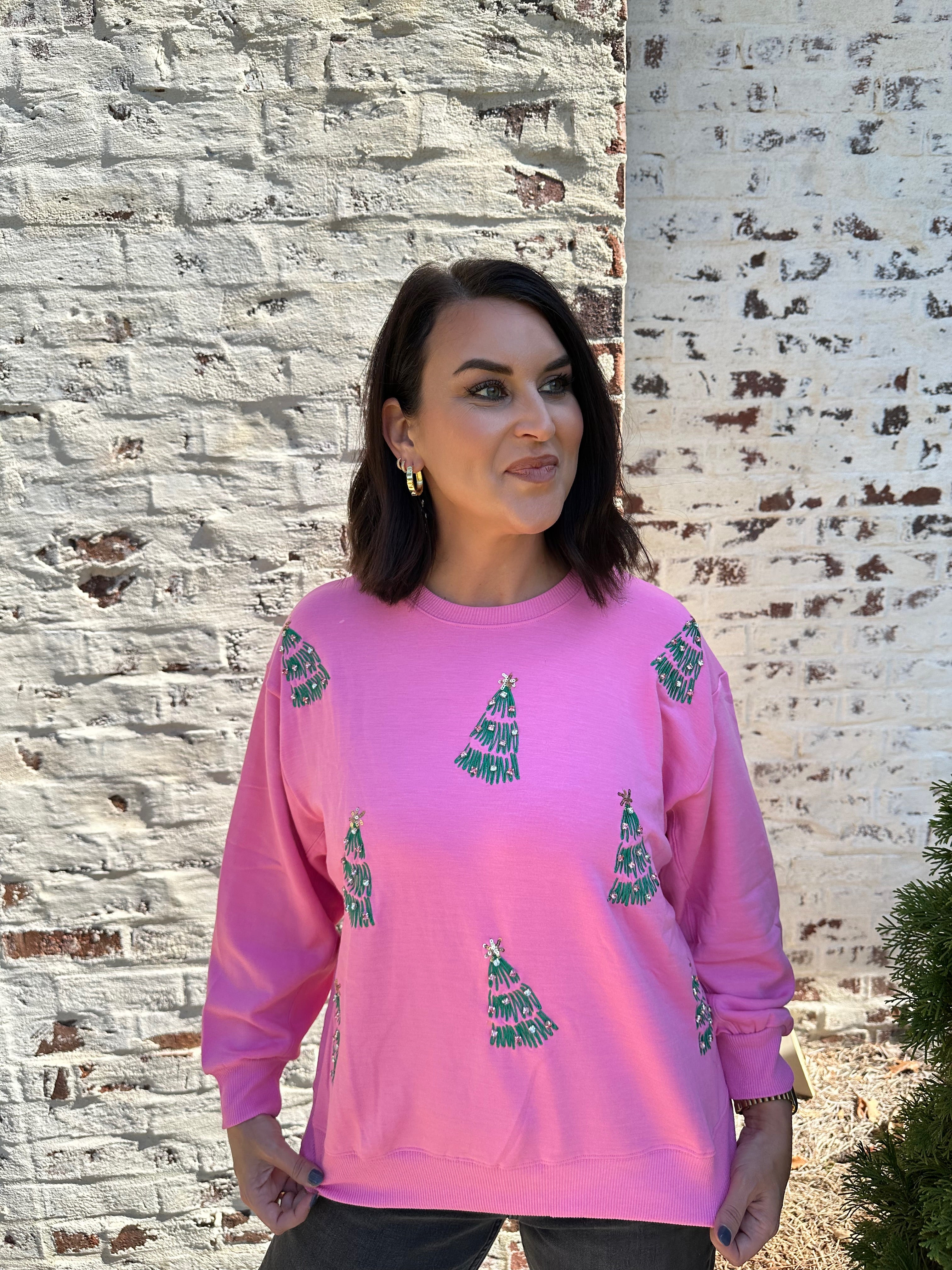 Celebrate the holiday season in cozy style with the Mary Square Sarah Trees Sweatshirt in Pink. Featuring festive Christmas tree designs, this sweatshirt adds a cheerful touch to your winter wardrobe. Its soft fabric keeps you warm and comfortable, making it perfect for holiday gatherings or casual days when it’s beginning to look a lot like Christmas. Embrace the spirit of the season with a vibrant, charming sweatshirt that’s as joyful as your celebrations.
