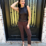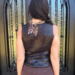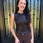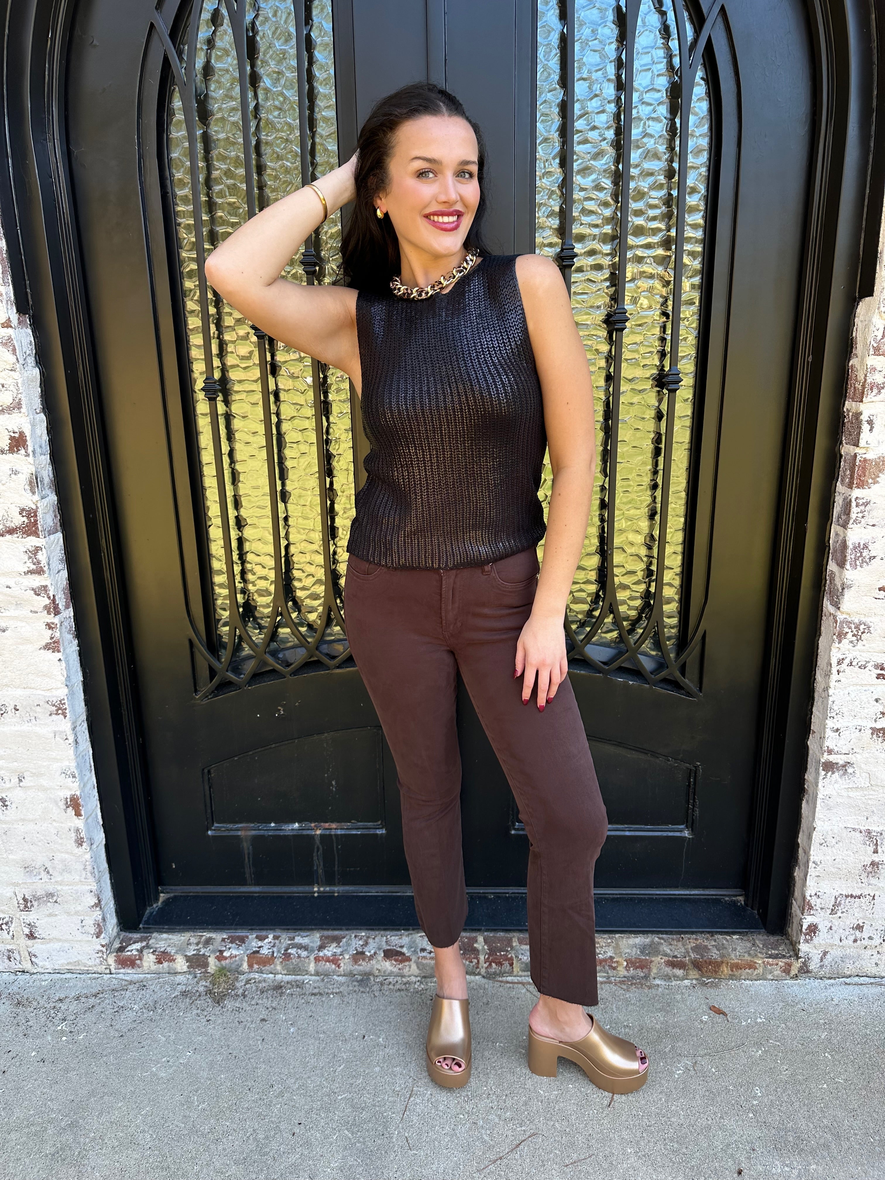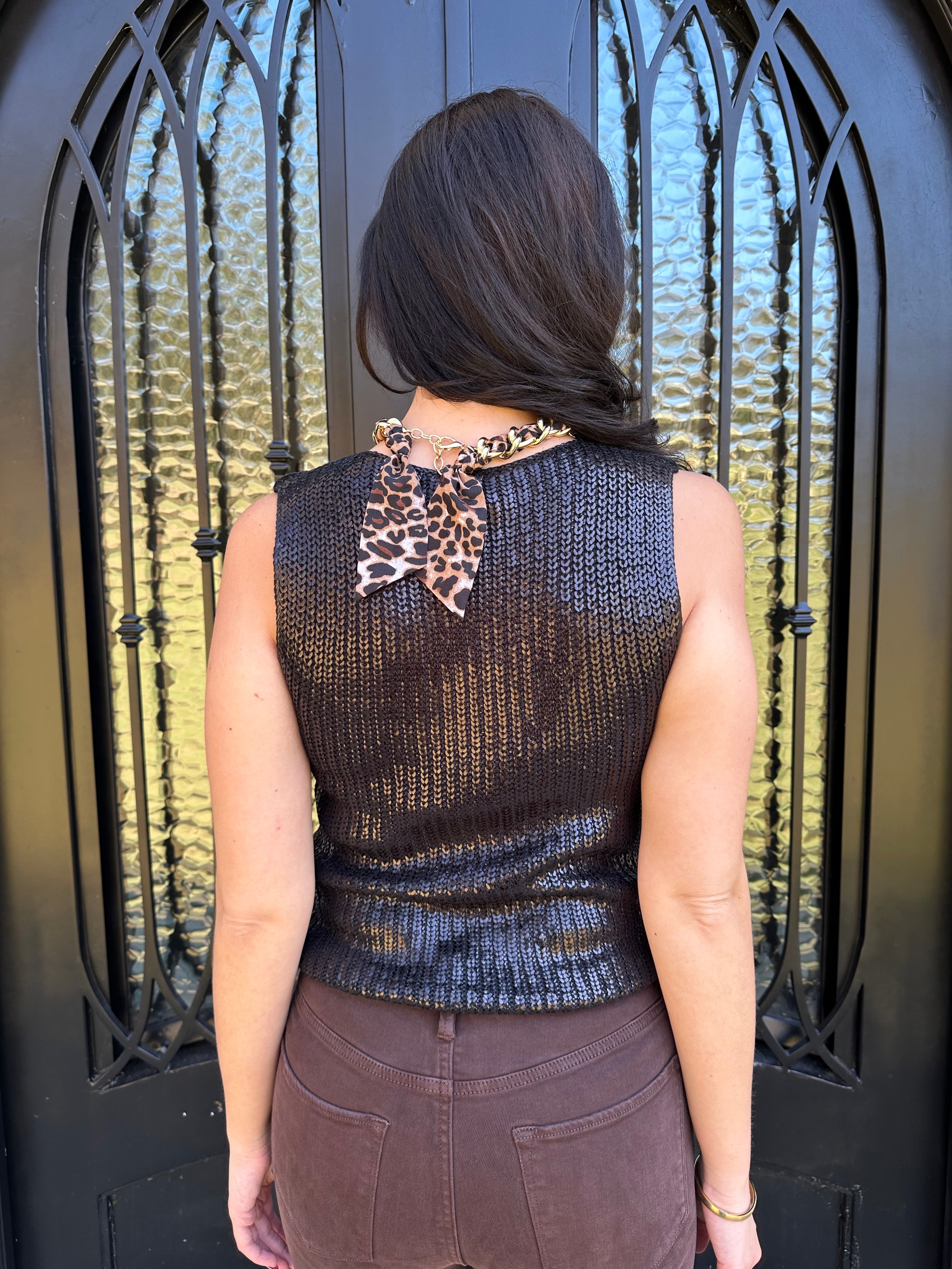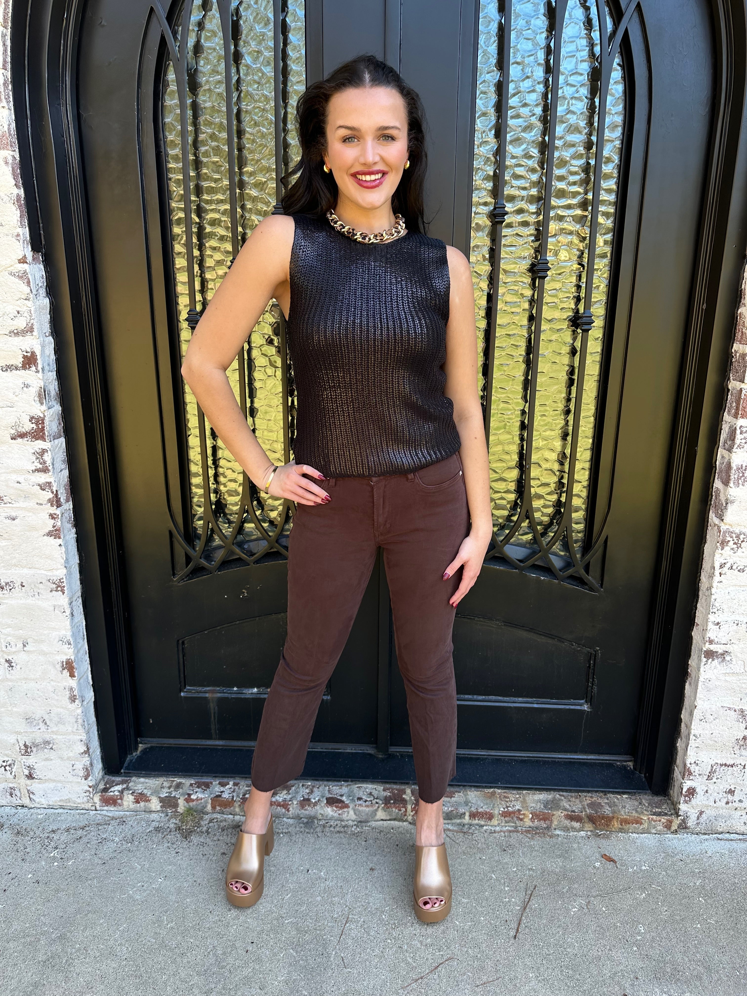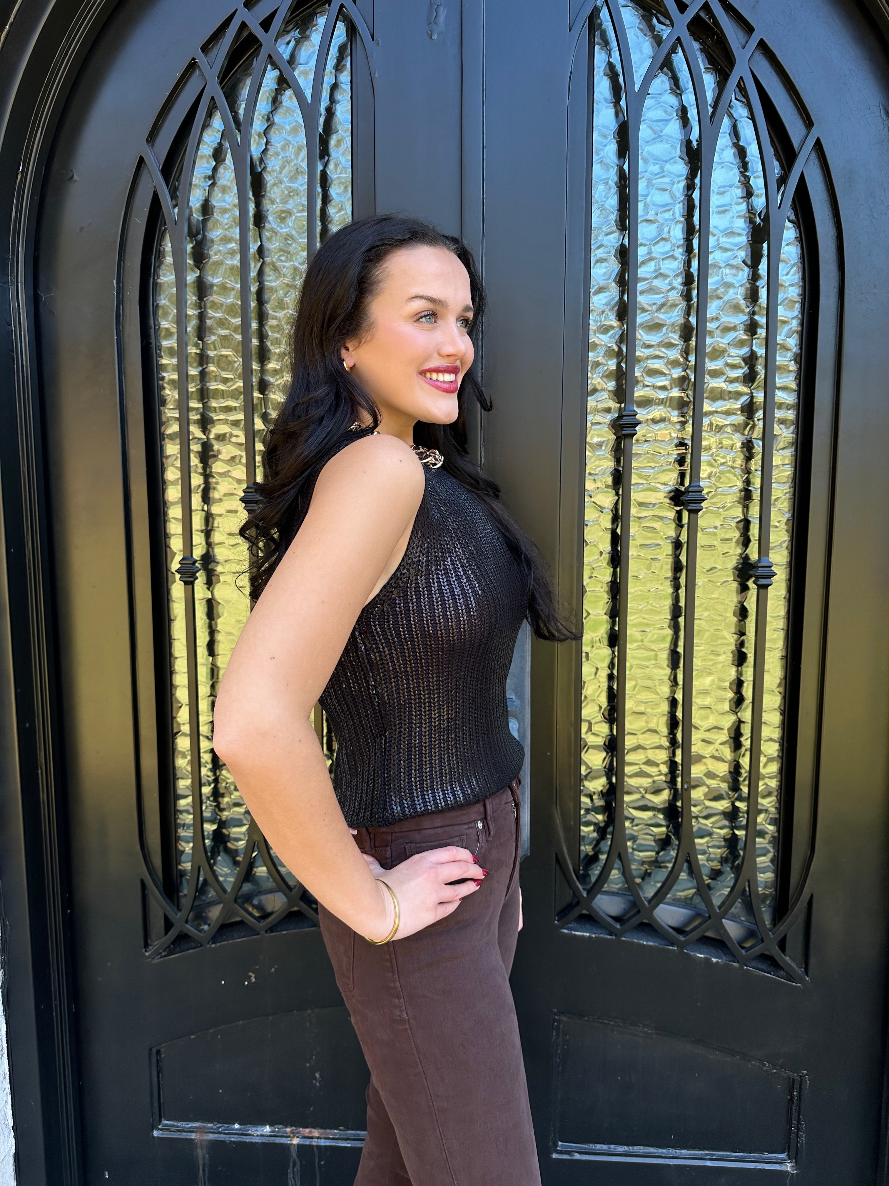 Shine at every celebration with the Metallic Crewneck Sweater in Black. This sleeveless, shimmering party top adds a bold, stylish edge to your look. Pair it with our best-selling Jeanne Jeans in Oak for an effortlessly chic outfit that’s ready to impress from night out to after-party. Elevate your wardrobe with this standout piece.