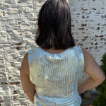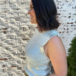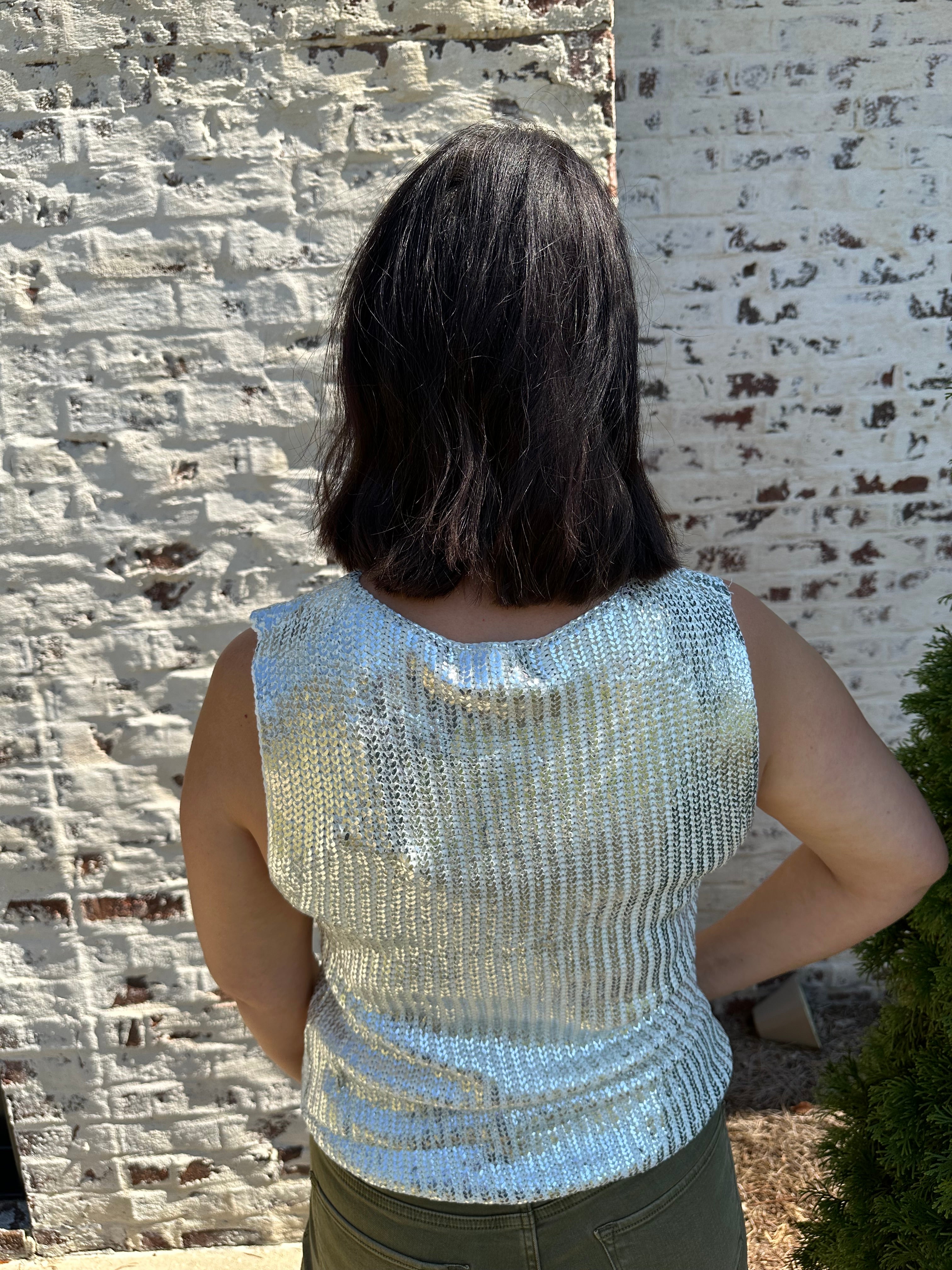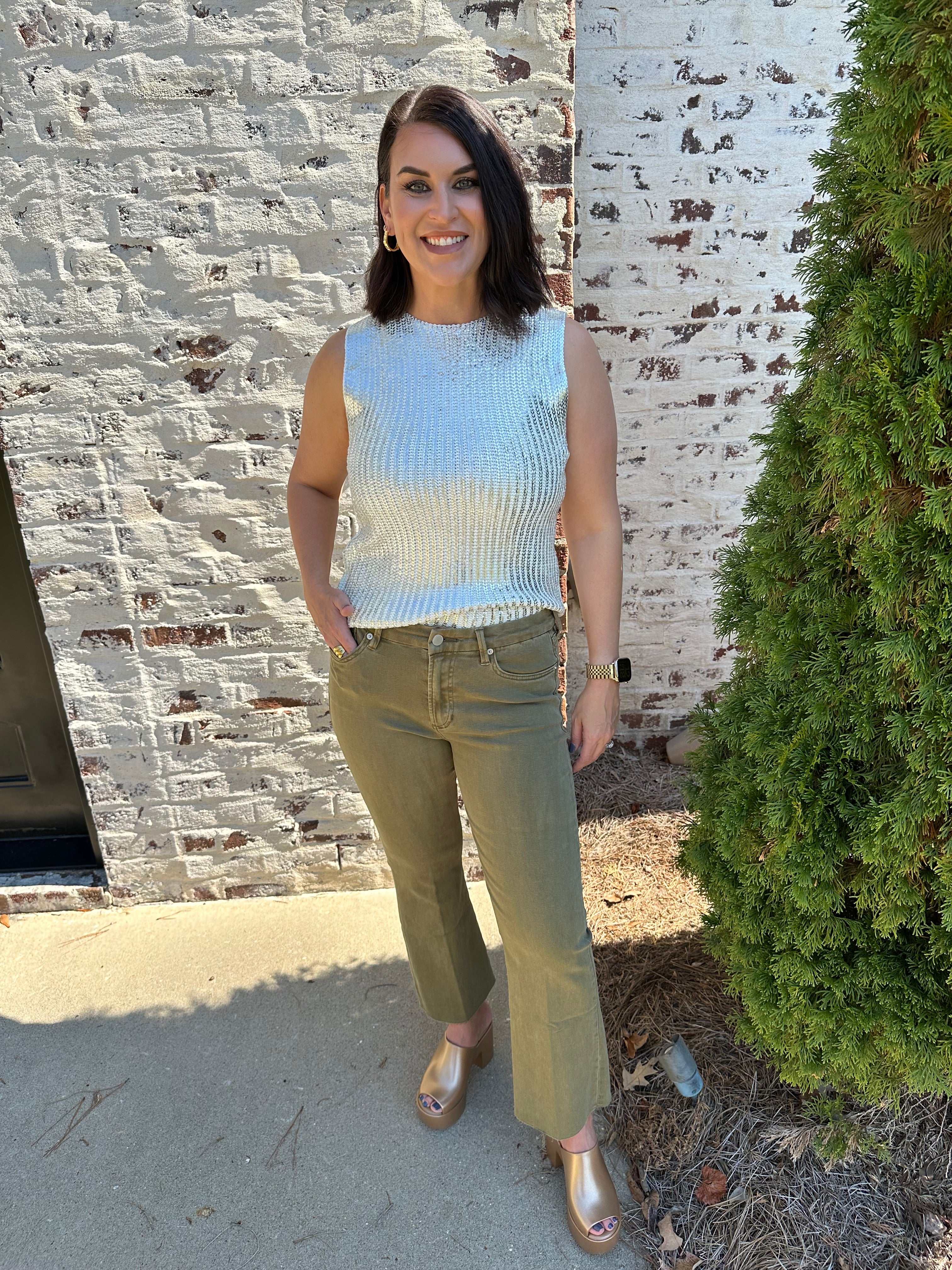 Shine at every celebration with the Metallic Crewneck Sweater in White. This sleeveless, shimmering party top adds a bold, stylish edge to your look. Pair it with our best-selling Jeanne Jeans in Olive for an effortlessly chic outfit that’s ready to impress from night out to after-party. Elevate your wardrobe with this standout piece.