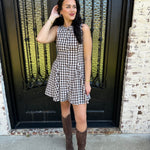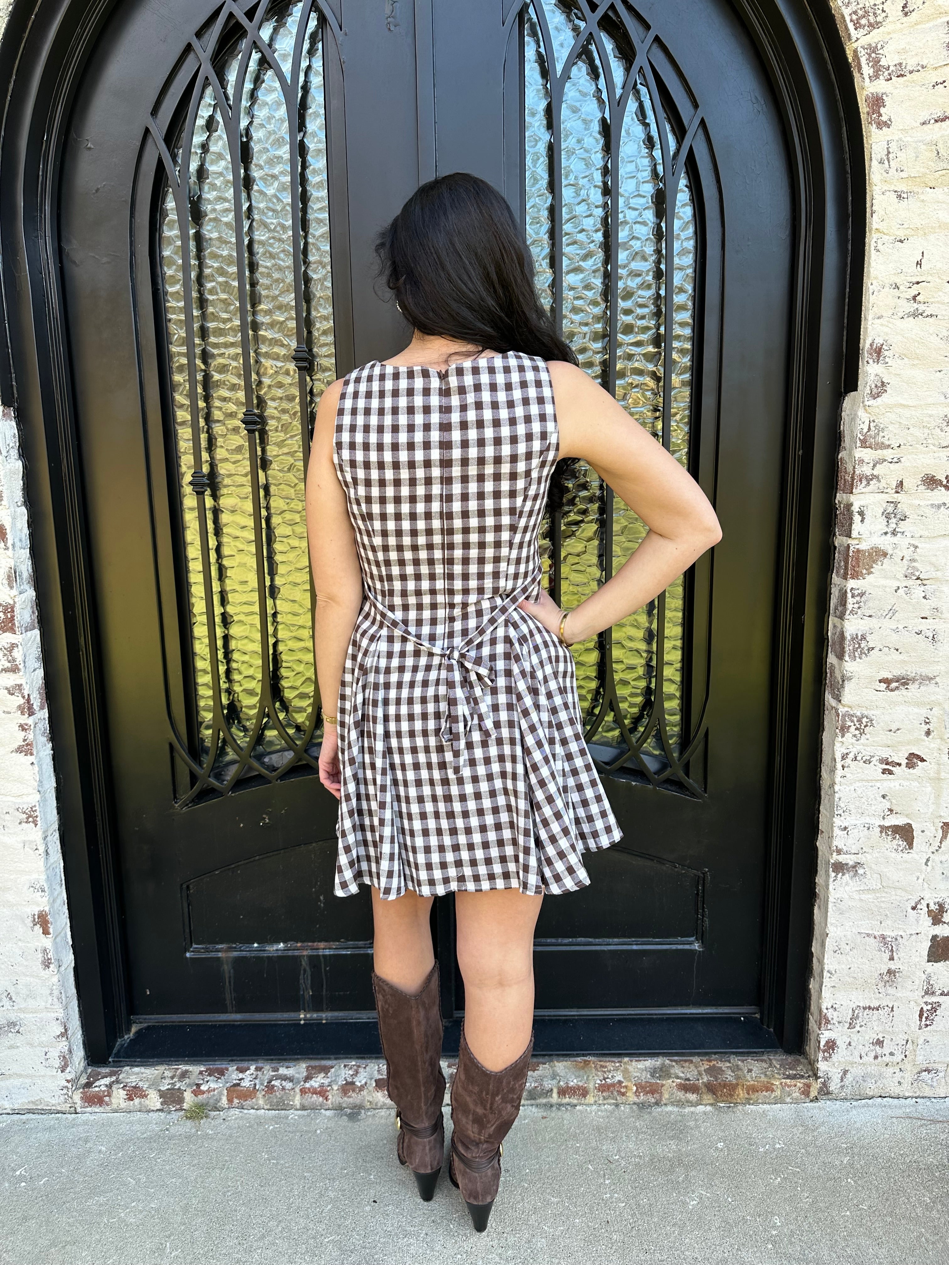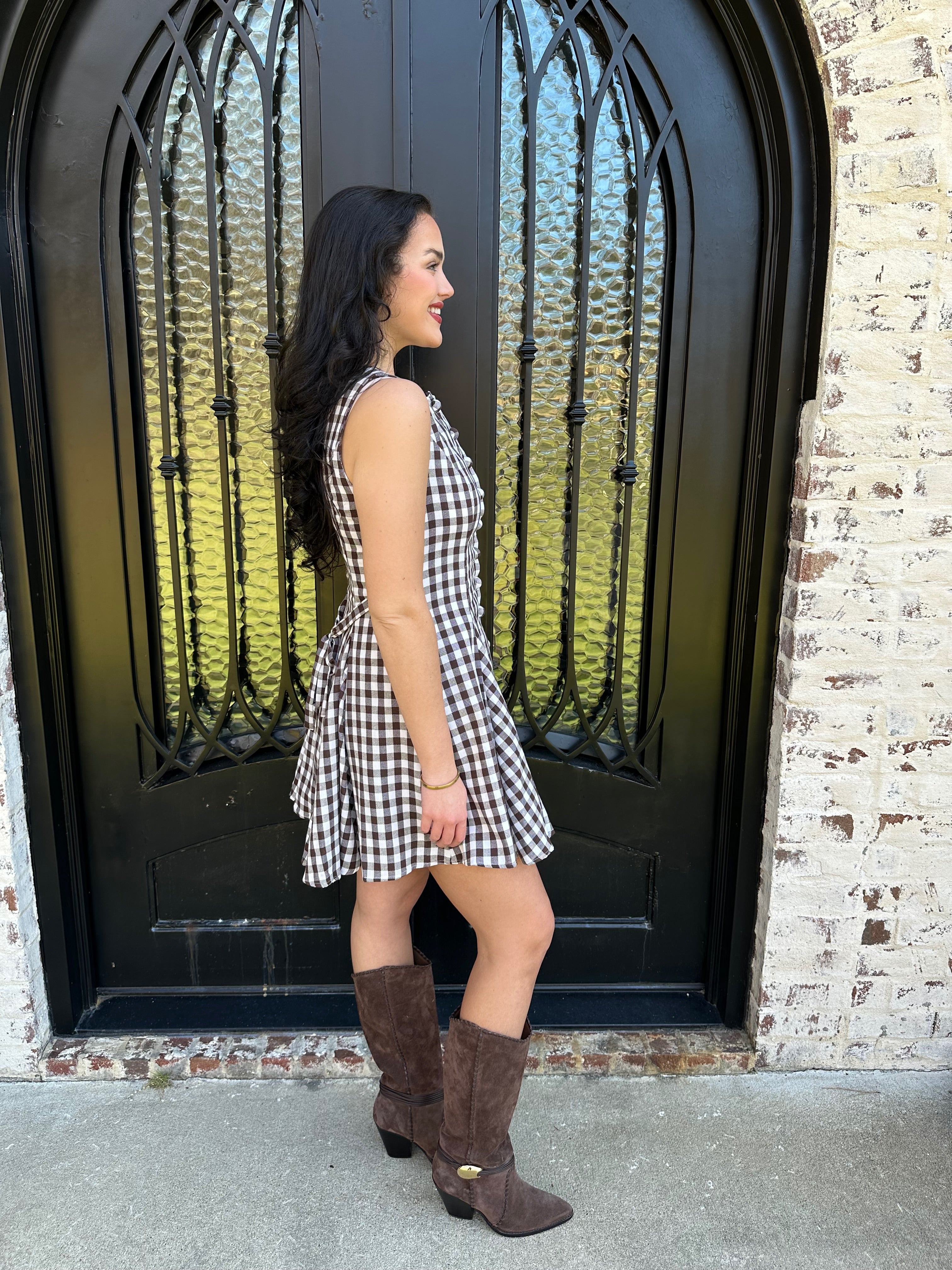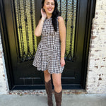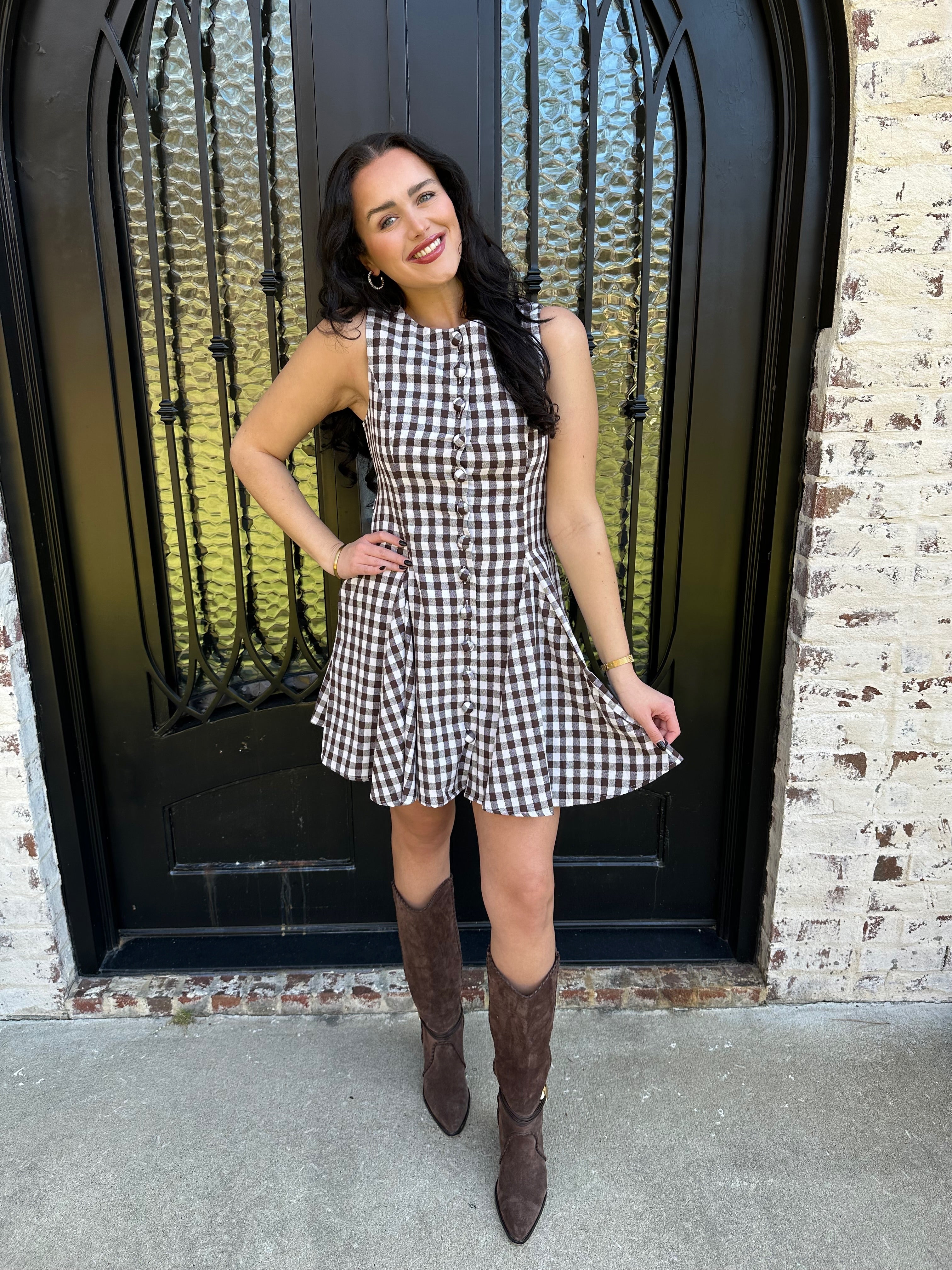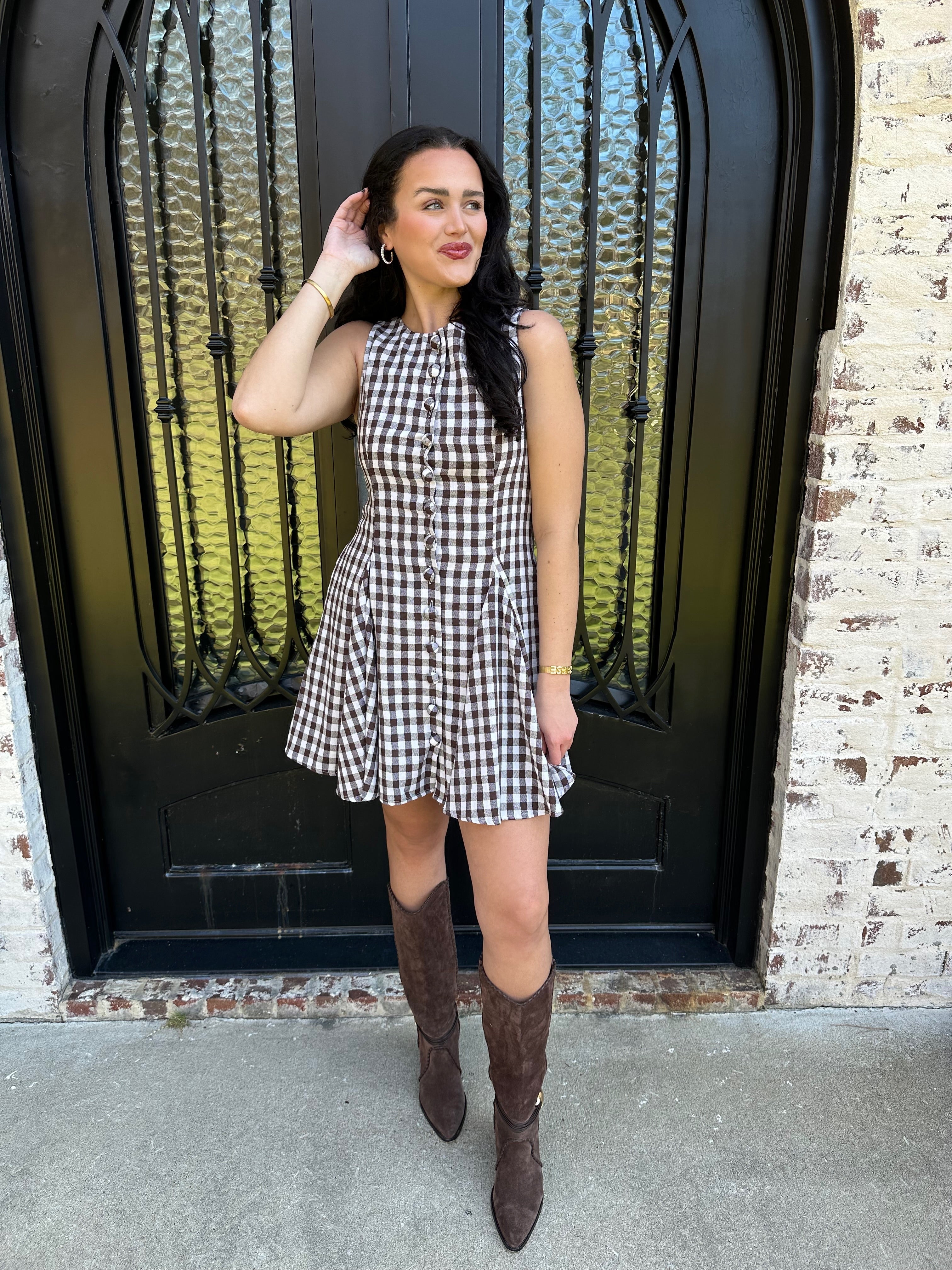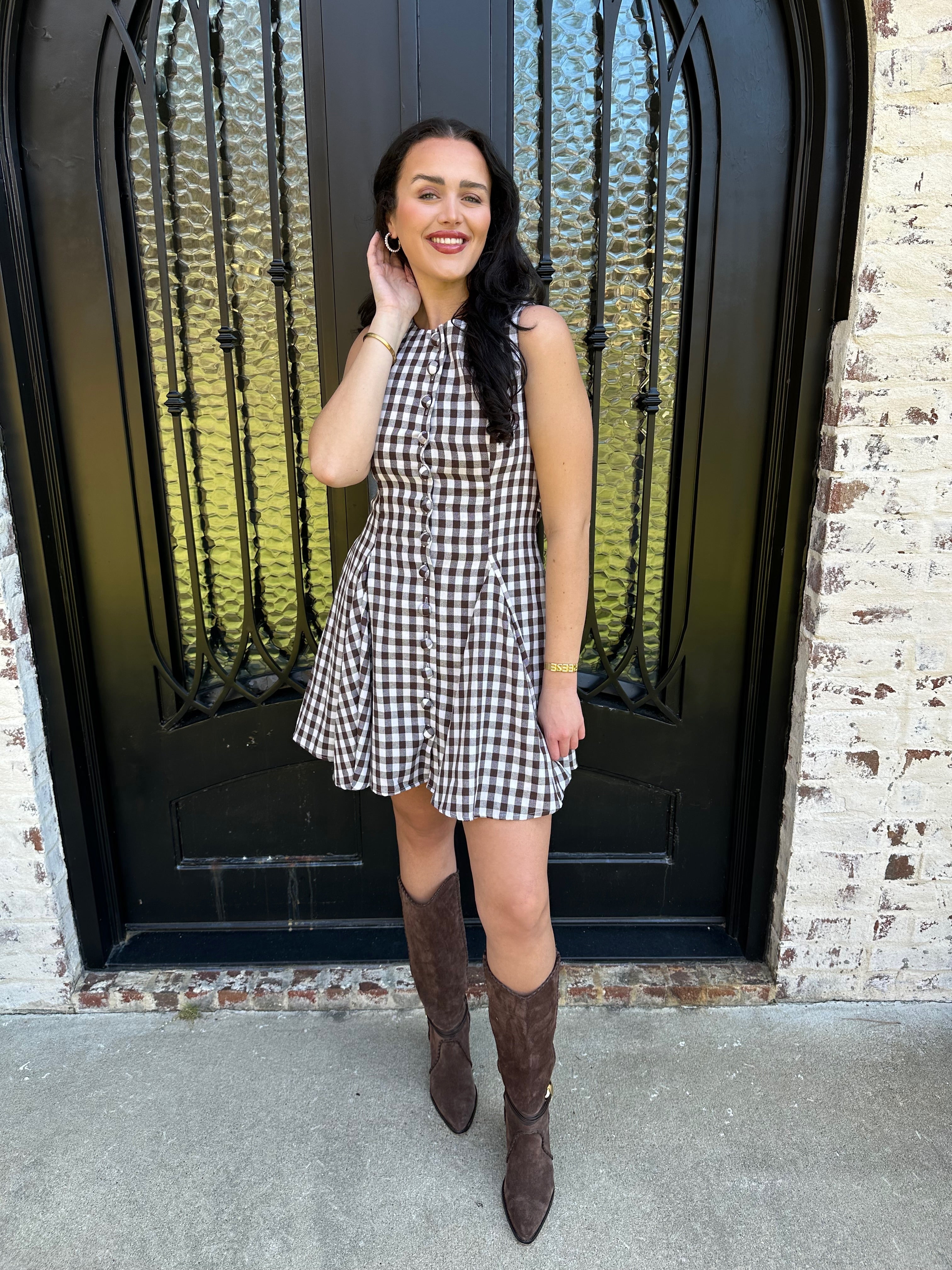 The Pia Gingham Swing Dress in Brown is your go-to gameday essential this season. This charming button-up features a classic gingham pattern with a flattering back tie that cinches your silhouette beautifully. The swing cut offers comfortable movement and a playful, feminine vibe perfect for Thanksgiving gatherings and stadium days. Pair it effortlessly with our Dolce Vita boots for an outfit that turns heads. Versatile, stylish, and undeniably chic—this dress deserves a spot in your wardrobe.