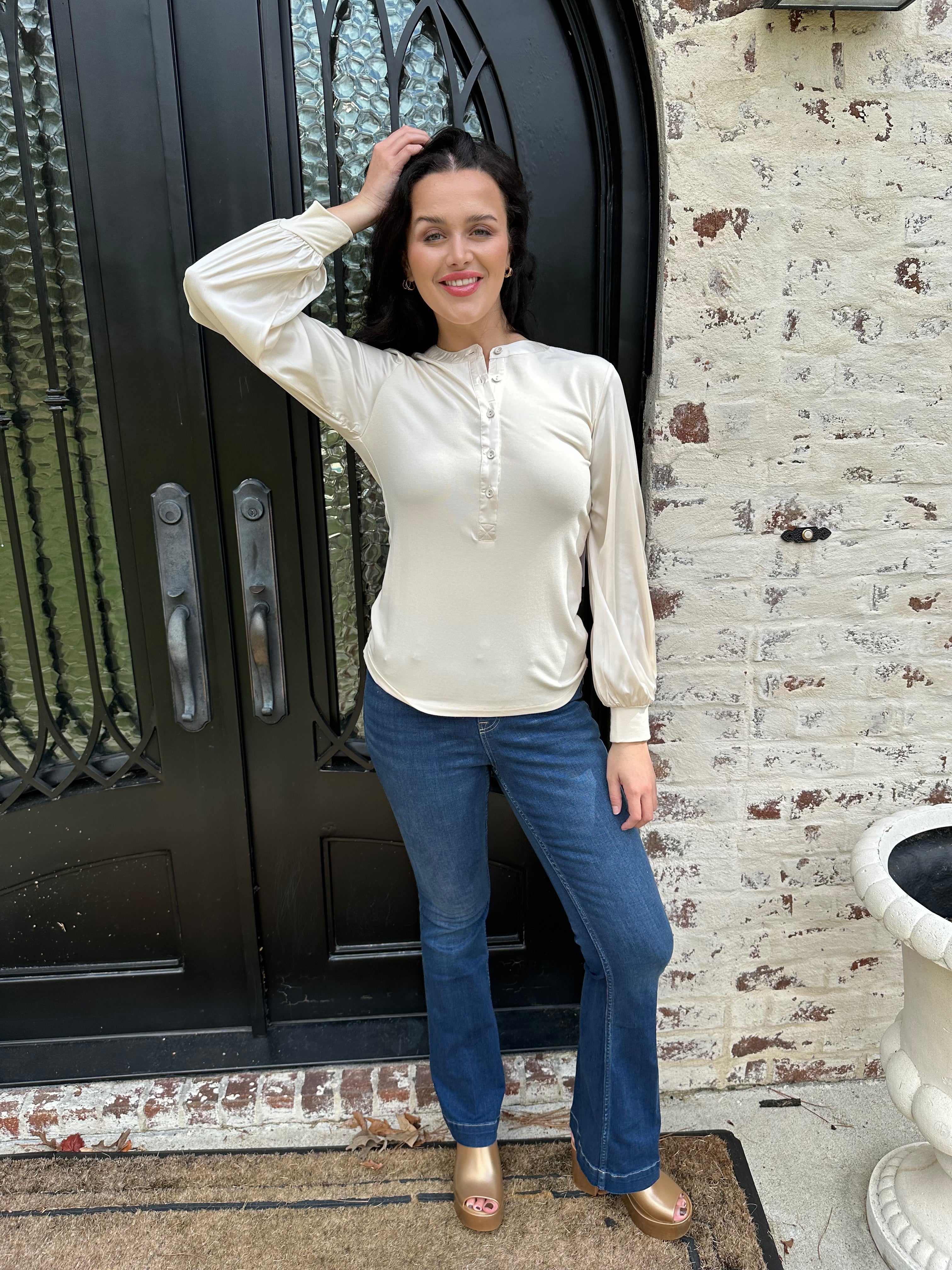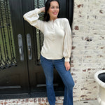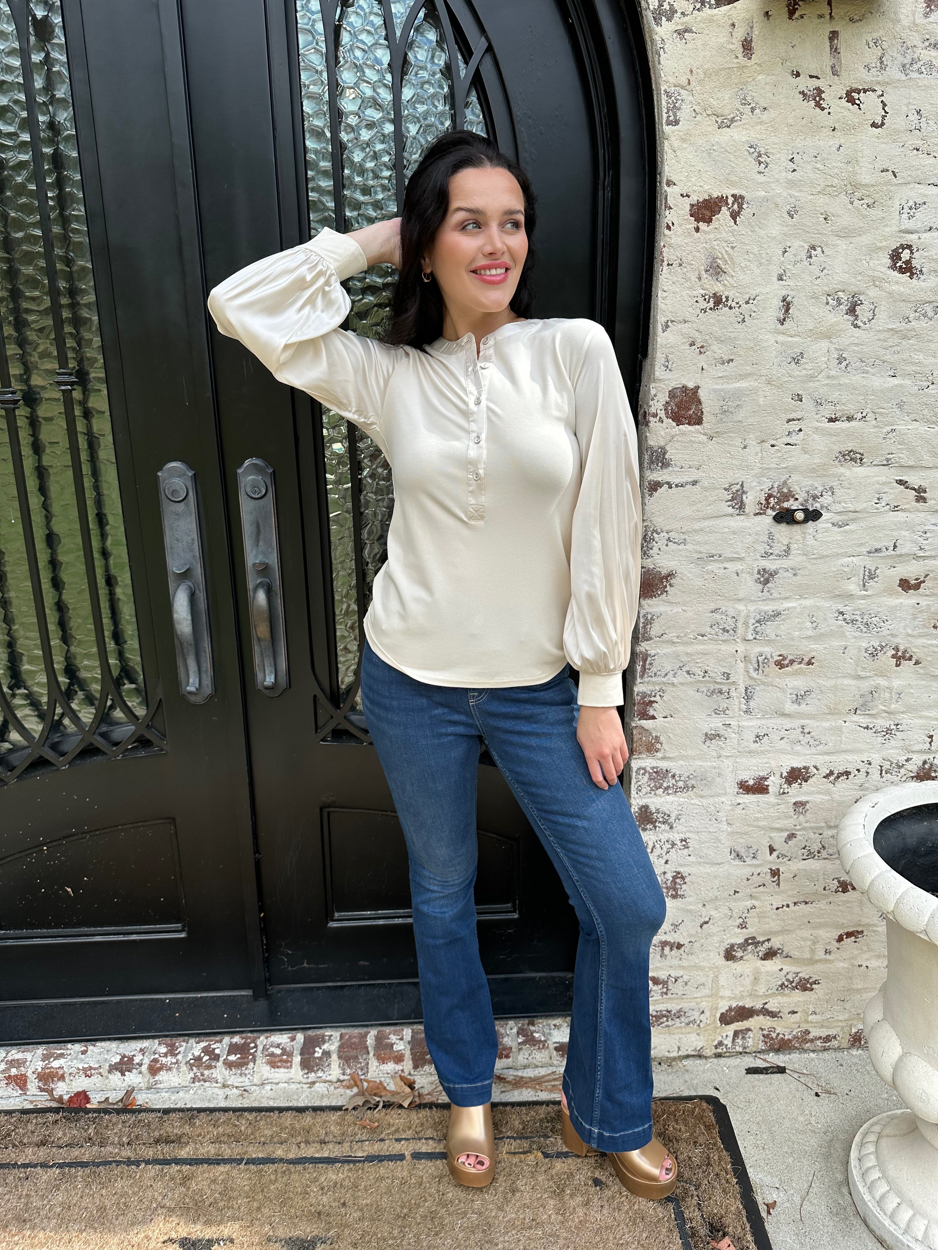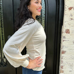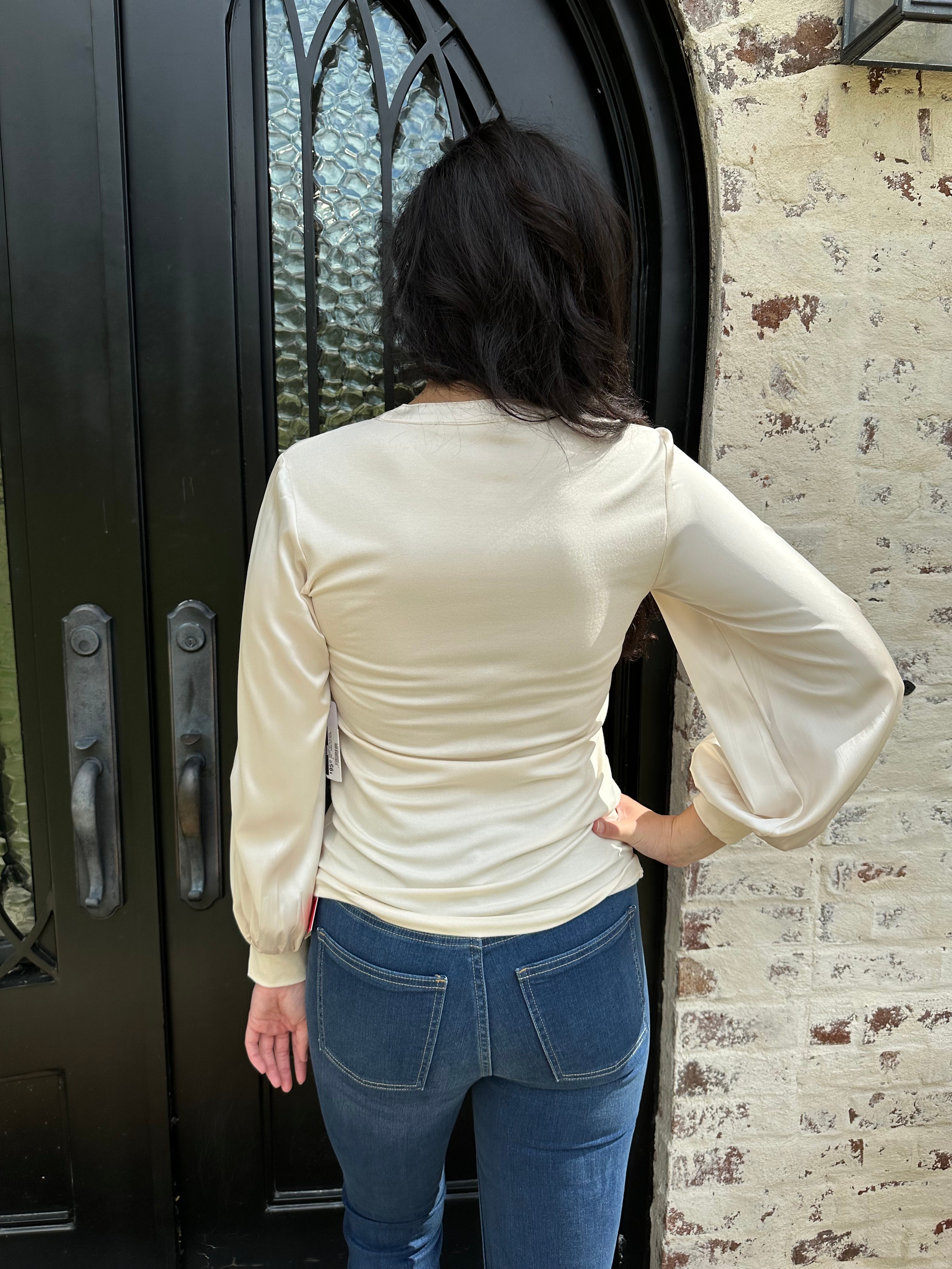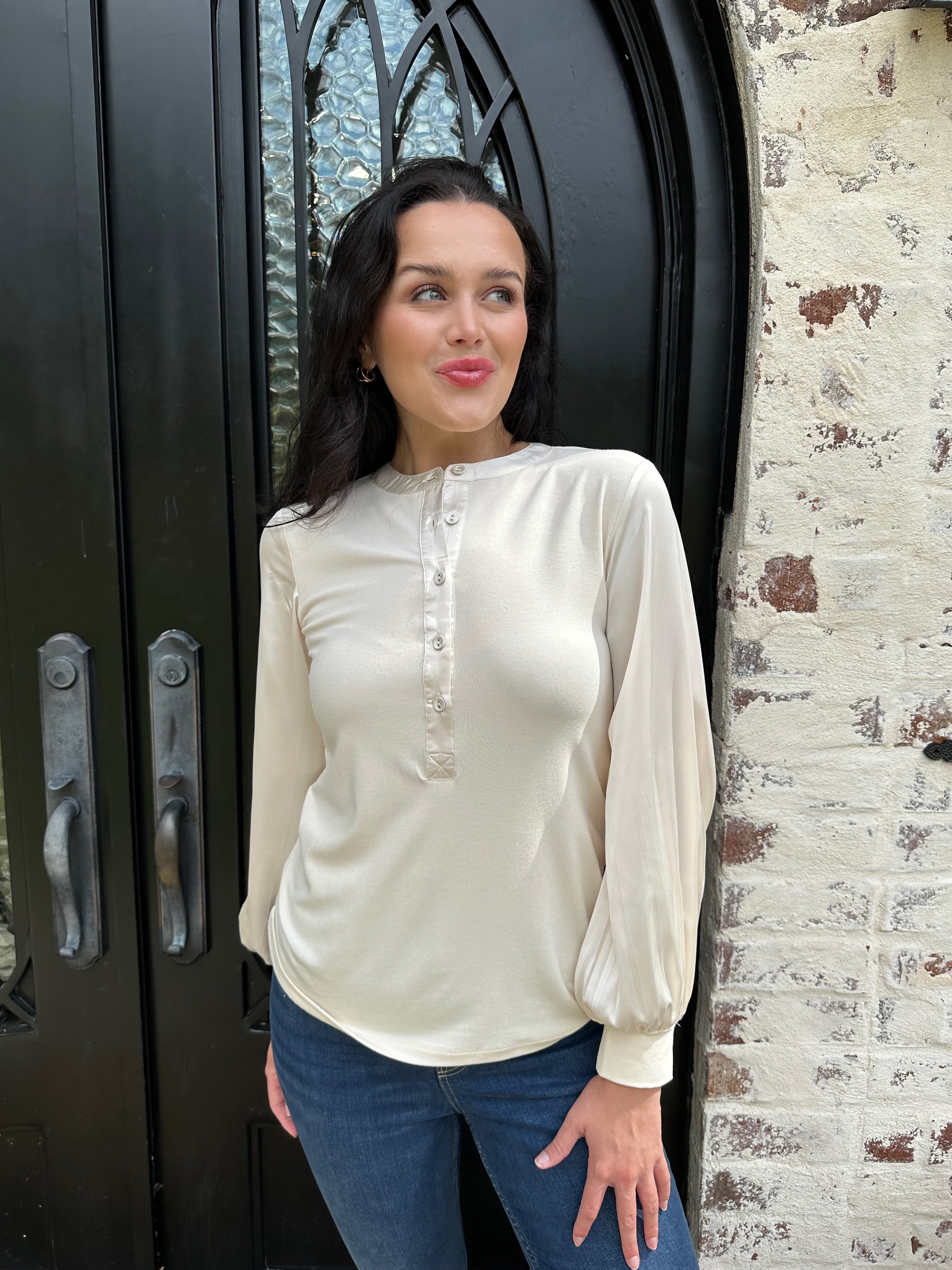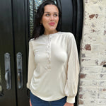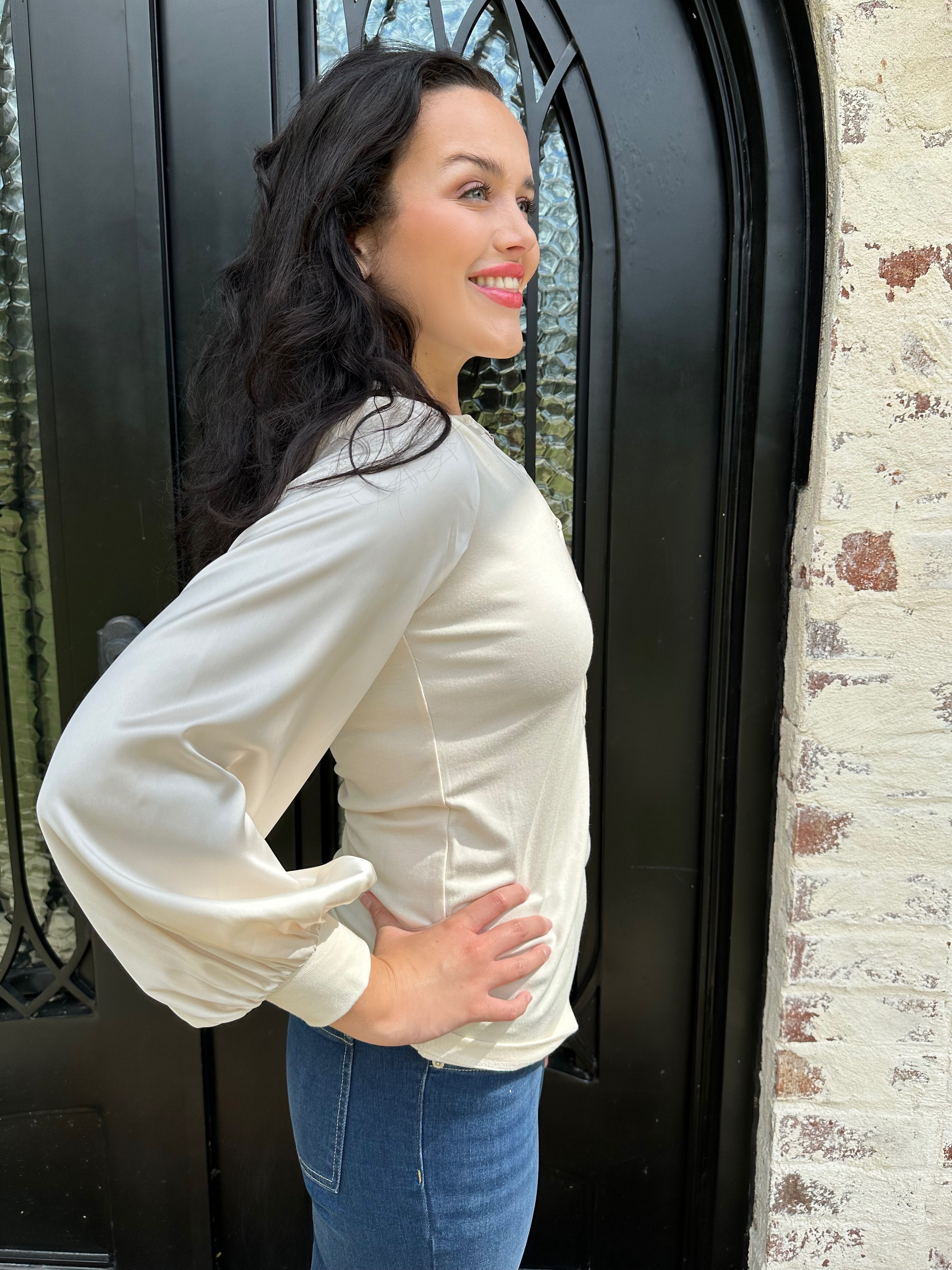 Add a touch of sophistication to your wardrobe with our Ribbed Satin Sleeve Janie Top. Featuring a ribbed body and a collarless neckline, this top offers a sleek and stylish look. The satin sleeves add a luxurious touch to the overall design.