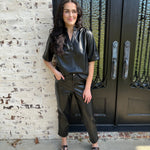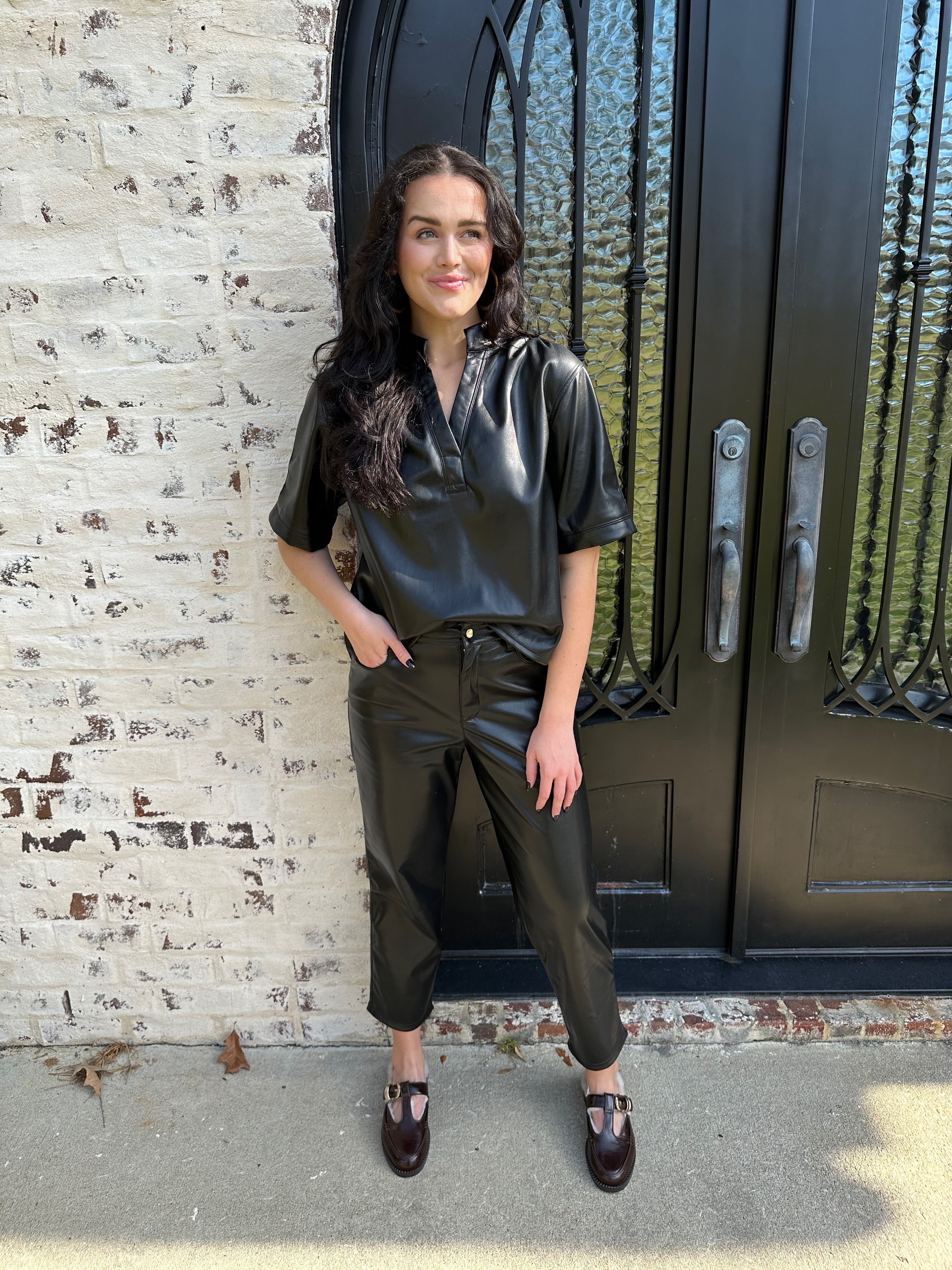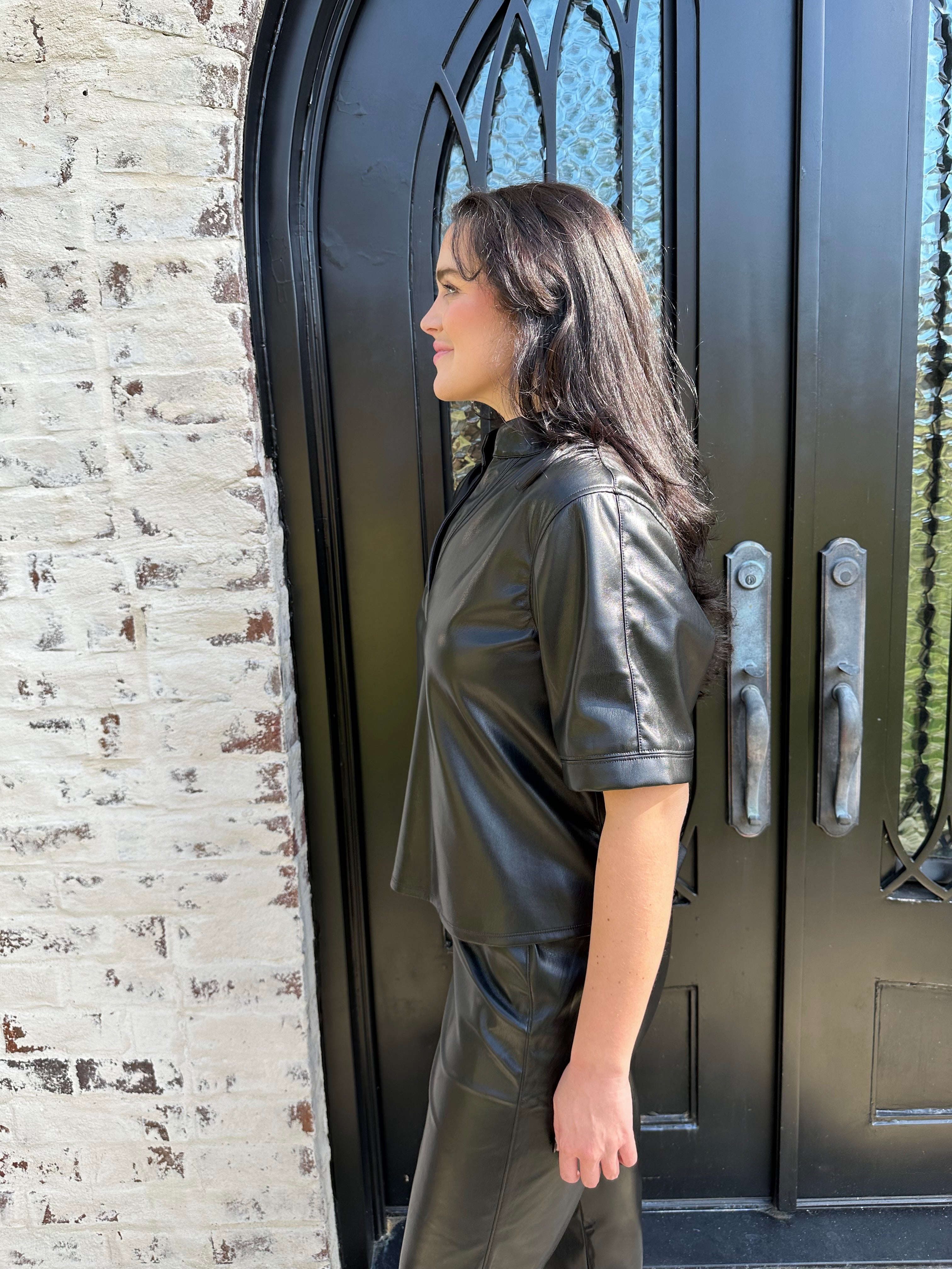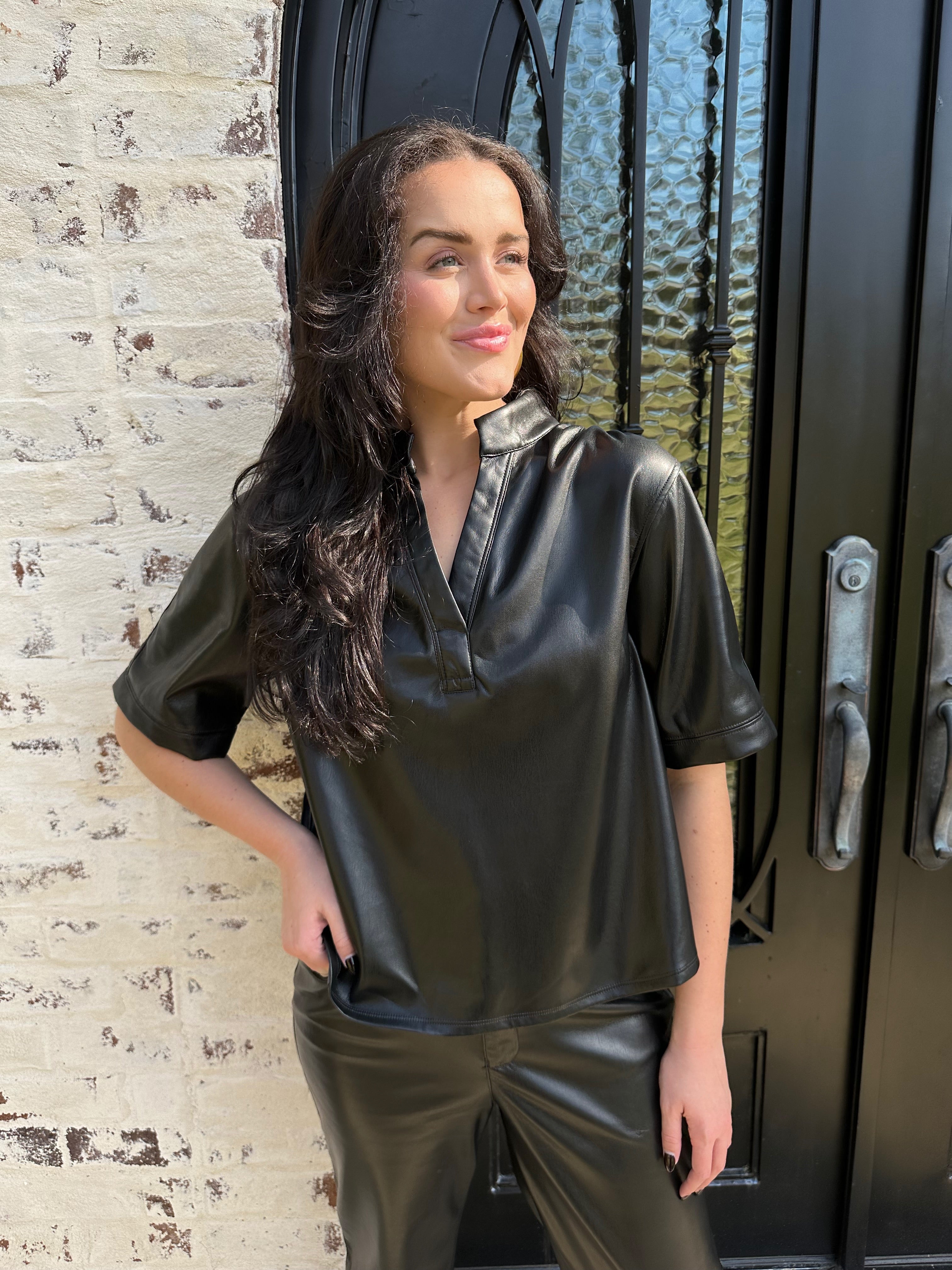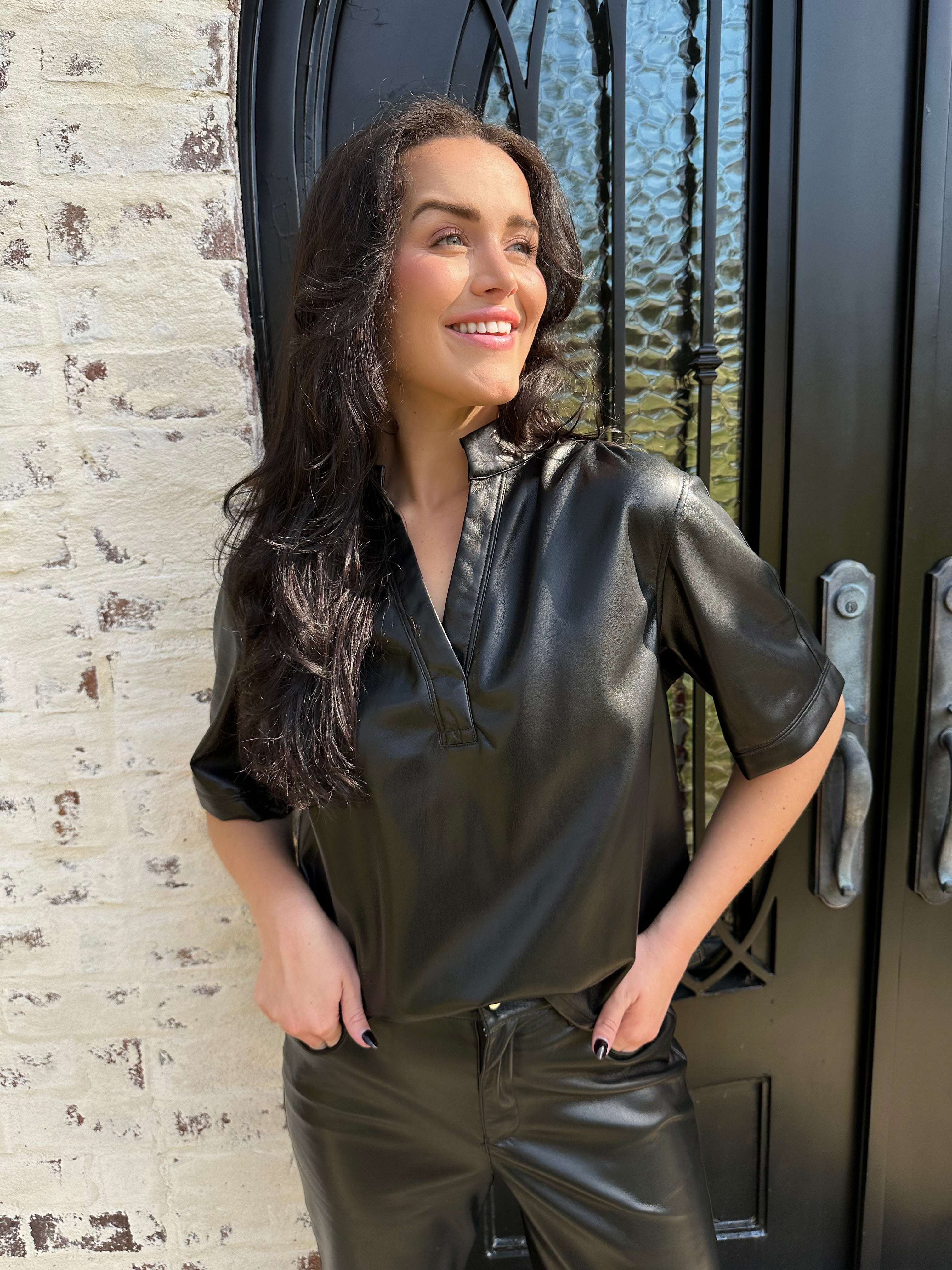 The Rosamund Blouse in Black is your answer to effortless elegance. Crafted from premium vegan leather, this short sleeve top brings a touch of luxury to every occasion—from holiday celebrations to intimate dinners and romantic nights out. Its refined black finish pairs beautifully with our Sabrina pants, creating a cohesive, head-turning ensemble. Perfect for those who demand both style and substance, this blouse proves that looking exceptional doesn't require compromise. Make it your go-to piece for moments that matter.
