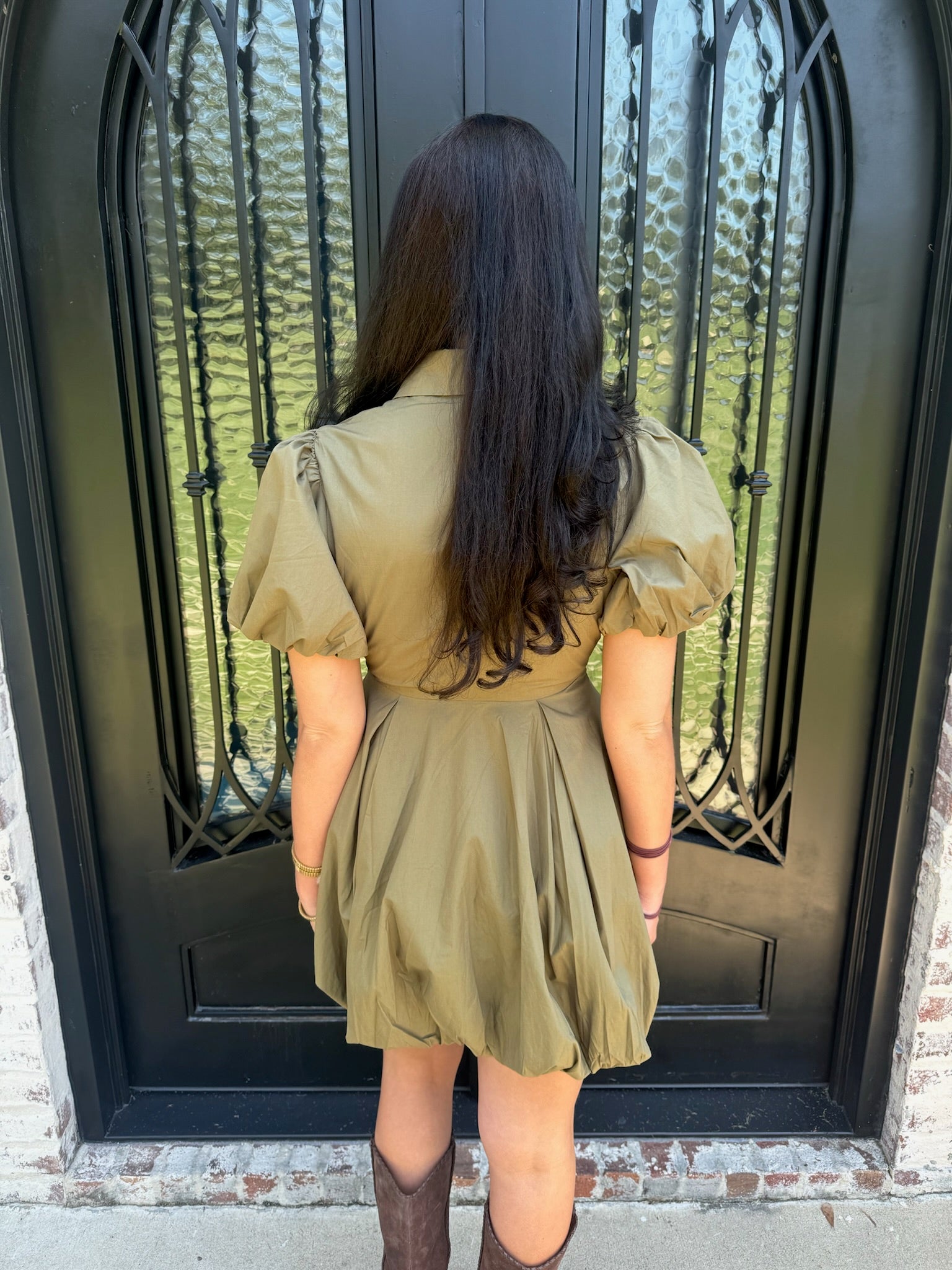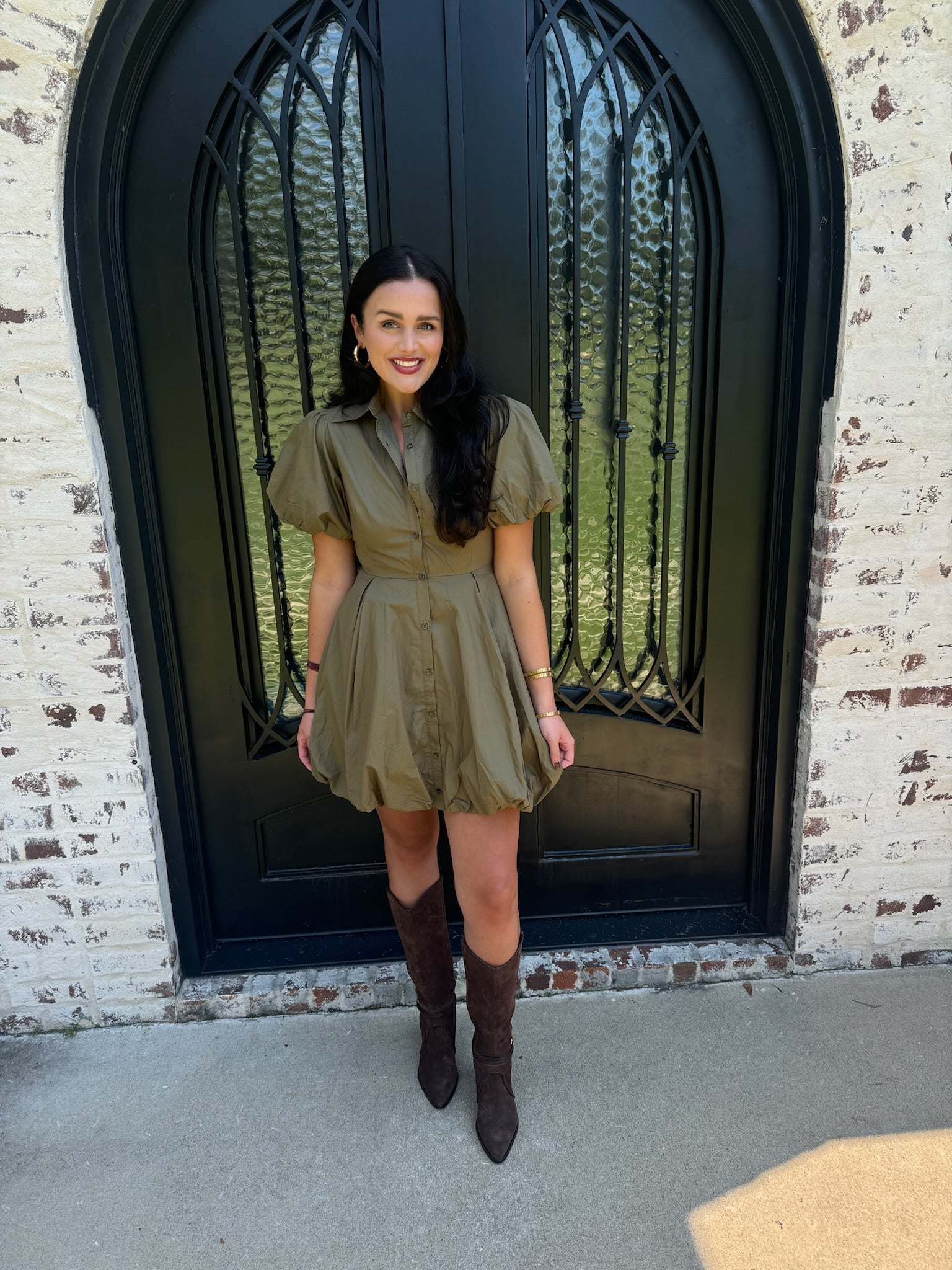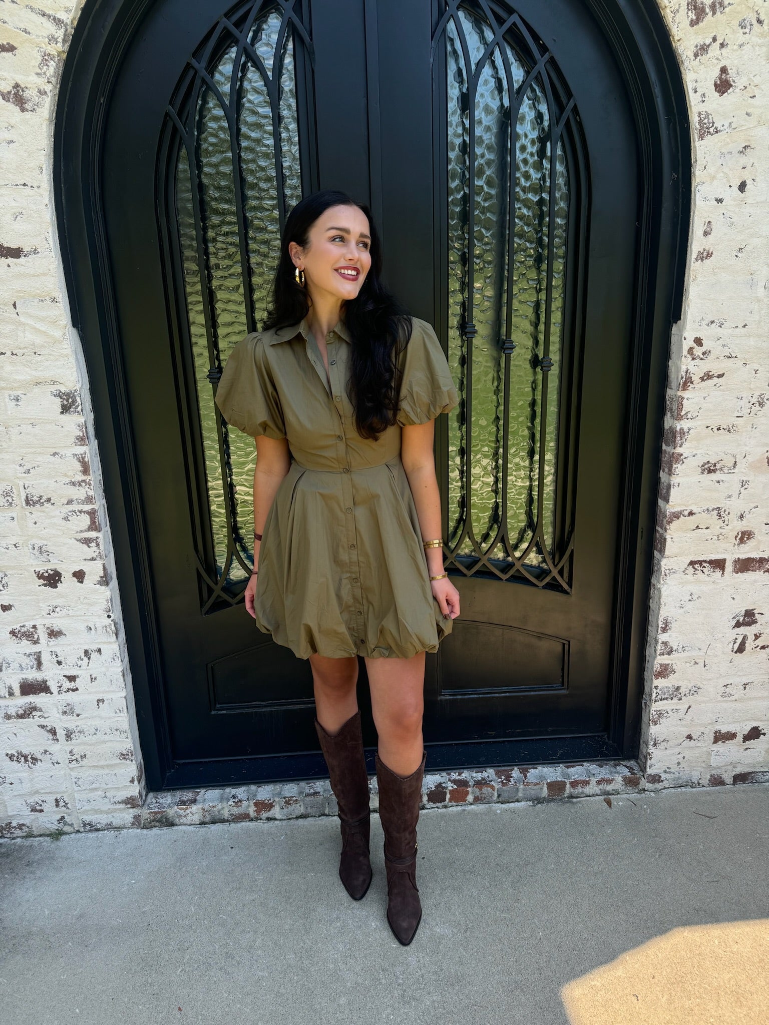 Step out in style with the Ruthie Bubble Hem Shirt Dress in Olive. Its charming puff sleeves and unique bubble hem create a flattering, feminine look perfect for fall game days, date nights, or a fun girls' night out. This versatile dress combines comfort and trendsetting design to keep you confident and effortlessly chic at every occasion.