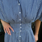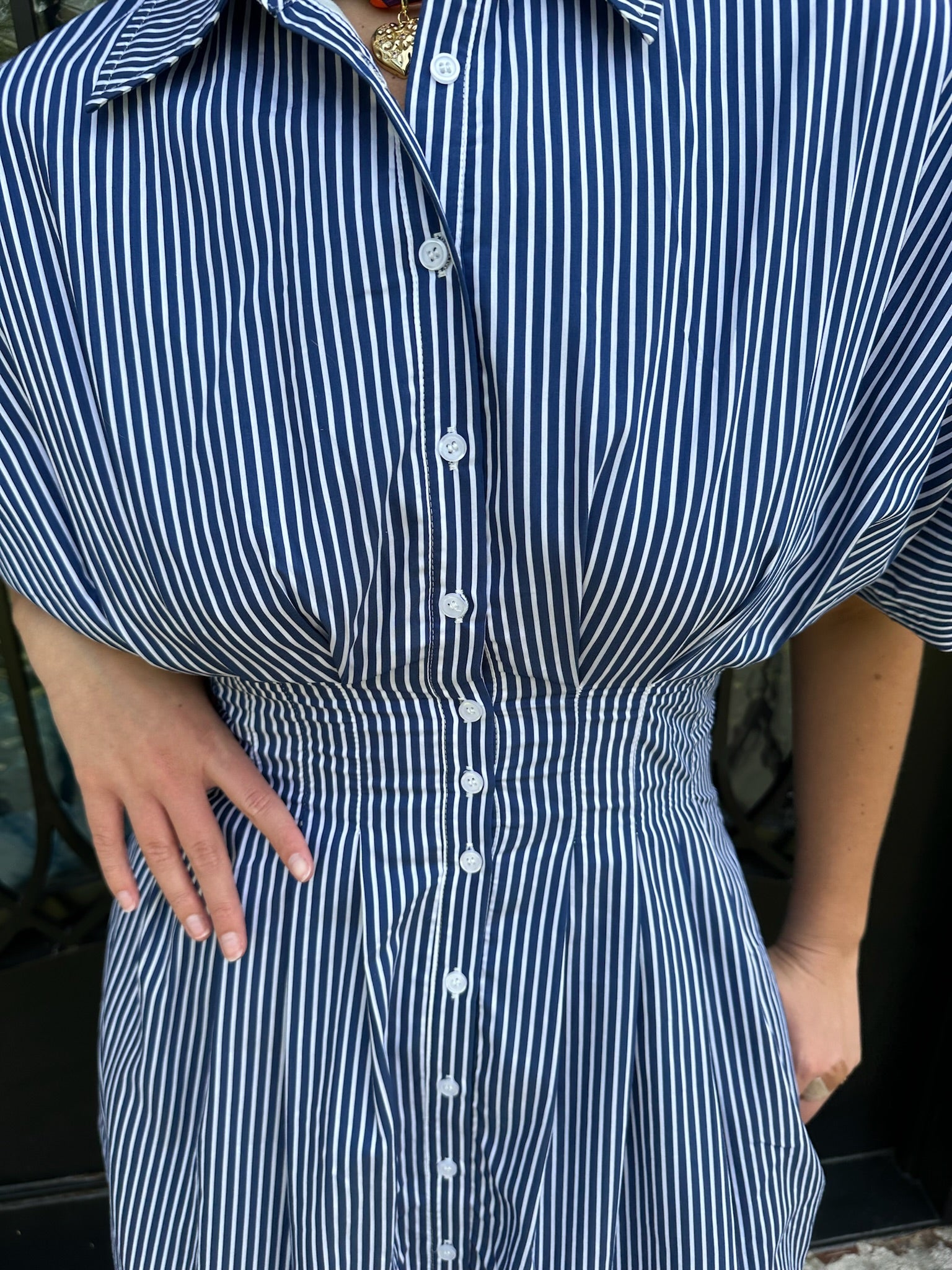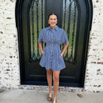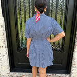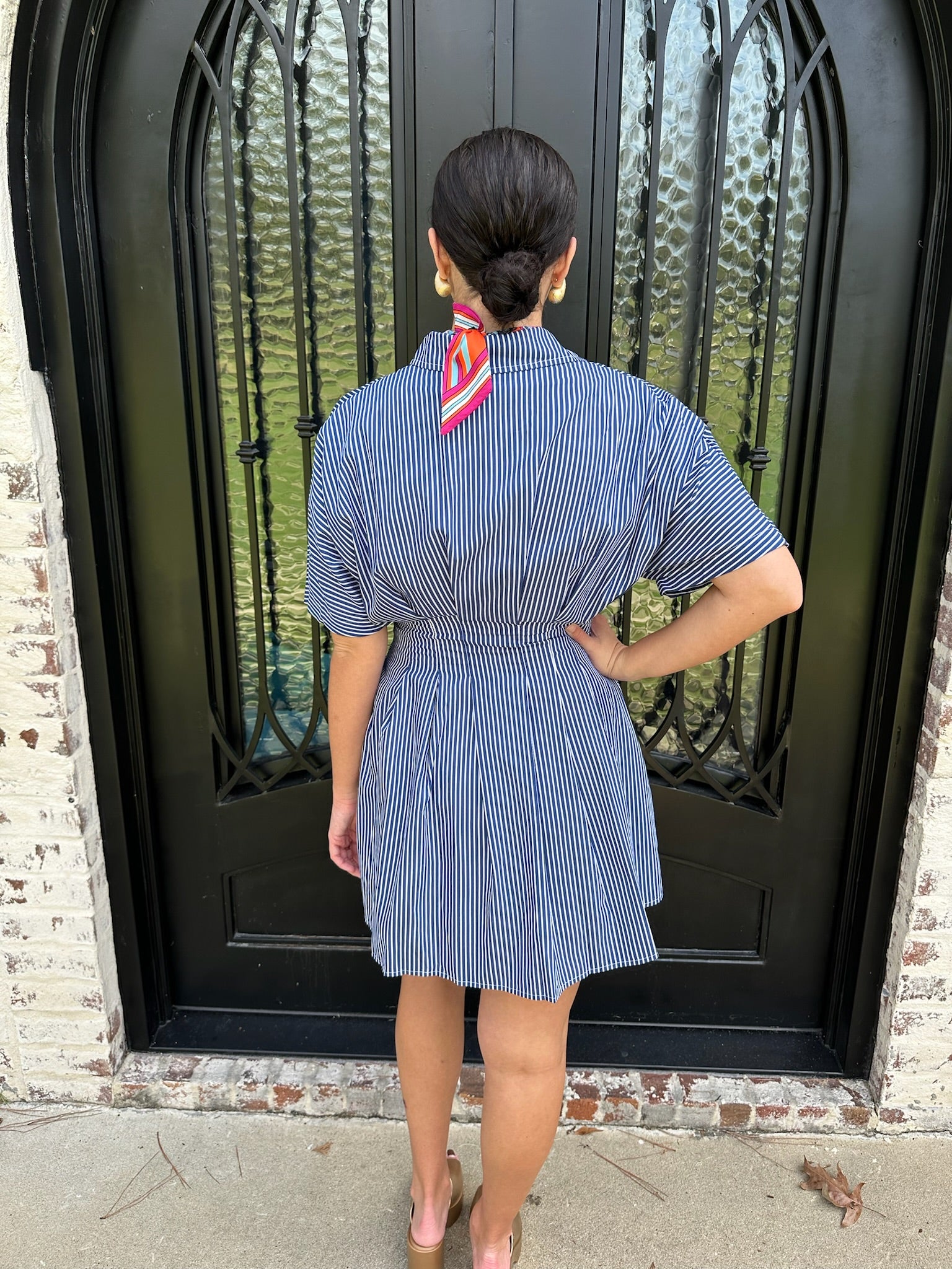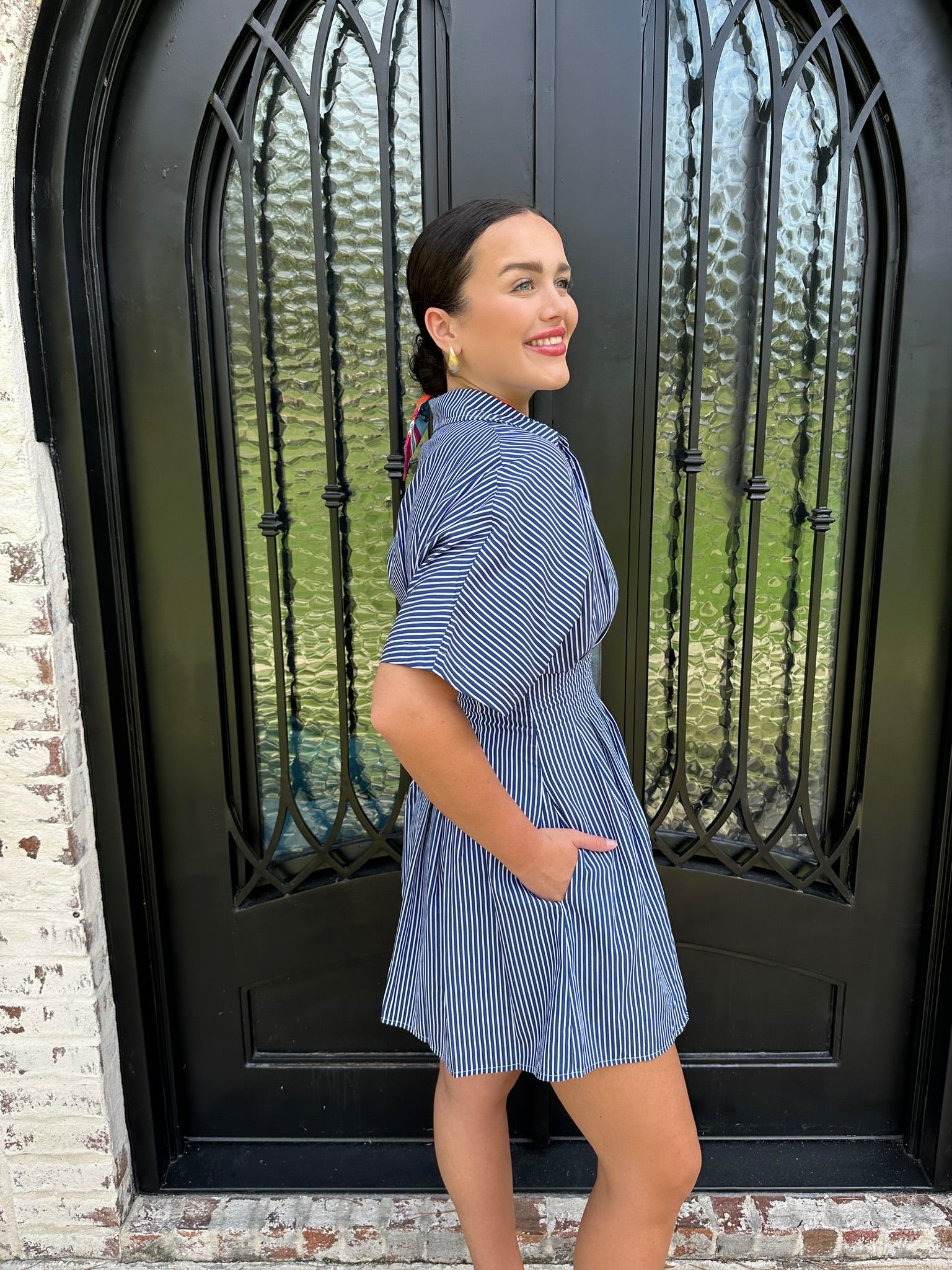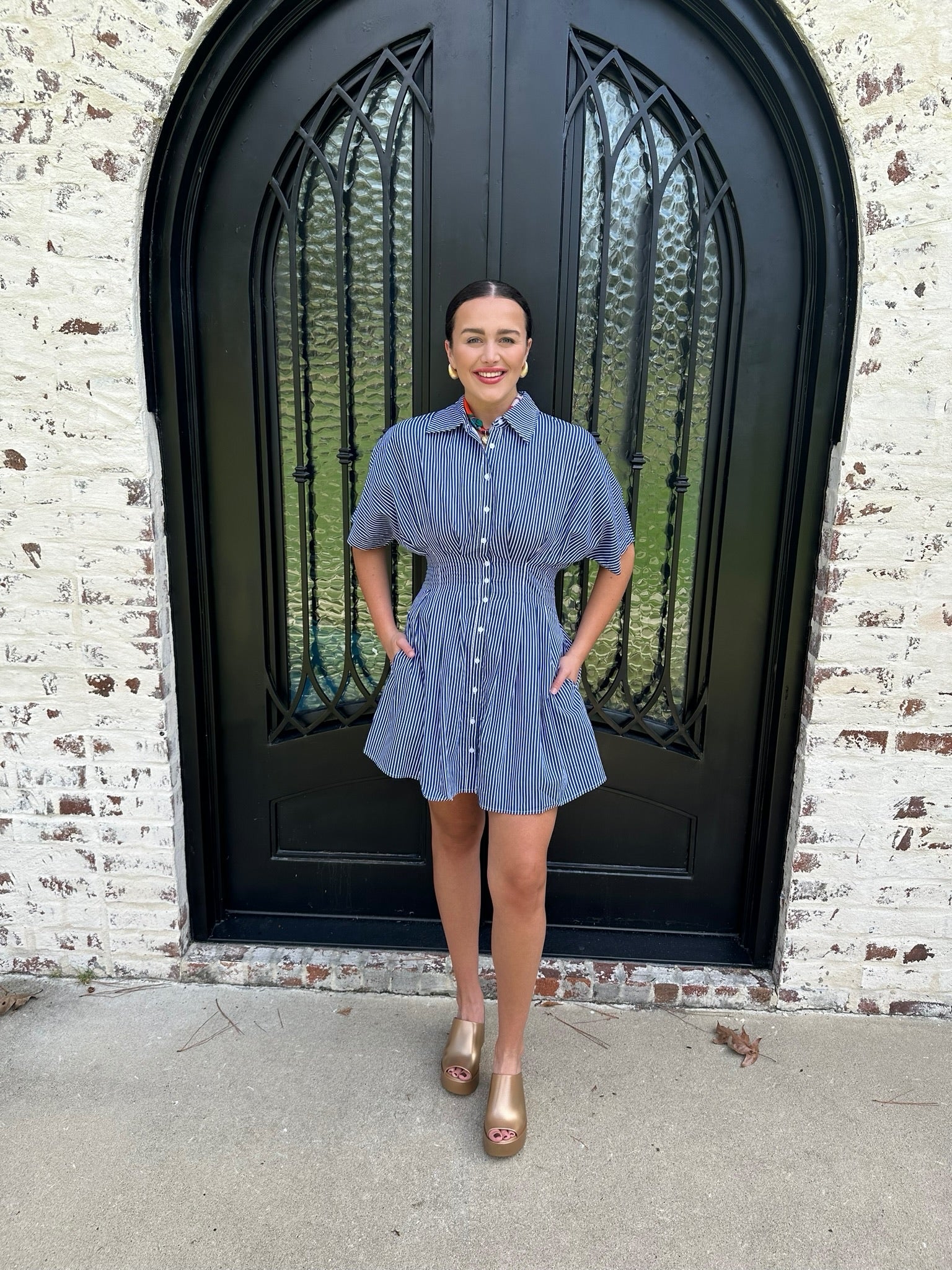 The Sally Striped Pleated Mini Dress in Navy is a timeless classic that exudes sophistication. Its red and white stripe design, paired with a flattering cinched waist and classic collar, creates a figure-flattering silhouette. With short sleeves and a button-up front, this dress is versatile and perfect for any occasion. Complete the look with our gold Melissa mules or casual back 70 sneakers!
