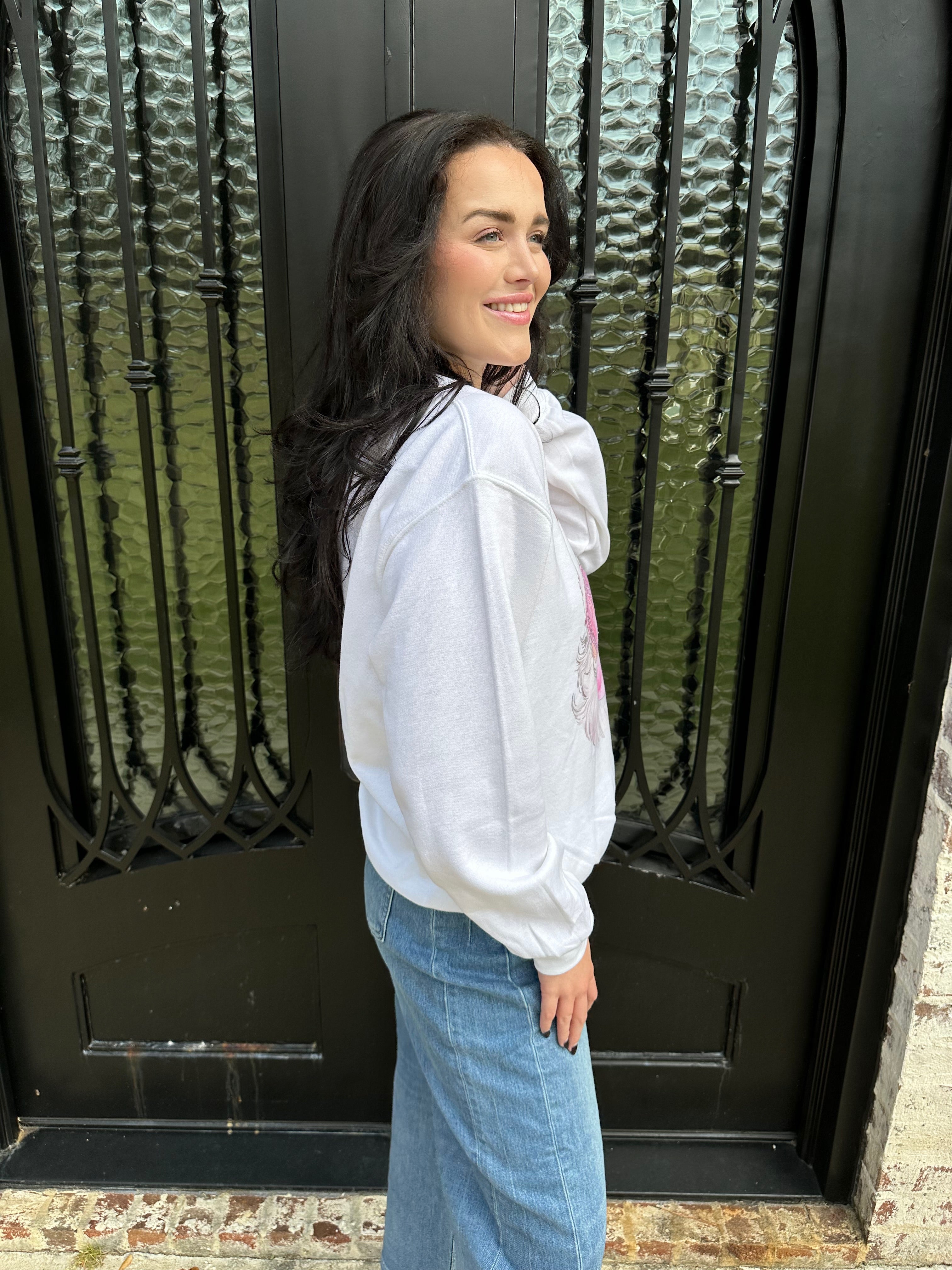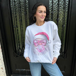 Embrace nostalgic charm with this playful crewneck sweatshirt featuring a vintage-inspired Santa blowing pink bubble gum. The whimsical design brings retro holiday spirit with a modern twist, perfect for those who love quirky seasonal style. Crafted in soft white fabric, it's comfortable enough for everyday wear while making a bold fashion statement. Whether you're spreading holiday cheer or just celebrating your fun side, this sweatshirt delivers personality and warmth in one cozy package.
