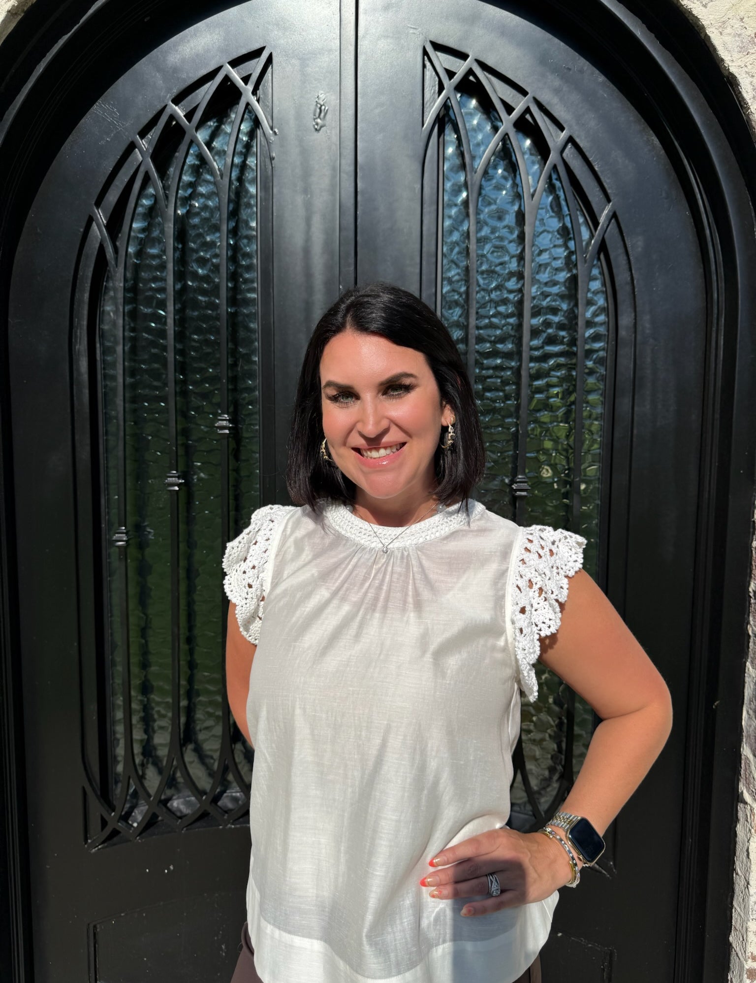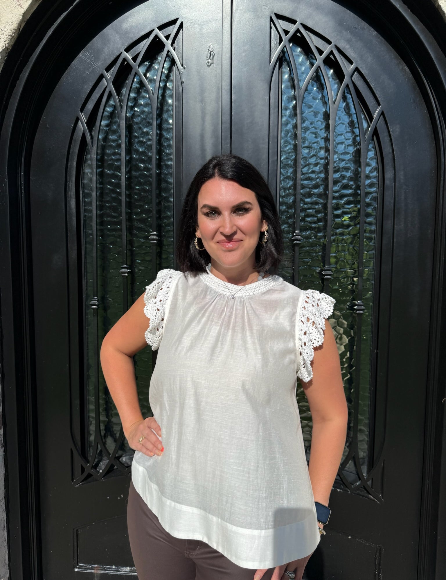 Karlie Poplin Stripe Ric-Rac Trim Button Up Top in Blue and white