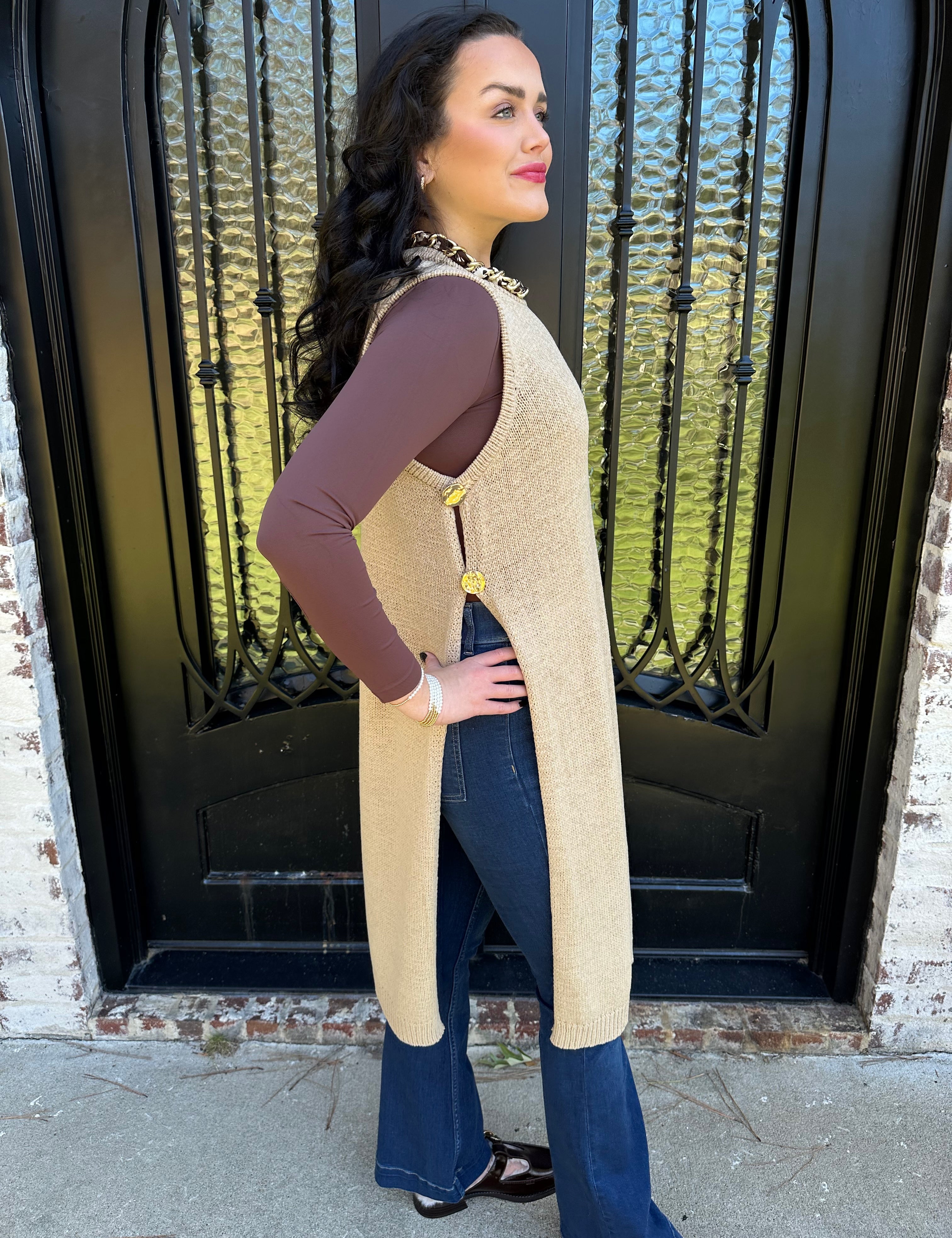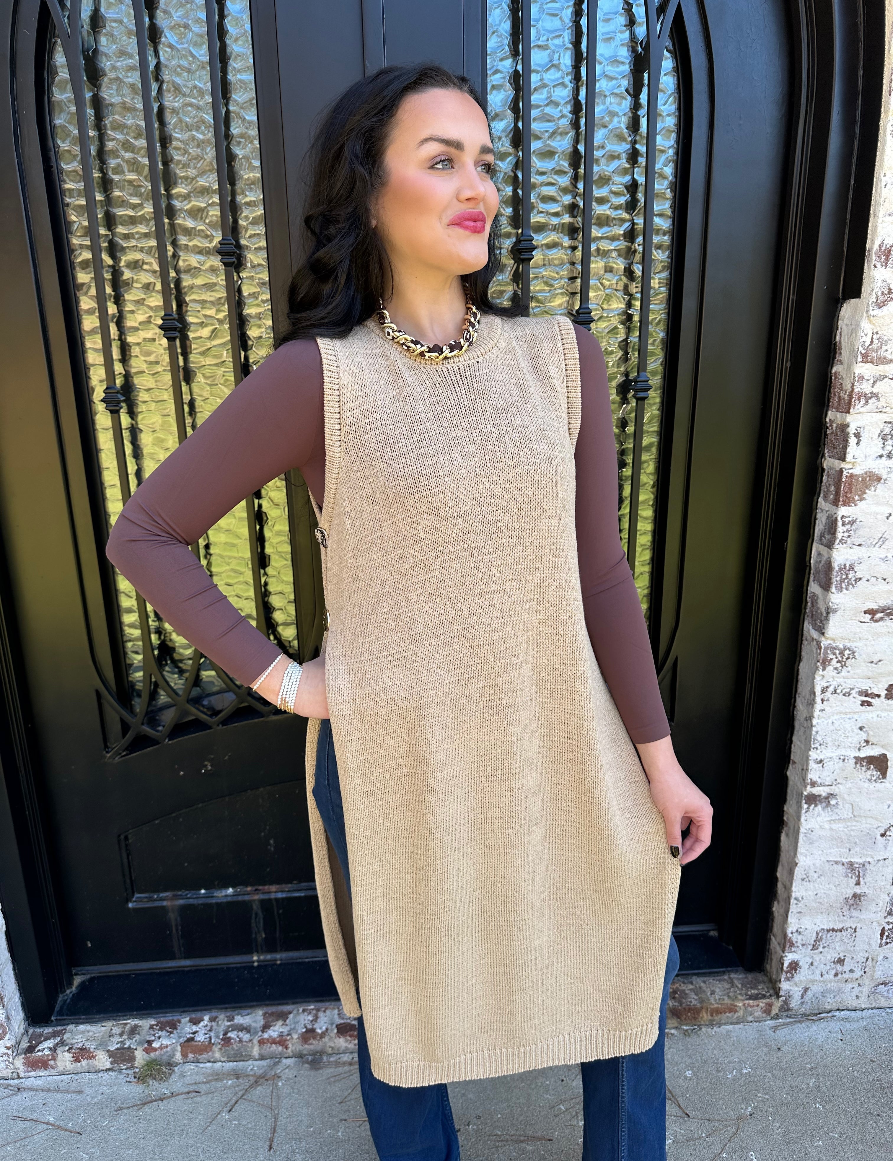 Bali Side Button Open Sweater Dress in Oak Latte