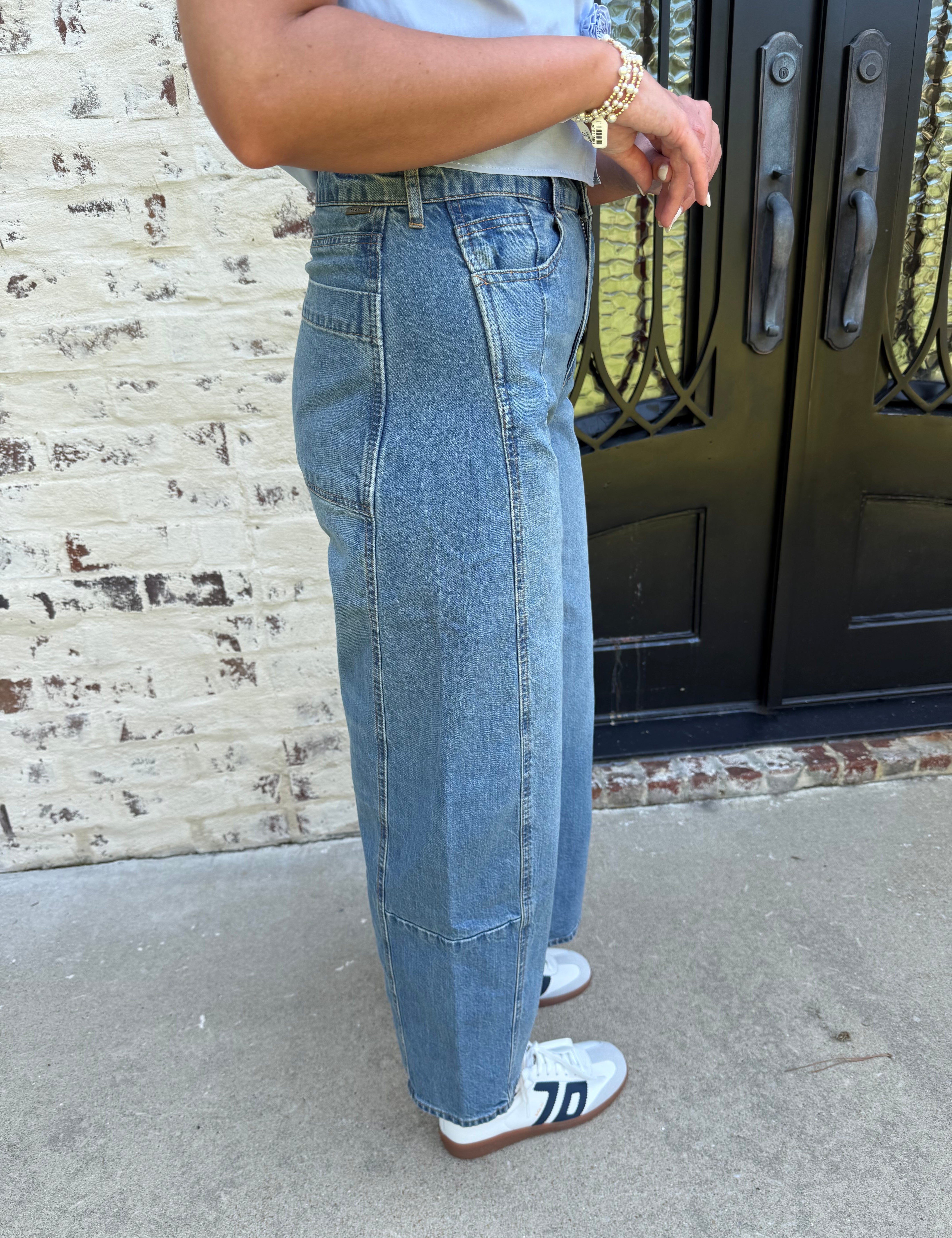 Tractr High Waist Barrel Jeans in Medium Indigo Wash