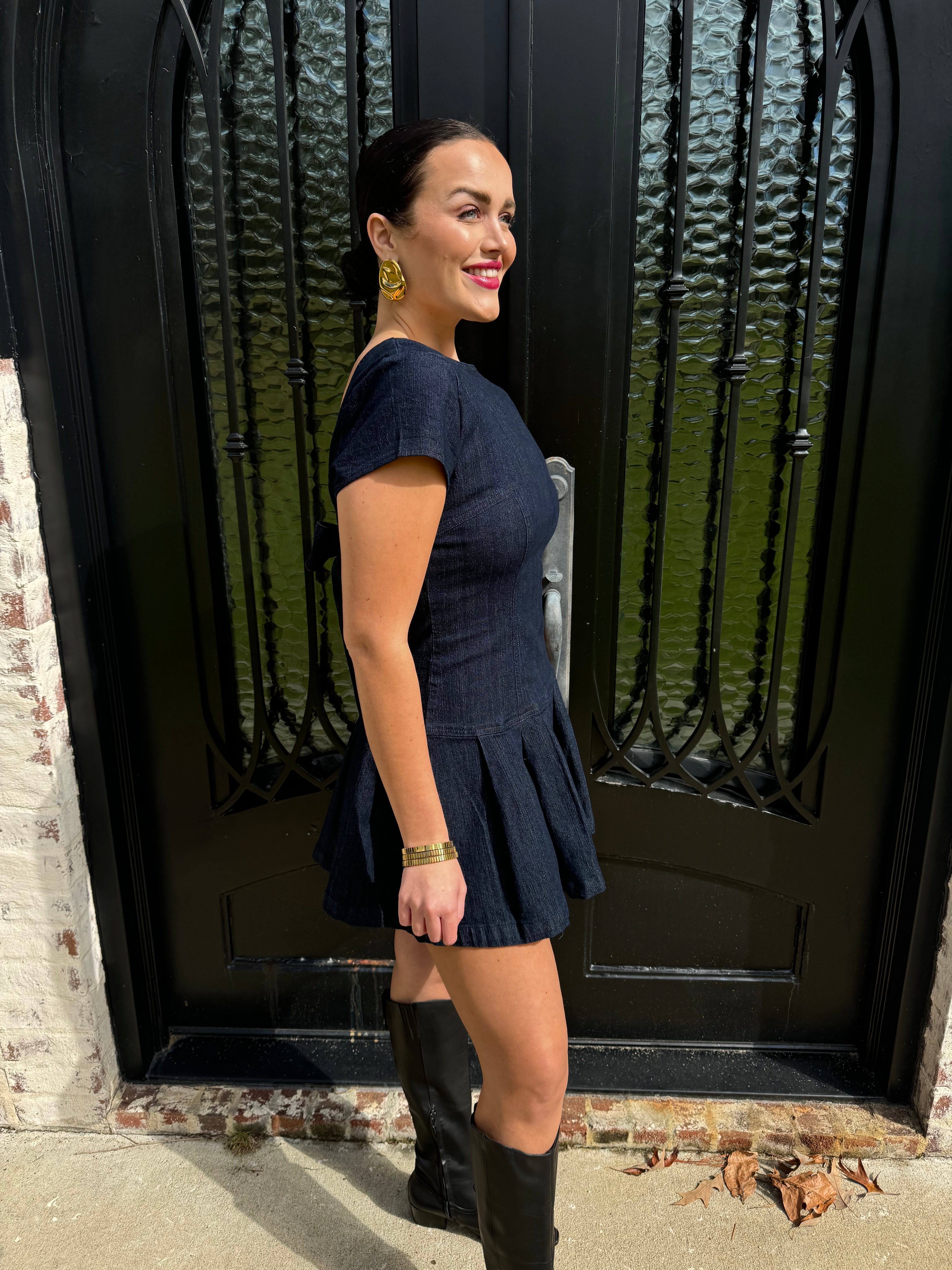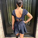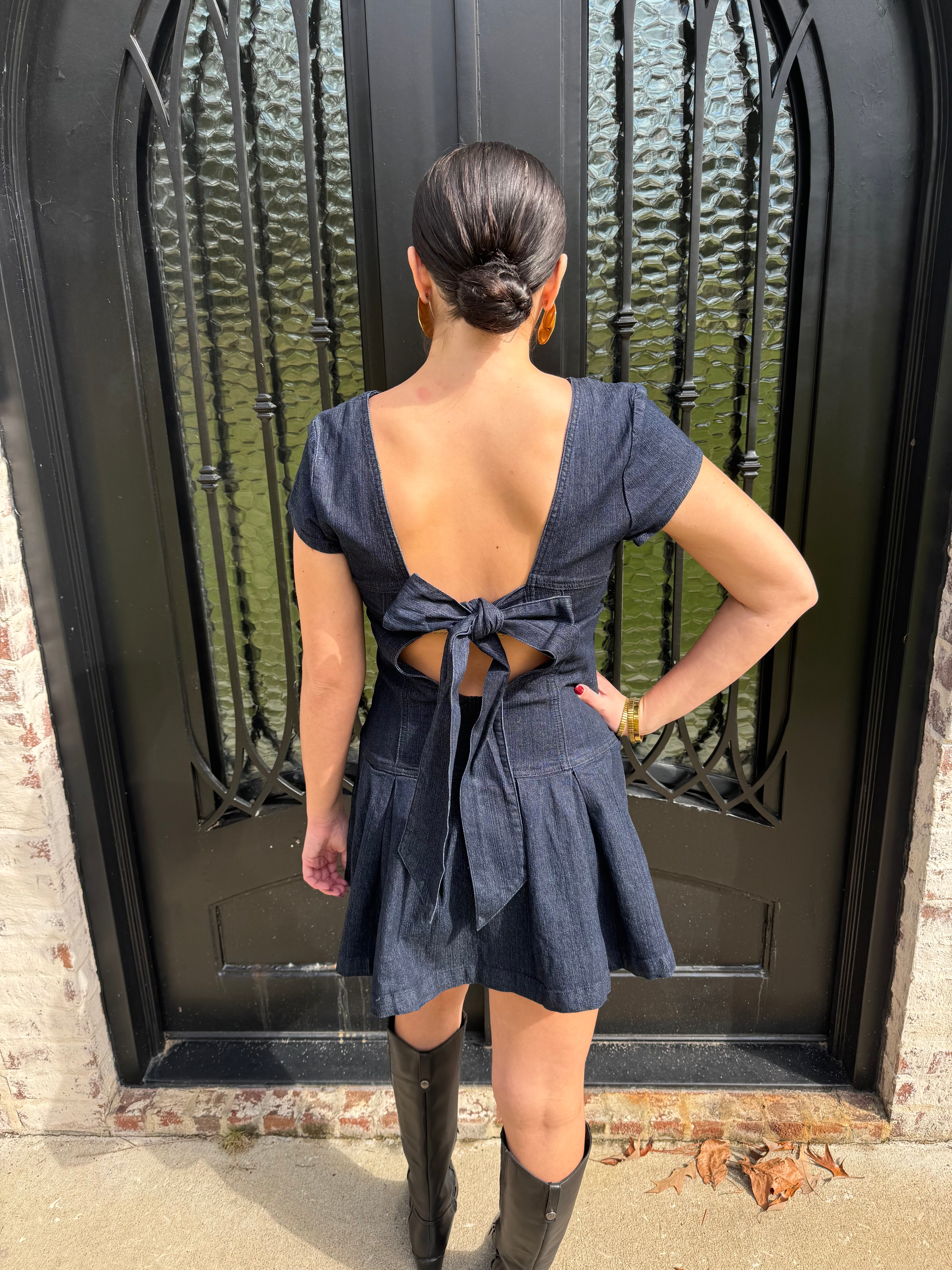 Expertly crafted from high-quality dark wash denim, the Ella dress is the perfect addition to your fall wardrobe. Its open back with bow tie detailing adds a touch of charm, making it the ideal dress for game days or Thanksgiving gatherings. Embrace the fall vibes with this elevated and versatile mini dress.