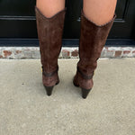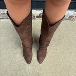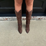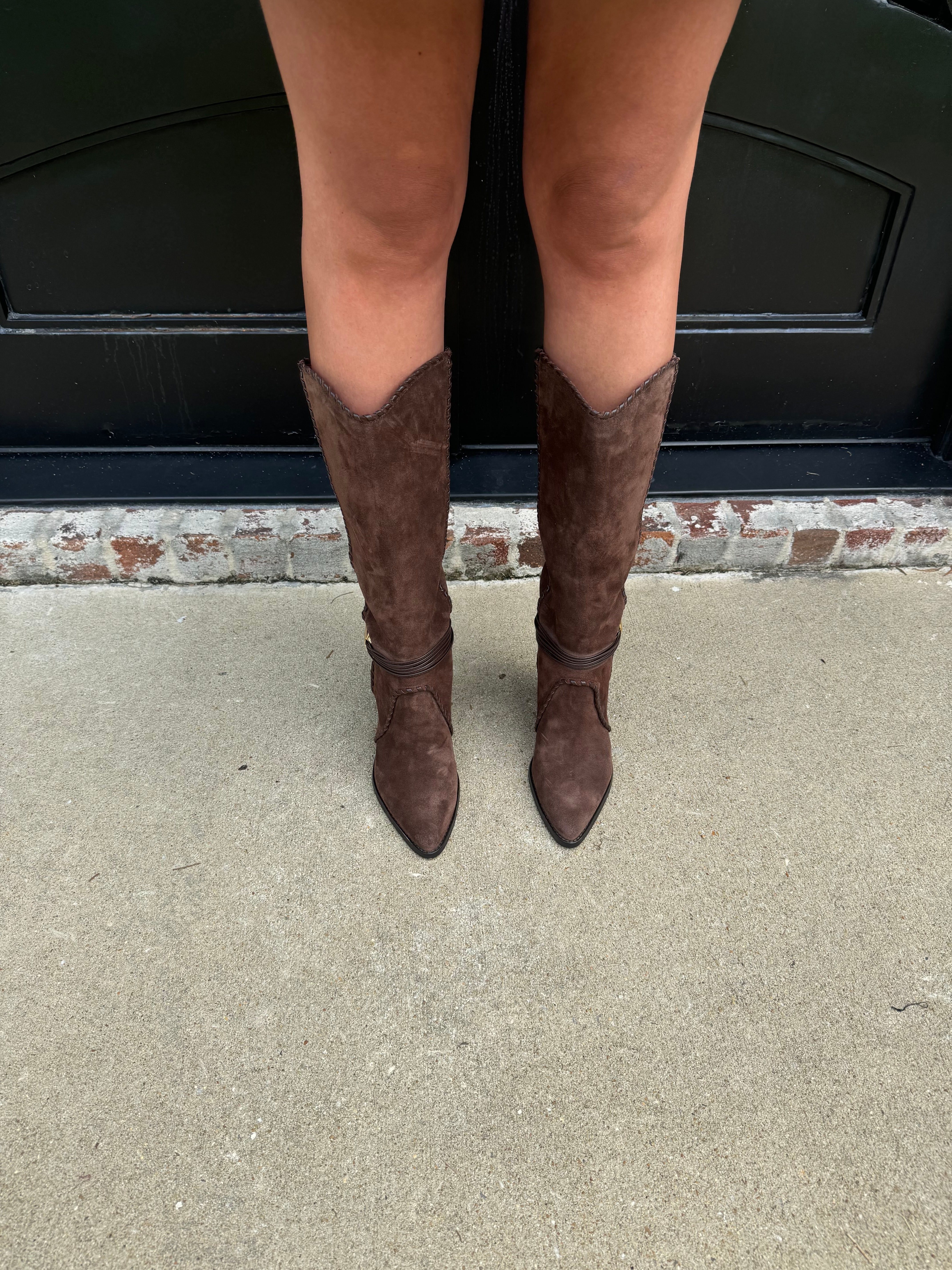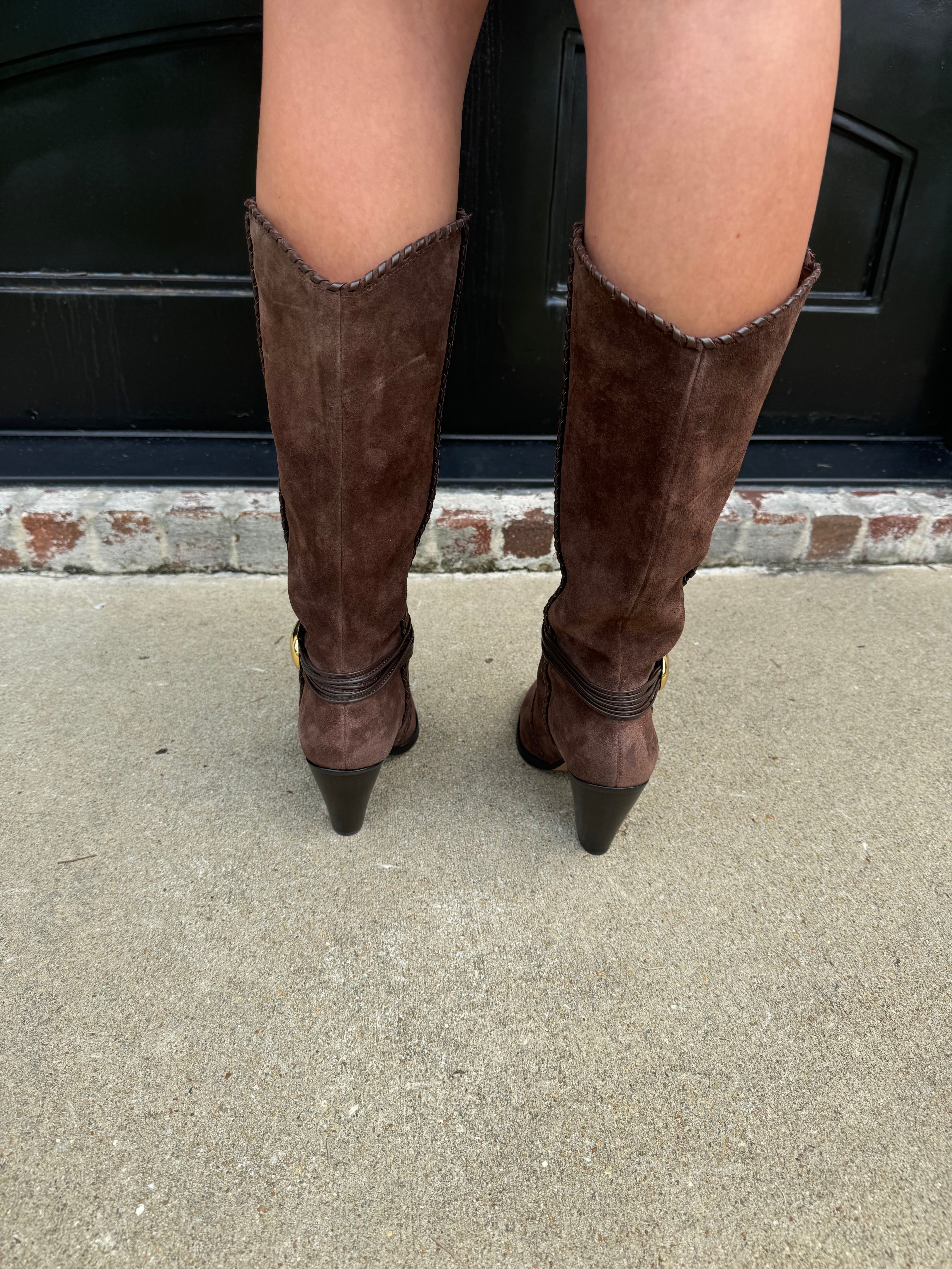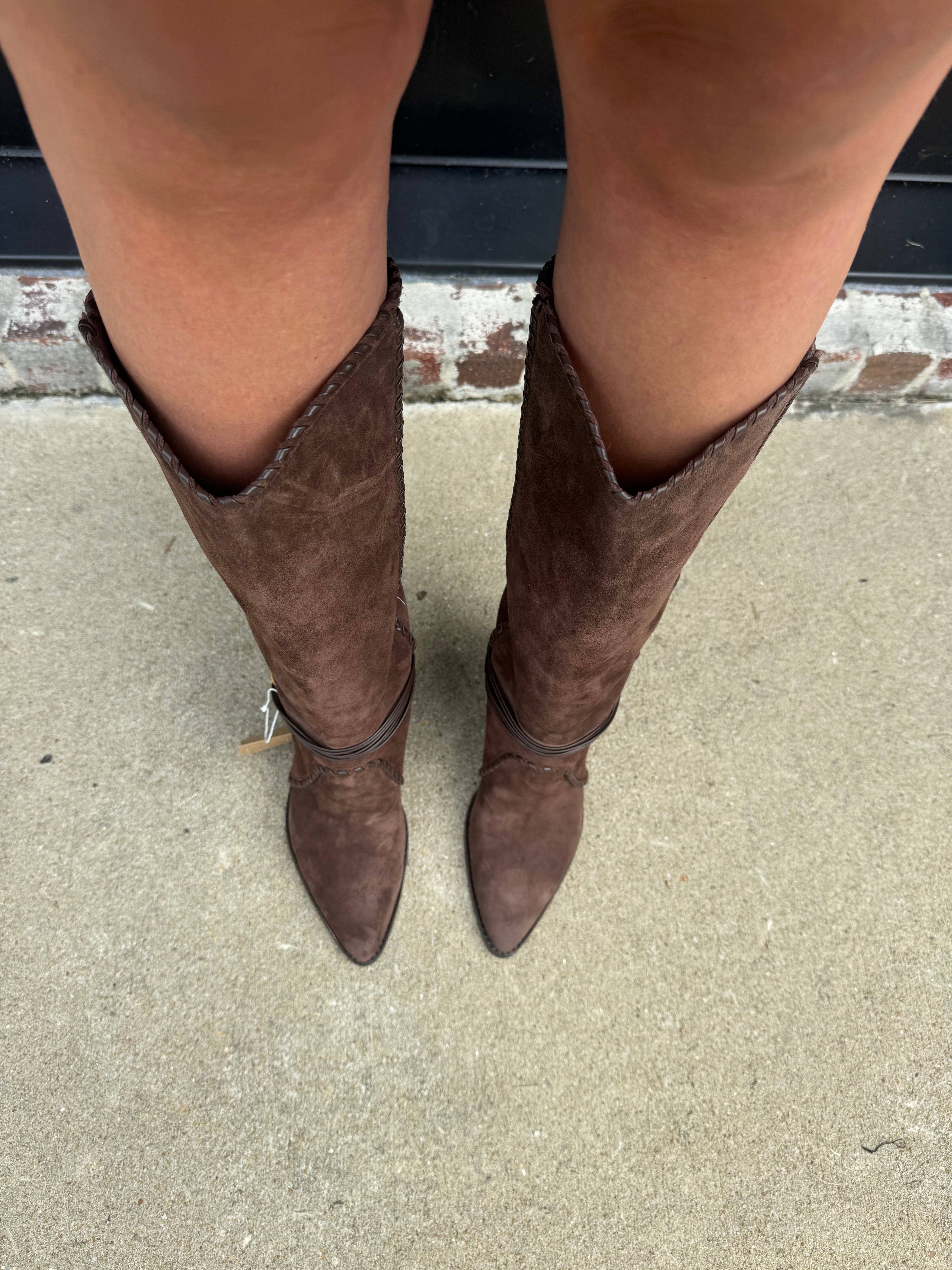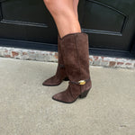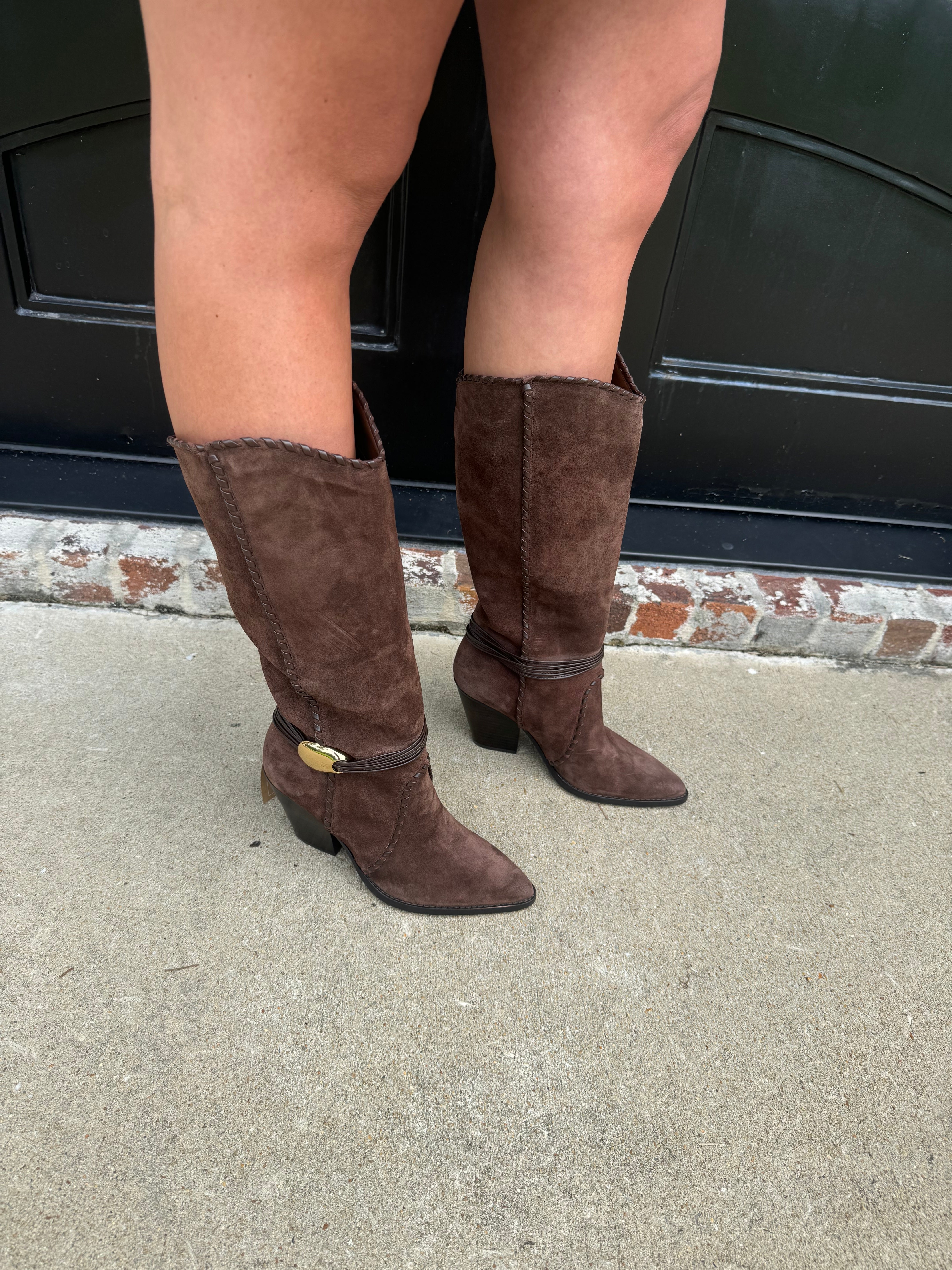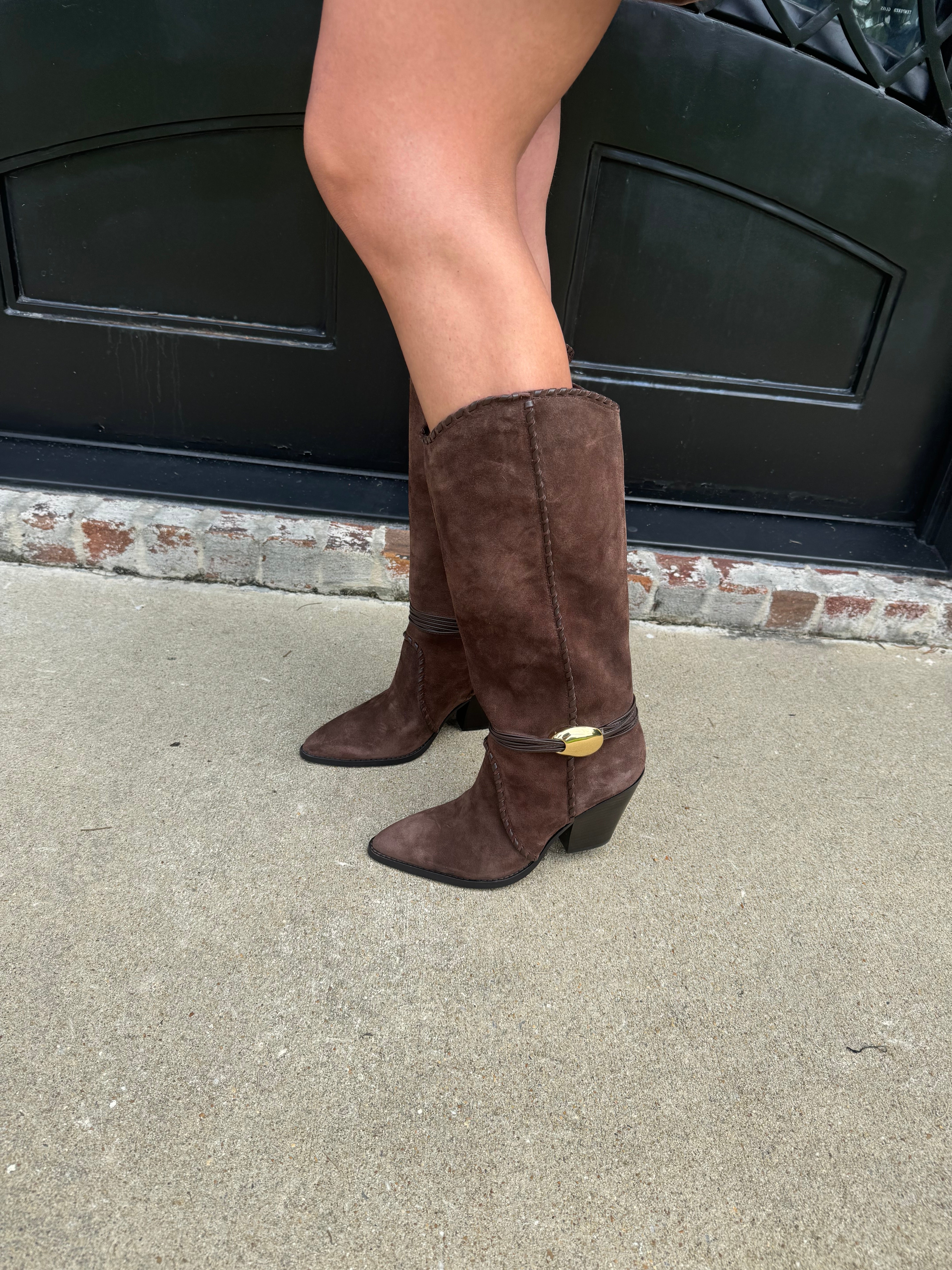 JODY is western-inspired and ready for everyday wear. This knee-high boot’s traditional details, like a stacked block heel and pointed toe, are elevated with a gold metal accent. Style her neutral suede colorways with jeans on the weekend and midi skirts during the week.