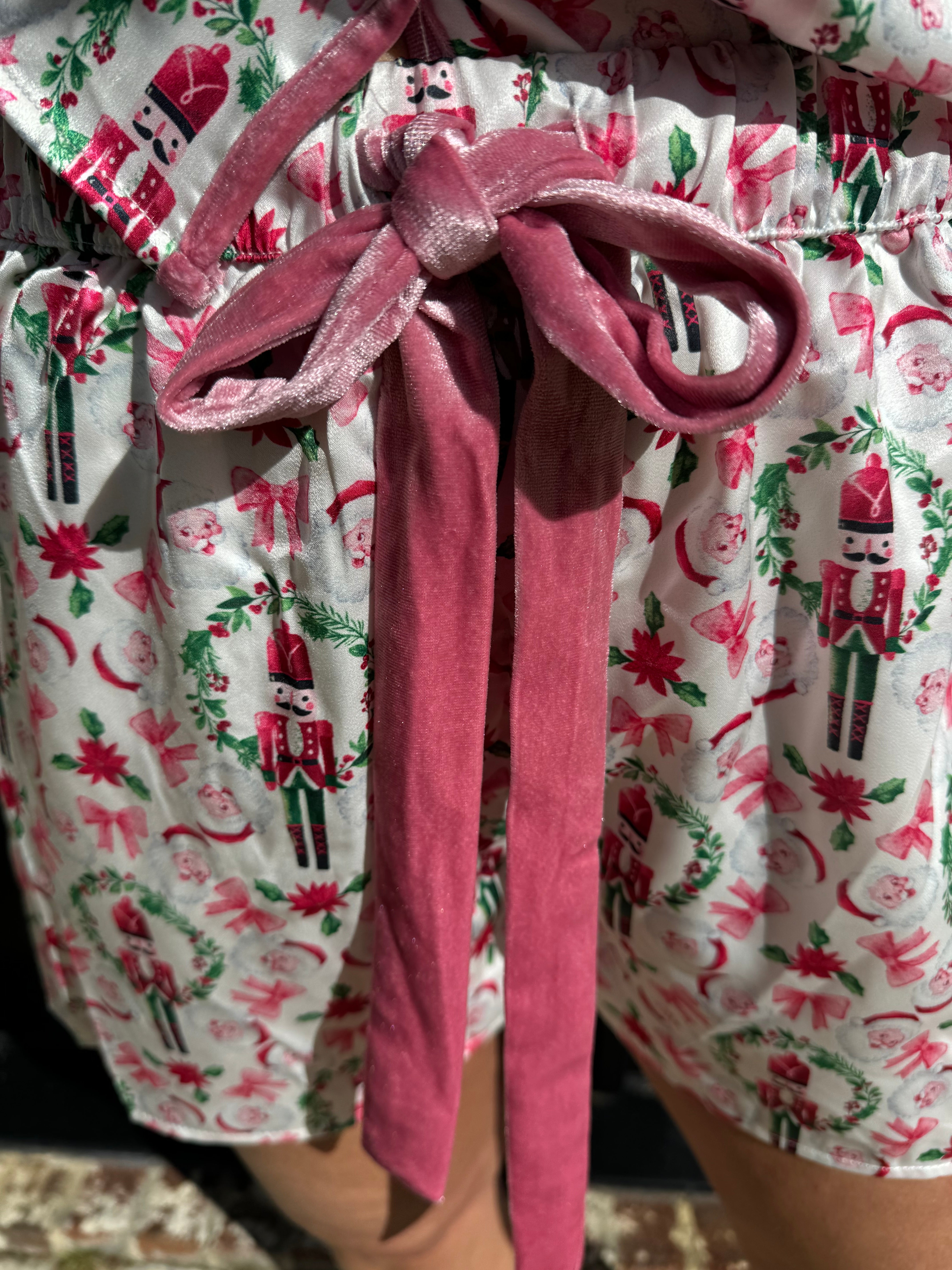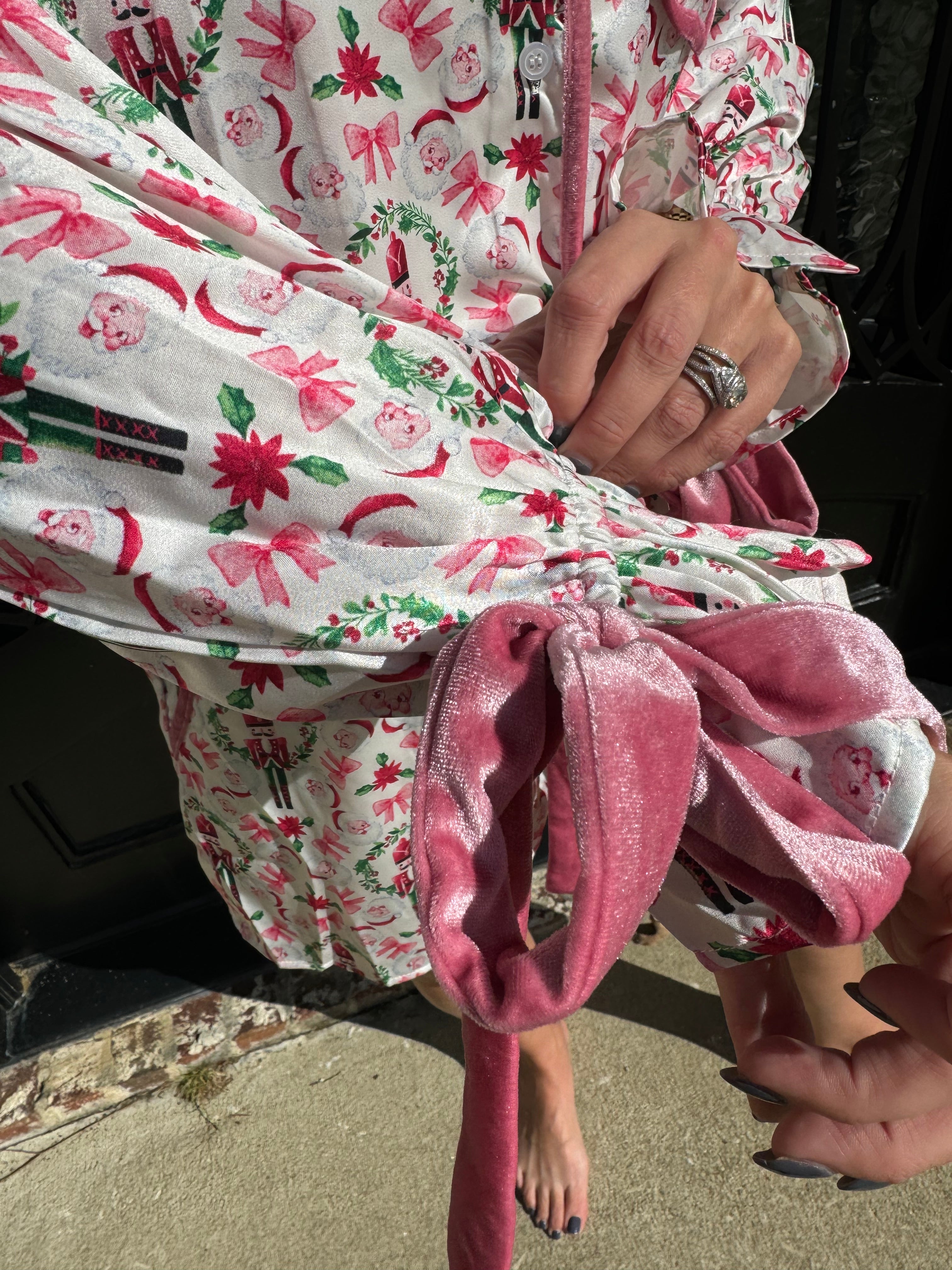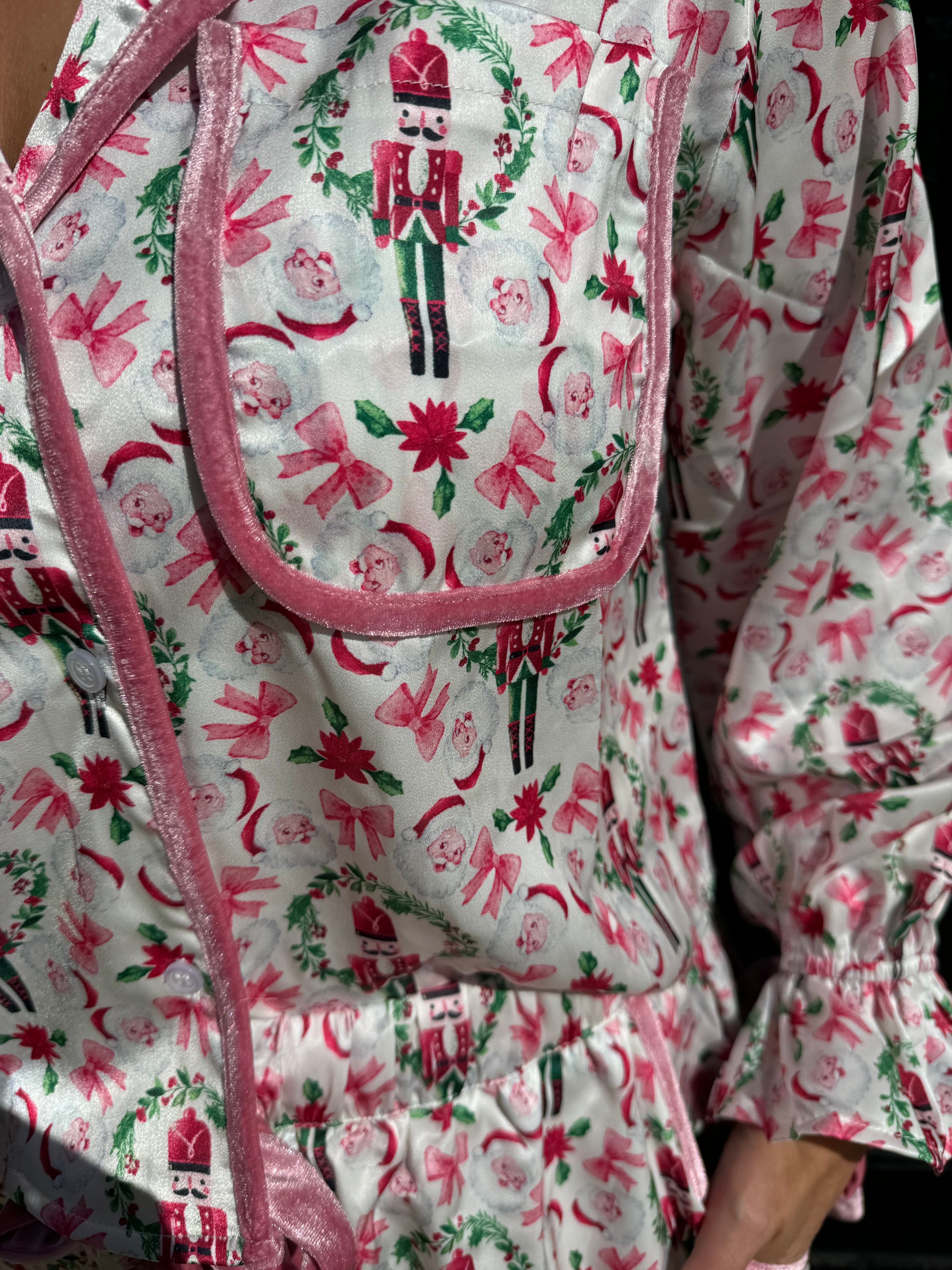 Embrace the holiday spirit in this charming Christmas Satin PJ Set featuring a nostalgic Santa face and nutcracker design. The soft satin fabric drapes beautifully while the long sleeves with elastic cuffs ensure a snug, comfortable fit. Velvet bow ties adorning the sleeves and matching the pj bottoms add an elegant touch of festive flair. Perfect for cozy nights in or holiday gatherings, this set combines vintage-inspired charm with modern comfort. The pink hue brings a fresh, contemporary twist to classic Christmas imagery, making it an irresistible choice for anyone who loves seasonal style with personality.