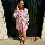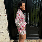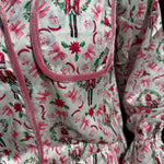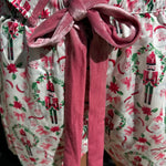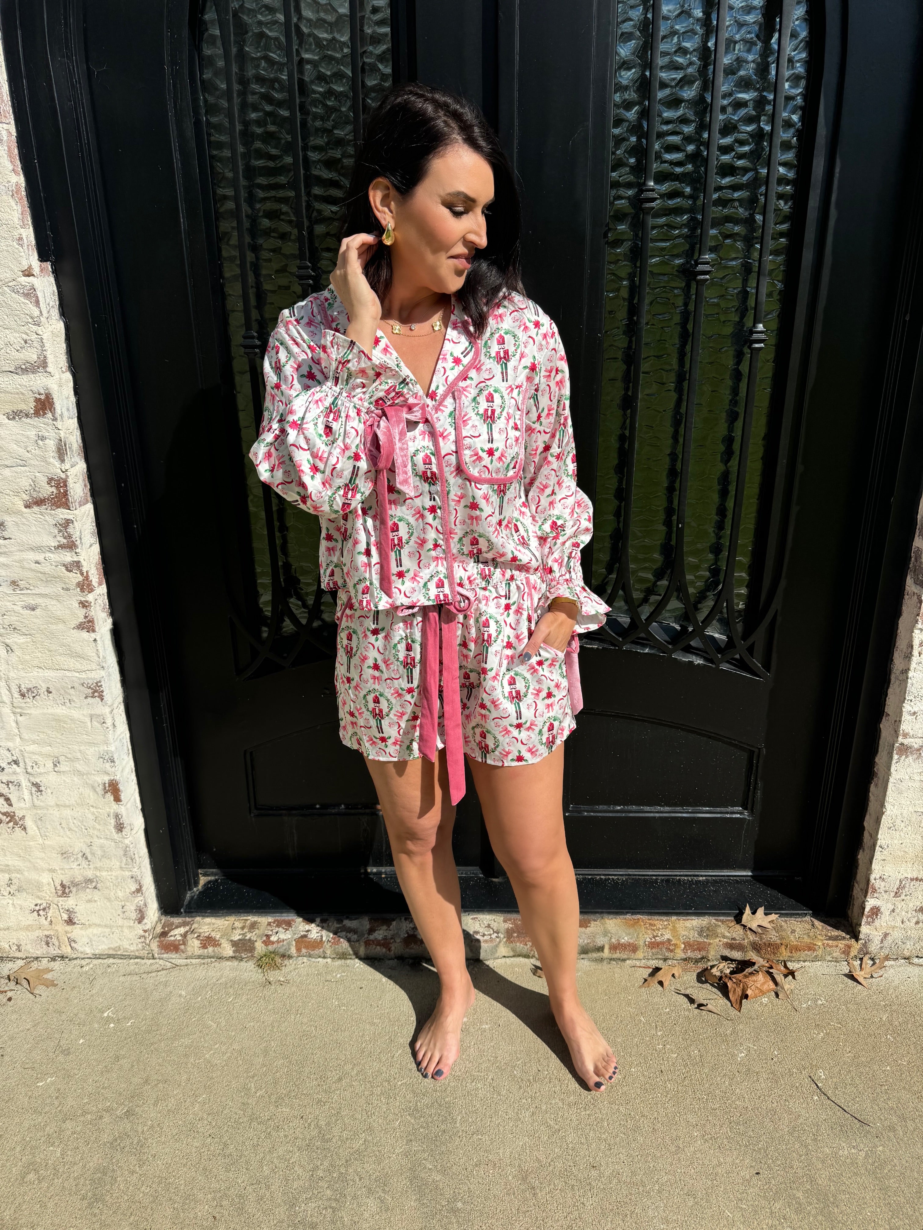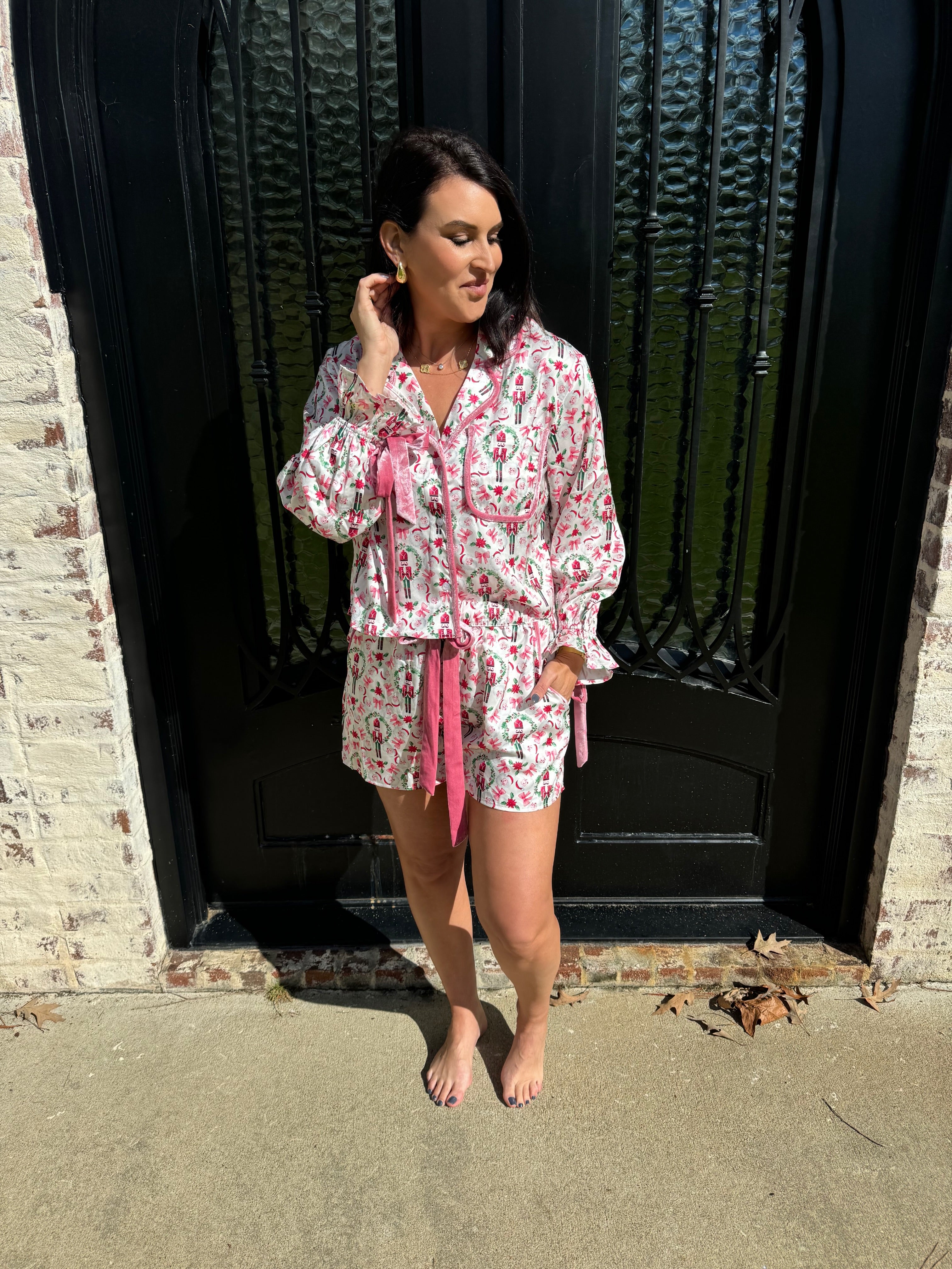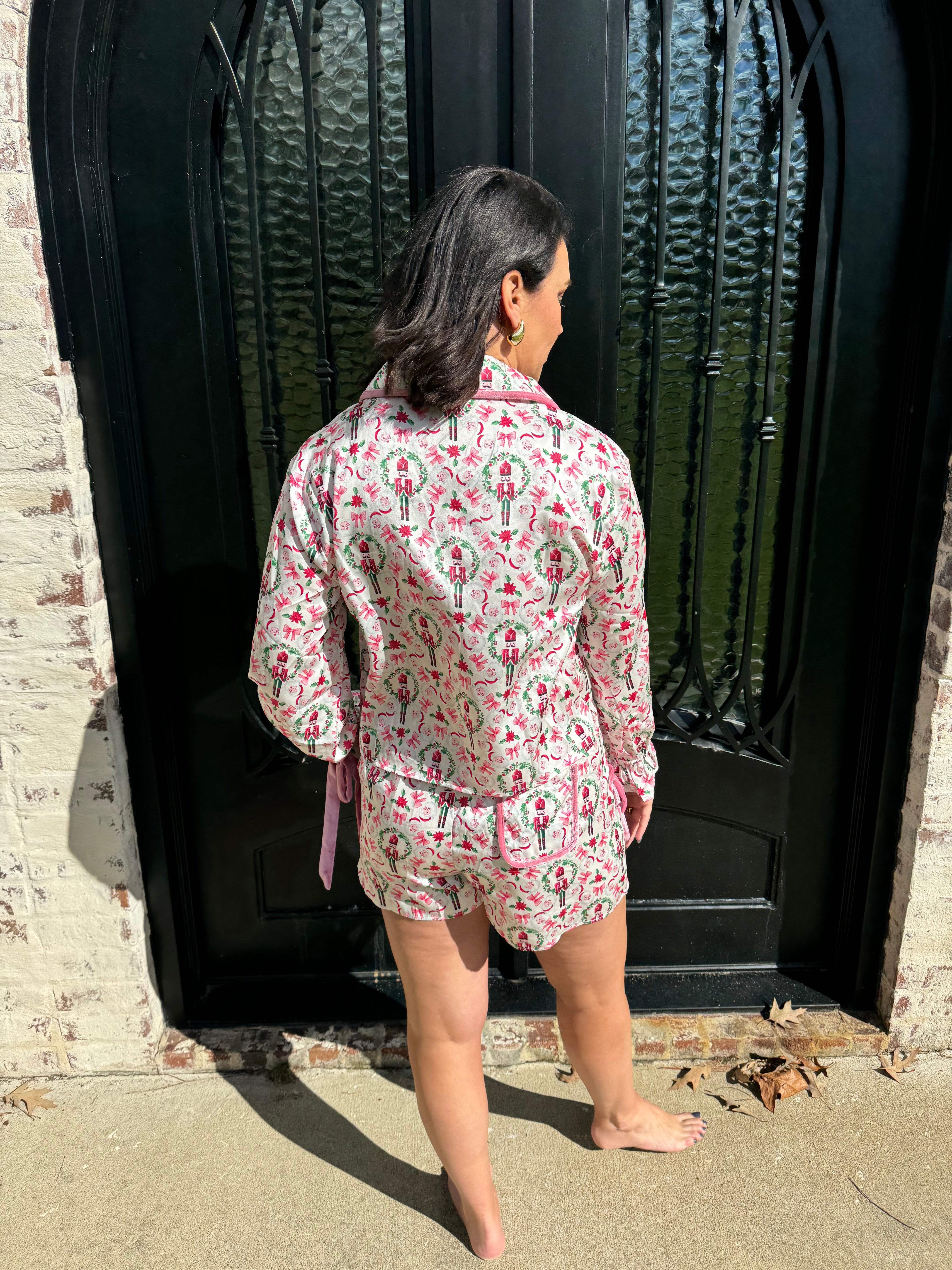 Embrace the holiday spirit in this charming Christmas Satin PJ Set featuring a nostalgic Santa face and nutcracker design. The soft satin fabric drapes beautifully while the long sleeves with elastic cuffs ensure a snug, comfortable fit. Velvet bow ties adorning the sleeves and matching the pj bottoms add an elegant touch of festive flair. Perfect for cozy nights in or holiday gatherings, this set combines vintage-inspired charm with modern comfort. The pink hue brings a fresh, contemporary twist to classic Christmas imagery, making it an irresistible choice for anyone who loves seasonal style with personality.