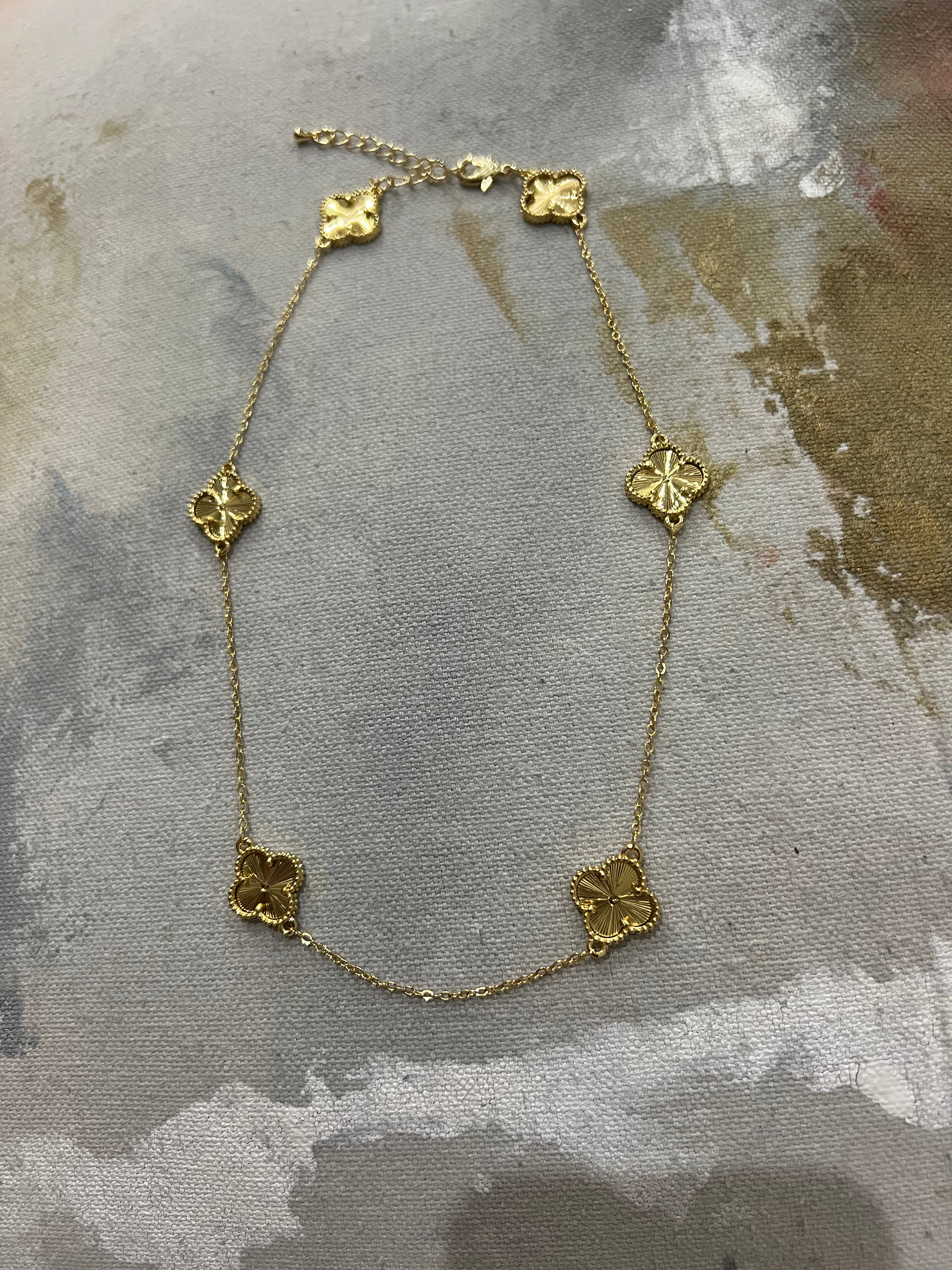 Add a touch of luck and elegance to your jewelry collection with this 16" gold clover charm necklace. Its finely crafted clover pendant symbolizes good fortune, making it an ideal accessory for daily wear or special occasions. Lightweight and versatile, this necklace effortlessly enhances any outfit while keeping you connected to a meaningful charm.