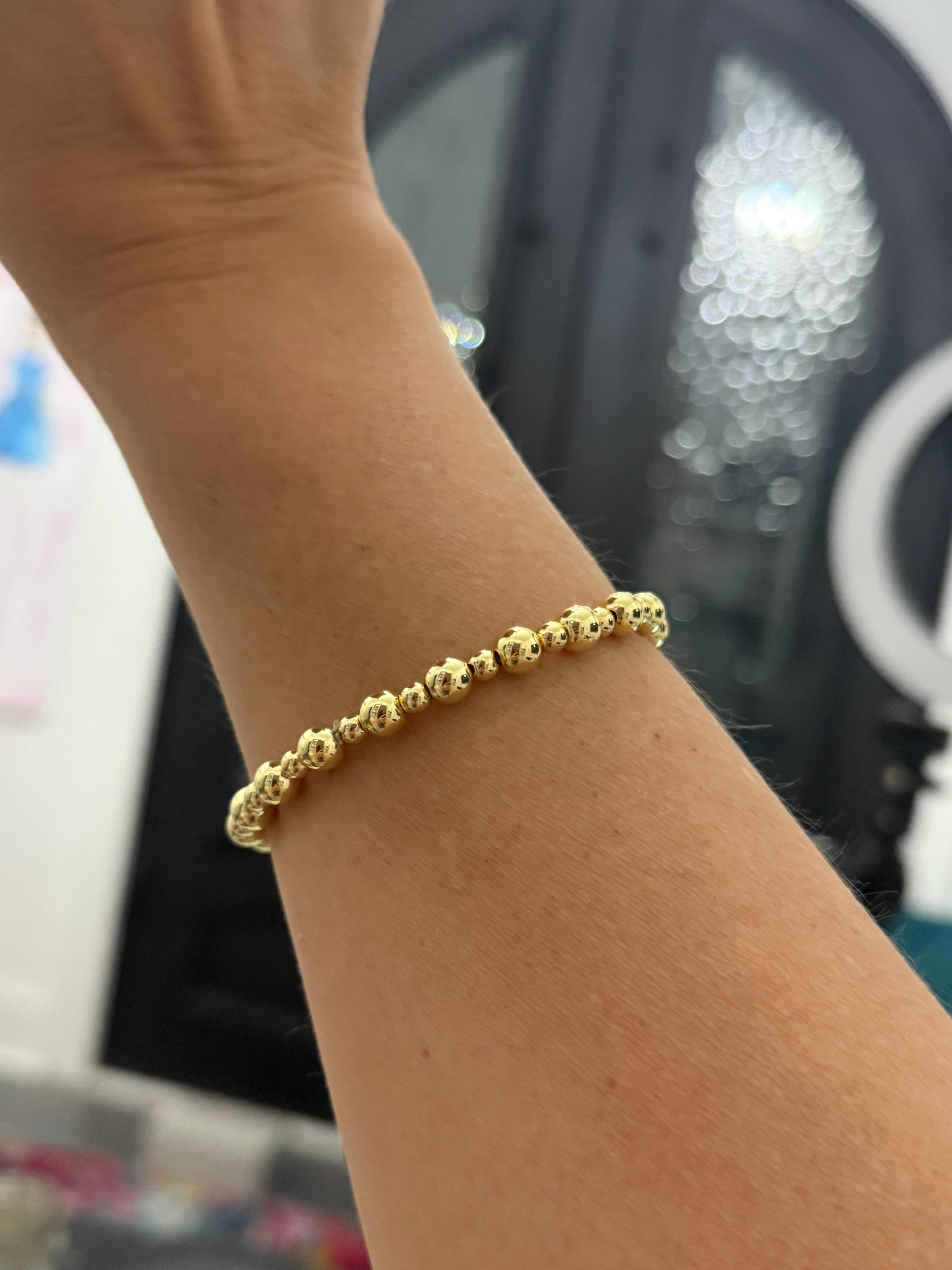 This bracelet is made with alternating small and larger gold balls, and adds a touch of elegance and sophistication to any outfit. Slip it on and experience effortless style and comfort all day long. Make a stack adding some of our other gold stretch bracelets in! Water resistant.