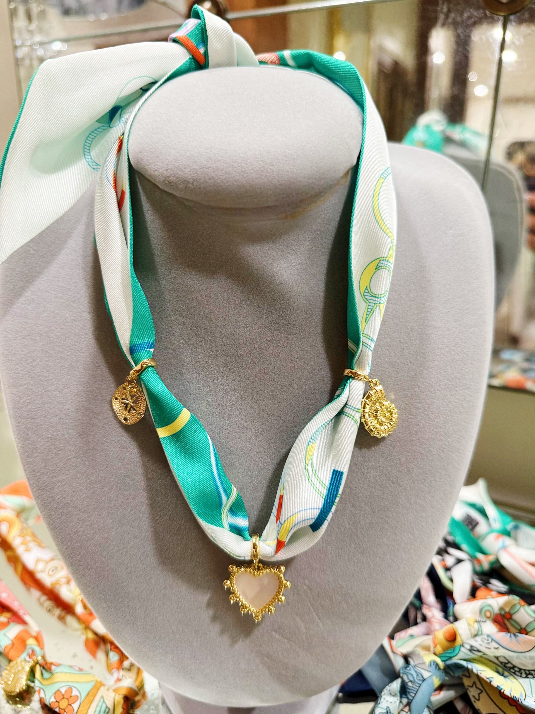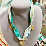 Scarf Necklace Sand Dollar, Beaded Iridescent Heart, Shell in Green