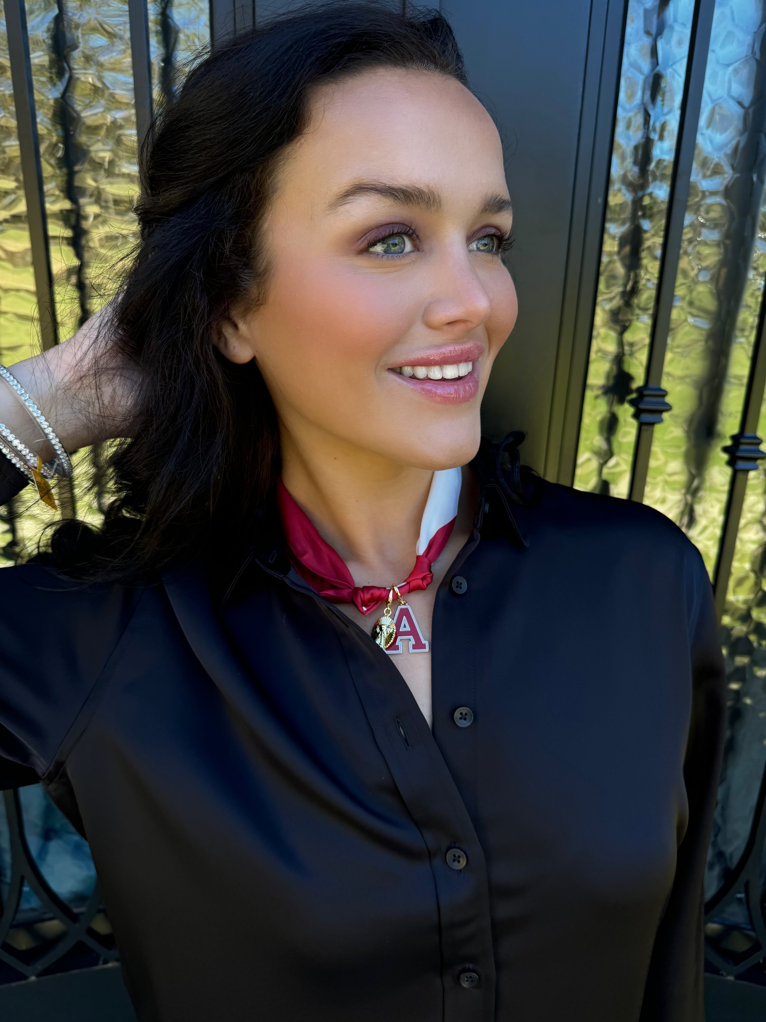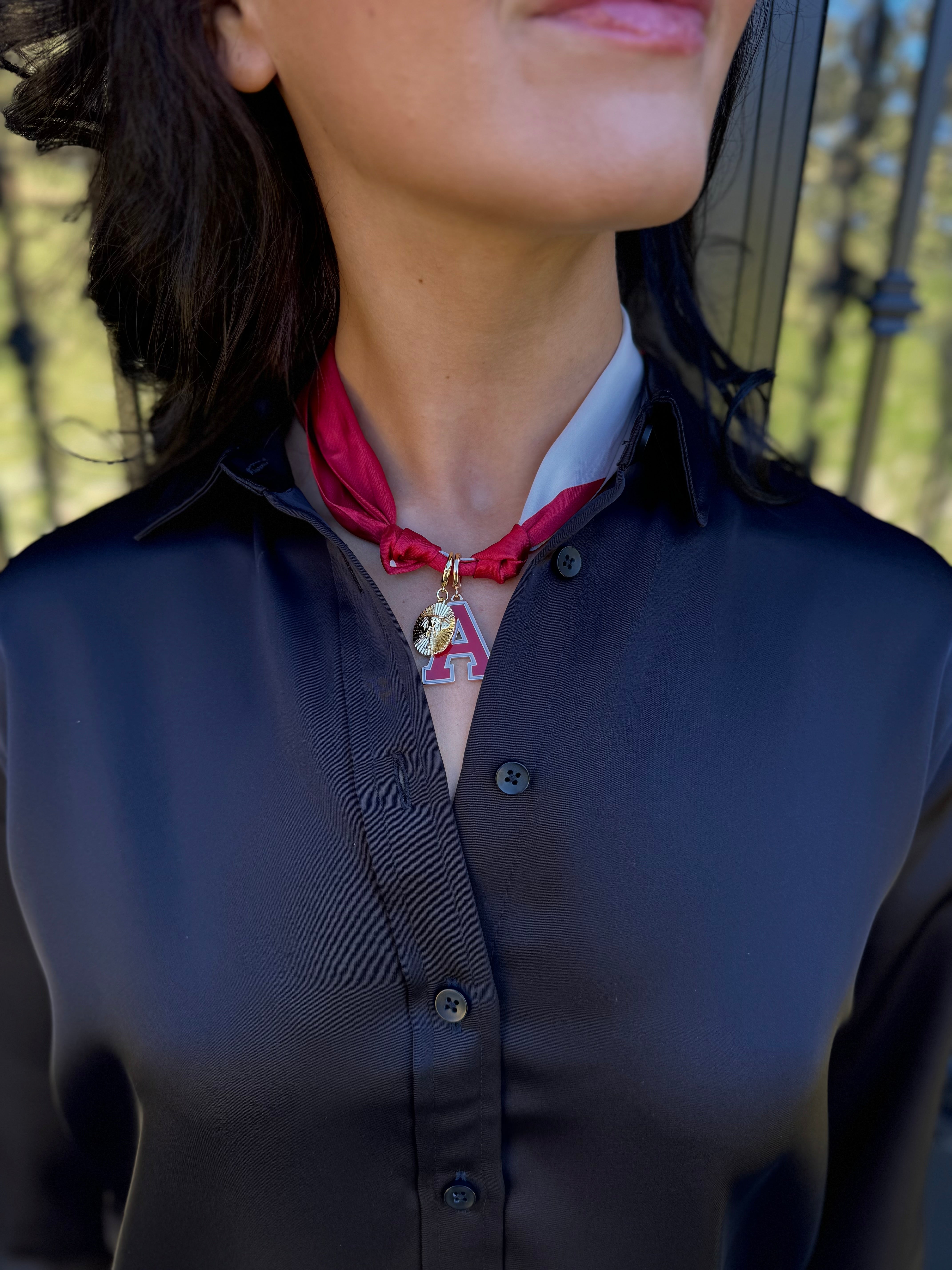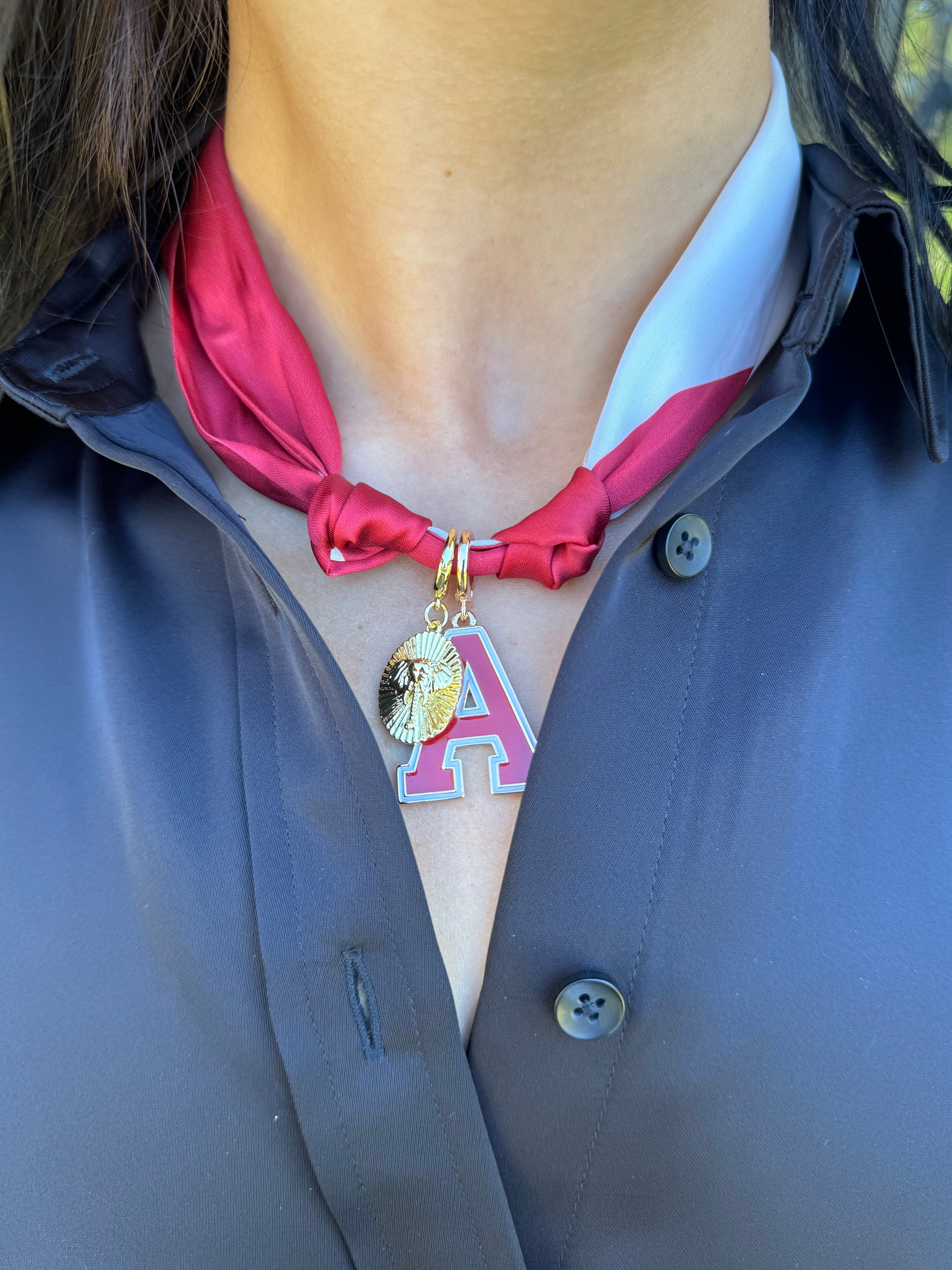 Show your Alabama Crimson Tide pride with this trendy gameday scarf necklace featuring both an Alabama A and an elephant oval pendant. Perfect for fans who want to combine style and team spirit, this accessory adds an energetic touch to any game day outfit. Stand out and cheer your team on with confidence and flair.
