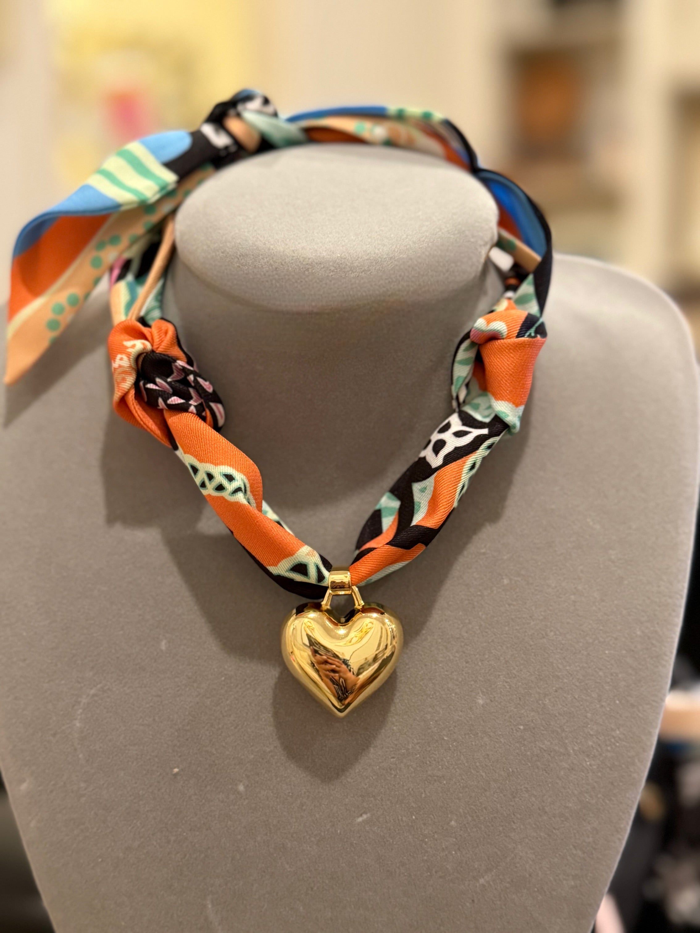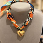 Fall in love with this stylish and versatile Scarf Necklace featuring a vibrant orange and black scarf adorned with a stunning gold chunky heart. Perfect for adding a touch of glamour to any outfit, elevate your look and make a statement with this must-have accessory.