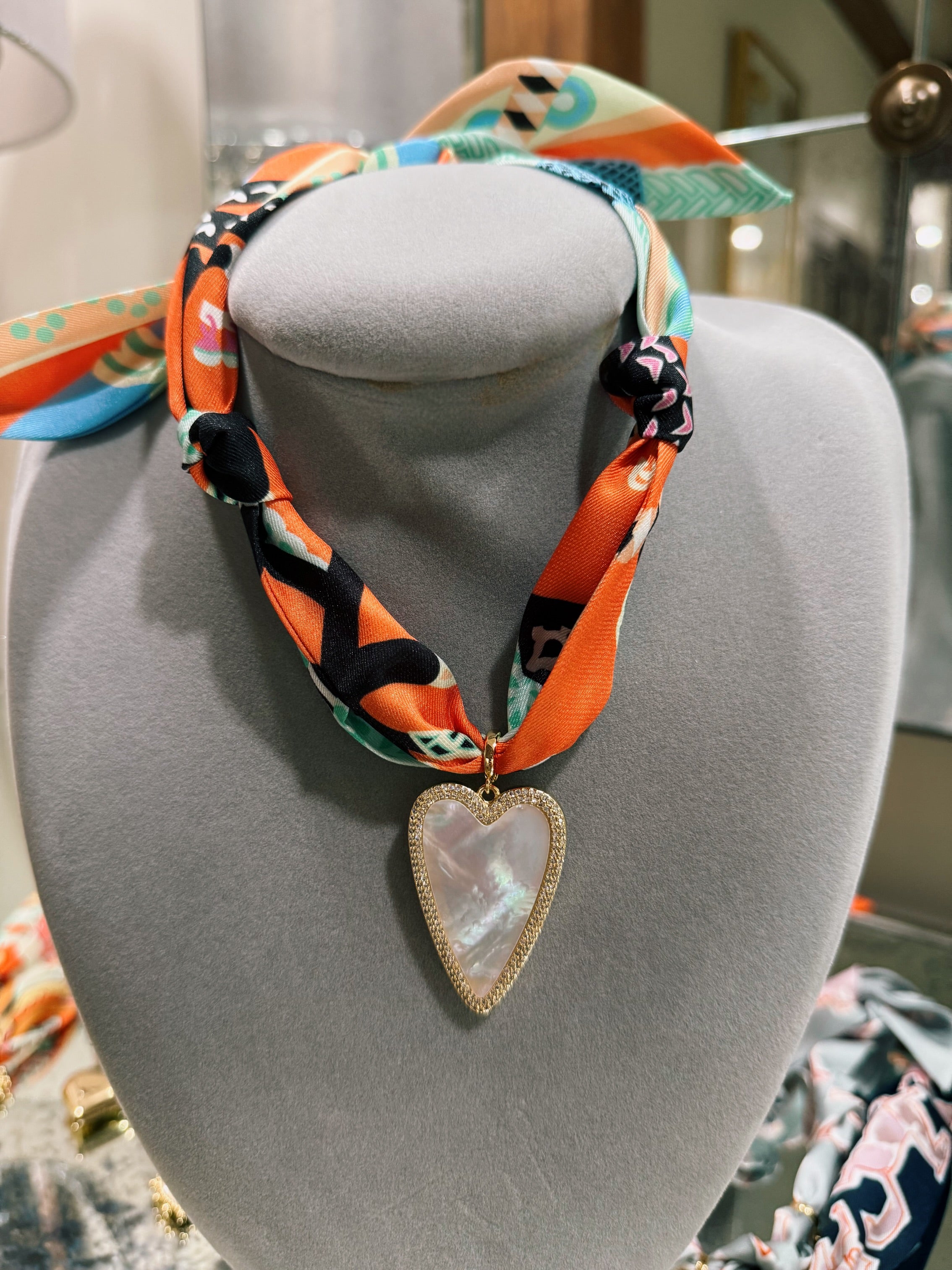 Scarf Necklace with Large Diamond Trimmed Iridescent Heart in Orange