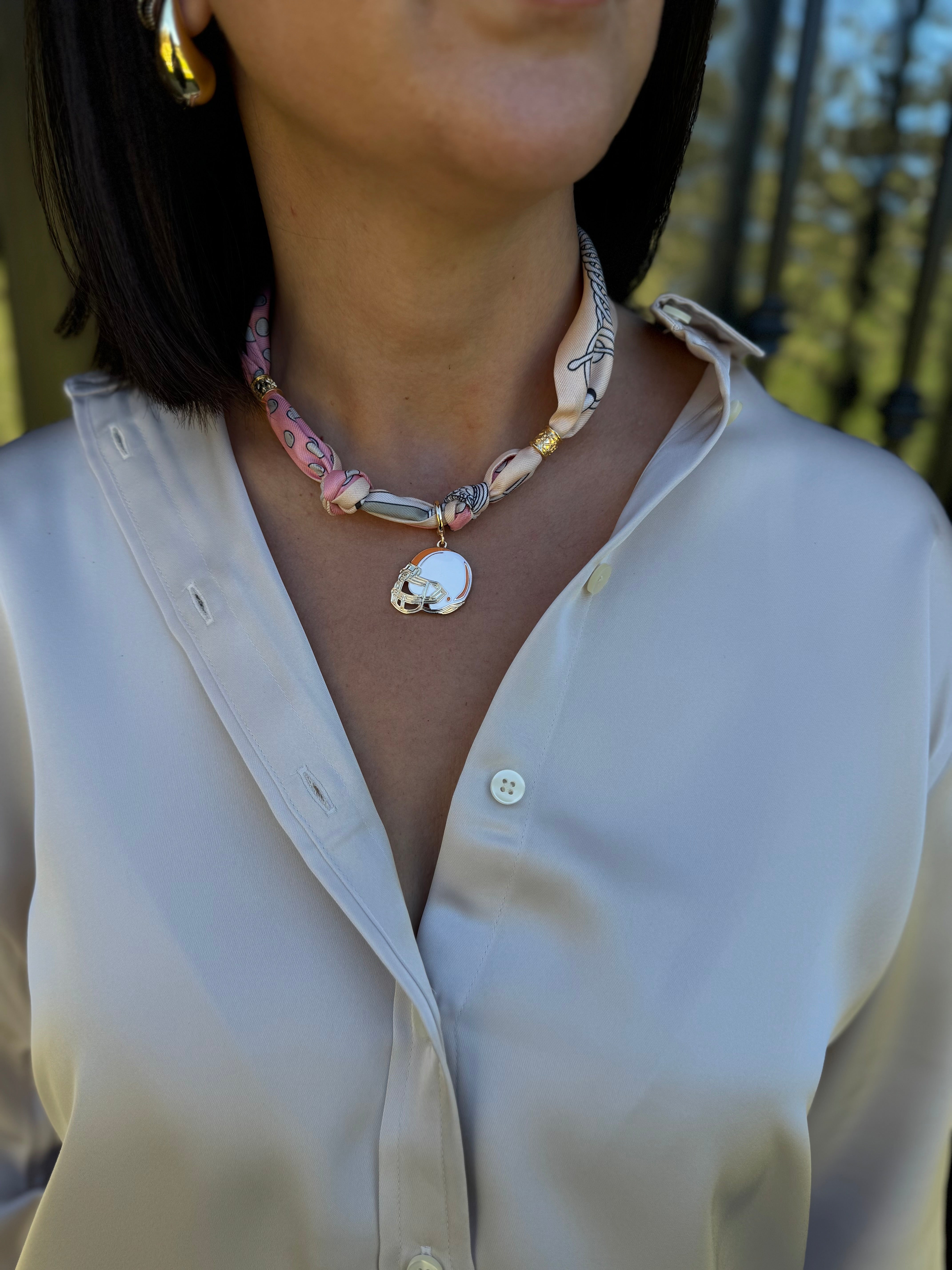Show your unwavering support for your orange team with this vibrant gameday scarf necklace featuring an eye-catching orange helmet pendant. Perfect for standing out in the crowd, it’s a stylish way to cheer on your team and bring game day spirit wherever you go.