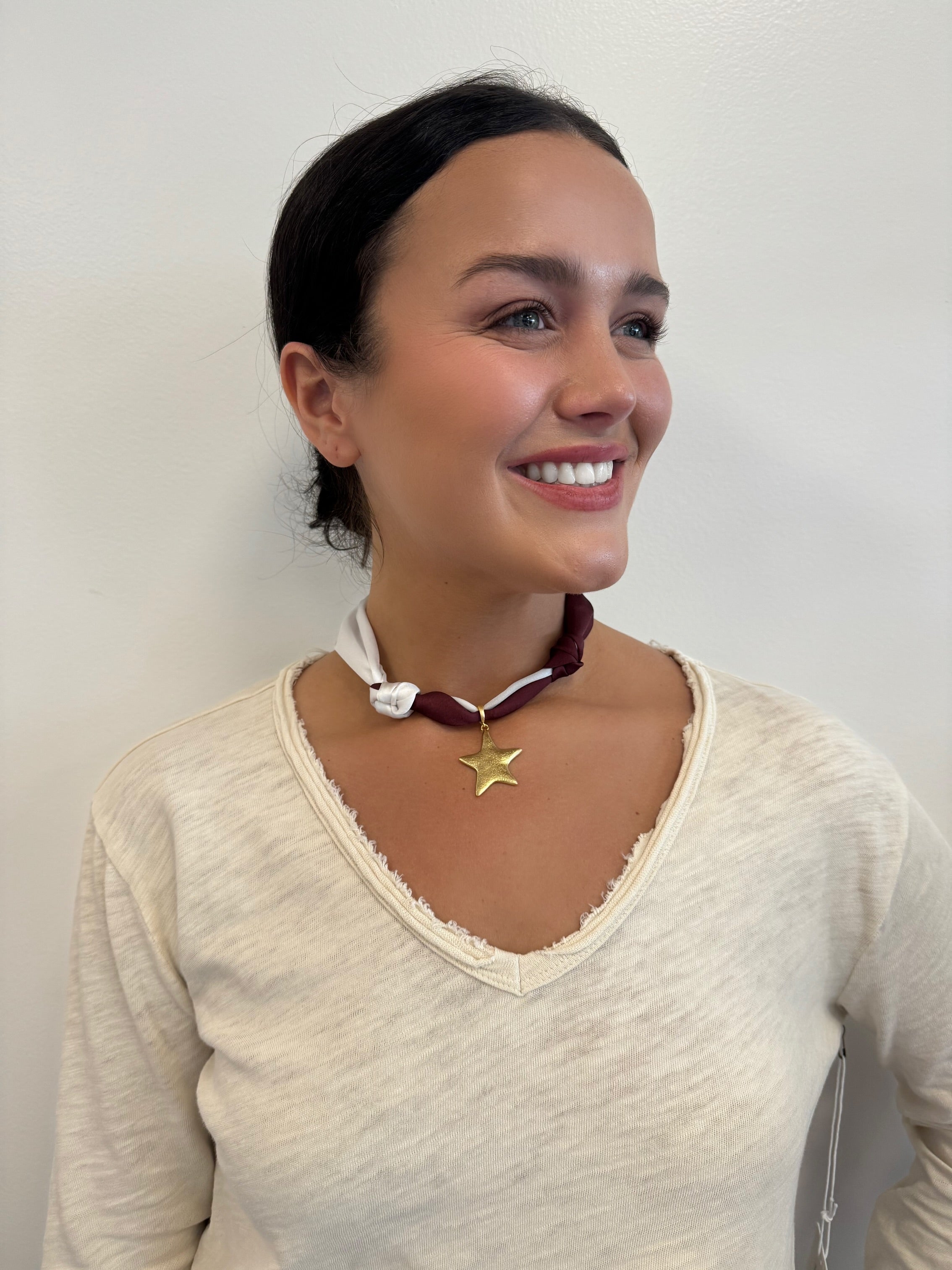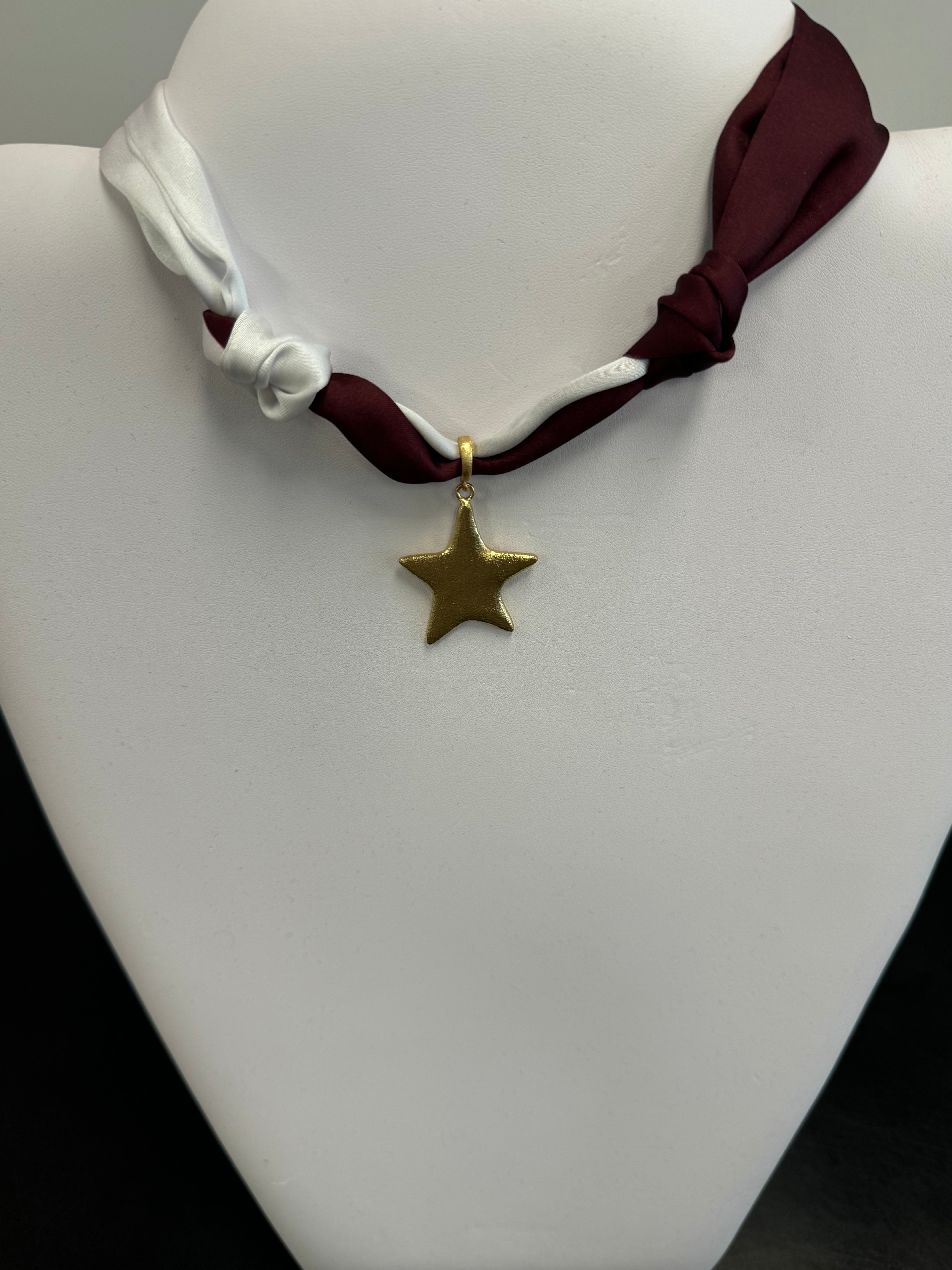 Add a touch of elegance and charm to any outfit with our Scarf Necklace featuring a delicate star charm. Made from soft, high-quality fabric, this multi-purpose scarf can be worn in different styles to suit any occasion. Upgrade your wardrobe with this must-have fashion accessory.