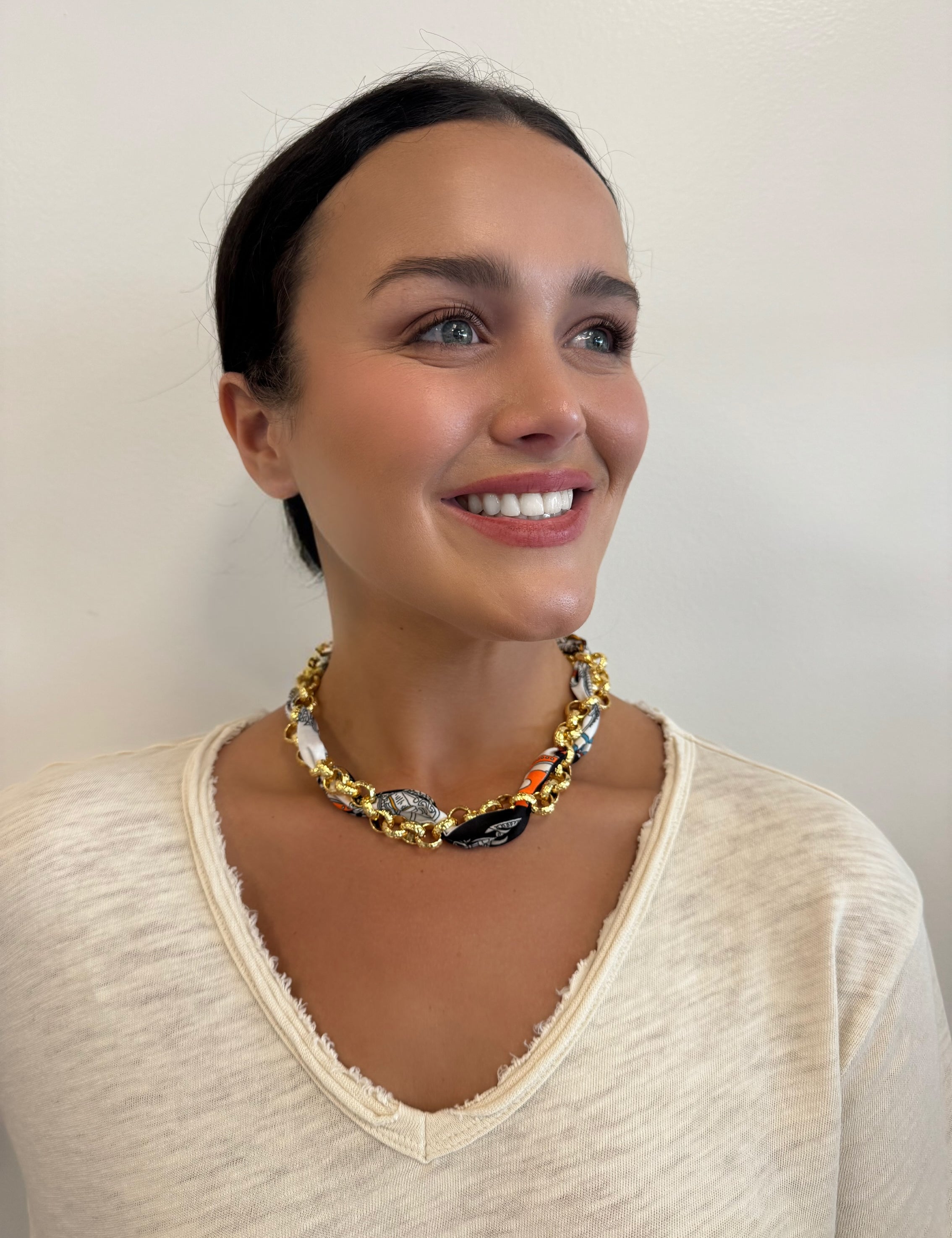 Scarf Necklace with Intertwined Gold chain in Cream