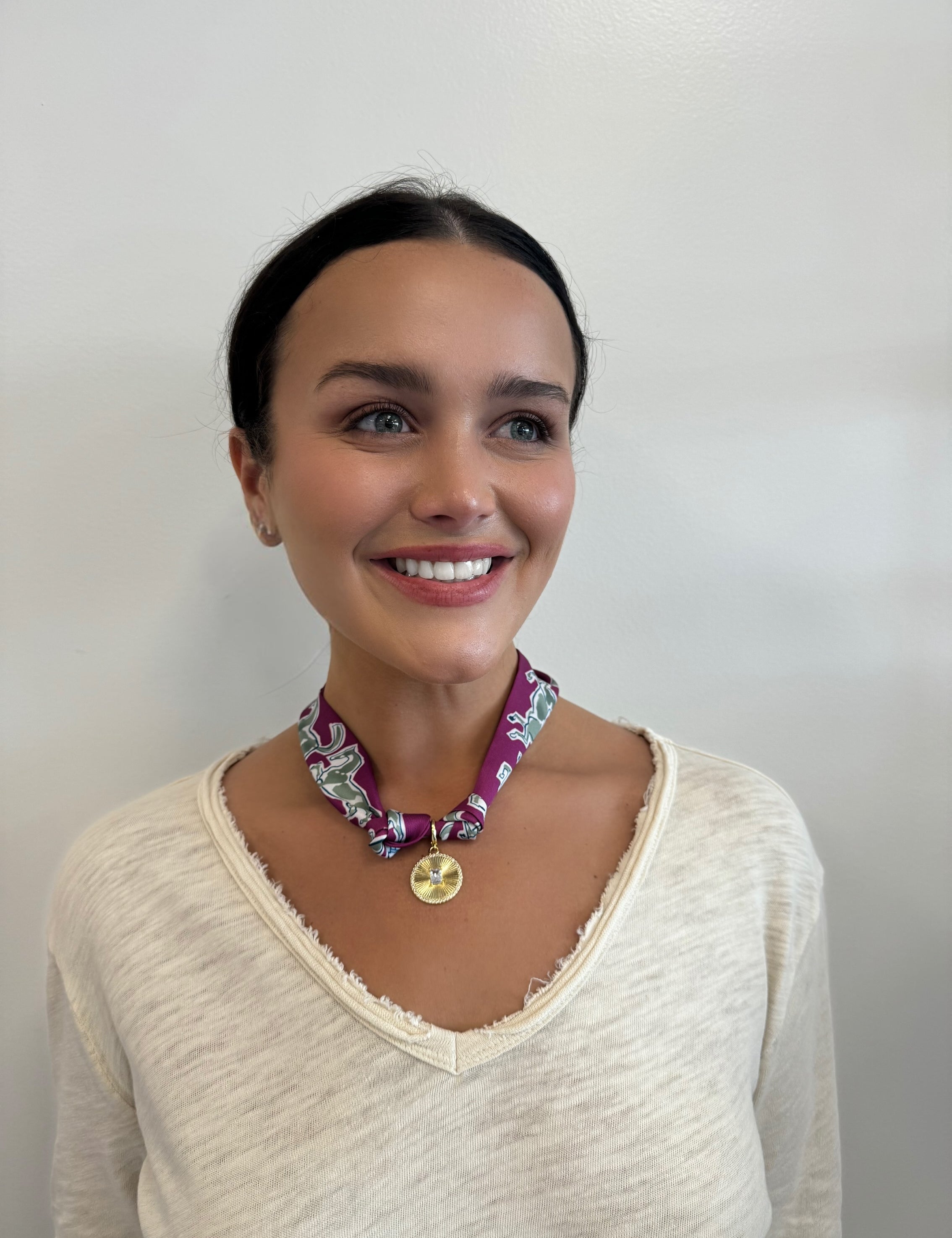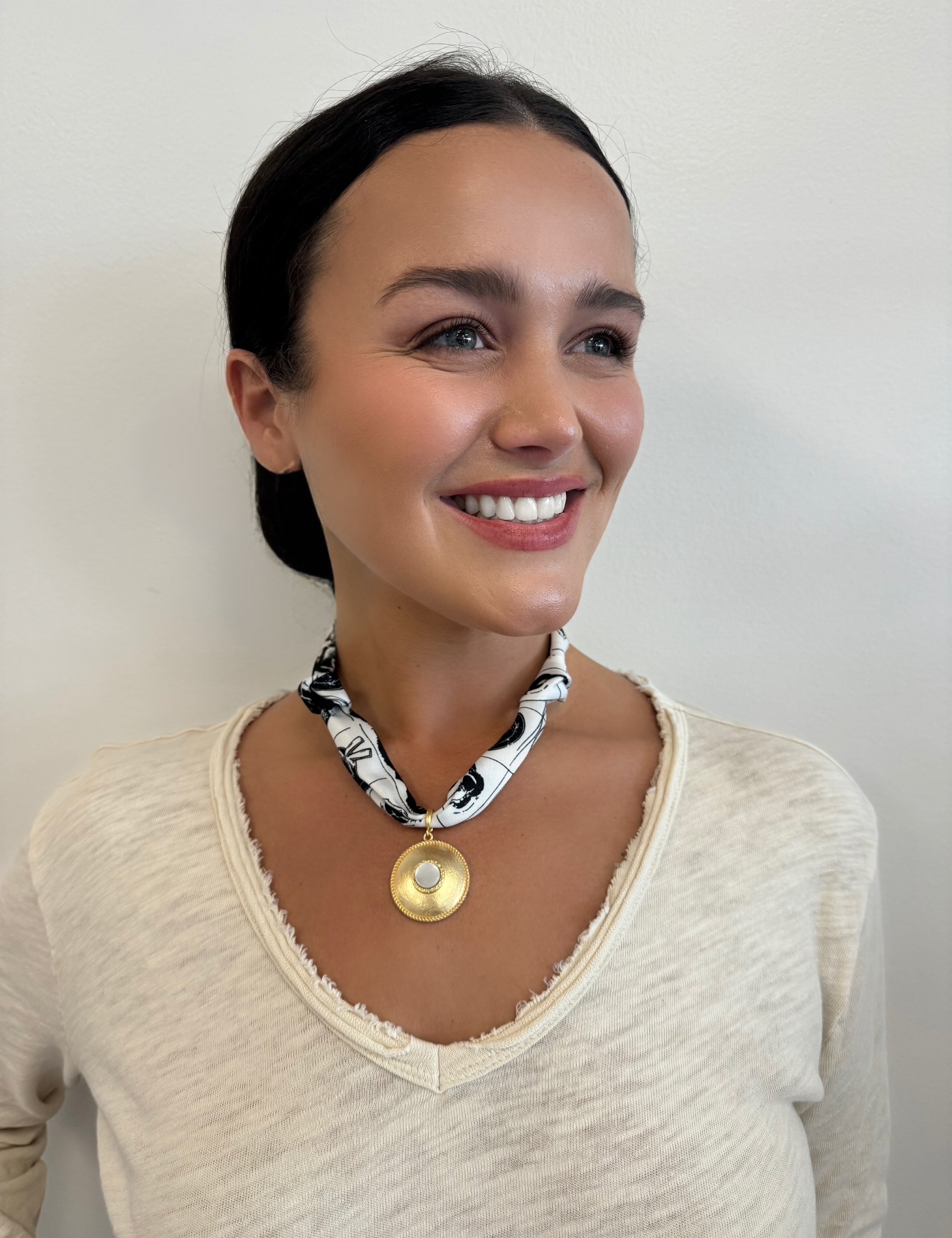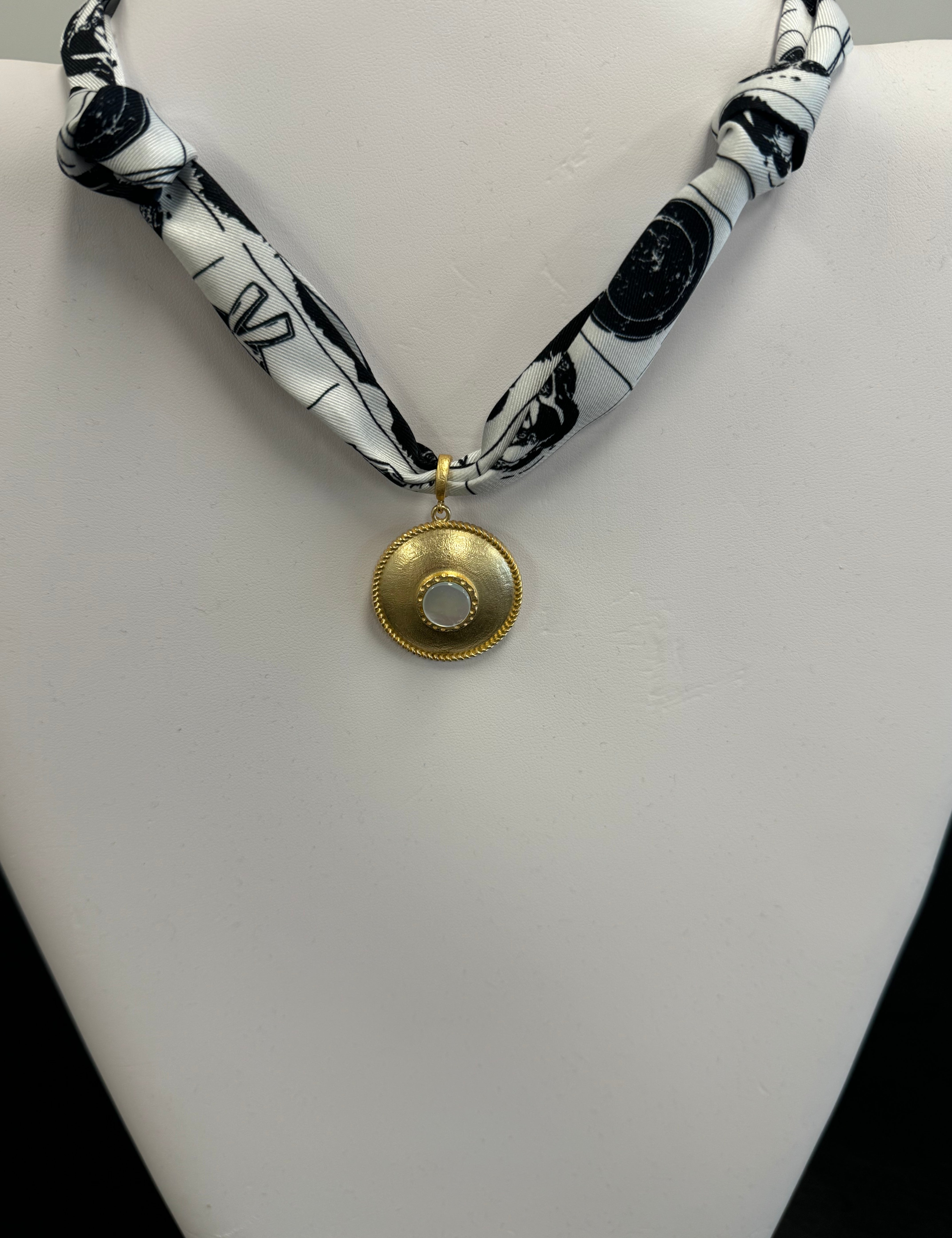 Scarf Necklace with round pendant and white stone inside
