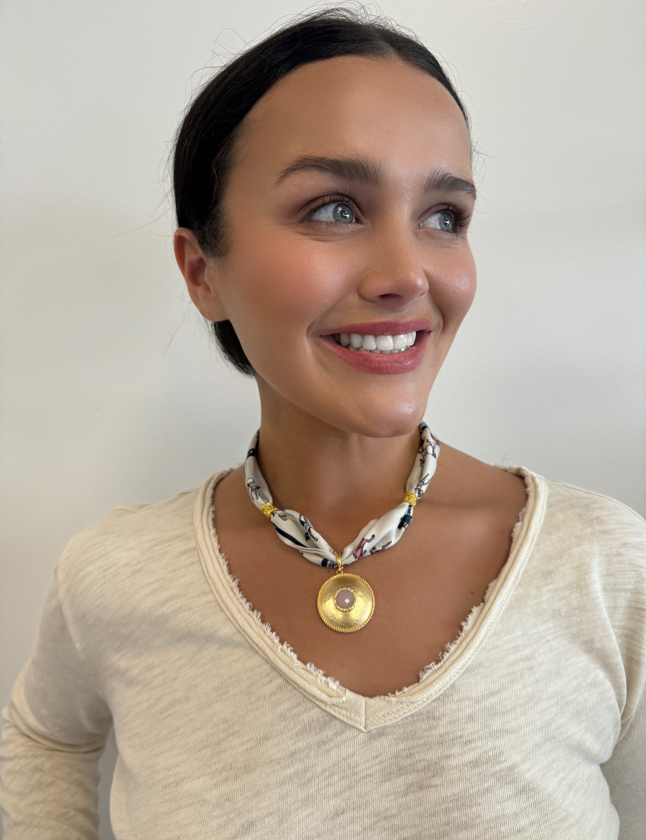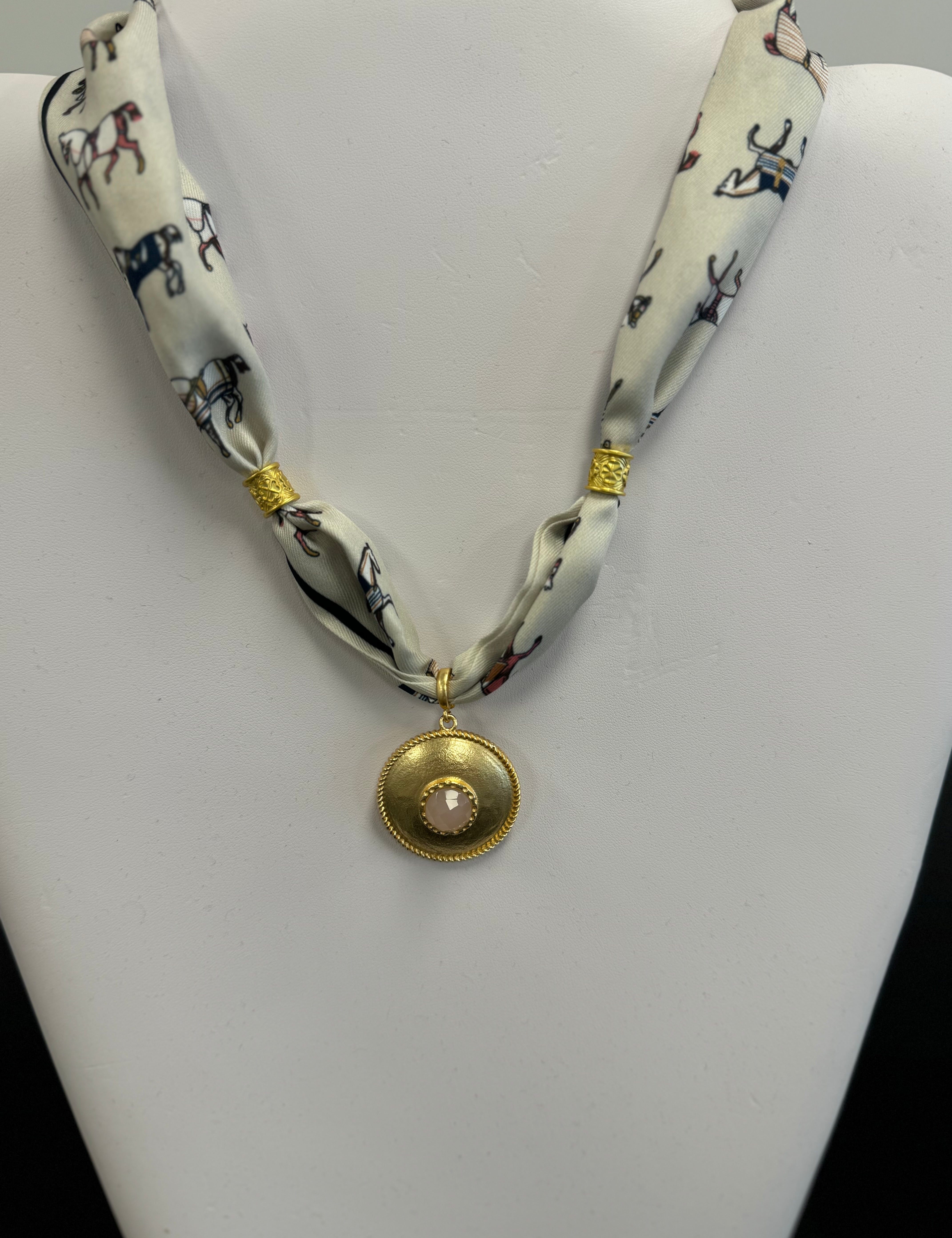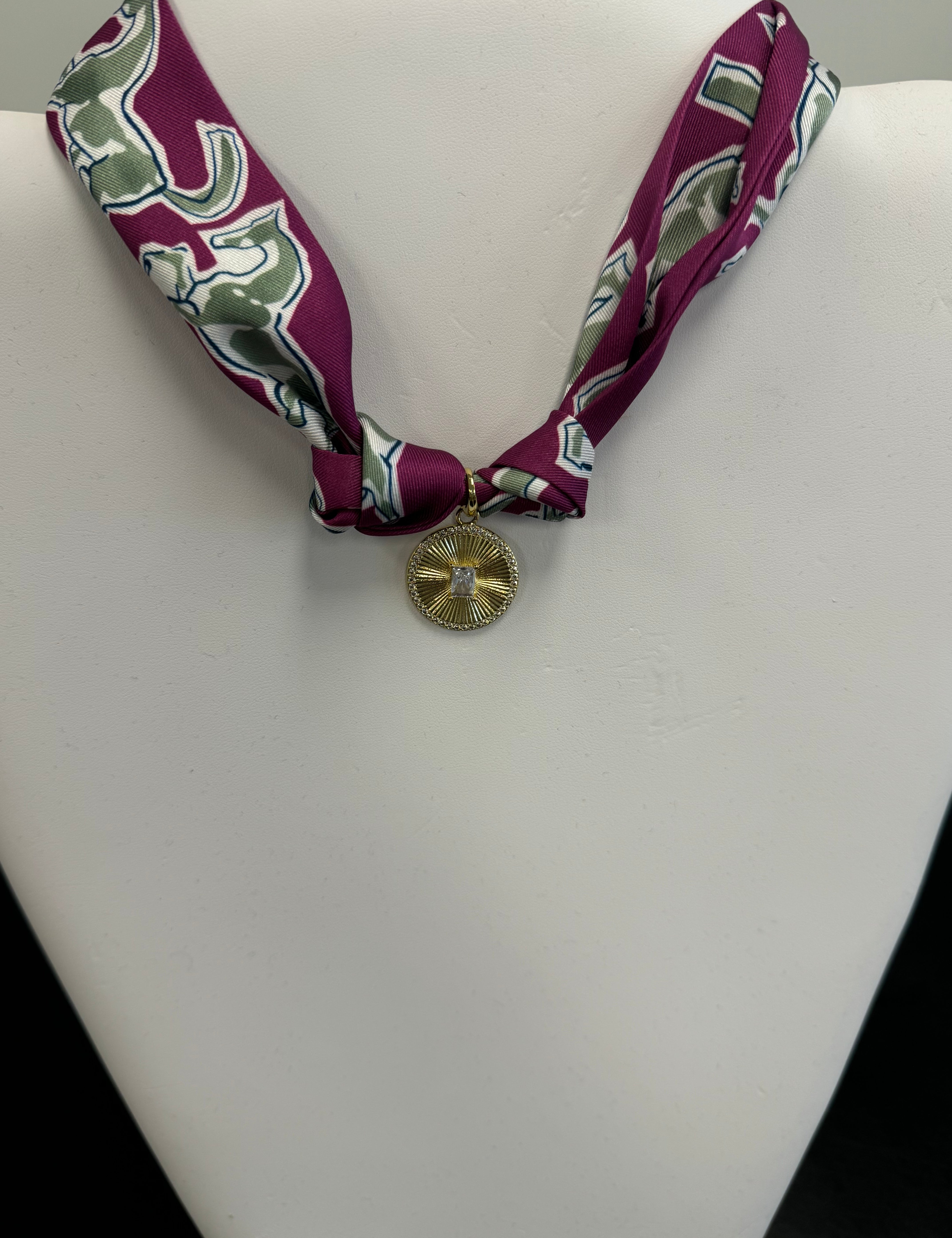 Scarf Necklace with Round Pendant and Pink Stone