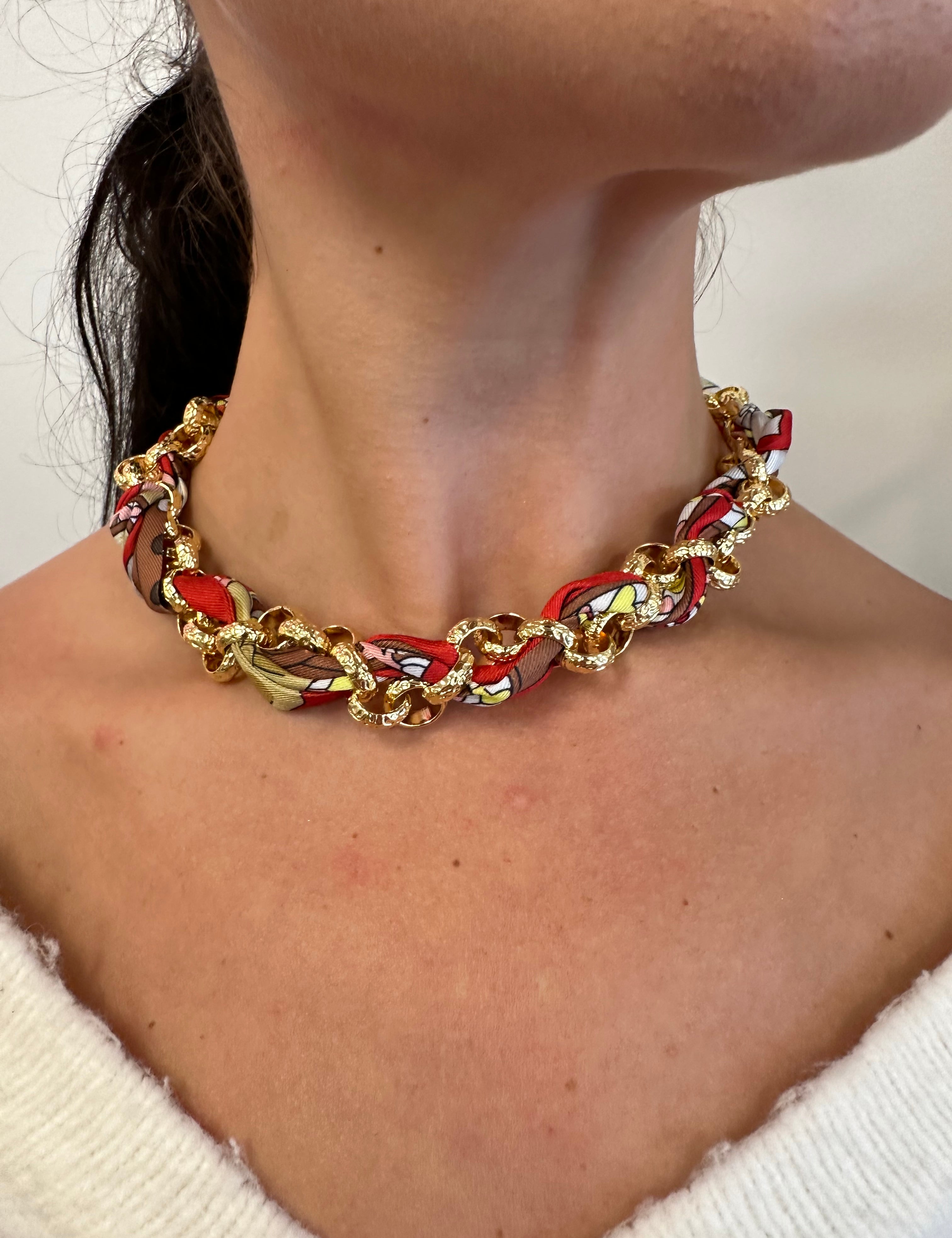 Scarf Necklace with Intertwined Gold chain in Red