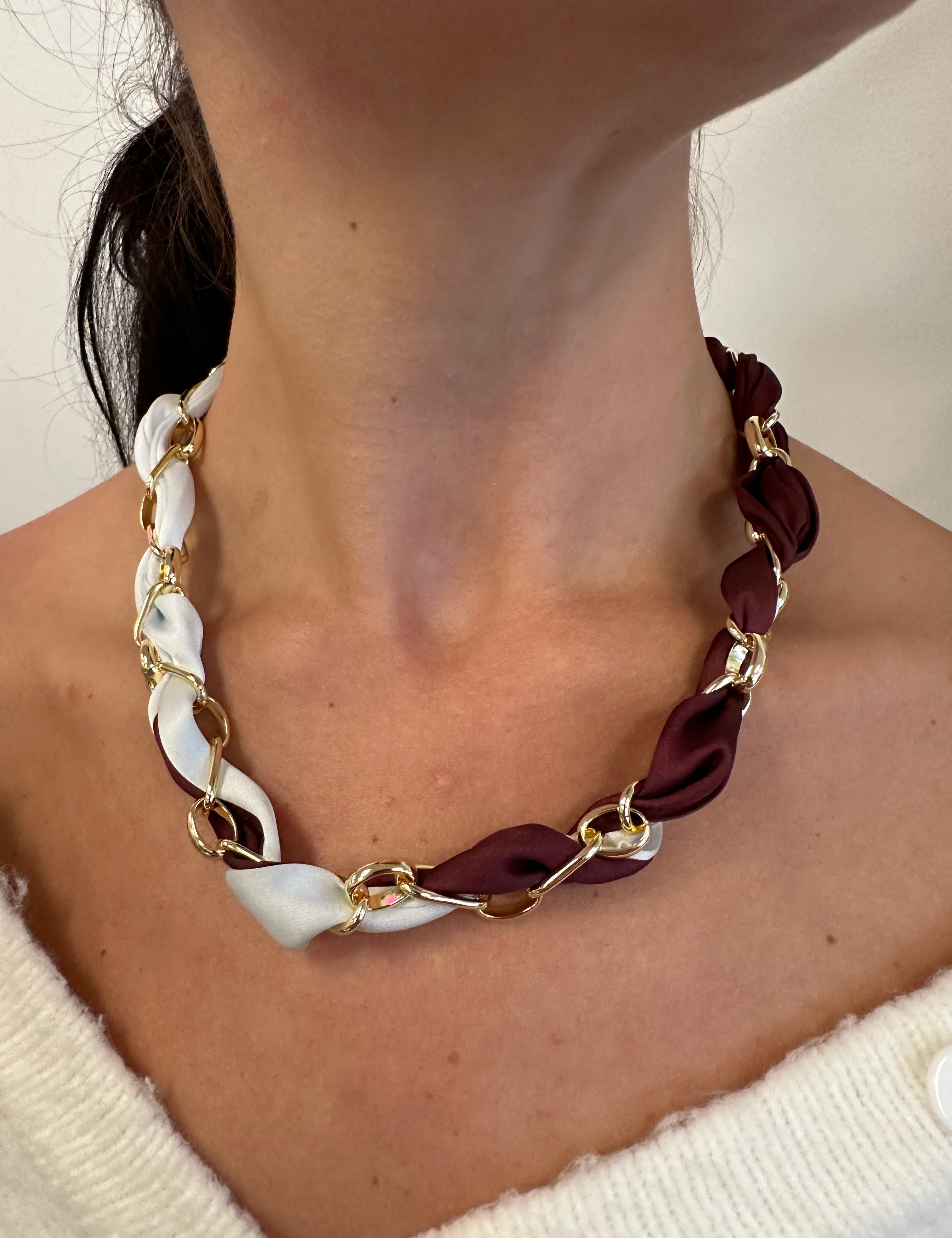 Scarf Necklace with Intertwined Paperclip Chain in Maroon