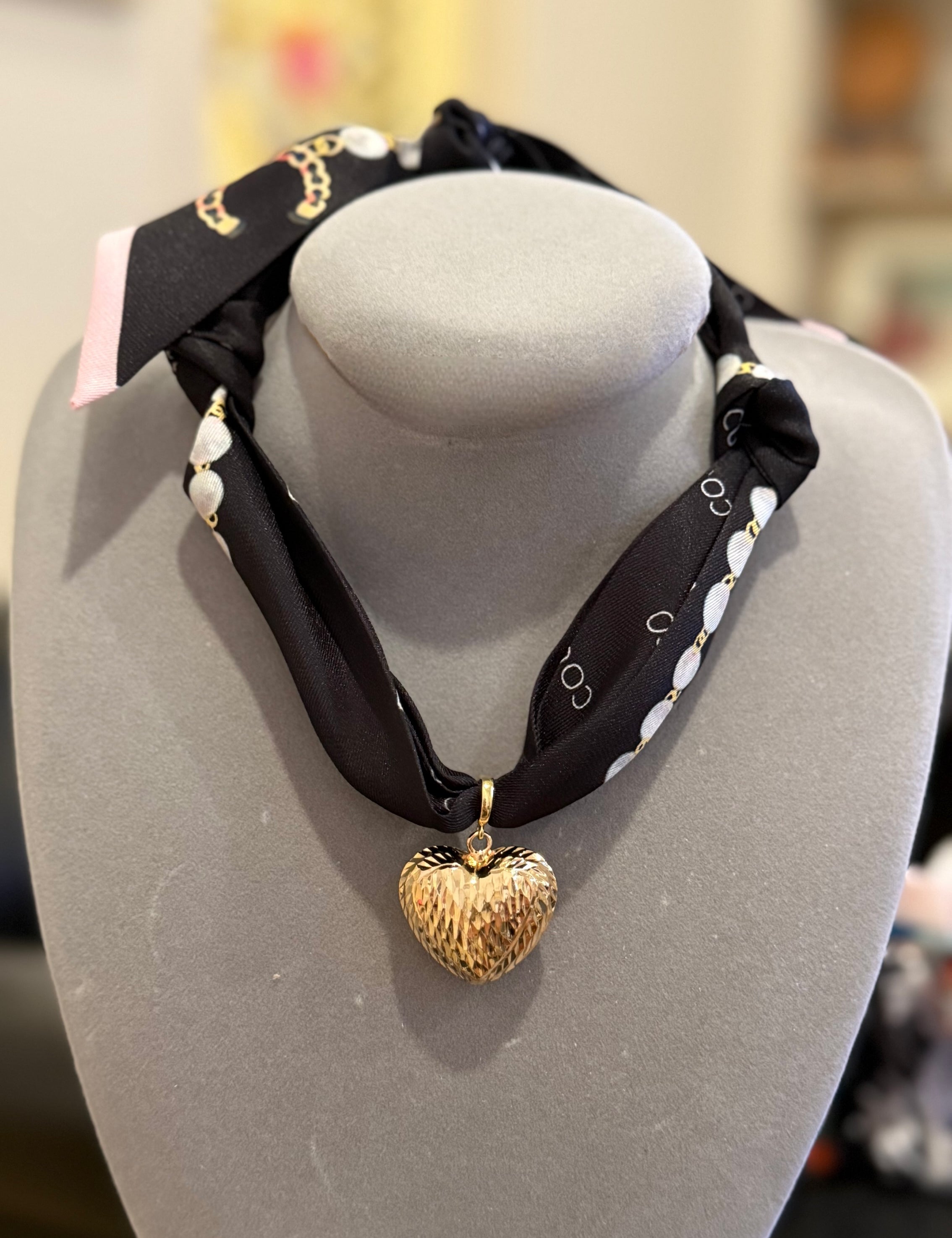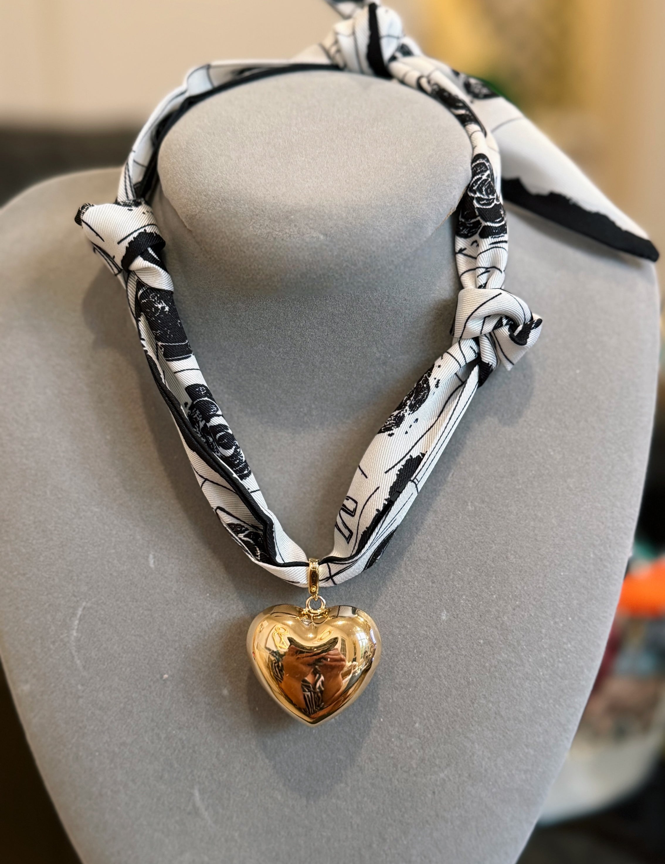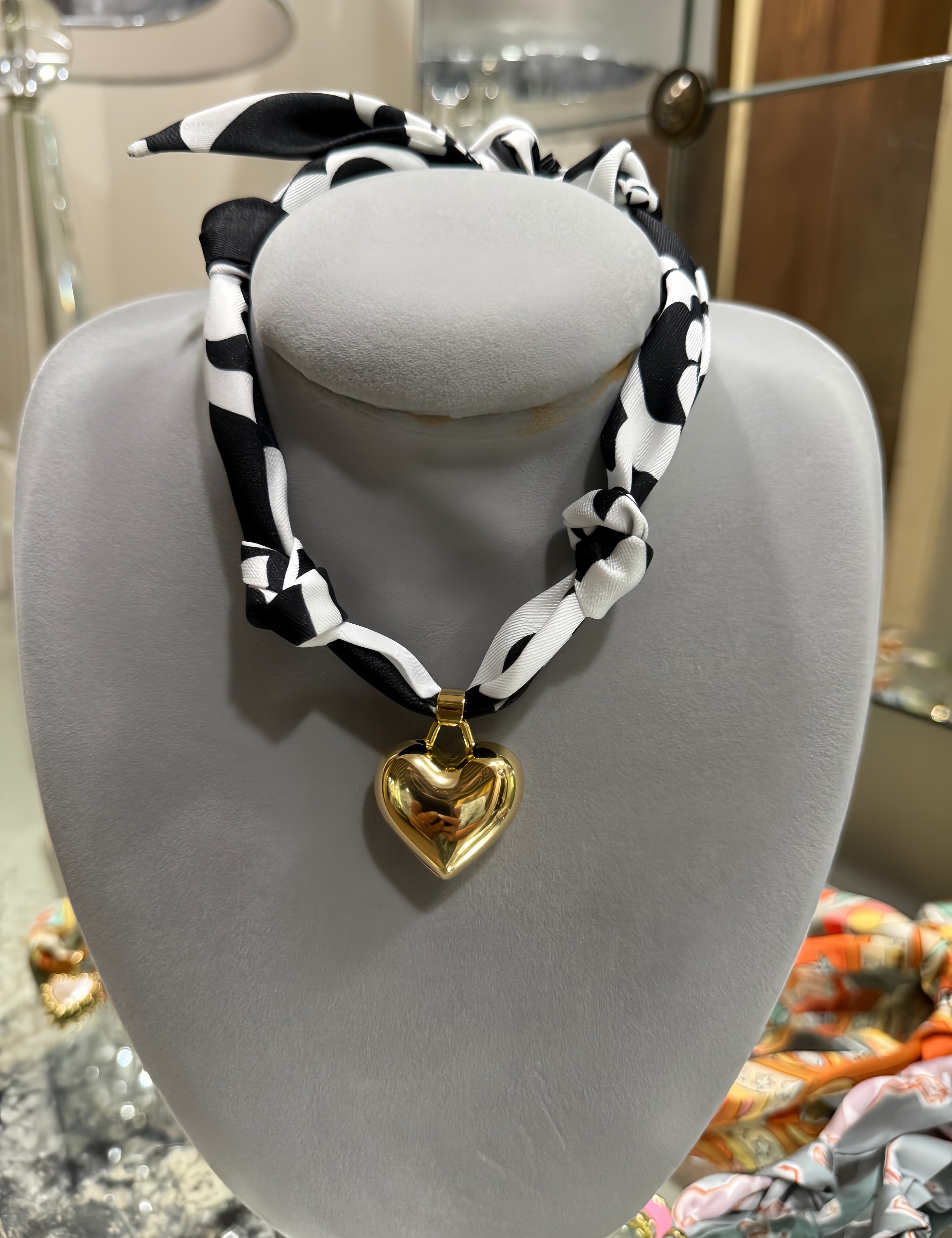 Scarf Necklace with Gold Bubble Heart Charm in Black and White