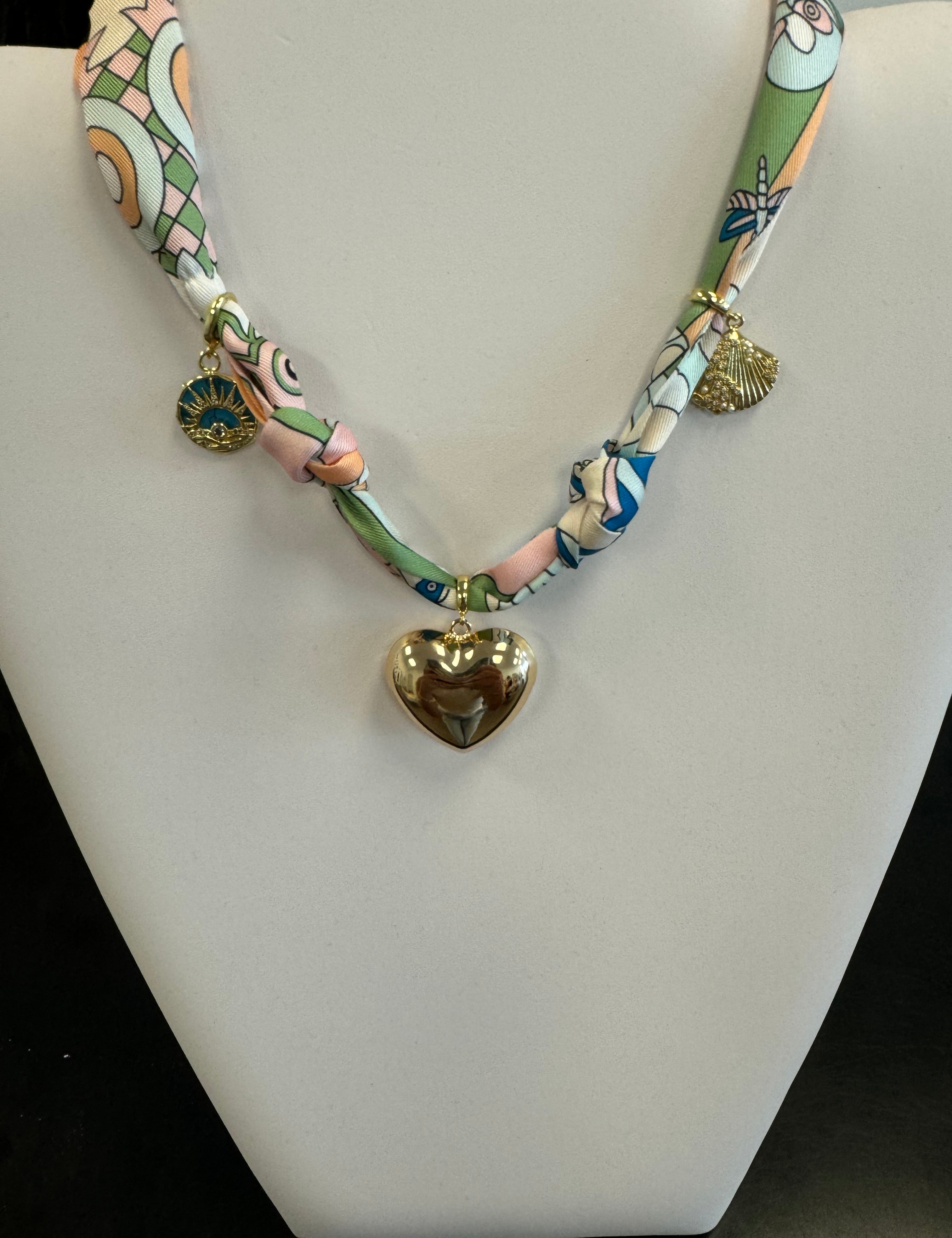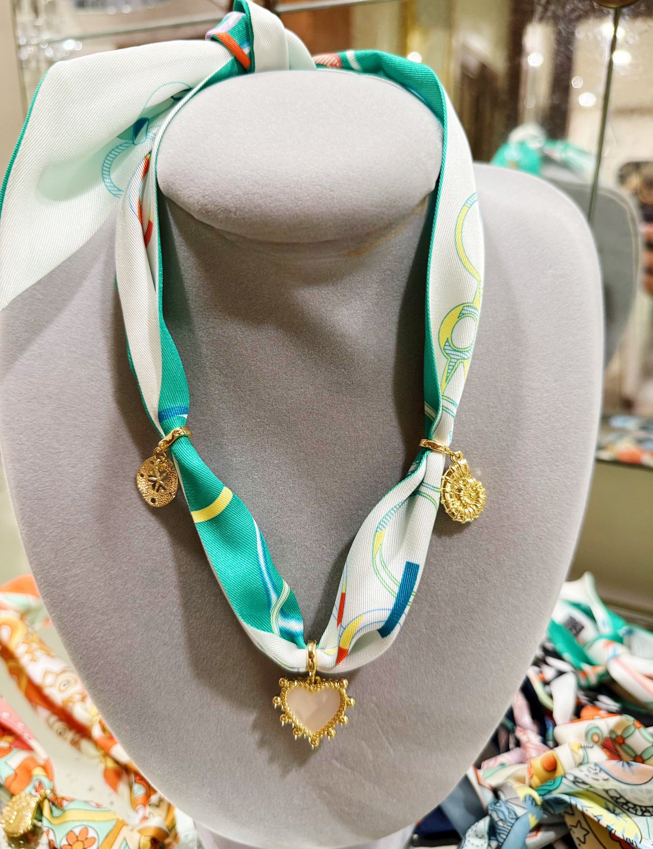 Scarf Necklace with Blue Sunset, Gold Heart, and Seashell charms