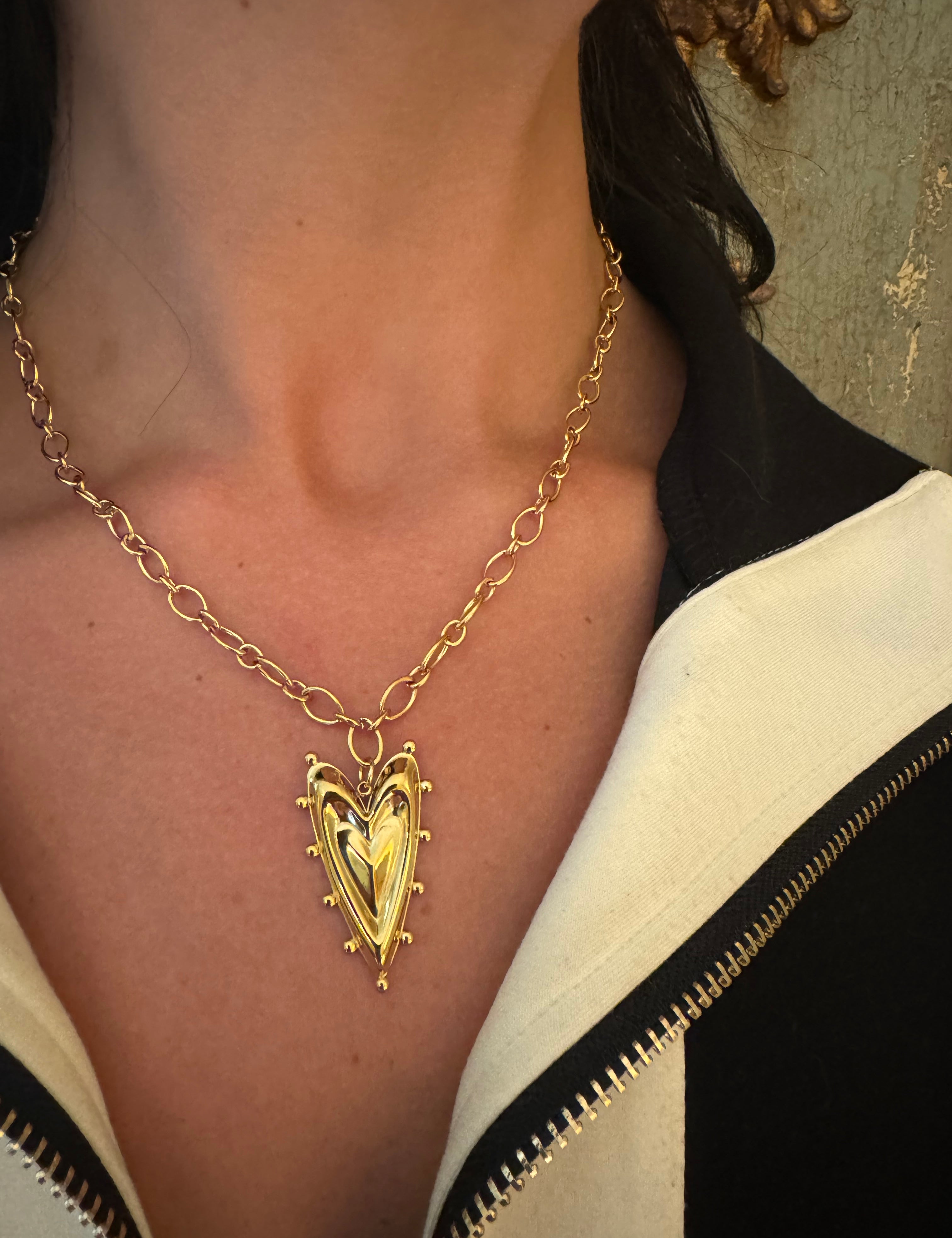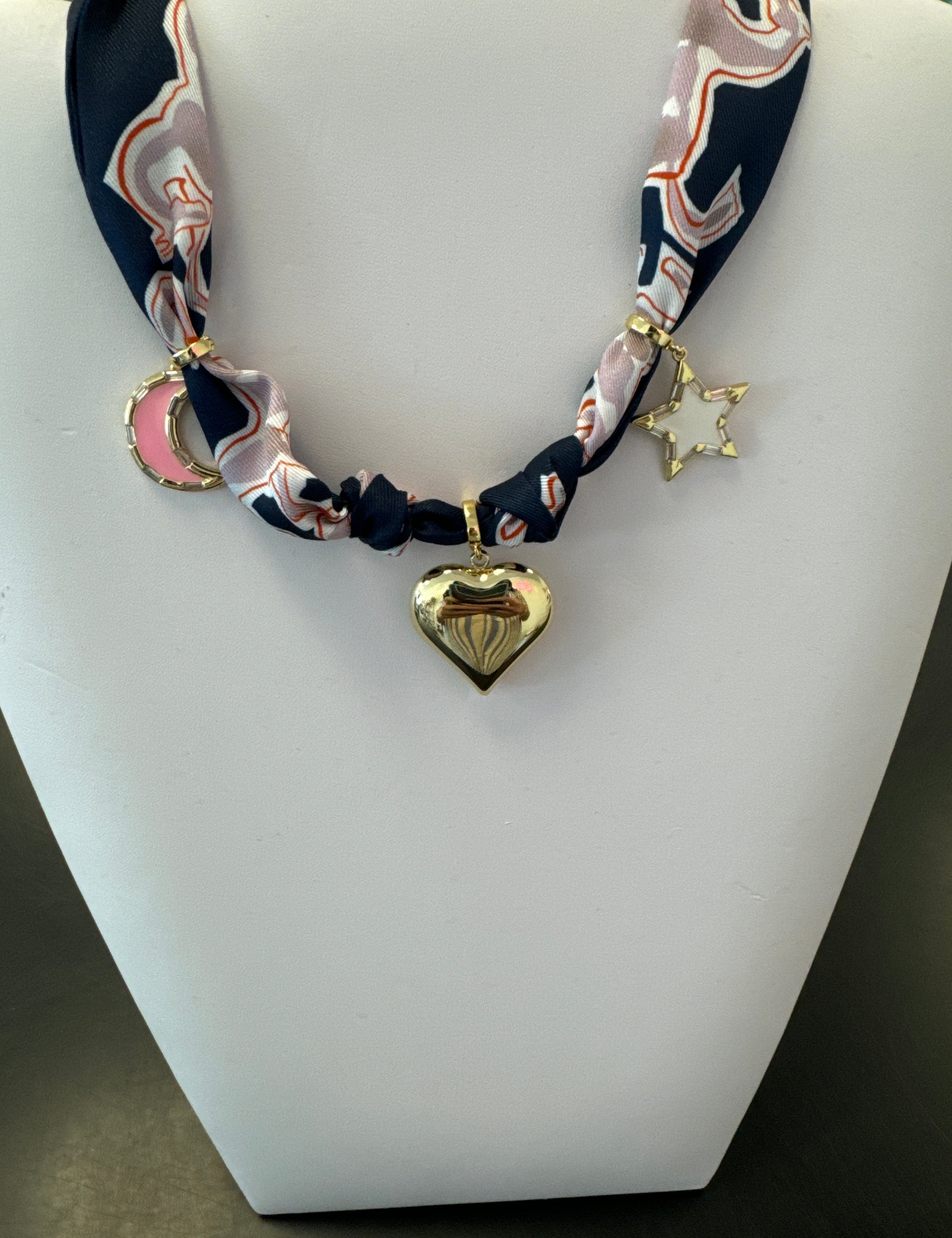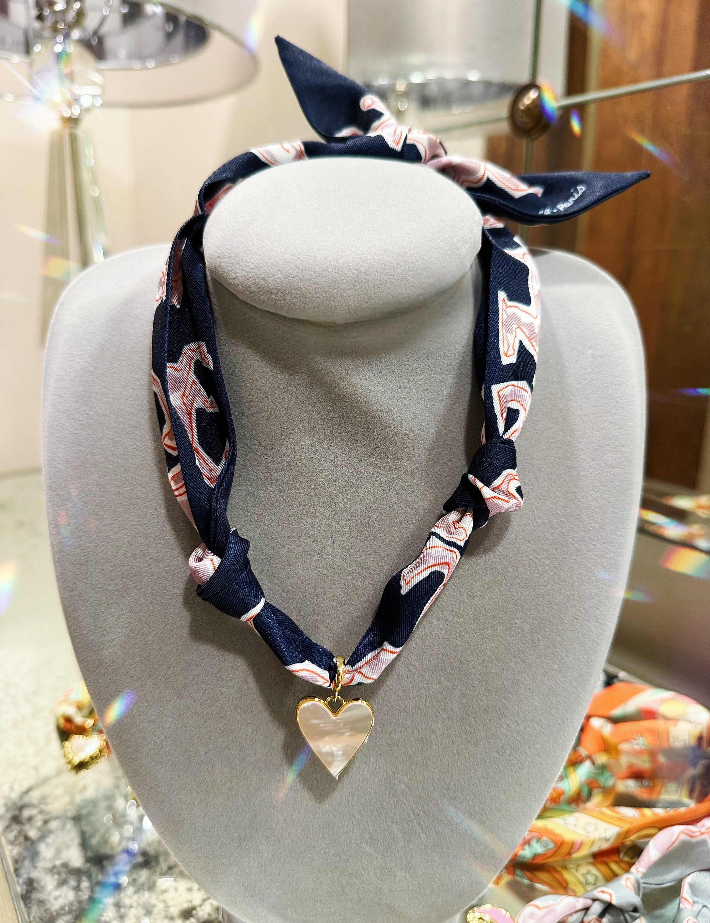 Scarf Necklace with Gold Iridescent Heart Charm in Navy