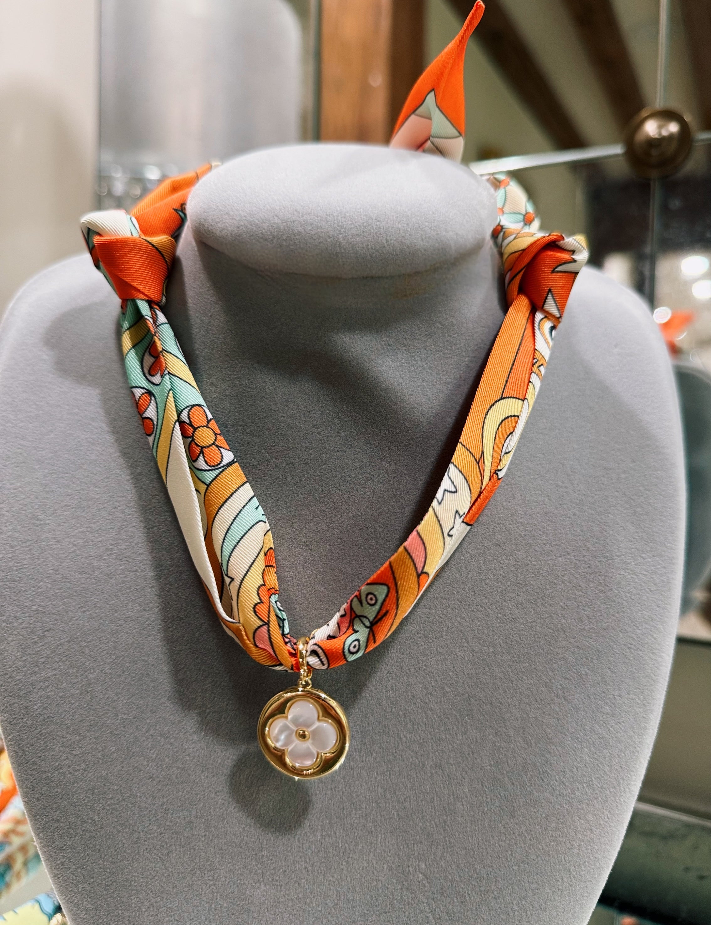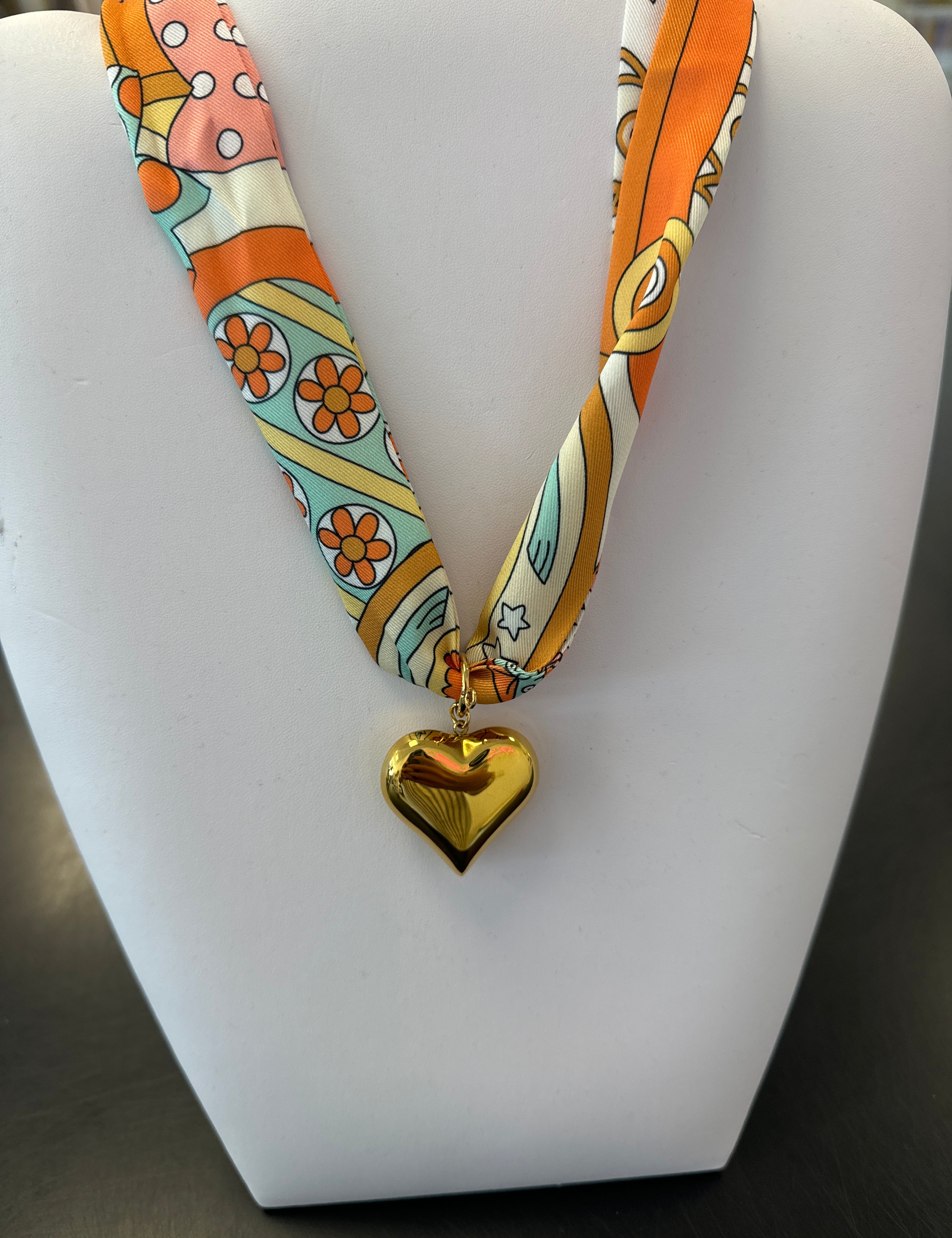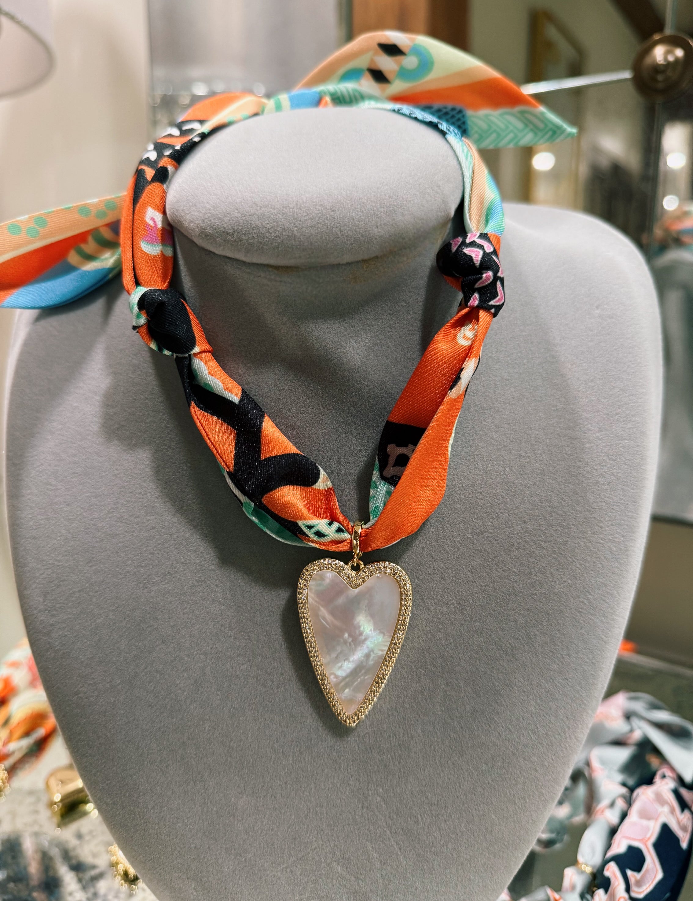 Scarf Necklace with Large Diamond Trimmed Iridescent Heart in Orange