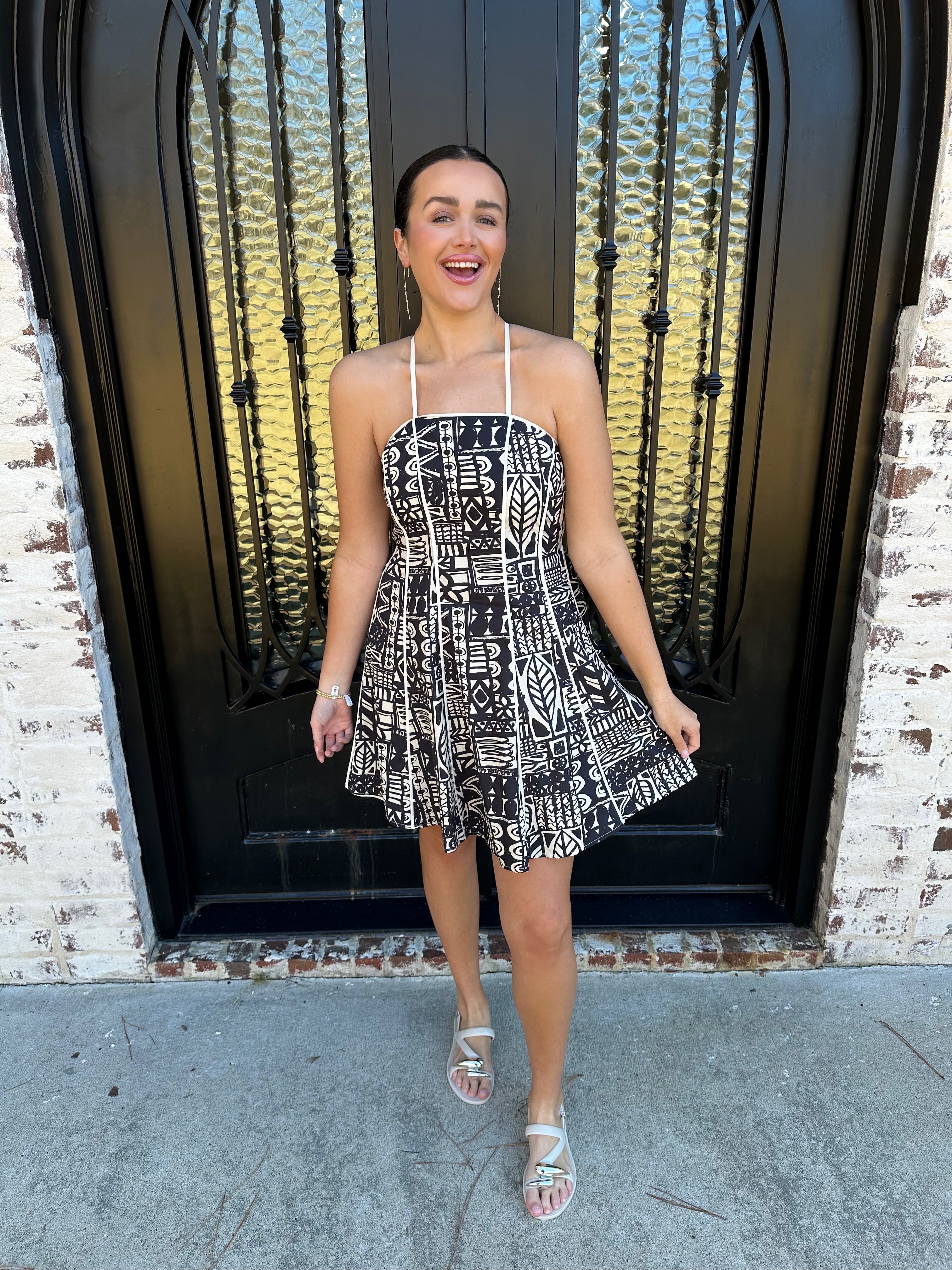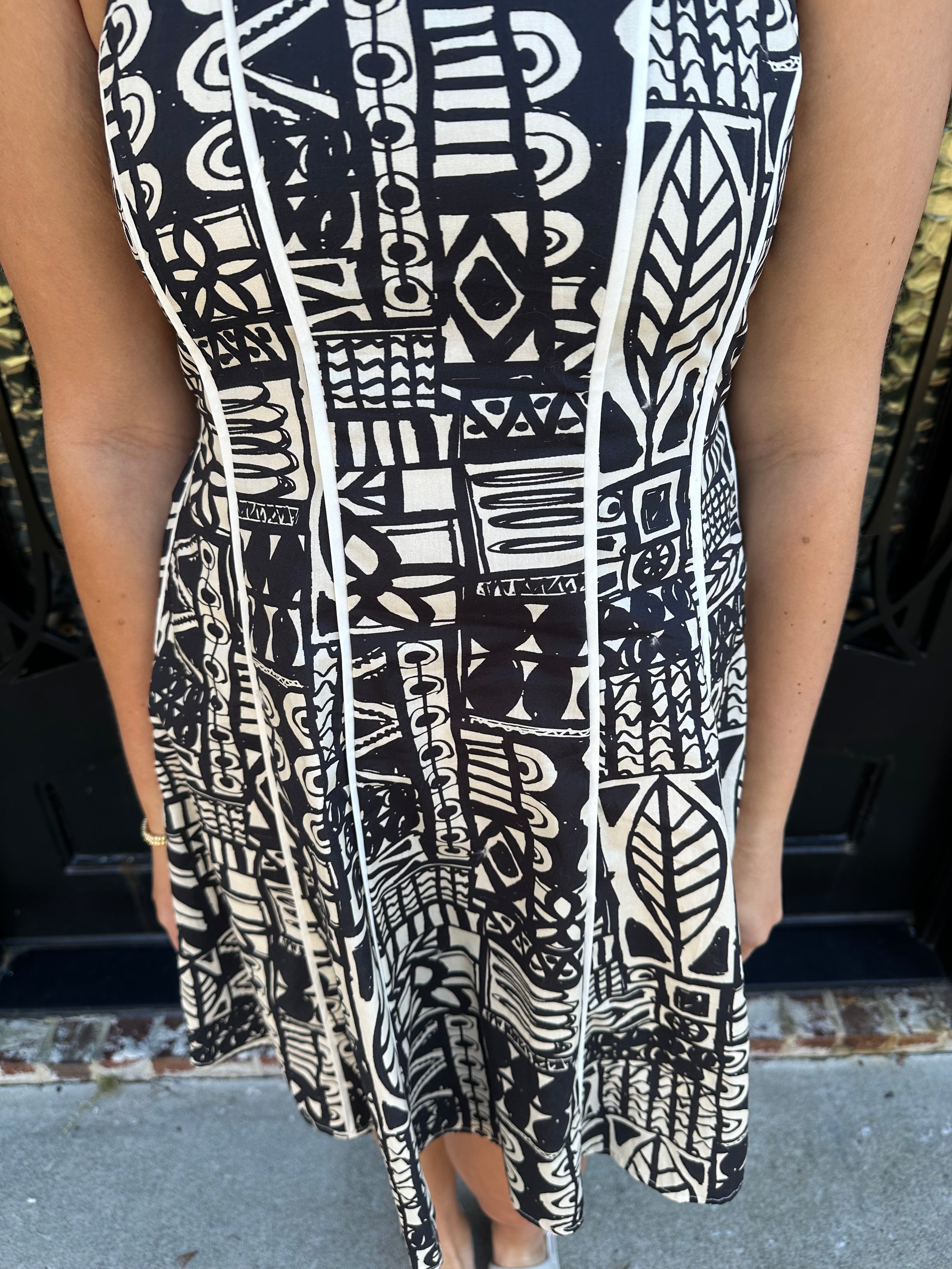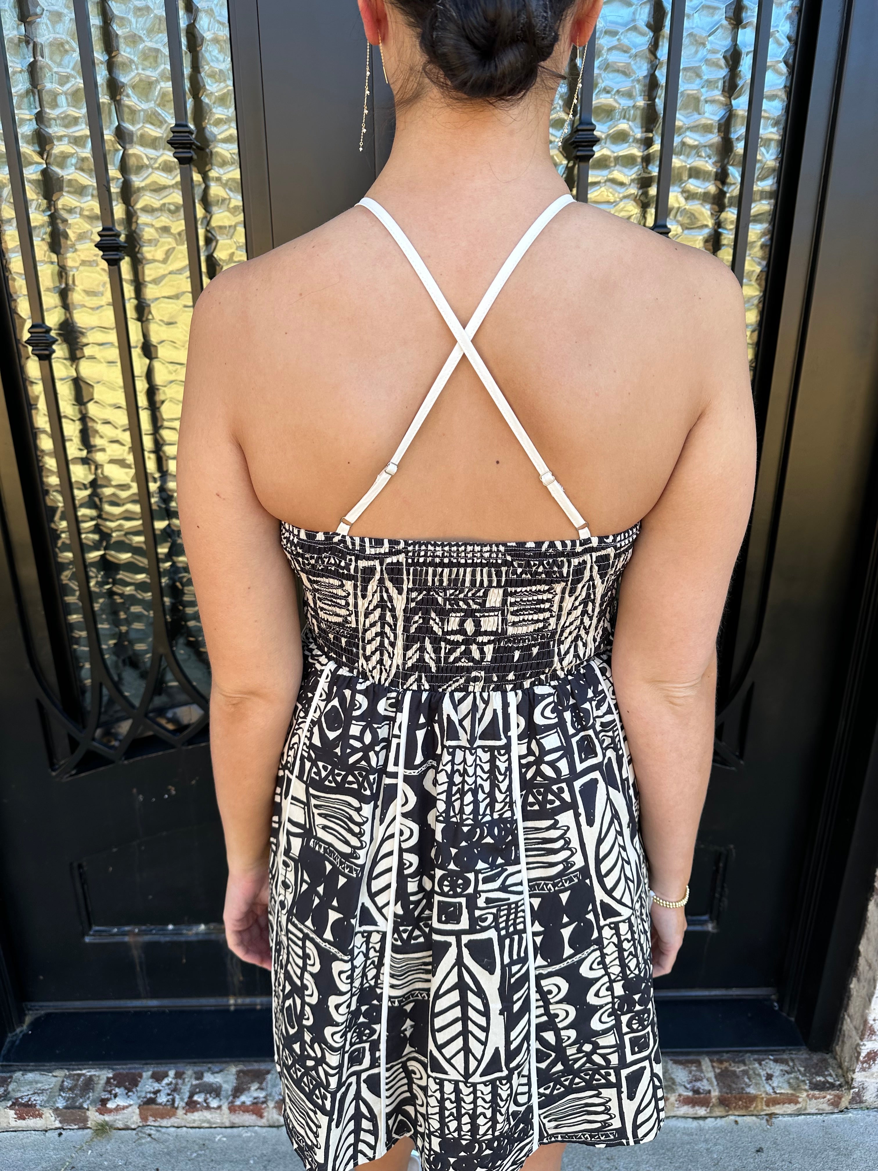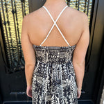Turn heads this season with Nysa's Dress in Ink, a striking spring and summer essential featuring an intricate Aztec geometric pattern in timeless black and cream. Adjustable straps let you dial in the perfect fit, while the elastic back provides all-day comfort and a graceful silhouette. Whether you're heading to a garden party or casual weekend gathering, this one-of-a-kind design commands attention without trying too hard. Invest in a piece that celebrates bold individuality and effortless style.
