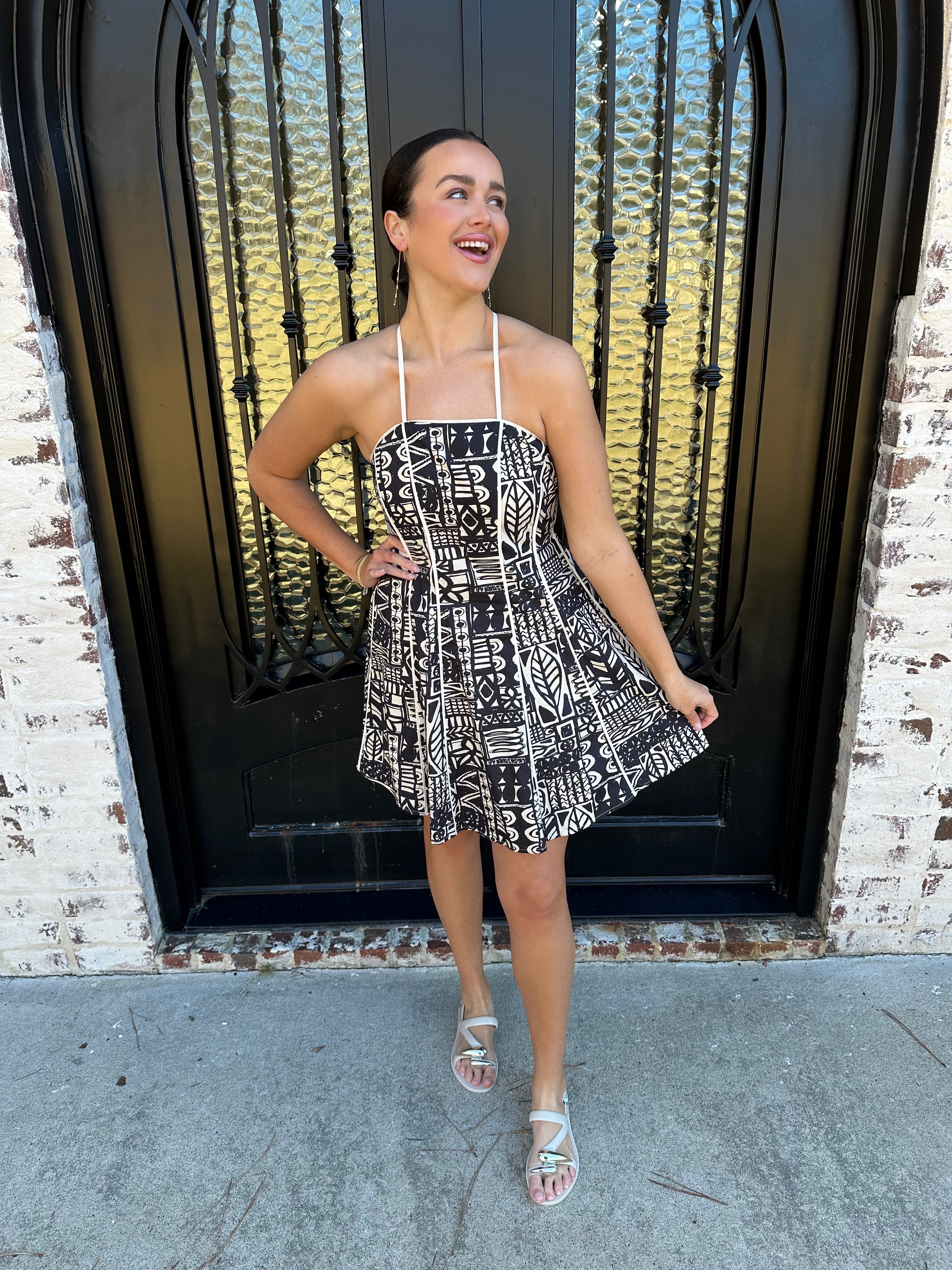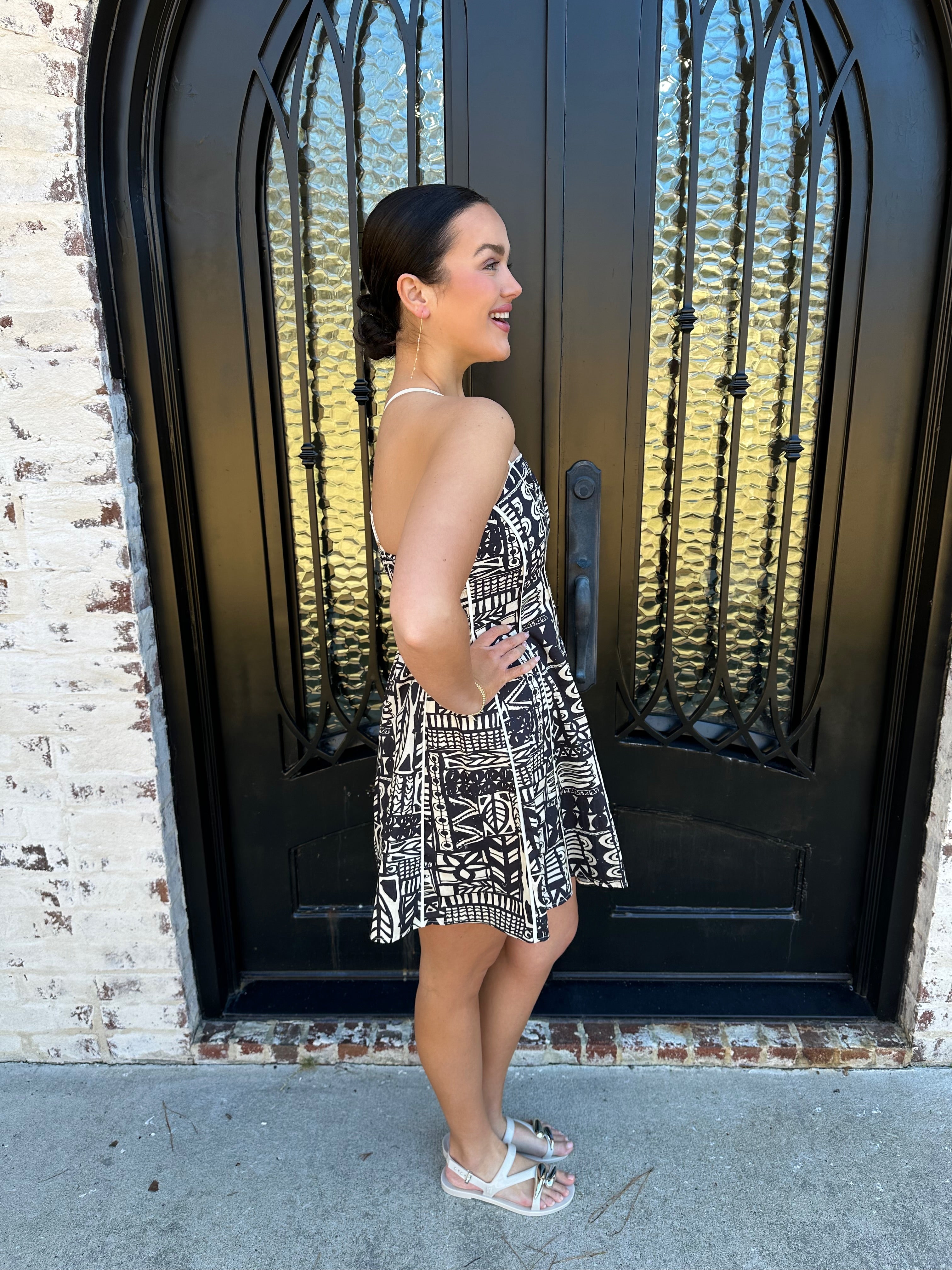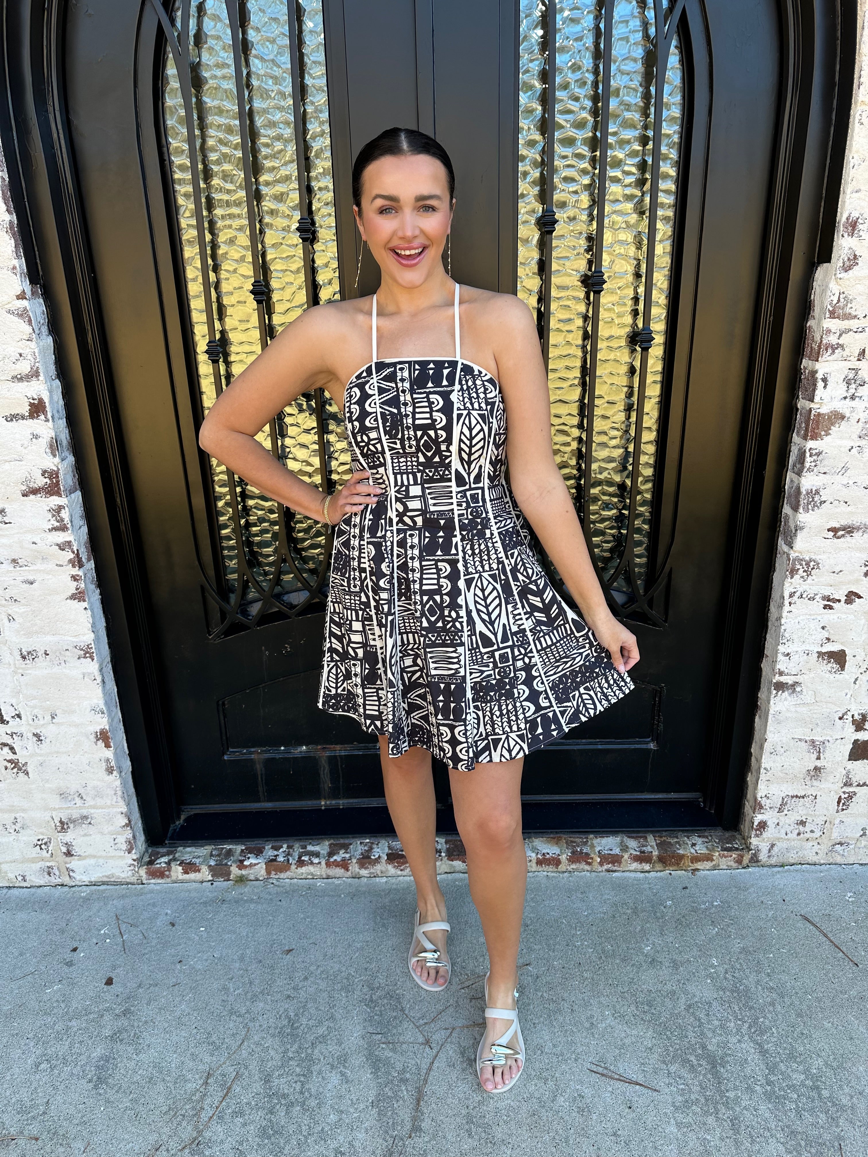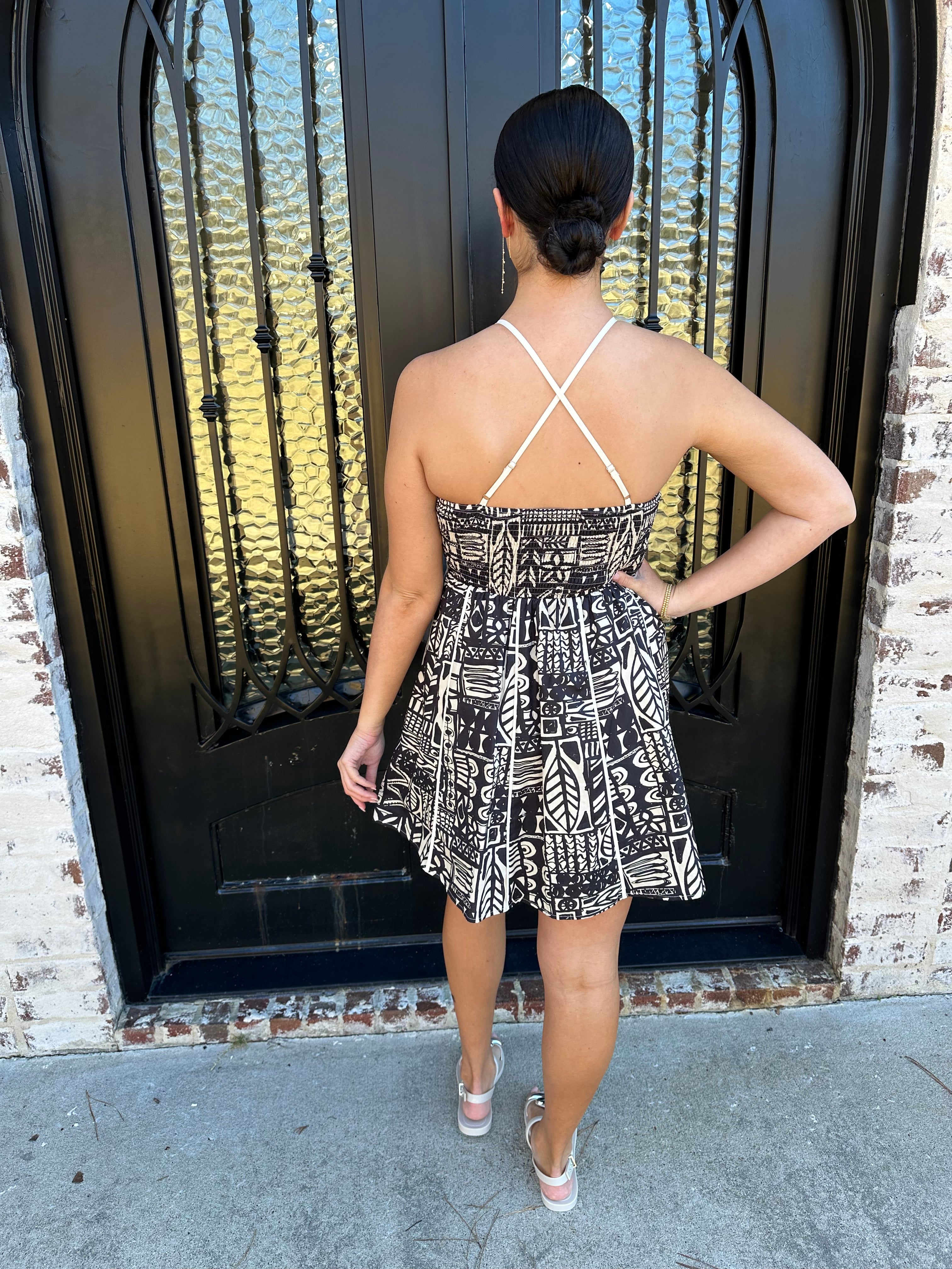 Turn heads this season with Nysa's Dress in Ink, a striking spring and summer essential featuring an intricate Aztec geometric pattern in timeless black and cream. Adjustable straps let you dial in the perfect fit, while the elastic back provides all-day comfort and a graceful silhouette. Whether you're heading to a garden party or casual weekend gathering, this one-of-a-kind design commands attention without trying too hard. Invest in a piece that celebrates bold individuality and effortless style.